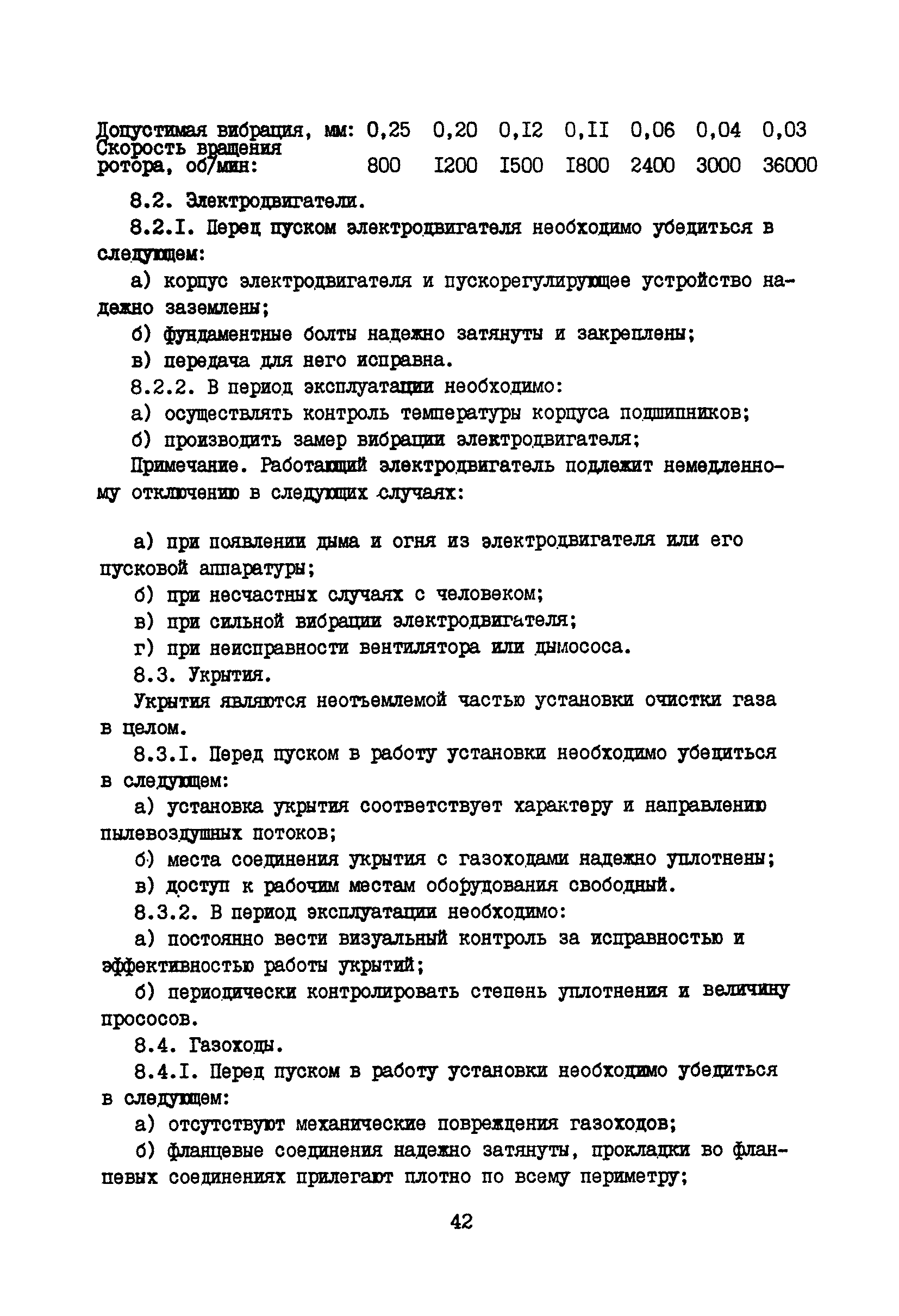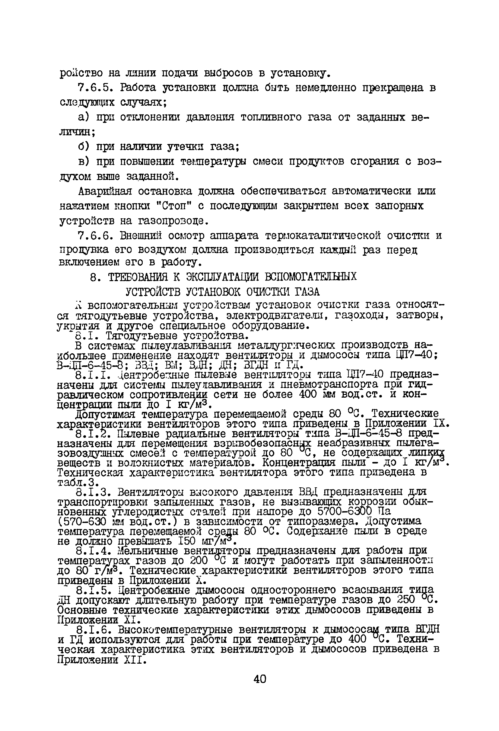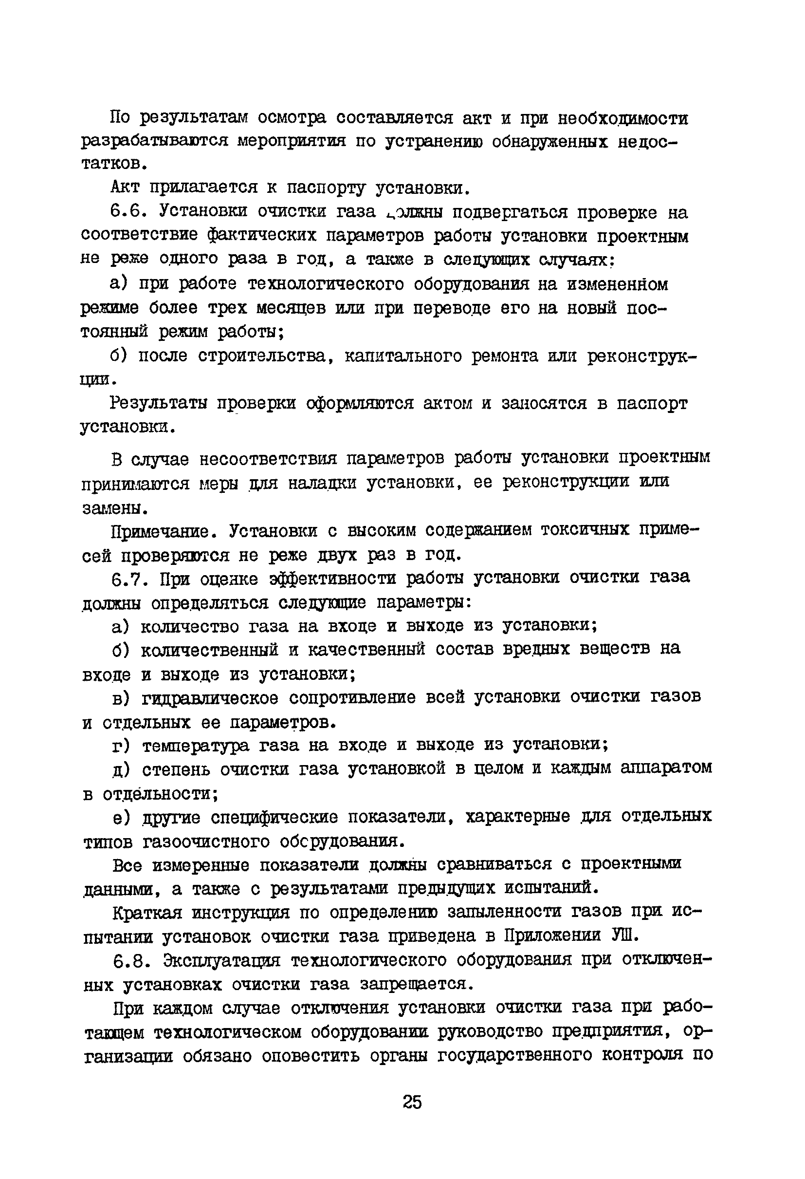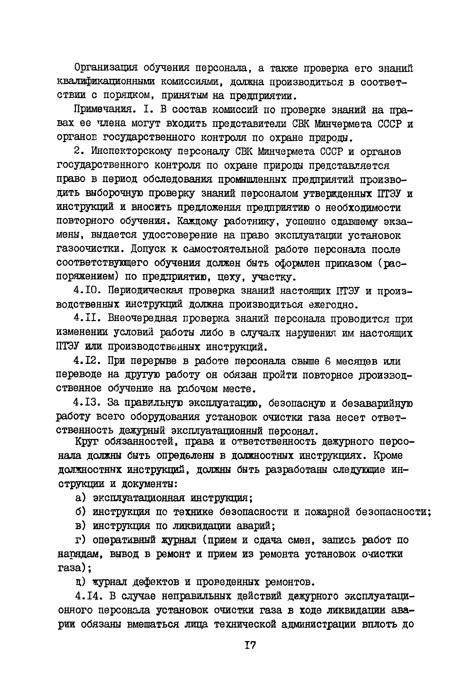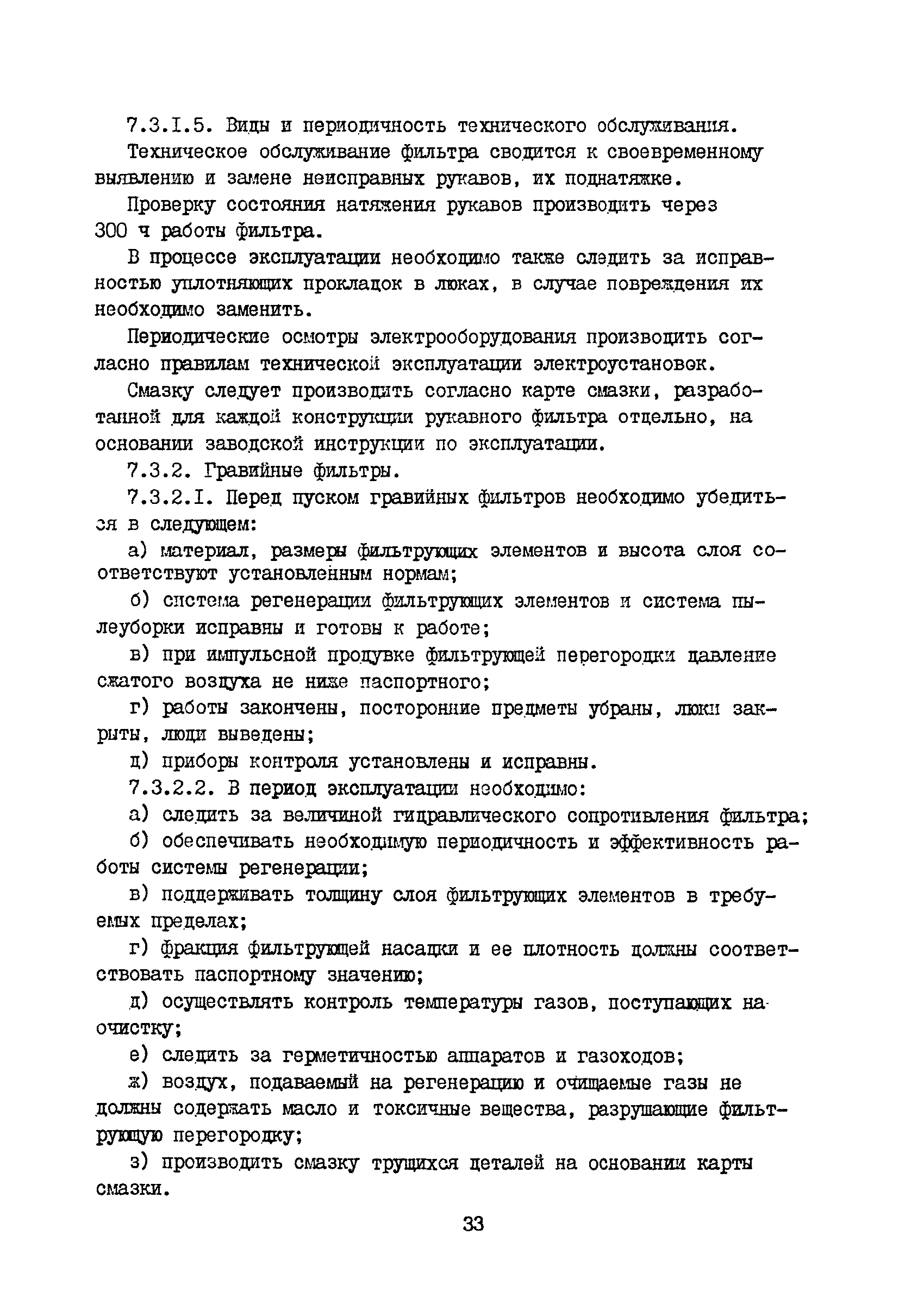 | Оглавление: | Предисловие Правила технической эксплуатации установок очистки газа 1. Основные определения 2. Область применения ПТЭУ и общие положения 3. Задачи эксплуатации установок очистки газа 4. Общие положения по организации служб эксплуатации установок очистки газа 5. Основные положения по надзору за проектированием и строительством установок очистки газа, приемке их в эксплуатацию и наладке 6. Общие требования в период эксплуатации установок очистки газа 7. Требования к эксплуатации и обслуживанию установок очистки газа 7.1. Аппараты группы (С) -сухие механические очистки газа 7.2. Аппараты группы (М) — мокрые пылеуловители 7.3. Аппараты группы (Ф) - фильтры 7.4. Аппараты группы (Э) - электрические пылеуловители 7.5. Аппараты группы (Х) - химической очистки газа 7.6. Аппараты группы (Т) — термической и термокаталитической очистки газа 8. Требования к эксплуатации вспомогательных устройств установок очистки газа 8.1. Тяго-дутьевые устройства 8.2. Электродвигатели 8.3. Укрытия 8.4. Газоходы 8.5. Затворы 9. Характерные недостатки в работе установок очистки газа 10. Требования к оснащению установок очистки газа регистрирующими приборами и регулирующими органами 11. Организация ремонта установок очистки газа 12. Организация работы по охране. атмосферного воздуха 13. Регистрация установок очистки газа 14. Ответственность обслуживающего персонала за работу установок очистки газа Приложение I. Предельно допустимые концентрации вредных веществ в воздухе рабочей зоны и в воздухе населенных мест Приложение II. Характеристика технологических выбросов по видам металлургических производств Приложение III. Назначение и предельно допустимые параметры работы некоторых установок очистки газов Приложение IV. Рекомендуемые скорости газа в аппаратах очистки Приложение V. Акт по расследованию аварии Приложение VI. Перечень необходимых приборов для контроля работы установок очистки газа Приложение VII. Примерная программа по подготовке на производстве операторов по обслуживанию установок очистки газа Приложение VIII. Краткая инструкция по определению запыленности газов при испытаниях установок очистки газа Приложение IХ. Технические характеристики вентиляционных агрегатов с центробежными вентиляторами типа ЦП 7-40 Приложение Х. Техническая характеристика вентиляторов типа ВМ Приложение ХI. Основные технические характеристики дымососов ДН Приложение ХII. Техническая характеристика высокотемпературных вентиляторов и дымососов типа ВГДН и ГД Приложение ХIII. Основные технические характеристики вентиляторов ВДН Приложение ХIV. Техническая характеристика агрегатов питания типа АТФ Приложение ХV. Техническая характеристика агрегатов питания типа АТПОМ Приложение ХVI. Паспорт установки очистки газа Правила техники безопасности при эксплуатации установок очистки газа 1. Общие положения 2. Требования к персоналу, обслуживающему установки очистки газа 3. Допуск персонала к обслуживанию установок очистки газа 4. Общие требования техники безопасности для установок очистки газа 5. Требования безопасности при проведении внутреннего осмотра и работы внутри аппаратов установок очистки газа 6. Особенности техники безопасности при обслуживании и ремонте электрофильтров Приложение I. Нормы и сроки испытаний подъемных механизмов и приспособлений Приложение II. 
