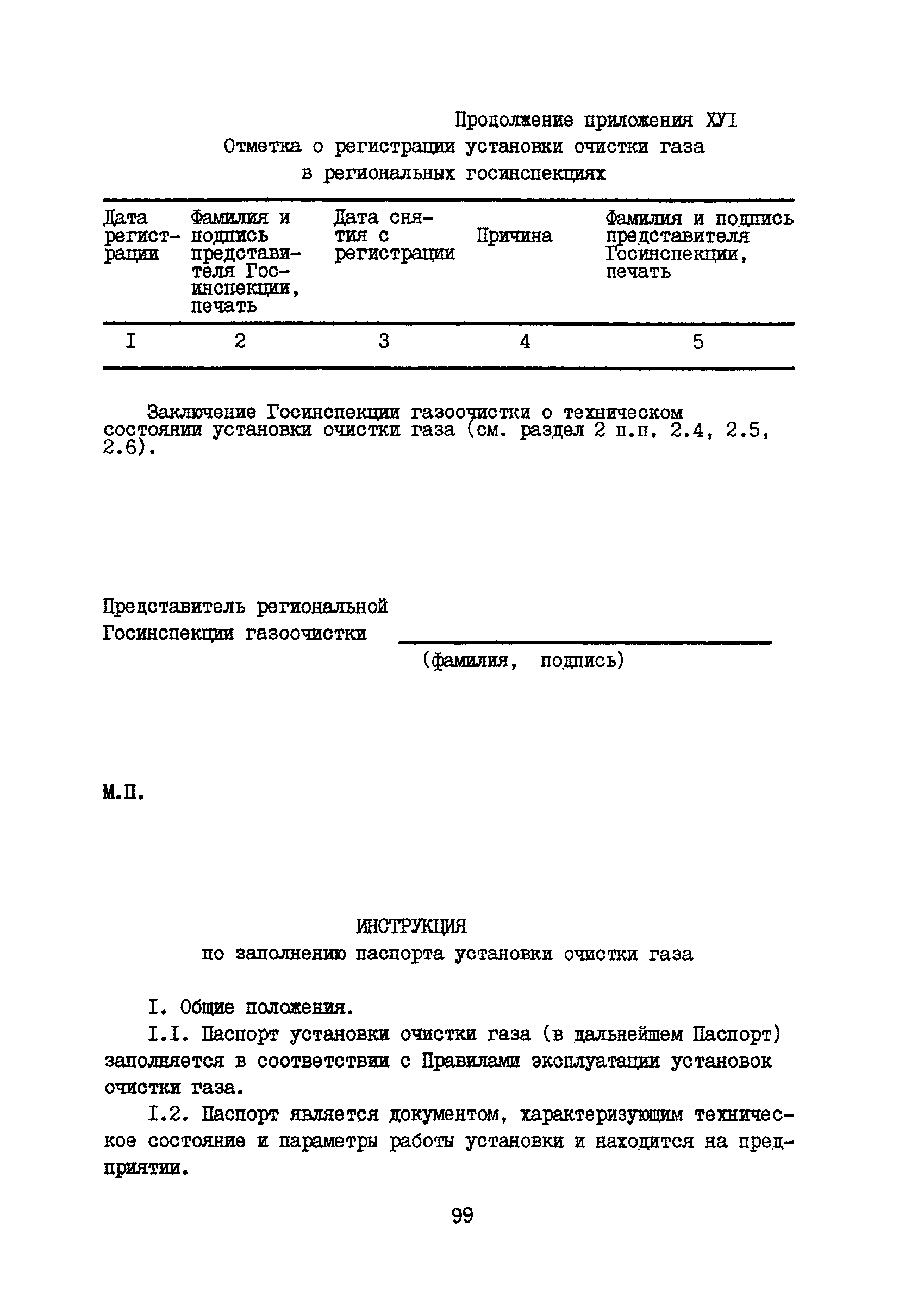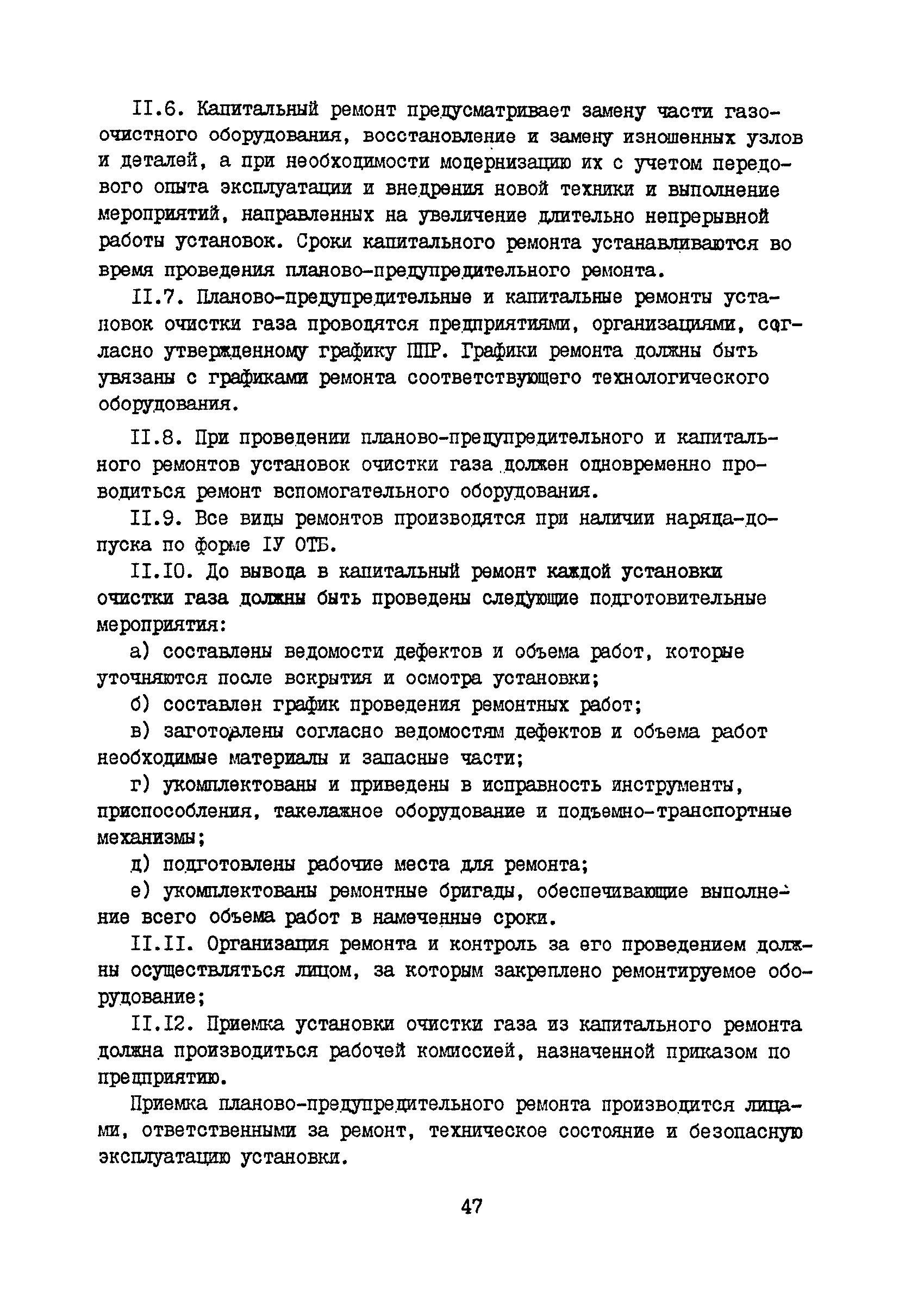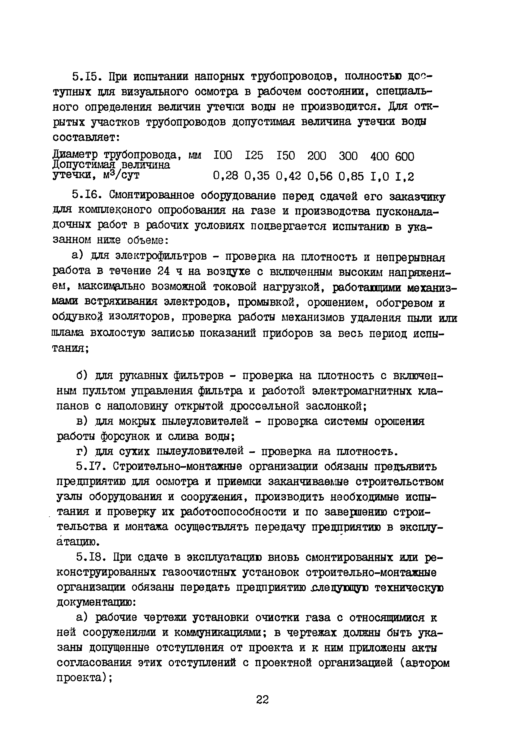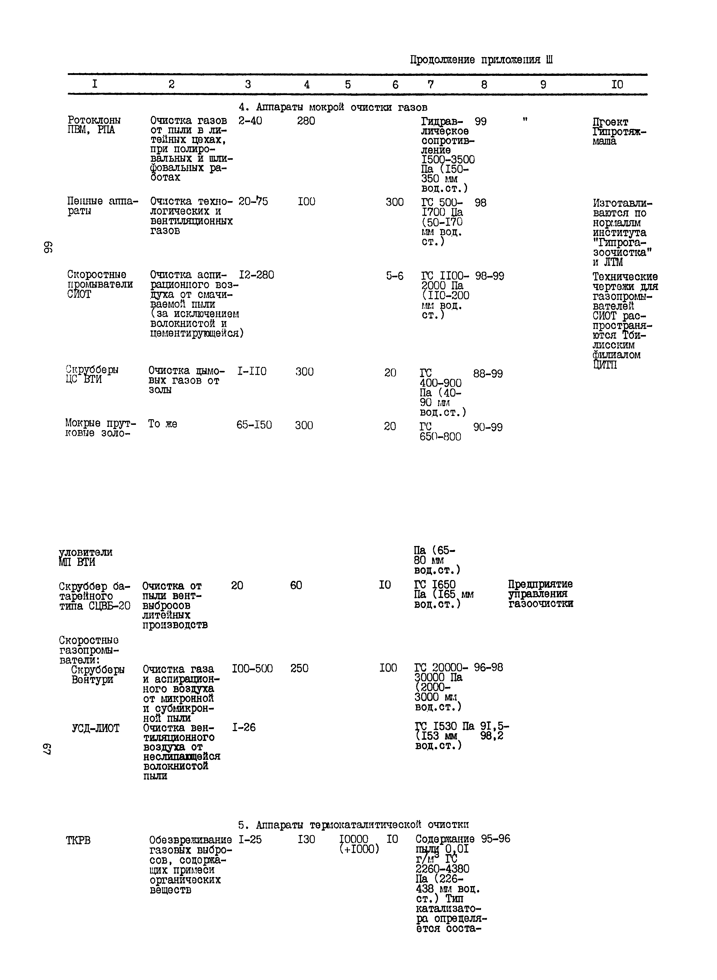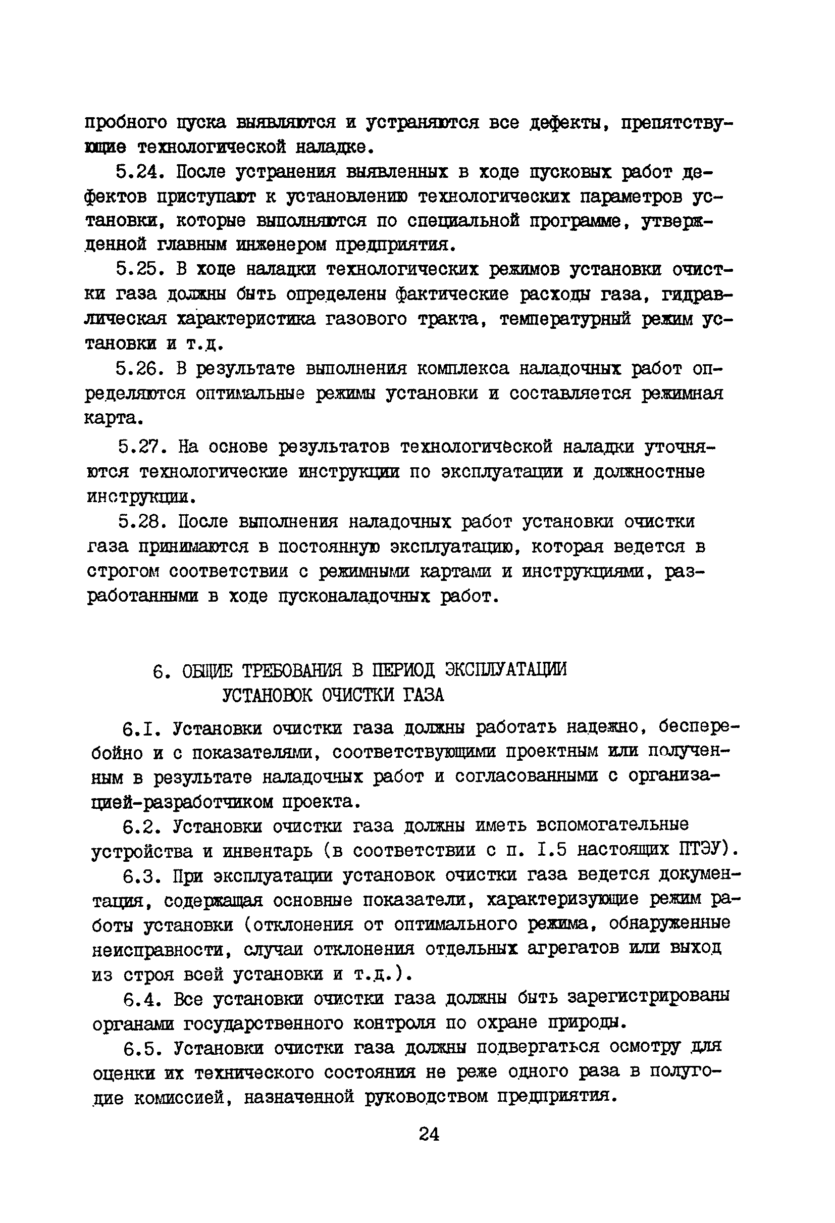 | Оглавление: | Предисловие Правила технической эксплуатации установок очистки газа 1. Основные определения 2. Область применения ПТЭУ и общие положения 3. Задачи эксплуатации установок очистки газа 4. Общие положения по организации служб эксплуатации установок очистки газа 5. Основные положения по надзору за проектированием и строительством установок очистки газа, приемке их в эксплуатацию и наладке 6. Общие требования в период эксплуатации установок очистки газа 7. Требования к эксплуатации и обслуживанию установок очистки газа 7.1. Аппараты группы (С) -сухие механические очистки газа 7.2. Аппараты группы (М) — мокрые пылеуловители 7.3. Аппараты группы (Ф) - фильтры 7.4. Аппараты группы (Э) - электрические пылеуловители 7.5. Аппараты группы (Х) - химической очистки газа 7.6. Аппараты группы (Т) — термической и термокаталитической очистки газа 8. Требования к эксплуатации вспомогательных устройств установок очистки газа 8.1. Тяго-дутьевые устройства 8.2. Электродвигатели 8.3. Укрытия 8.4. Газоходы 8.5. Затворы 9. Характерные недостатки в работе установок очистки газа 10. Требования к оснащению установок очистки газа регистрирующими приборами и регулирующими органами 11. Организация ремонта установок очистки газа 12. Организация работы по охране. атмосферного воздуха 13. Регистрация установок очистки газа 14. Ответственность обслуживающего персонала за работу установок очистки газа Приложение I. Предельно допустимые концентрации вредных веществ в воздухе рабочей зоны и в воздухе населенных мест Приложение II. Характеристика технологических выбросов по видам металлургических производств Приложение III. Назначение и предельно допустимые параметры работы некоторых установок очистки газов Приложение IV. Рекомендуемые скорости газа в аппаратах очистки Приложение V. Акт по расследованию аварии Приложение VI. Перечень необходимых приборов для контроля работы установок очистки газа Приложение VII. Примерная программа по подготовке на производстве операторов по обслуживанию установок очистки газа Приложение VIII. Краткая инструкция по определению запыленности газов при испытаниях установок очистки газа Приложение IХ. Технические характеристики вентиляционных агрегатов с центробежными вентиляторами типа ЦП 7-40 Приложение Х. Техническая характеристика вентиляторов типа ВМ Приложение ХI. Основные технические характеристики дымососов ДН Приложение ХII. Техническая характеристика высокотемпературных вентиляторов и дымососов типа ВГДН и ГД Приложение ХIII. Основные технические характеристики вентиляторов ВДН Приложение ХIV. Техническая характеристика агрегатов питания типа АТФ Приложение ХV. Техническая характеристика агрегатов питания типа АТПОМ Приложение ХVI. Паспорт установки очистки газа Правила техники безопасности при эксплуатации установок очистки газа 1. Общие положения 2. Требования к персоналу, обслуживающему установки очистки газа 3. Допуск персонала к обслуживанию установок очистки газа 4. Общие требования техники безопасности для установок очистки газа 5. Требования безопасности при проведении внутреннего осмотра и работы внутри аппаратов установок очистки газа 6. Особенности техники безопасности при обслуживании и ремонте электрофильтров Приложение I. Нормы и сроки испытаний подъемных механизмов и приспособлений Приложение II. 