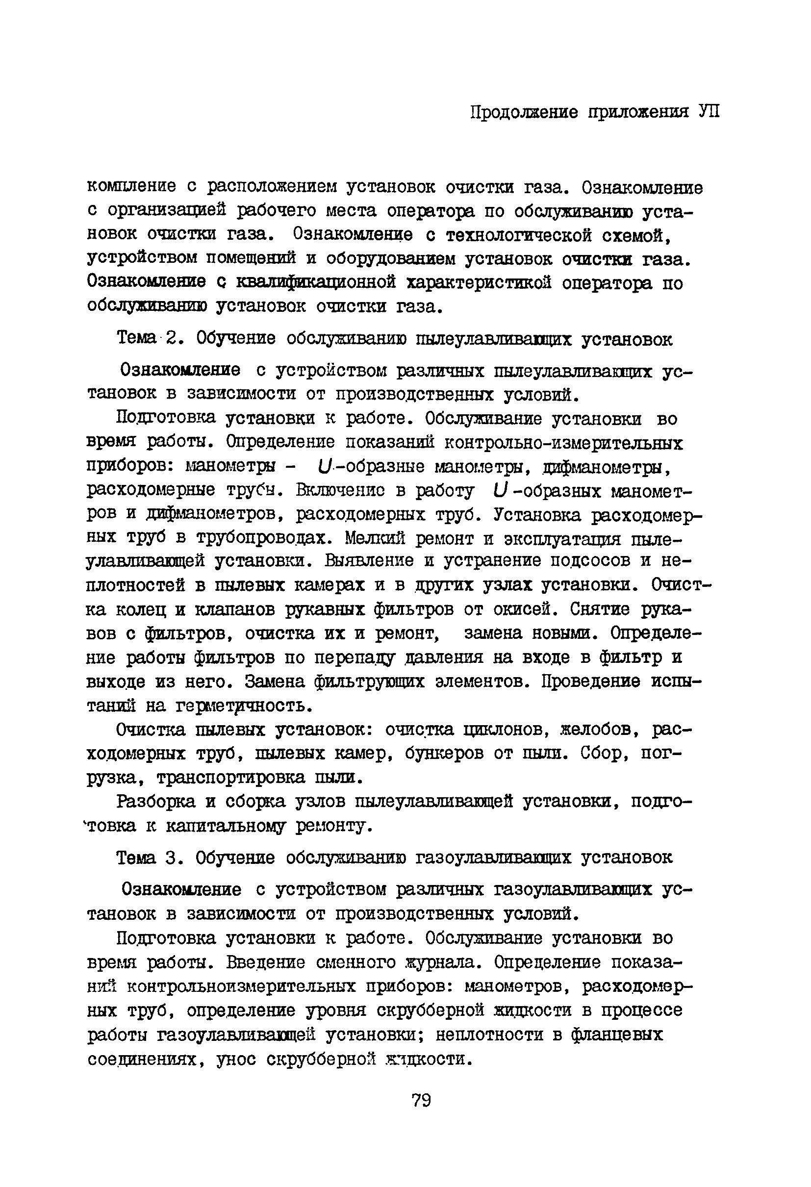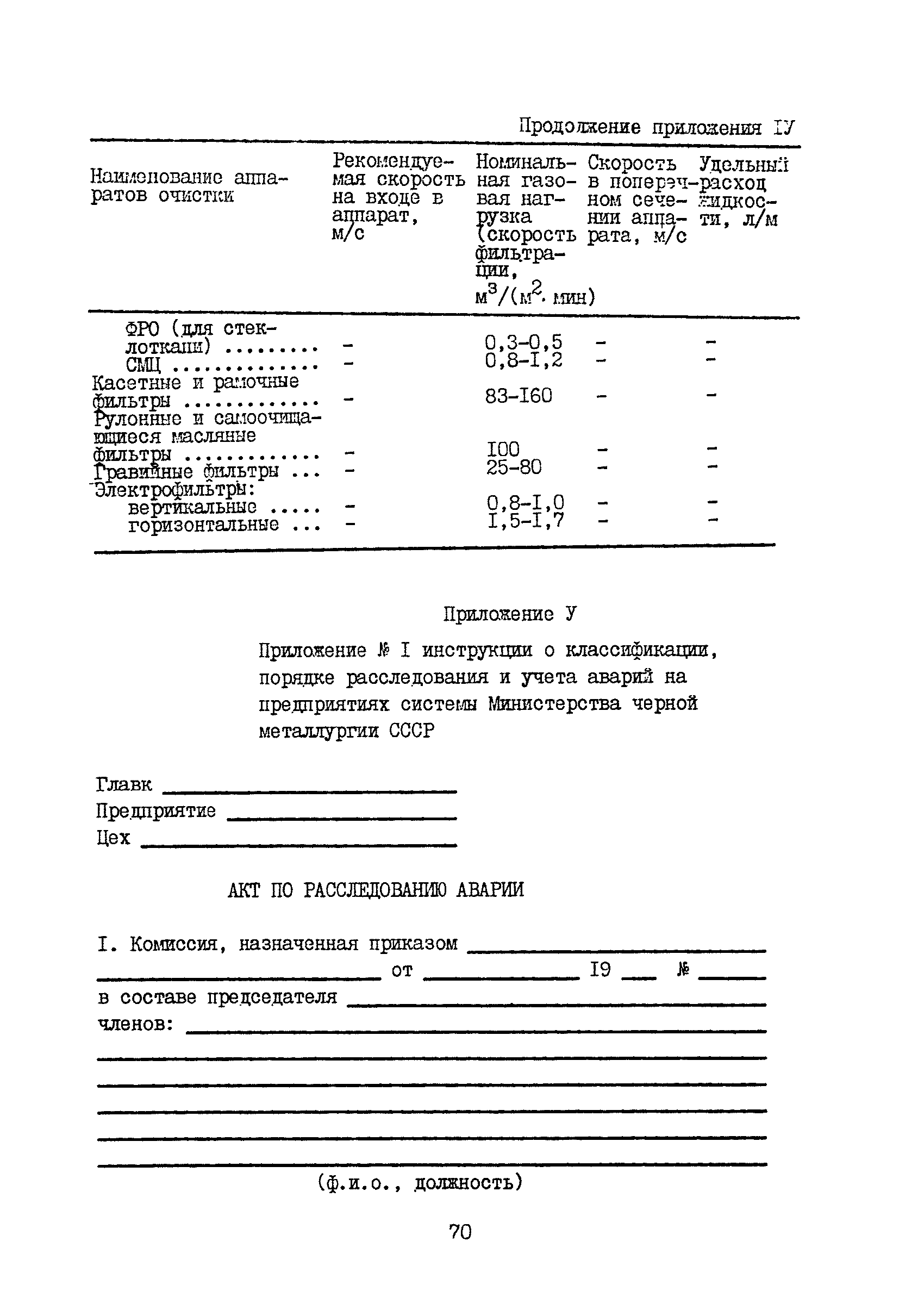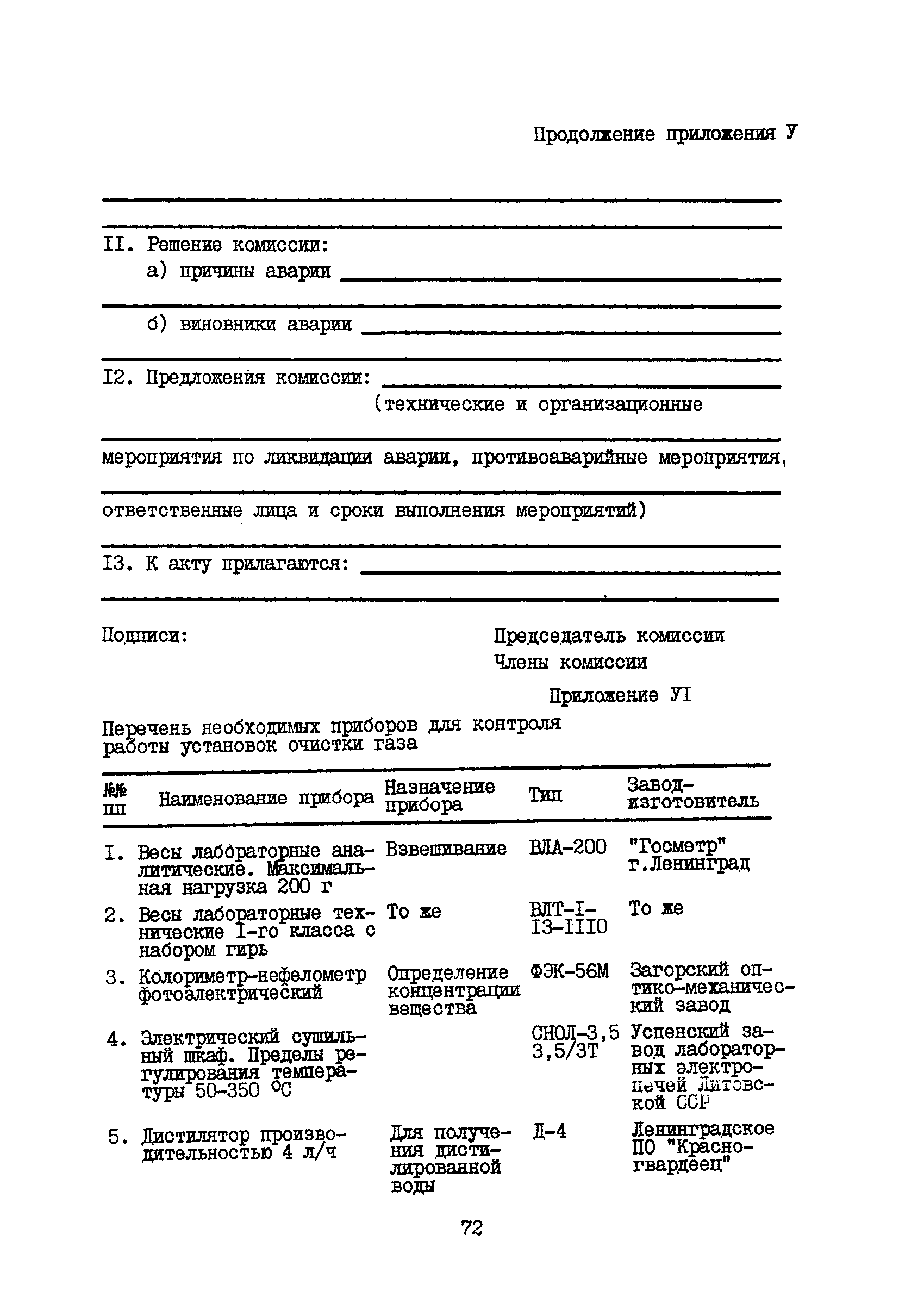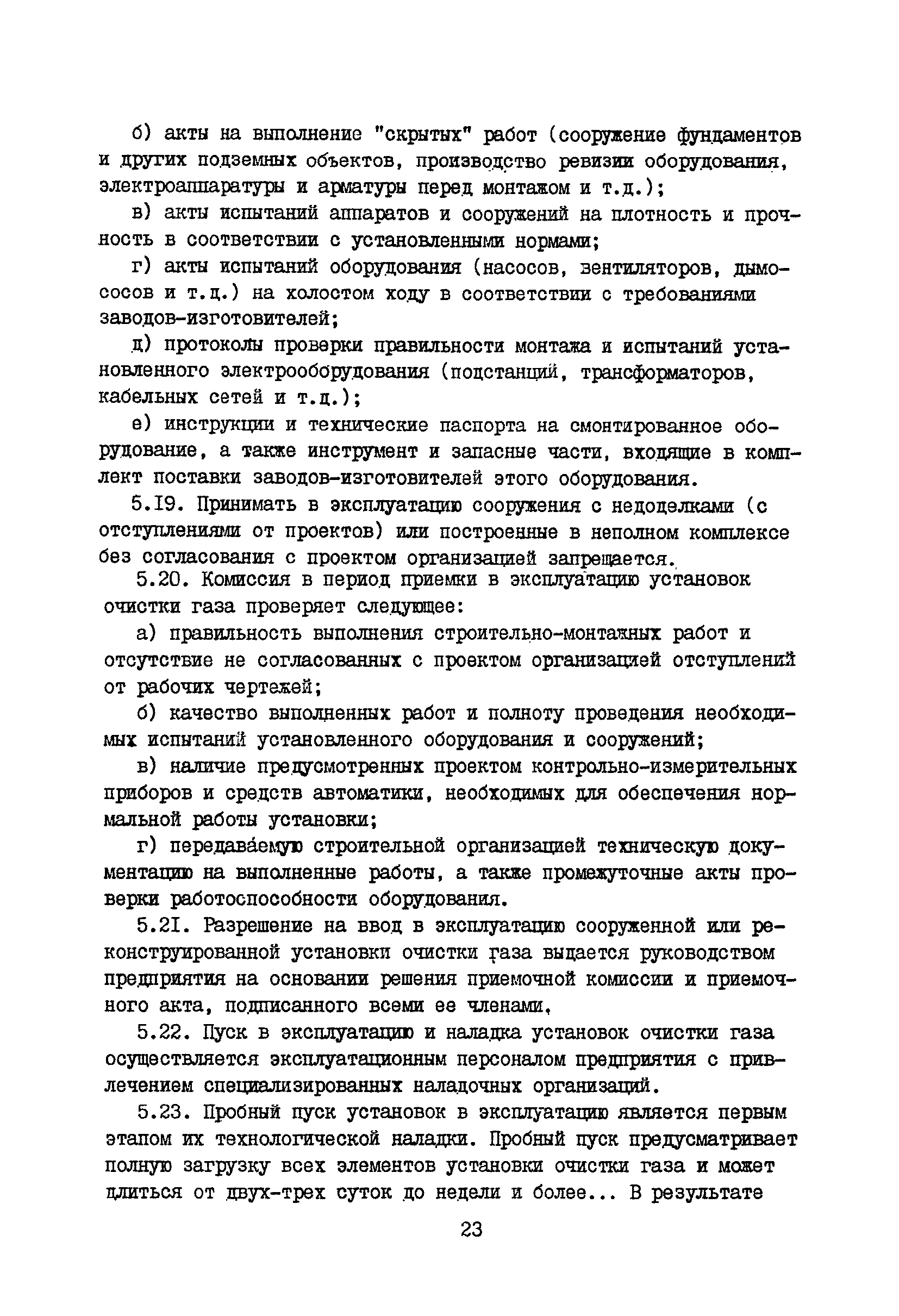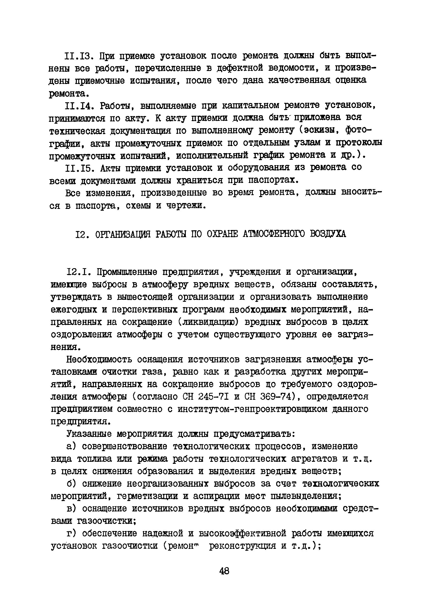| Оглавление: | Предисловие Правила технической эксплуатации установок очистки газа 1. Основные определения 2. Область применения ПТЭУ и общие положения 3. Задачи эксплуатации установок очистки газа 4. Общие положения по организации служб эксплуатации установок очистки газа 5. Основные положения по надзору за проектированием и строительством установок очистки газа, приемке их в эксплуатацию и наладке 6. Общие требования в период эксплуатации установок очистки газа 7. Требования к эксплуатации и обслуживанию установок очистки газа 7.1. Аппараты группы (С) -сухие механические очистки газа 7.2. Аппараты группы (М) — мокрые пылеуловители 7.3. Аппараты группы (Ф) - фильтры 7.4. Аппараты группы (Э) - электрические пылеуловители 7.5. Аппараты группы (Х) - химической очистки газа 7.6. Аппараты группы (Т) — термической и термокаталитической очистки газа 8. Требования к эксплуатации вспомогательных устройств установок очистки газа 8.1. Тяго-дутьевые устройства 8.2. Электродвигатели 8.3. Укрытия 8.4. Газоходы 8.5. Затворы 9. Характерные недостатки в работе установок очистки газа 10. Требования к оснащению установок очистки газа регистрирующими приборами и регулирующими органами 11. Организация ремонта установок очистки газа 12. Организация работы по охране. атмосферного воздуха 13. Регистрация установок очистки газа 14. Ответственность обслуживающего персонала за работу установок очистки газа Приложение I. Предельно допустимые концентрации вредных веществ в воздухе рабочей зоны и в воздухе населенных мест Приложение II. Характеристика технологических выбросов по видам металлургических производств Приложение III. Назначение и предельно допустимые параметры работы некоторых установок очистки газов Приложение IV. Рекомендуемые скорости газа в аппаратах очистки Приложение V. Акт по расследованию аварии Приложение VI. Перечень необходимых приборов для контроля работы установок очистки газа Приложение VII. Примерная программа по подготовке на производстве операторов по обслуживанию установок очистки газа Приложение VIII. Краткая инструкция по определению запыленности газов при испытаниях установок очистки газа Приложение IХ. Технические характеристики вентиляционных агрегатов с центробежными вентиляторами типа ЦП 7-40 Приложение Х. Техническая характеристика вентиляторов типа ВМ Приложение ХI. Основные технические характеристики дымососов ДН Приложение ХII. Техническая характеристика высокотемпературных вентиляторов и дымососов типа ВГДН и ГД Приложение ХIII. Основные технические характеристики вентиляторов ВДН Приложение ХIV. Техническая характеристика агрегатов питания типа АТФ Приложение ХV. Техническая характеристика агрегатов питания типа АТПОМ Приложение ХVI. Паспорт установки очистки газа Правила техники безопасности при эксплуатации установок очистки газа 1. Общие положения 2. Требования к персоналу, обслуживающему установки очистки газа 3. Допуск персонала к обслуживанию установок очистки газа 4. Общие требования техники безопасности для установок очистки газа 5. Требования безопасности при проведении внутреннего осмотра и работы внутри аппаратов установок очистки газа 6. Особенности техники безопасности при обслуживании и ремонте электрофильтров Приложение I. Нормы и сроки испытаний подъемных механизмов и приспособлений Приложение II. 