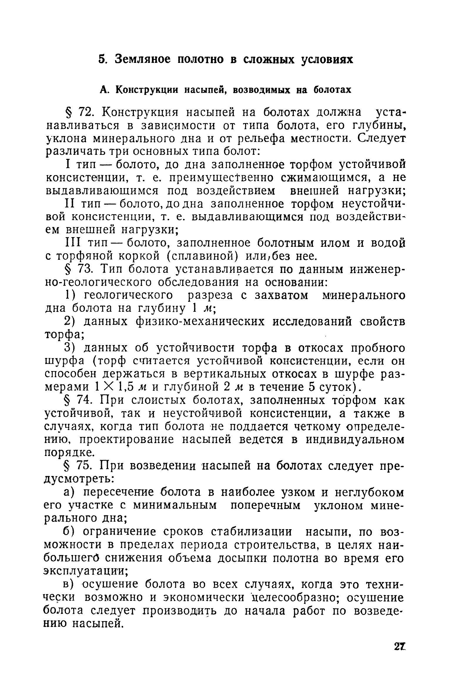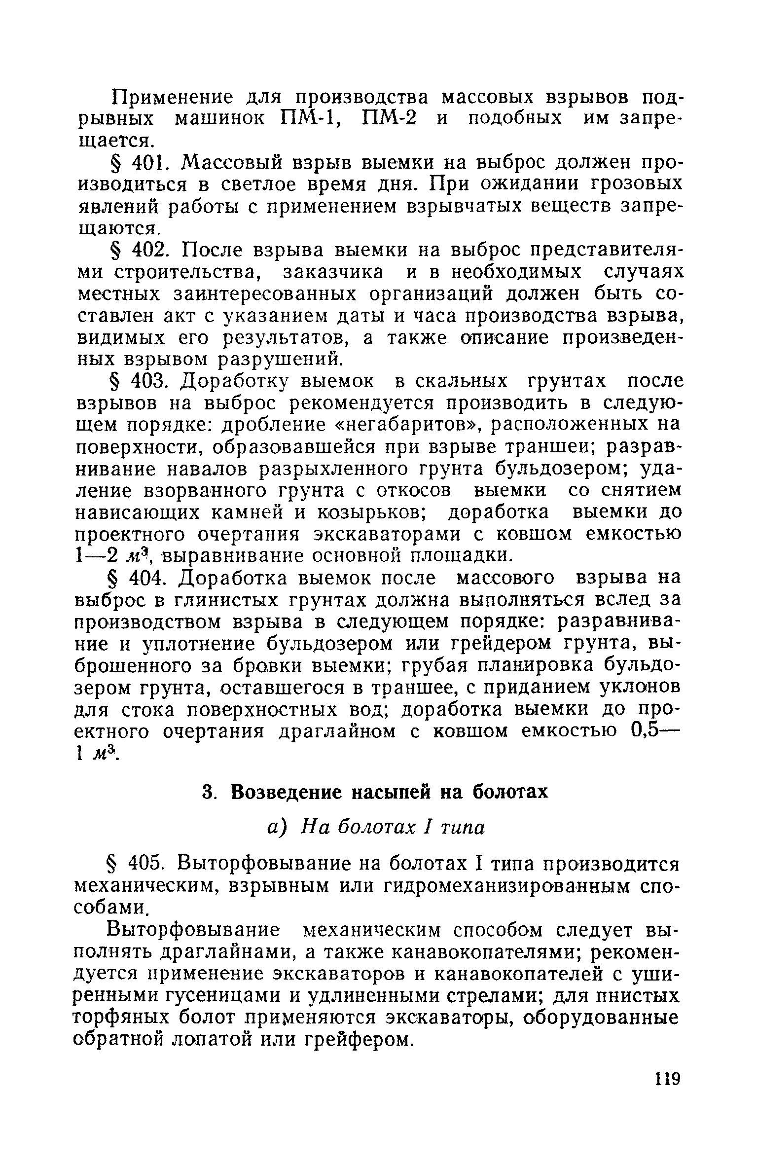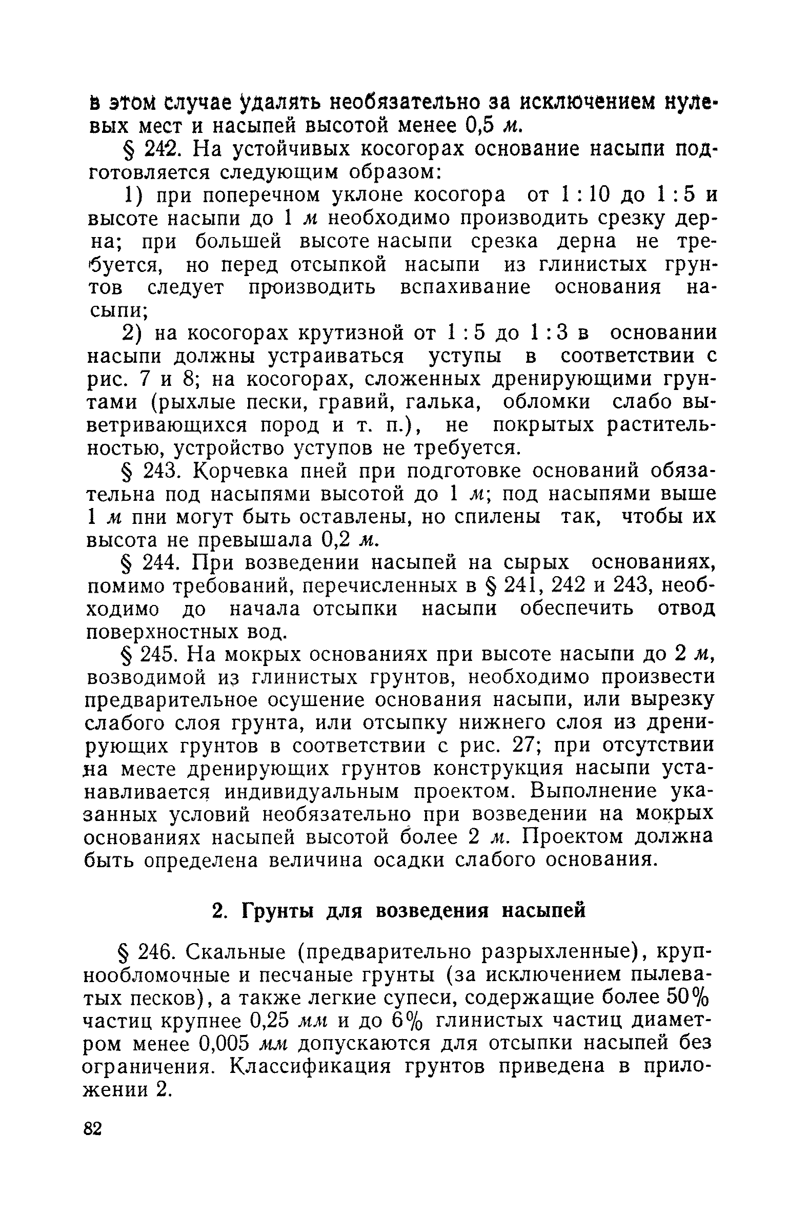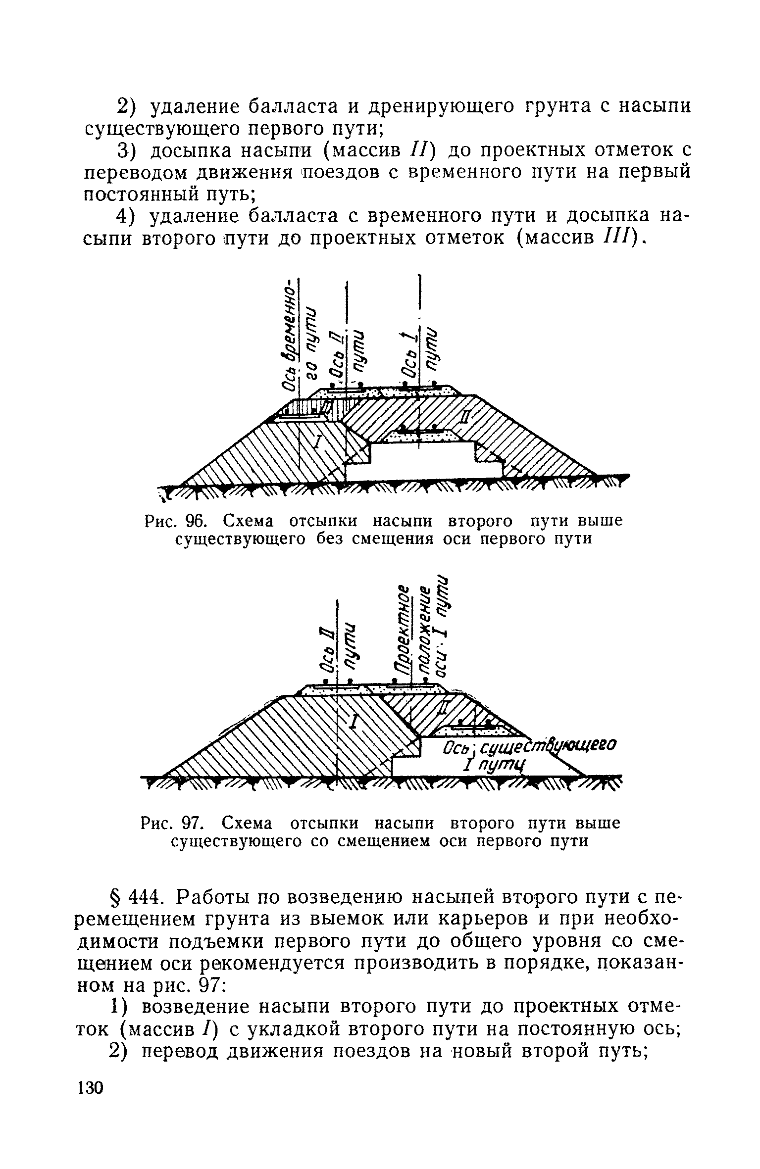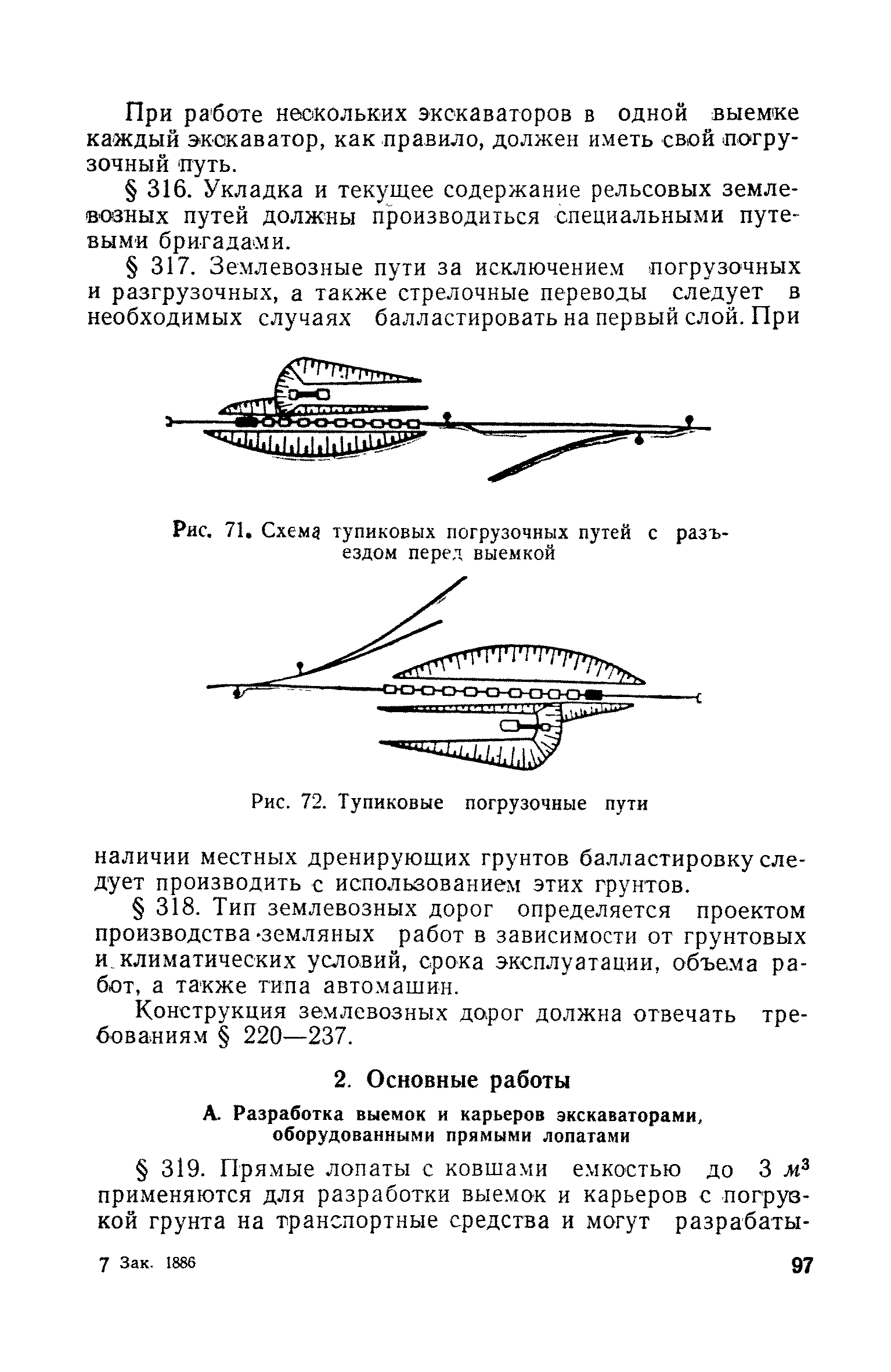 | Оглавление: | Глава 1. Общие положения 1. Основные требования 2. Проектная документация для сооружения земляного полотна 3. Полоса отвода Глава II. Конструкции земляного полотна 1. Типовые поперечные профили земляного полотна 2. Резервы, кавальеры и банкеты 3. Устройства для отвода поверхностных вод А. Общие указания Б. Продольные водоотводные канавы В. Нагорные канавы Г. Кюветы 4. Устройства для отвода грунтовых вод 5. Земляное полотно в сложных условиях А. Конструкции насыпей, возводимых на болотах Б. Конструкции насыпей при пересечении водоемов, водотоков и затопляемых мест В. Конструкции земляного полотна в песчаных районах с засушливым климатом Г. Конструкции насыпей из засоленных грунтов Д. Мероприятия по обеспечению устойчивости земляного полотна в карстовых районах Е. Противооползневые мероприятия Ж. Защита от каменных в снежных обвалов и от селевых выносов 6. Укрепления земляного полотна, водоотводных и регуляционных сооружений А. Общие указания Б. Укрепление откосов обсевом и дерновкой В. Укрепление откосов дерновкой Г. Смешанные типы ‚укреплений откосов Д. Укрепление земляного полотна в районах распространения песков Е. Железобетонные покрытия Ж. Укрепление камнем З. Укрепление из габионов И. Хворостяные укрепления К. Укрепление посадкой кустарника и деревьев Л. Укрепление кюветов, водоотводных и нагорных канав 7. Конструктивные особенности земляного полотна вторых путей Глава III. Основные требования по организации и подготовке производства земляных работ 1. Общие указания 2. Выбор ведущих землеройных и транспортных машин, а также методов взрывных и гидромеханизированных работ 3. Основные требования по организации работ на объекте 4. Восстановление и закрепление трассы 5. Разбивка земляного полотна 6. Временные автомобильные дороги Глава IV. Сооружение земляного полотна I. Основные требования 1. Подготовка основания насыпей 2. Грунты для возведения насыпей 3. Размещение и разравнивание грунтов в насыпях 4. Нормы и способы уплотнения насыпей 5. Запас на осадку насыпей 6. Отсыпка насыпей и полунасыпей на косогорах 7. Отсыпка конусов, засыпка труб и прогалов у устоев мостов 8. Отвод поверхностных и грунтовых вод при разработке выемок 9. Уширение выемок 10. Сооружение земляного полотна в районах распространения песков и засушливого климата 11. Укрепление основной площадки и откосов земляного полотна II. Указания по производству работ 1. Подготовительные работы А. Рубка леса и кустарника, корчевка пней, удаление валунов, срезка растительного слоя грунта Б. Разработка нагорных и водоотводных канав, устройство дренажей В. Устройство землевозных дорог 2. Основные работы А. Разработка выемок и карьеров экскаваторами оборудованными прямыми лопатами Б. Разработка выемок и возведение насыпей экскаваторами, оборудованными драглайнами В. Возведение насыпей транспортными машинами Г. Разработка выемок и возведение насыпей скреперами Д. Возведение насыпей грейдер-элеваторами Е. Разработка выемок и возведение насыпей бульдозерами Ж. Разработка выемок и возведение насыпей способом гидромеханизации З. Разработка выемок в грунтах, требующих предварительного рыхления взрывным способом И. Разработка выемок и полувыемок методом взрыва на выброс 3. Возведение насыпей на болотах 4. Планировка основной площадки и откосов земляного полотн
