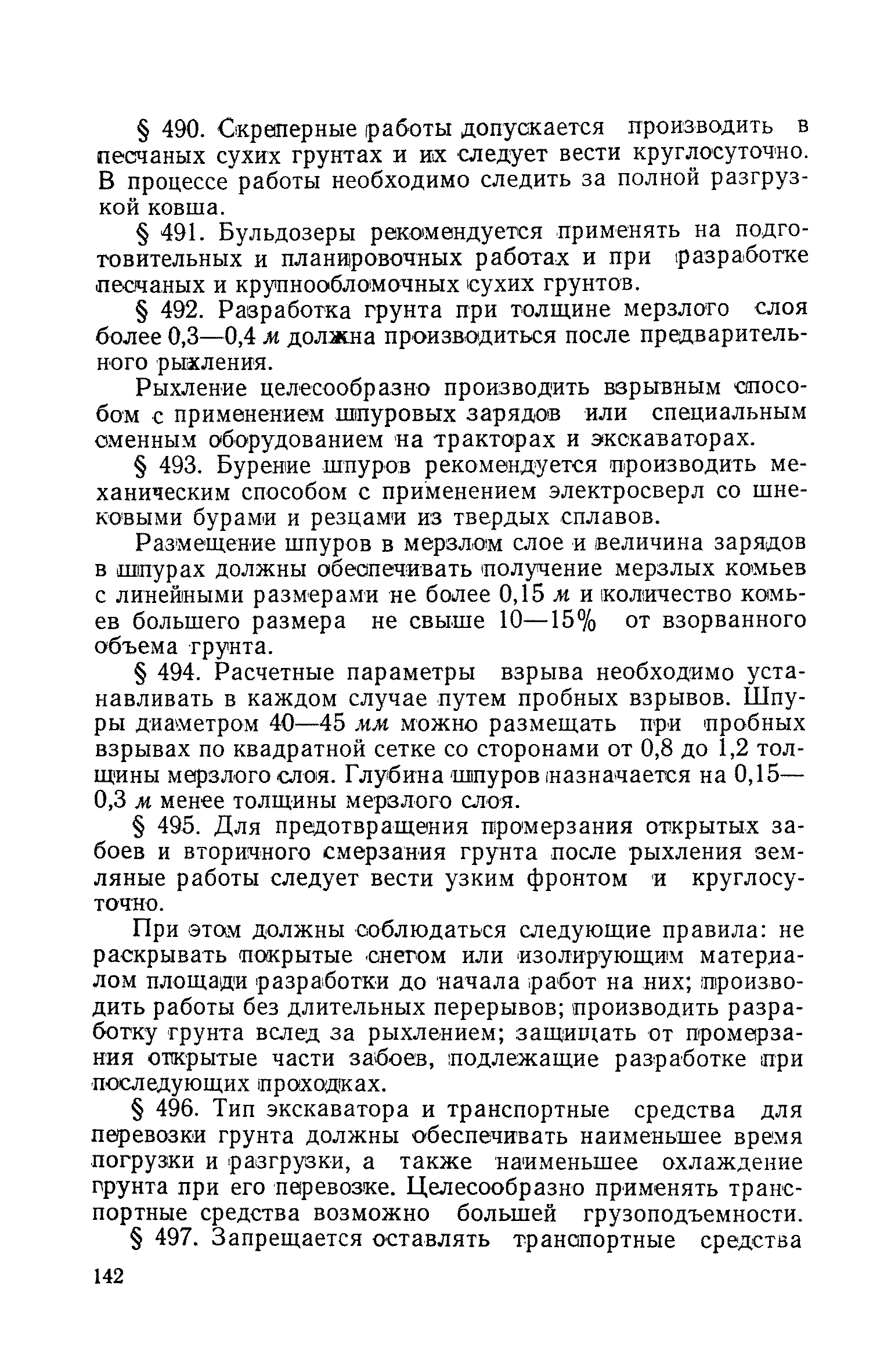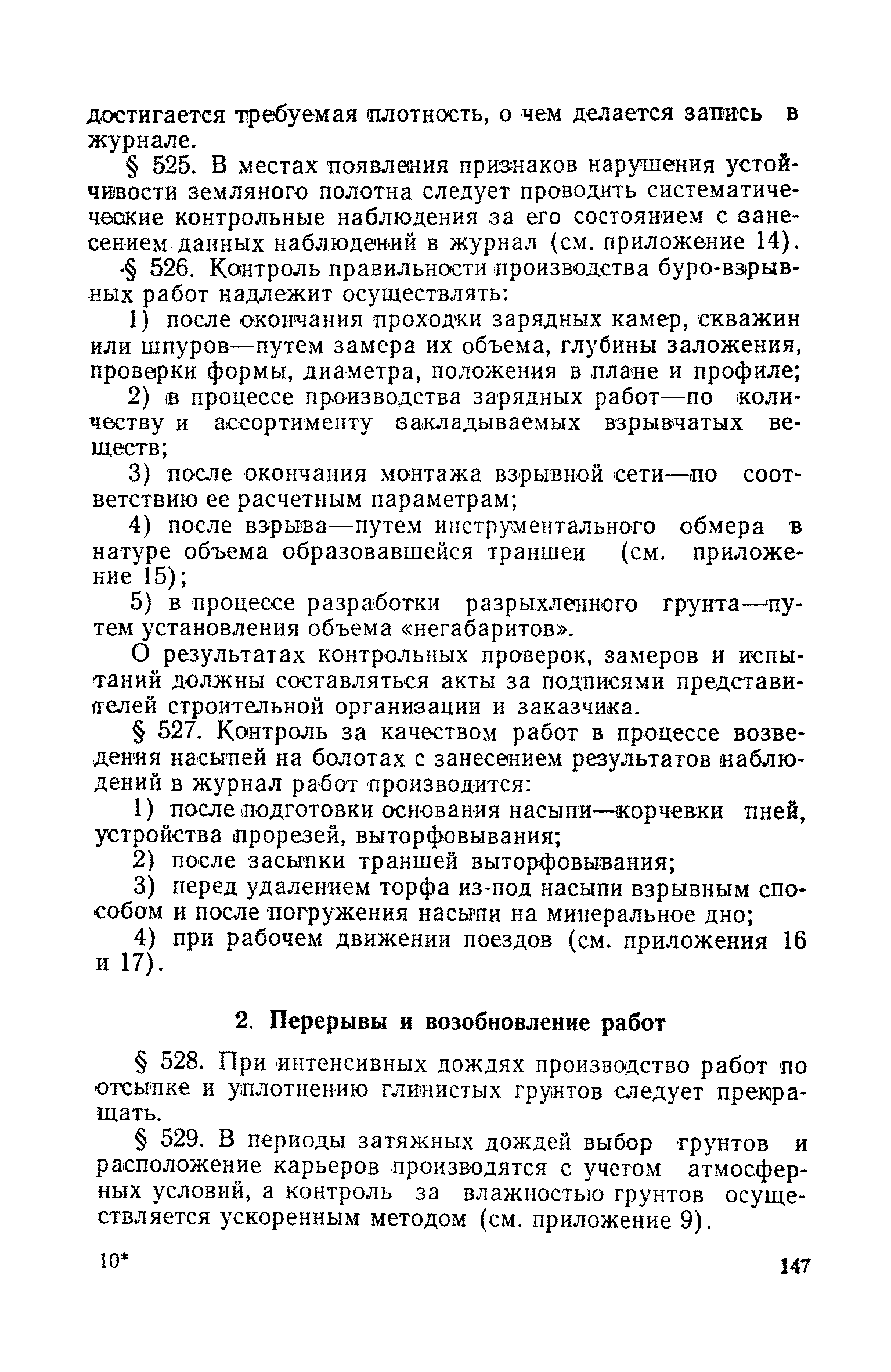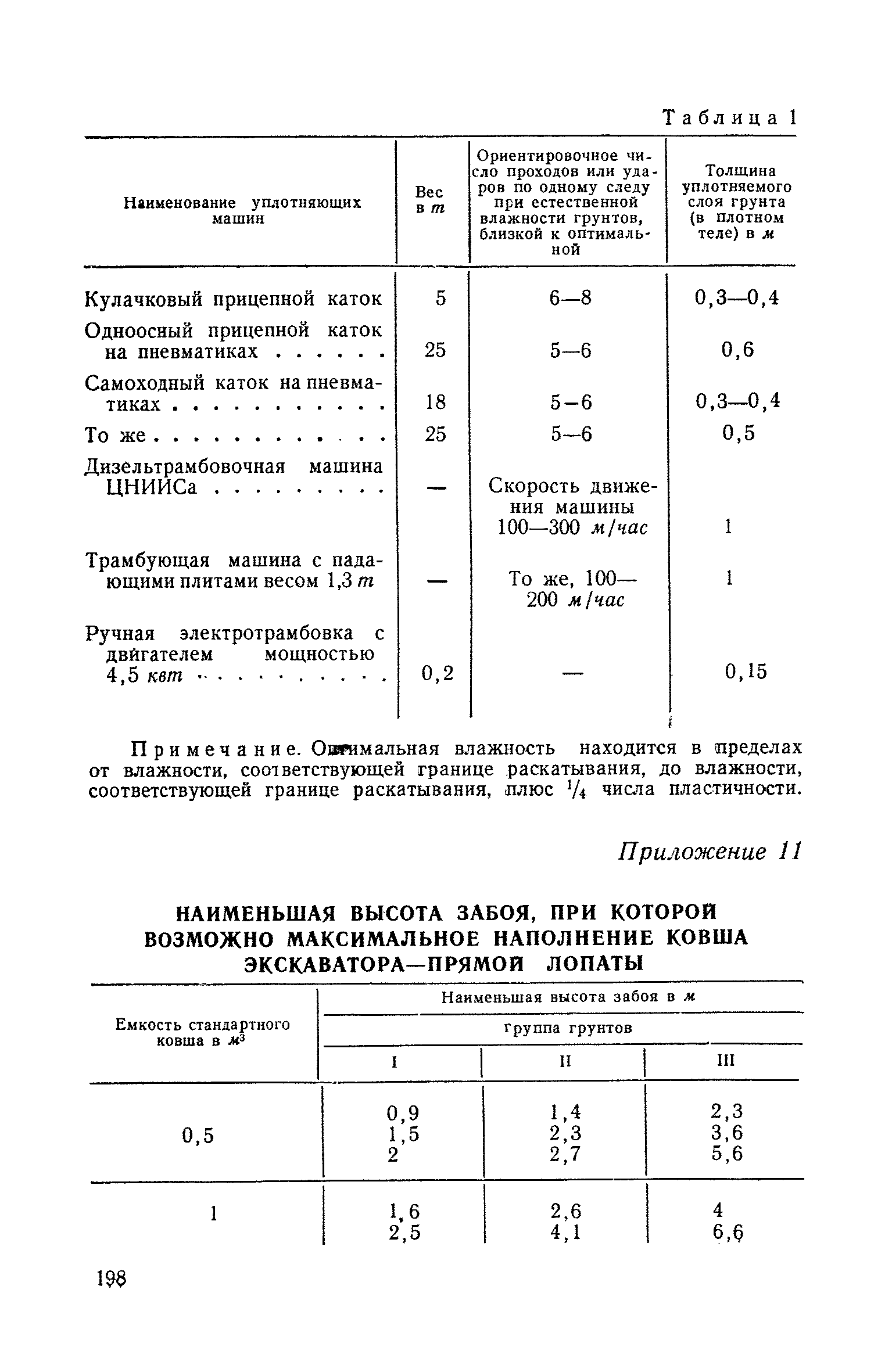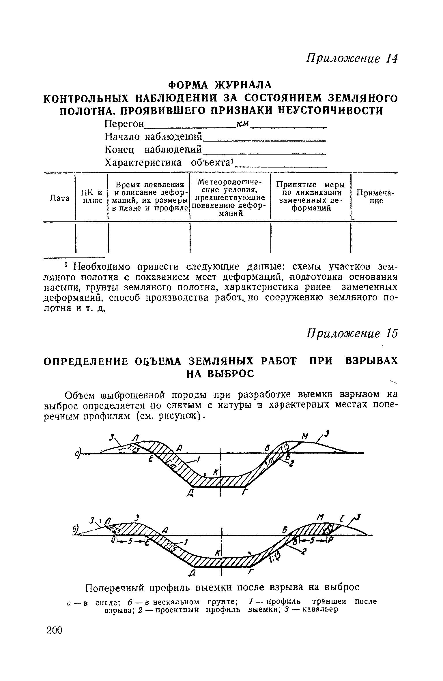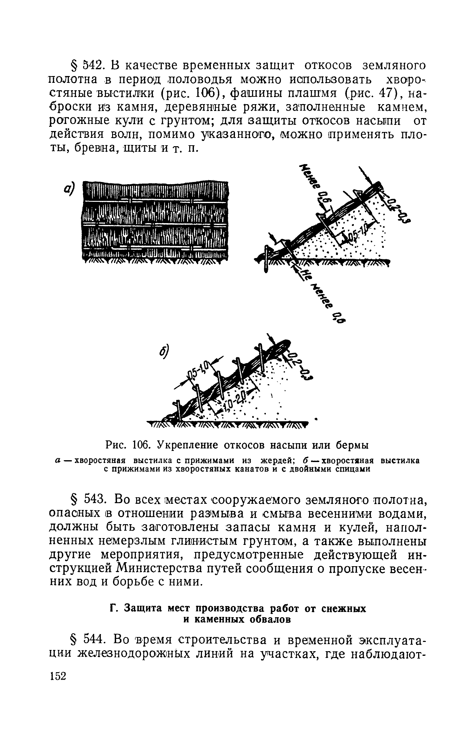 | Оглавление: | Глава 1. Общие положения 1. Основные требования 2. Проектная документация для сооружения земляного полотна 3. Полоса отвода Глава II. Конструкции земляного полотна 1. Типовые поперечные профили земляного полотна 2. Резервы, кавальеры и банкеты 3. Устройства для отвода поверхностных вод А. Общие указания Б. Продольные водоотводные канавы В. Нагорные канавы Г. Кюветы 4. Устройства для отвода грунтовых вод 5. Земляное полотно в сложных условиях А. Конструкции насыпей, возводимых на болотах Б. Конструкции насыпей при пересечении водоемов, водотоков и затопляемых мест В. Конструкции земляного полотна в песчаных районах с засушливым климатом Г. Конструкции насыпей из засоленных грунтов Д. Мероприятия по обеспечению устойчивости земляного полотна в карстовых районах Е. Противооползневые мероприятия Ж. Защита от каменных в снежных обвалов и от селевых выносов 6. Укрепления земляного полотна, водоотводных и регуляционных сооружений А. Общие указания Б. Укрепление откосов обсевом и дерновкой В. Укрепление откосов дерновкой Г. Смешанные типы ‚укреплений откосов Д. Укрепление земляного полотна в районах распространения песков Е. Железобетонные покрытия Ж. Укрепление камнем З. Укрепление из габионов И. Хворостяные укрепления К. Укрепление посадкой кустарника и деревьев Л. Укрепление кюветов, водоотводных и нагорных канав 7. Конструктивные особенности земляного полотна вторых путей Глава III. Основные требования по организации и подготовке производства земляных работ 1. Общие указания 2. Выбор ведущих землеройных и транспортных машин, а также методов взрывных и гидромеханизированных работ 3. Основные требования по организации работ на объекте 4. Восстановление и закрепление трассы 5. Разбивка земляного полотна 6. Временные автомобильные дороги Глава IV. Сооружение земляного полотна I. Основные требования 1. Подготовка основания насыпей 2. Грунты для возведения насыпей 3. Размещение и разравнивание грунтов в насыпях 4. Нормы и способы уплотнения насыпей 5. Запас на осадку насыпей 6. Отсыпка насыпей и полунасыпей на косогорах 7. Отсыпка конусов, засыпка труб и прогалов у устоев мостов 8. Отвод поверхностных и грунтовых вод при разработке выемок 9. Уширение выемок 10. Сооружение земляного полотна в районах распространения песков и засушливого климата 11. Укрепление основной площадки и откосов земляного полотна II. Указания по производству работ 1. Подготовительные работы А. Рубка леса и кустарника, корчевка пней, удаление валунов, срезка растительного слоя грунта Б. Разработка нагорных и водоотводных канав, устройство дренажей В. Устройство землевозных дорог 2. Основные работы А. Разработка выемок и карьеров экскаваторами оборудованными прямыми лопатами Б. Разработка выемок и возведение насыпей экскаваторами, оборудованными драглайнами В. Возведение насыпей транспортными машинами Г. Разработка выемок и возведение насыпей скреперами Д. Возведение насыпей грейдер-элеваторами Е. Разработка выемок и возведение насыпей бульдозерами Ж. Разработка выемок и возведение насыпей способом гидромеханизации З. Разработка выемок в грунтах, требующих предварительного рыхления взрывным способом И. Разработка выемок и полувыемок методом взрыва на выброс 3. Возведение насыпей на болотах 4. Планировка основной площадки и откосов земляного полотн