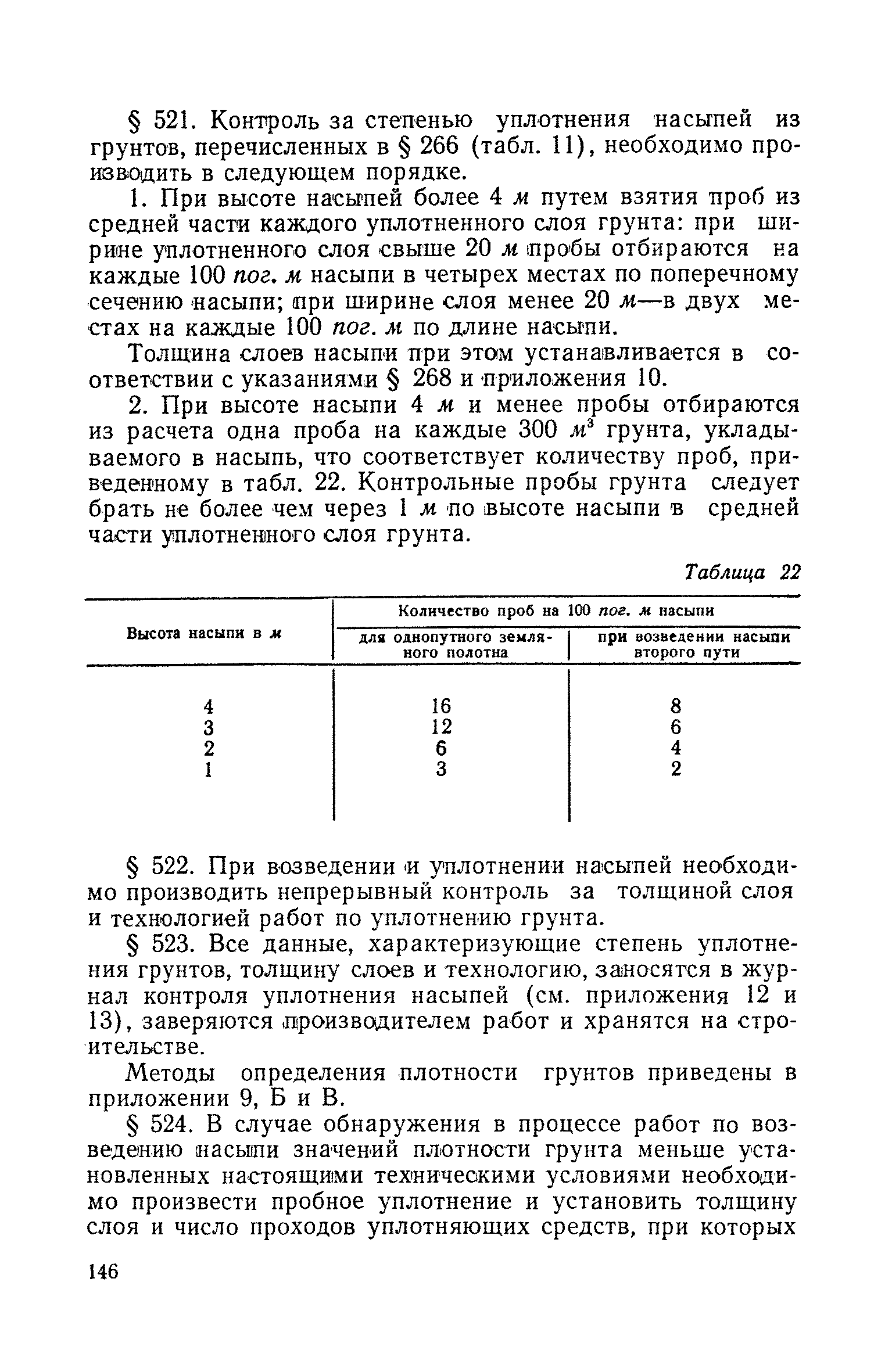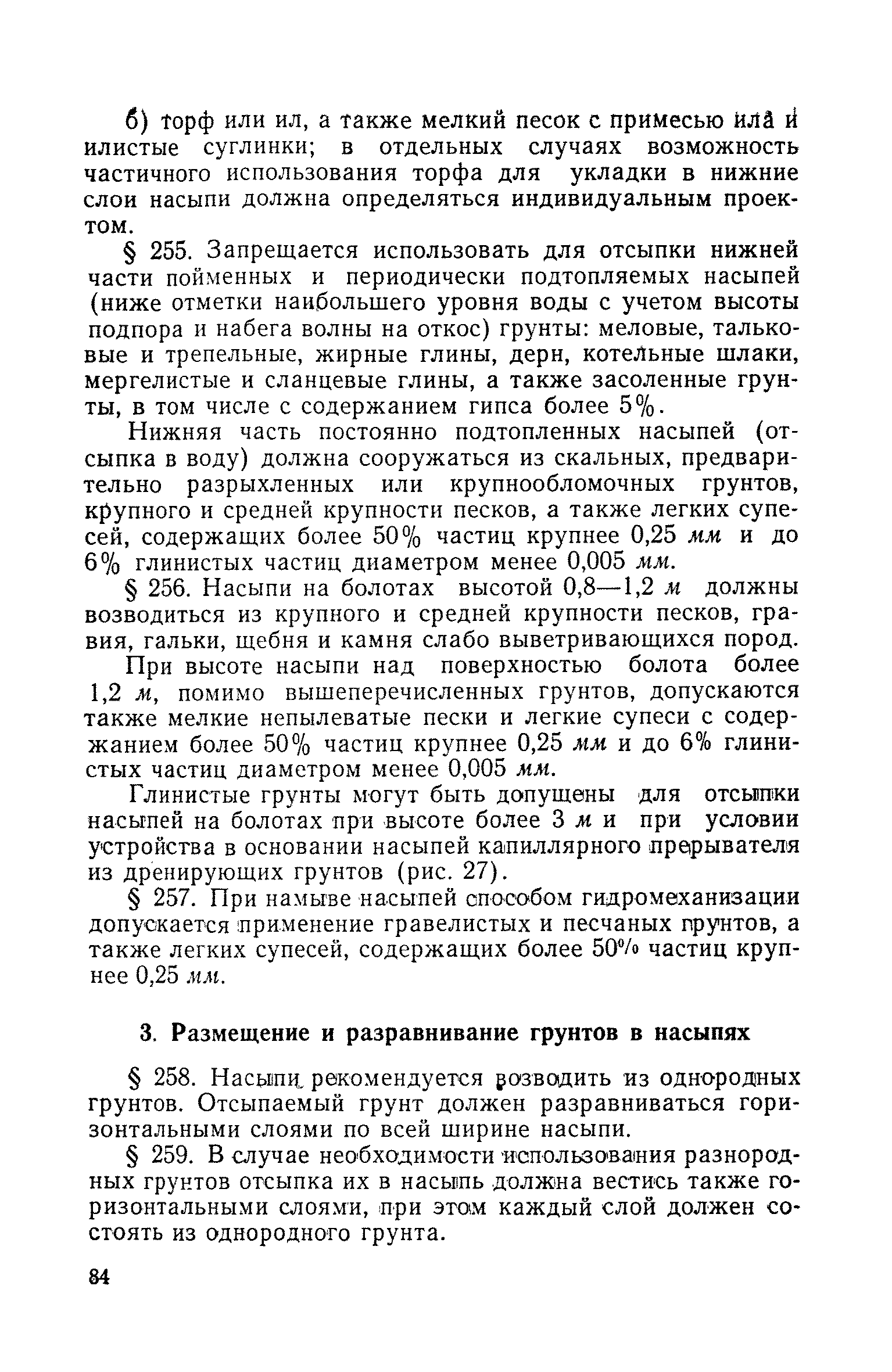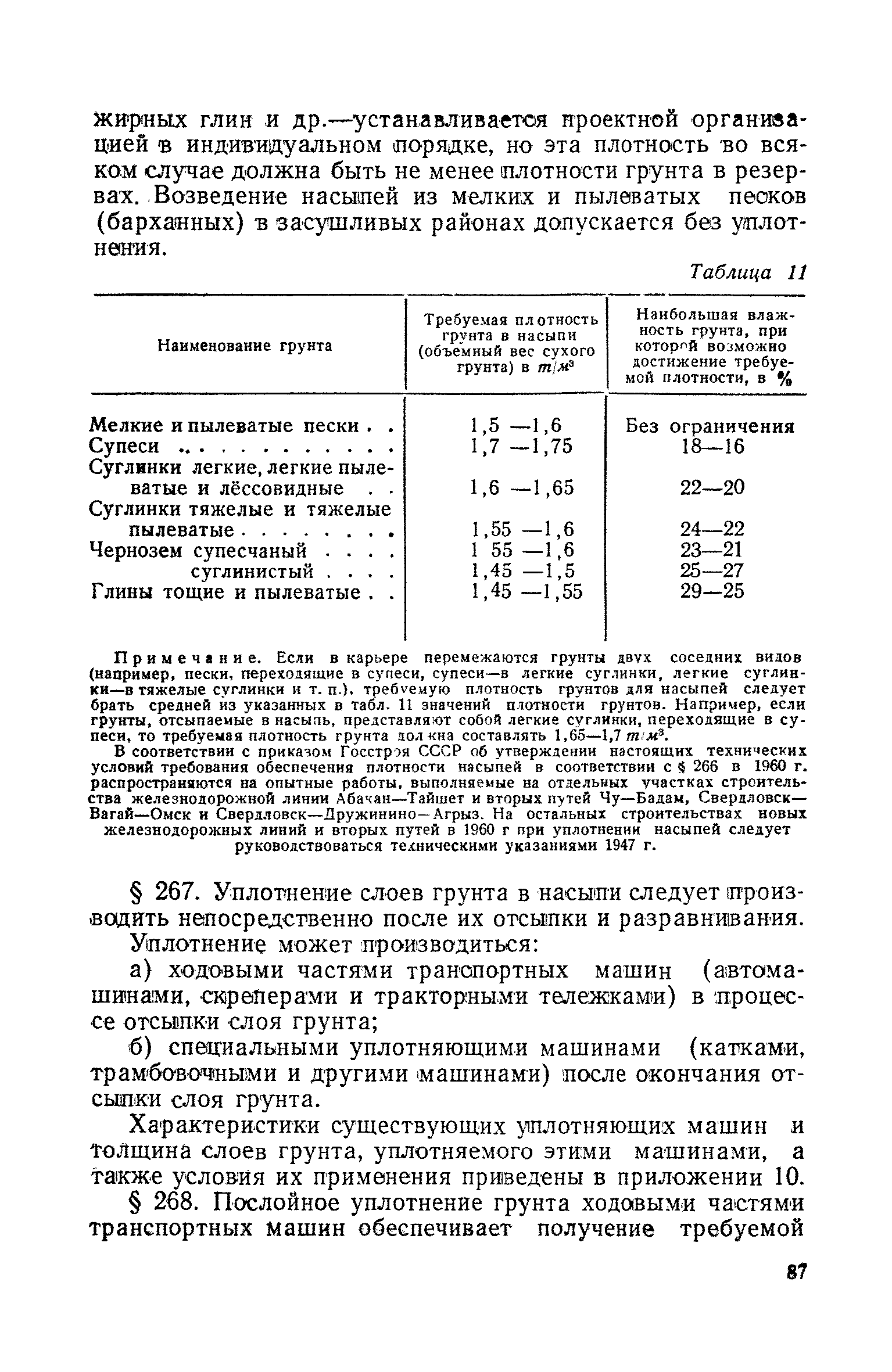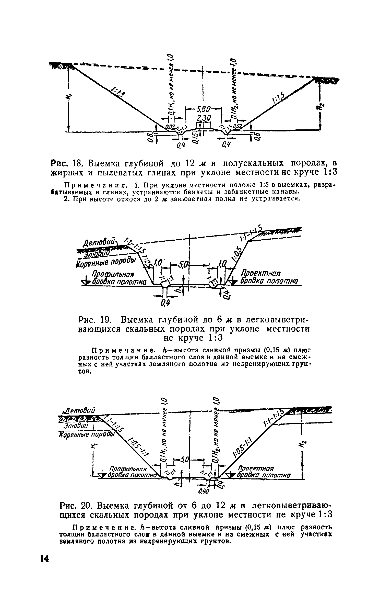 | Оглавление: | Глава 1. Общие положения 1. Основные требования 2. Проектная документация для сооружения земляного полотна 3. Полоса отвода Глава II. Конструкции земляного полотна 1. Типовые поперечные профили земляного полотна 2. Резервы, кавальеры и банкеты 3. Устройства для отвода поверхностных вод А. Общие указания Б. Продольные водоотводные канавы В. Нагорные канавы Г. Кюветы 4. Устройства для отвода грунтовых вод 5. Земляное полотно в сложных условиях А. Конструкции насыпей, возводимых на болотах Б. Конструкции насыпей при пересечении водоемов, водотоков и затопляемых мест В. Конструкции земляного полотна в песчаных районах с засушливым климатом Г. Конструкции насыпей из засоленных грунтов Д. Мероприятия по обеспечению устойчивости земляного полотна в карстовых районах Е. Противооползневые мероприятия Ж. Защита от каменных в снежных обвалов и от селевых выносов 6. Укрепления земляного полотна, водоотводных и регуляционных сооружений А. Общие указания Б. Укрепление откосов обсевом и дерновкой В. Укрепление откосов дерновкой Г. Смешанные типы ‚укреплений откосов Д. Укрепление земляного полотна в районах распространения песков Е. Железобетонные покрытия Ж. Укрепление камнем З. Укрепление из габионов И. Хворостяные укрепления К. Укрепление посадкой кустарника и деревьев Л. Укрепление кюветов, водоотводных и нагорных канав 7. Конструктивные особенности земляного полотна вторых путей Глава III. Основные требования по организации и подготовке производства земляных работ 1. Общие указания 2. Выбор ведущих землеройных и транспортных машин, а также методов взрывных и гидромеханизированных работ 3. Основные требования по организации работ на объекте 4. Восстановление и закрепление трассы 5. Разбивка земляного полотна 6. Временные автомобильные дороги Глава IV. Сооружение земляного полотна I. Основные требования 1. Подготовка основания насыпей 2. Грунты для возведения насыпей 3. Размещение и разравнивание грунтов в насыпях 4. Нормы и способы уплотнения насыпей 5. Запас на осадку насыпей 6. Отсыпка насыпей и полунасыпей на косогорах 7. Отсыпка конусов, засыпка труб и прогалов у устоев мостов 8. Отвод поверхностных и грунтовых вод при разработке выемок 9. Уширение выемок 10. Сооружение земляного полотна в районах распространения песков и засушливого климата 11. Укрепление основной площадки и откосов земляного полотна II. Указания по производству работ 1. Подготовительные работы А. Рубка леса и кустарника, корчевка пней, удаление валунов, срезка растительного слоя грунта Б. Разработка нагорных и водоотводных канав, устройство дренажей В. Устройство землевозных дорог 2. Основные работы А. Разработка выемок и карьеров экскаваторами оборудованными прямыми лопатами Б. Разработка выемок и возведение насыпей экскаваторами, оборудованными драглайнами В. Возведение насыпей транспортными машинами Г. Разработка выемок и возведение насыпей скреперами Д. Возведение насыпей грейдер-элеваторами Е. Разработка выемок и возведение насыпей бульдозерами Ж. Разработка выемок и возведение насыпей способом гидромеханизации З. Разработка выемок в грунтах, требующих предварительного рыхления взрывным способом И. Разработка выемок и полувыемок методом взрыва на выброс 3. Возведение насыпей на болотах 4. Планировка основной площадки и откосов земляного полотн