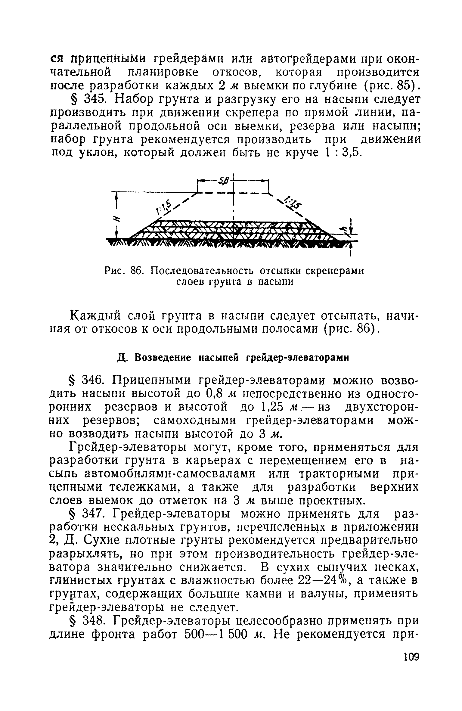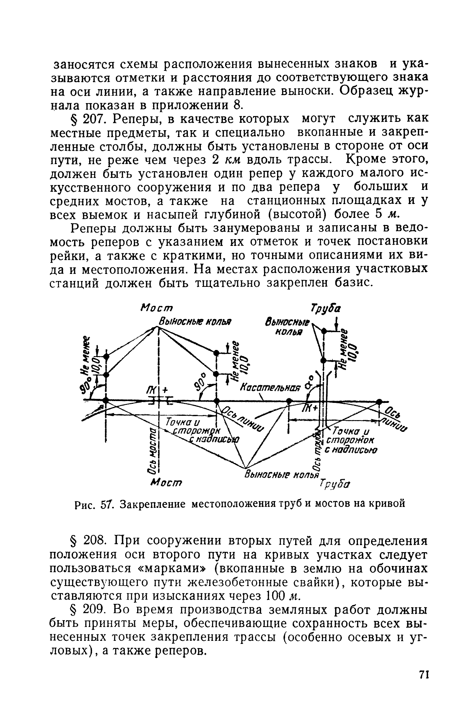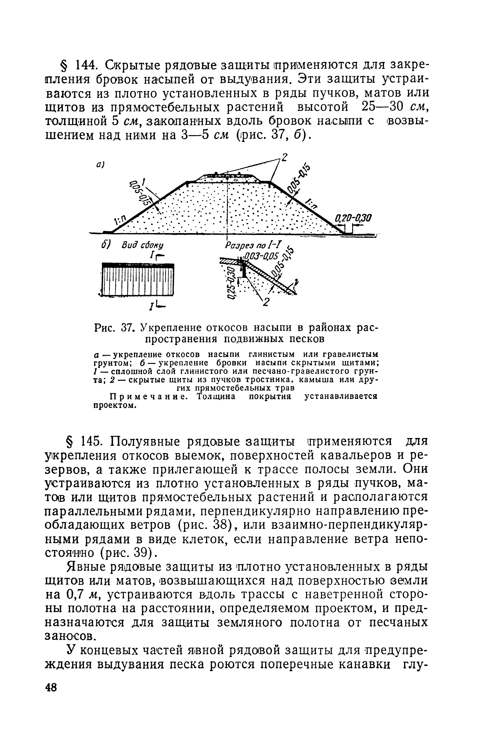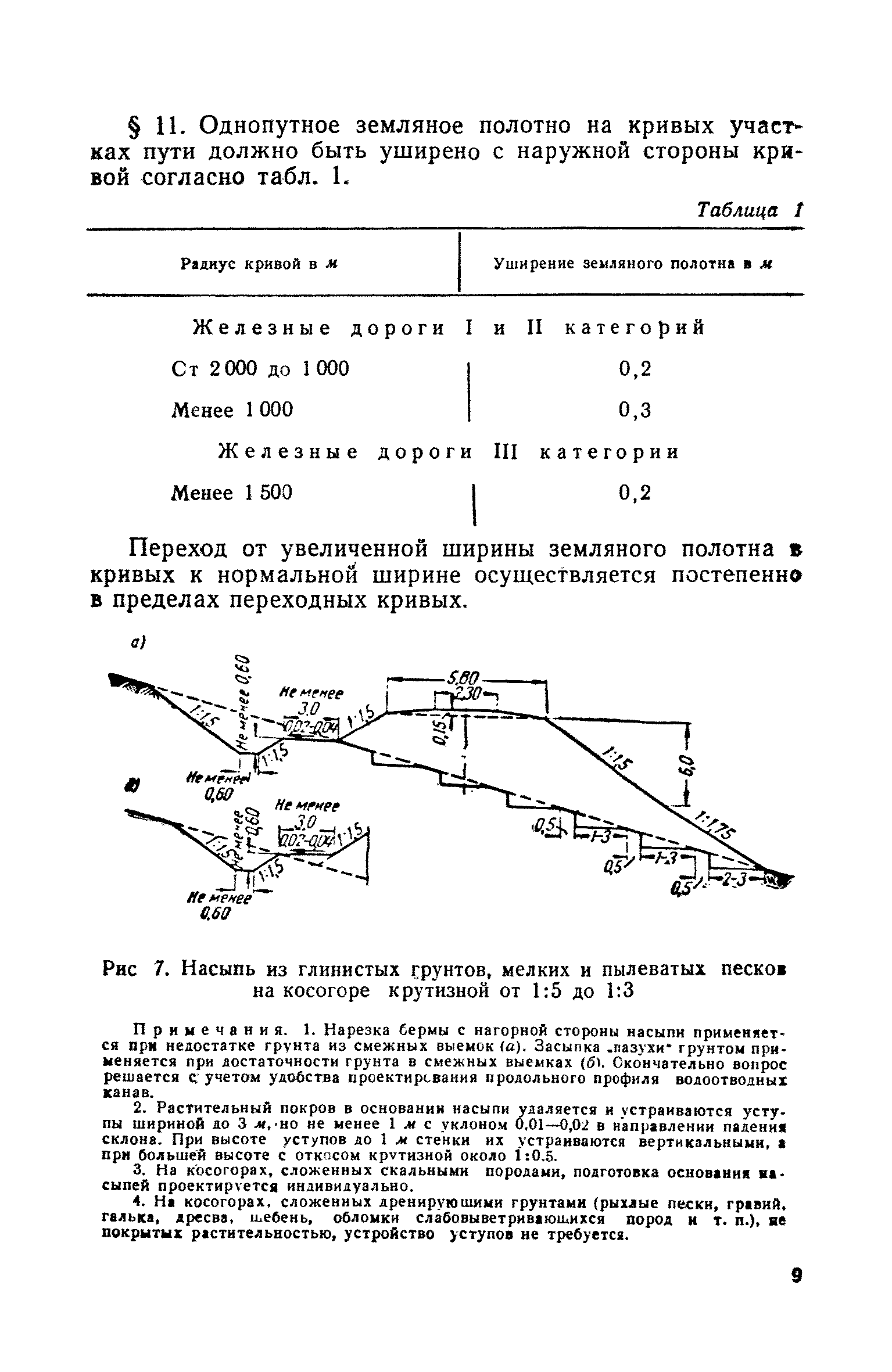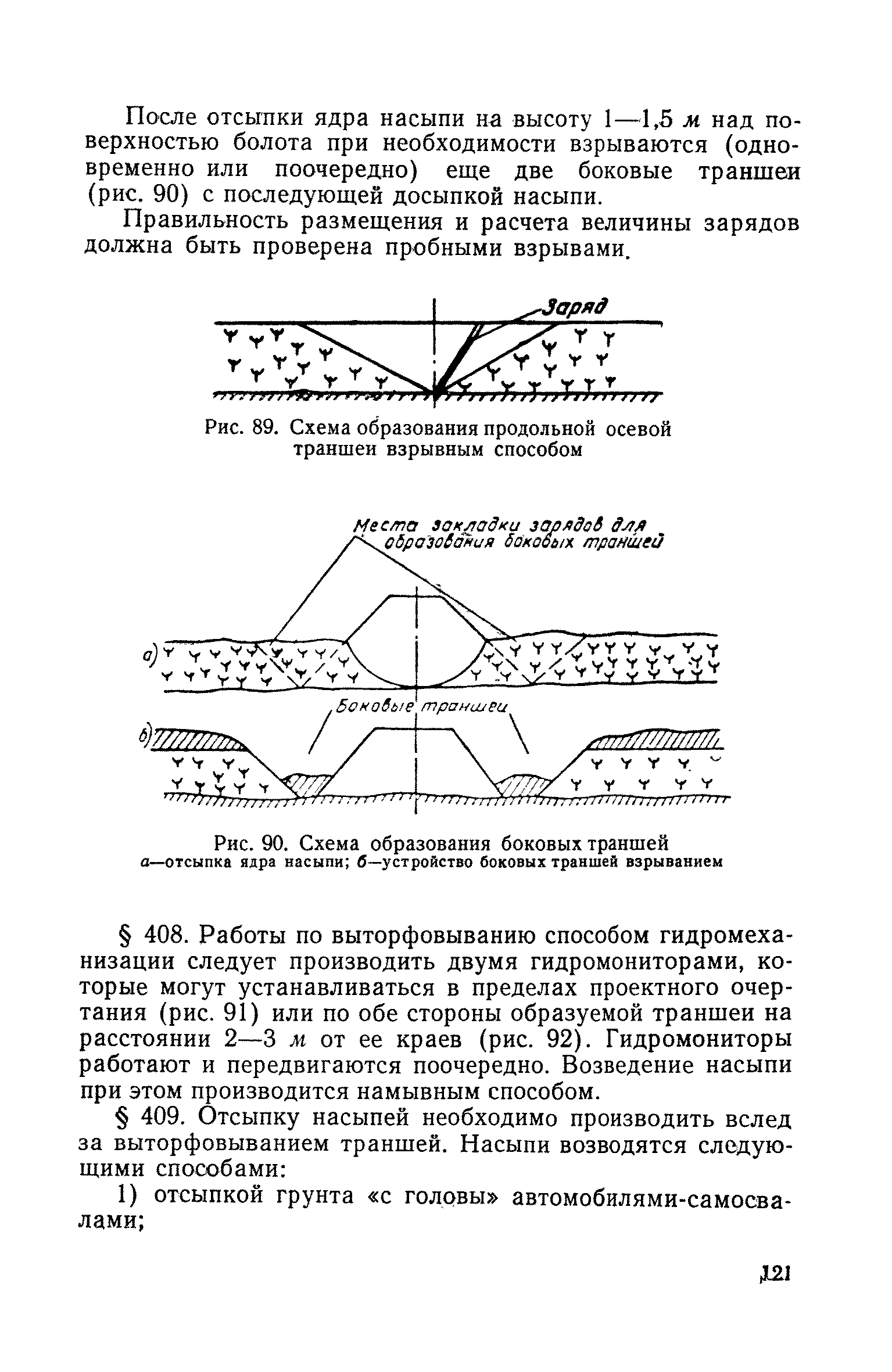 | Оглавление: | Глава 1. Общие положения 1. Основные требования 2. Проектная документация для сооружения земляного полотна 3. Полоса отвода Глава II. Конструкции земляного полотна 1. Типовые поперечные профили земляного полотна 2. Резервы, кавальеры и банкеты 3. Устройства для отвода поверхностных вод А. Общие указания Б. Продольные водоотводные канавы В. Нагорные канавы Г. Кюветы 4. Устройства для отвода грунтовых вод 5. Земляное полотно в сложных условиях А. Конструкции насыпей, возводимых на болотах Б. Конструкции насыпей при пересечении водоемов, водотоков и затопляемых мест В. Конструкции земляного полотна в песчаных районах с засушливым климатом Г. Конструкции насыпей из засоленных грунтов Д. Мероприятия по обеспечению устойчивости земляного полотна в карстовых районах Е. Противооползневые мероприятия Ж. Защита от каменных в снежных обвалов и от селевых выносов 6. Укрепления земляного полотна, водоотводных и регуляционных сооружений А. Общие указания Б. Укрепление откосов обсевом и дерновкой В. Укрепление откосов дерновкой Г. Смешанные типы ‚укреплений откосов Д. Укрепление земляного полотна в районах распространения песков Е. Железобетонные покрытия Ж. Укрепление камнем З. Укрепление из габионов И. Хворостяные укрепления К. Укрепление посадкой кустарника и деревьев Л. Укрепление кюветов, водоотводных и нагорных канав 7. Конструктивные особенности земляного полотна вторых путей Глава III. Основные требования по организации и подготовке производства земляных работ 1. Общие указания 2. Выбор ведущих землеройных и транспортных машин, а также методов взрывных и гидромеханизированных работ 3. Основные требования по организации работ на объекте 4. Восстановление и закрепление трассы 5. Разбивка земляного полотна 6. Временные автомобильные дороги Глава IV. Сооружение земляного полотна I. Основные требования 1. Подготовка основания насыпей 2. Грунты для возведения насыпей 3. Размещение и разравнивание грунтов в насыпях 4. Нормы и способы уплотнения насыпей 5. Запас на осадку насыпей 6. Отсыпка насыпей и полунасыпей на косогорах 7. Отсыпка конусов, засыпка труб и прогалов у устоев мостов 8. Отвод поверхностных и грунтовых вод при разработке выемок 9. Уширение выемок 10. Сооружение земляного полотна в районах распространения песков и засушливого климата 11. Укрепление основной площадки и откосов земляного полотна II. Указания по производству работ 1. Подготовительные работы А. Рубка леса и кустарника, корчевка пней, удаление валунов, срезка растительного слоя грунта Б. Разработка нагорных и водоотводных канав, устройство дренажей В. Устройство землевозных дорог 2. Основные работы А. Разработка выемок и карьеров экскаваторами оборудованными прямыми лопатами Б. Разработка выемок и возведение насыпей экскаваторами, оборудованными драглайнами В. Возведение насыпей транспортными машинами Г. Разработка выемок и возведение насыпей скреперами Д. Возведение насыпей грейдер-элеваторами Е. Разработка выемок и возведение насыпей бульдозерами Ж. Разработка выемок и возведение насыпей способом гидромеханизации З. Разработка выемок в грунтах, требующих предварительного рыхления взрывным способом И. Разработка выемок и полувыемок методом взрыва на выброс 3. Возведение насыпей на болотах 4. Планировка основной площадки и откосов земляного полотн