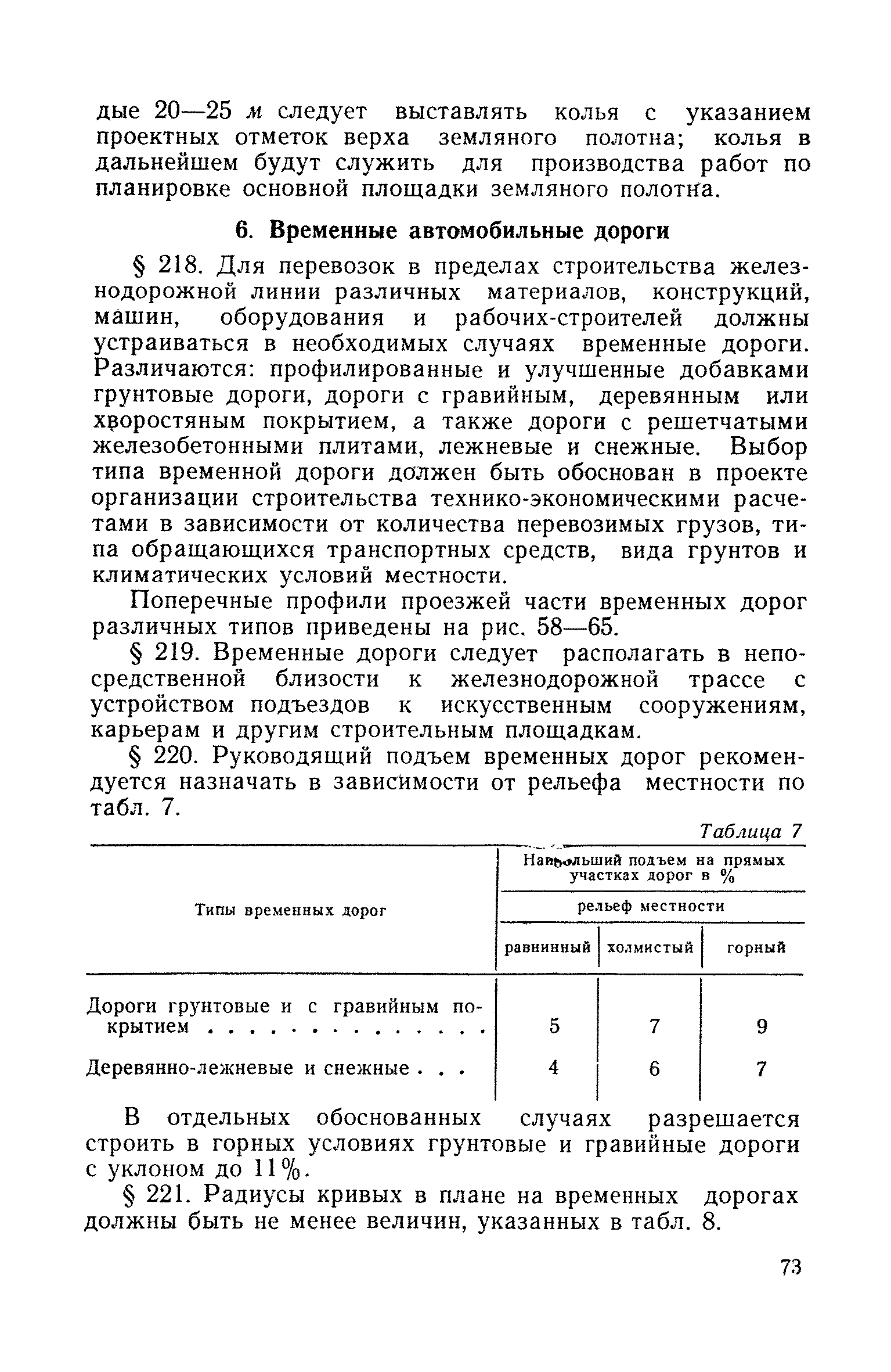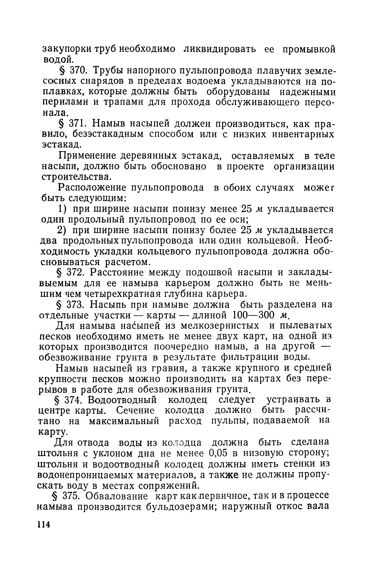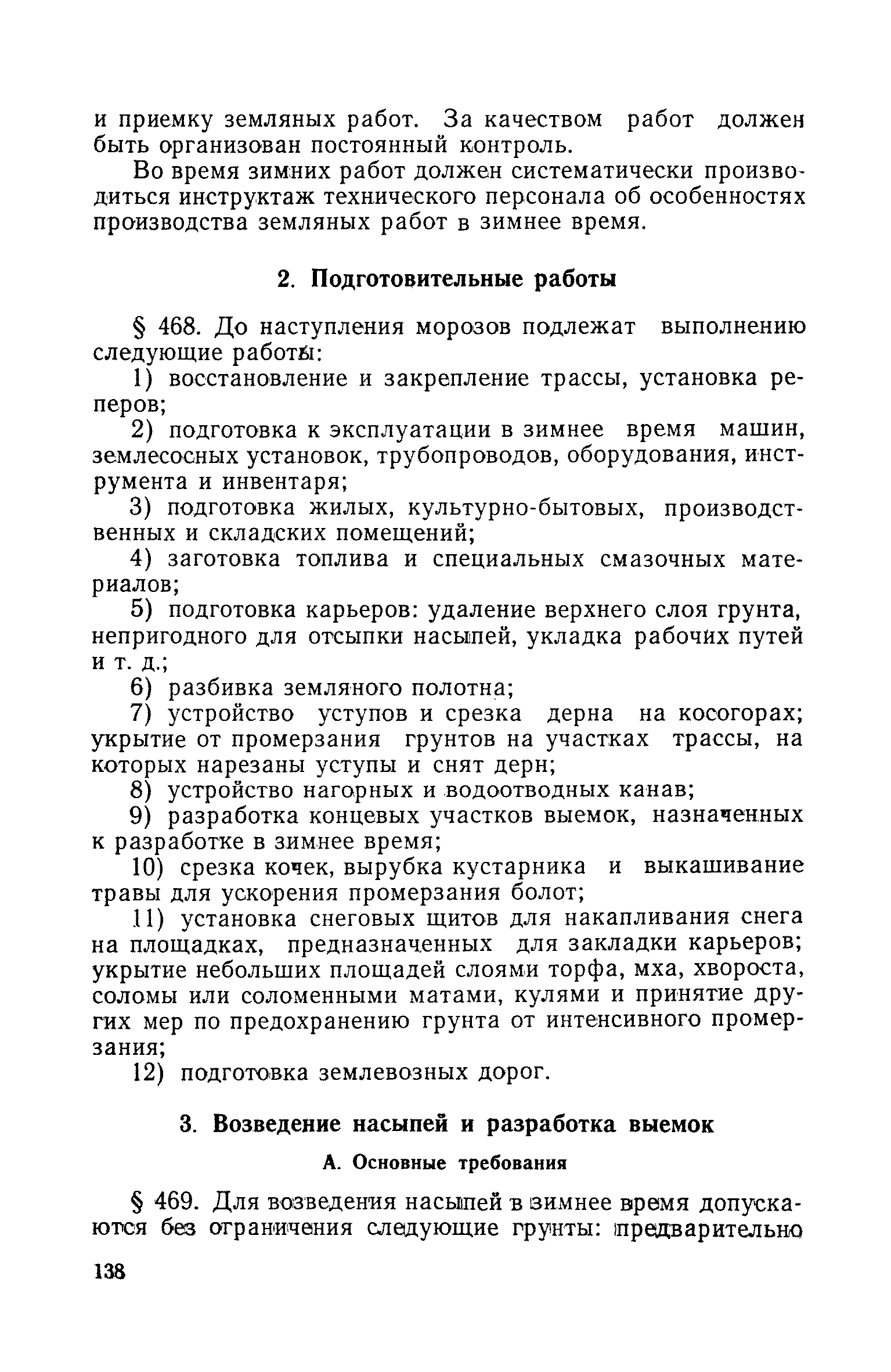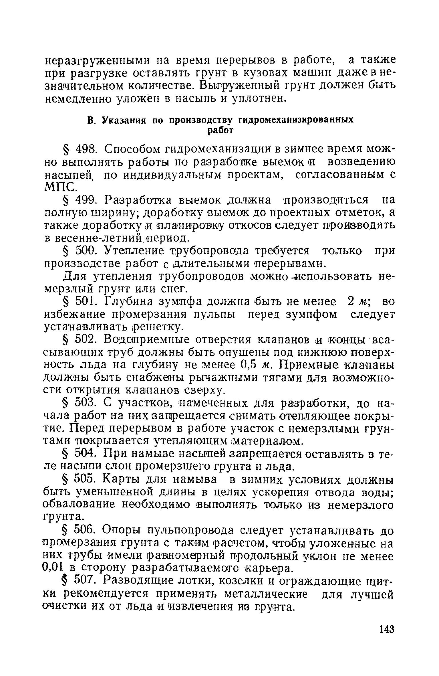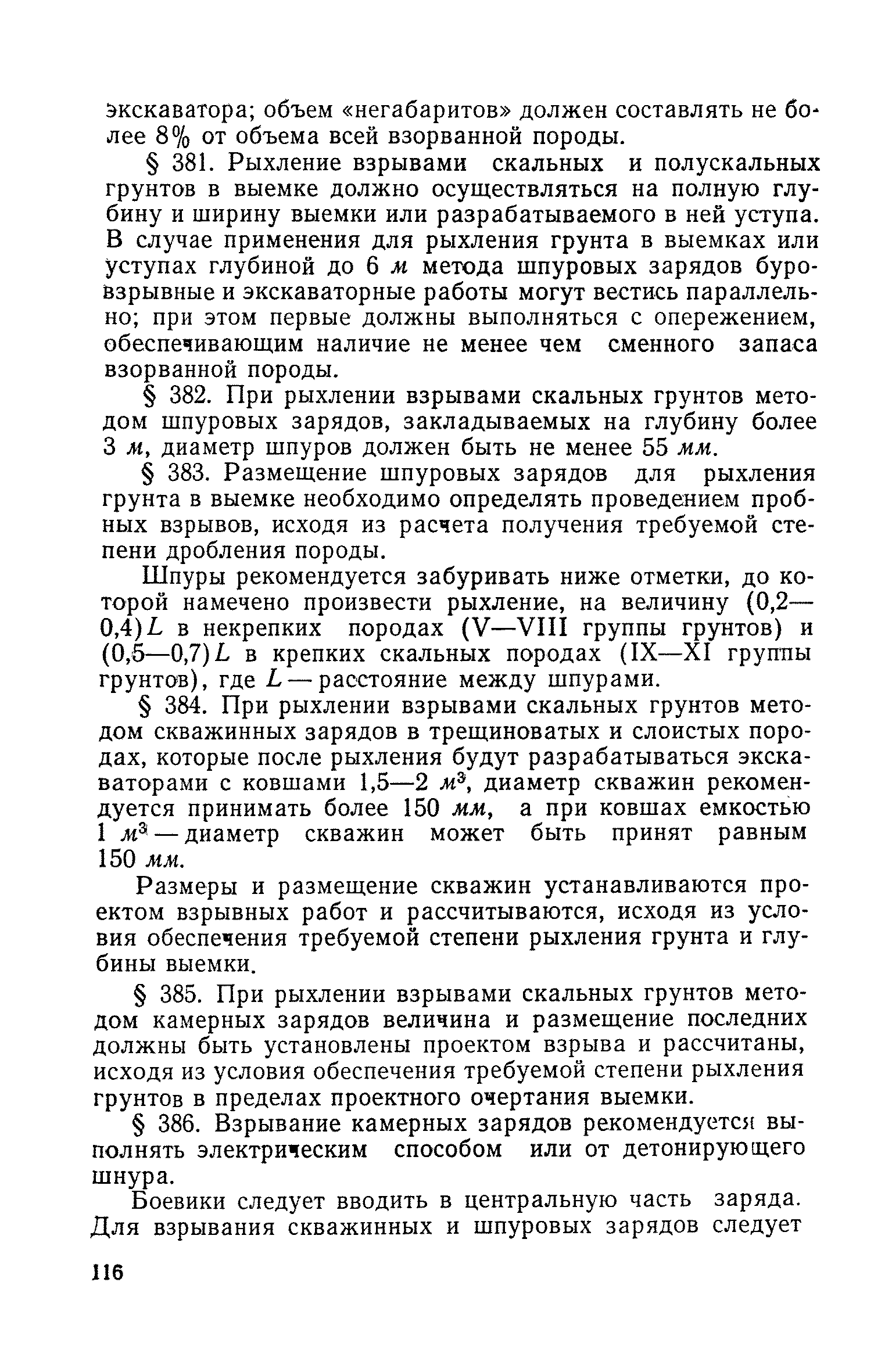 | Оглавление: | Глава 1. Общие положения 1. Основные требования 2. Проектная документация для сооружения земляного полотна 3. Полоса отвода Глава II. Конструкции земляного полотна 1. Типовые поперечные профили земляного полотна 2. Резервы, кавальеры и банкеты 3. Устройства для отвода поверхностных вод А. Общие указания Б. Продольные водоотводные канавы В. Нагорные канавы Г. Кюветы 4. Устройства для отвода грунтовых вод 5. Земляное полотно в сложных условиях А. Конструкции насыпей, возводимых на болотах Б. Конструкции насыпей при пересечении водоемов, водотоков и затопляемых мест В. Конструкции земляного полотна в песчаных районах с засушливым климатом Г. Конструкции насыпей из засоленных грунтов Д. Мероприятия по обеспечению устойчивости земляного полотна в карстовых районах Е. Противооползневые мероприятия Ж. Защита от каменных в снежных обвалов и от селевых выносов 6. Укрепления земляного полотна, водоотводных и регуляционных сооружений А. Общие указания Б. Укрепление откосов обсевом и дерновкой В. Укрепление откосов дерновкой Г. Смешанные типы ‚укреплений откосов Д. Укрепление земляного полотна в районах распространения песков Е. Железобетонные покрытия Ж. Укрепление камнем З. Укрепление из габионов И. Хворостяные укрепления К. Укрепление посадкой кустарника и деревьев Л. Укрепление кюветов, водоотводных и нагорных канав 7. Конструктивные особенности земляного полотна вторых путей Глава III. Основные требования по организации и подготовке производства земляных работ 1. Общие указания 2. Выбор ведущих землеройных и транспортных машин, а также методов взрывных и гидромеханизированных работ 3. Основные требования по организации работ на объекте 4. Восстановление и закрепление трассы 5. Разбивка земляного полотна 6. Временные автомобильные дороги Глава IV. Сооружение земляного полотна I. Основные требования 1. Подготовка основания насыпей 2. Грунты для возведения насыпей 3. Размещение и разравнивание грунтов в насыпях 4. Нормы и способы уплотнения насыпей 5. Запас на осадку насыпей 6. Отсыпка насыпей и полунасыпей на косогорах 7. Отсыпка конусов, засыпка труб и прогалов у устоев мостов 8. Отвод поверхностных и грунтовых вод при разработке выемок 9. Уширение выемок 10. Сооружение земляного полотна в районах распространения песков и засушливого климата 11. Укрепление основной площадки и откосов земляного полотна II. Указания по производству работ 1. Подготовительные работы А. Рубка леса и кустарника, корчевка пней, удаление валунов, срезка растительного слоя грунта Б. Разработка нагорных и водоотводных канав, устройство дренажей В. Устройство землевозных дорог 2. Основные работы А. Разработка выемок и карьеров экскаваторами оборудованными прямыми лопатами Б. Разработка выемок и возведение насыпей экскаваторами, оборудованными драглайнами В. Возведение насыпей транспортными машинами Г. Разработка выемок и возведение насыпей скреперами Д. Возведение насыпей грейдер-элеваторами Е. Разработка выемок и возведение насыпей бульдозерами Ж. Разработка выемок и возведение насыпей способом гидромеханизации З. Разработка выемок в грунтах, требующих предварительного рыхления взрывным способом И. Разработка выемок и полувыемок методом взрыва на выброс 3. Возведение насыпей на болотах 4. Планировка основной площадки и откосов земляного полотн