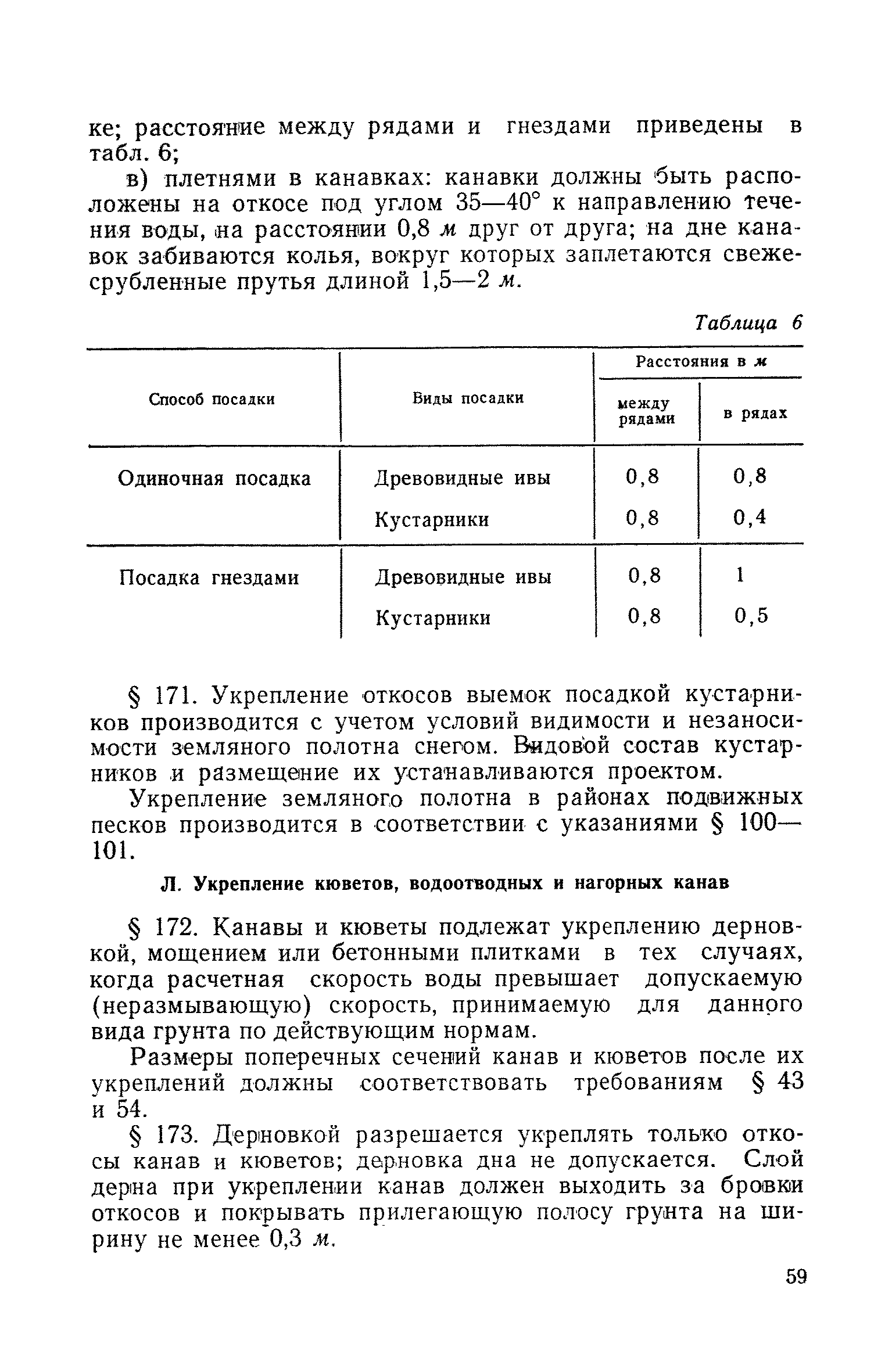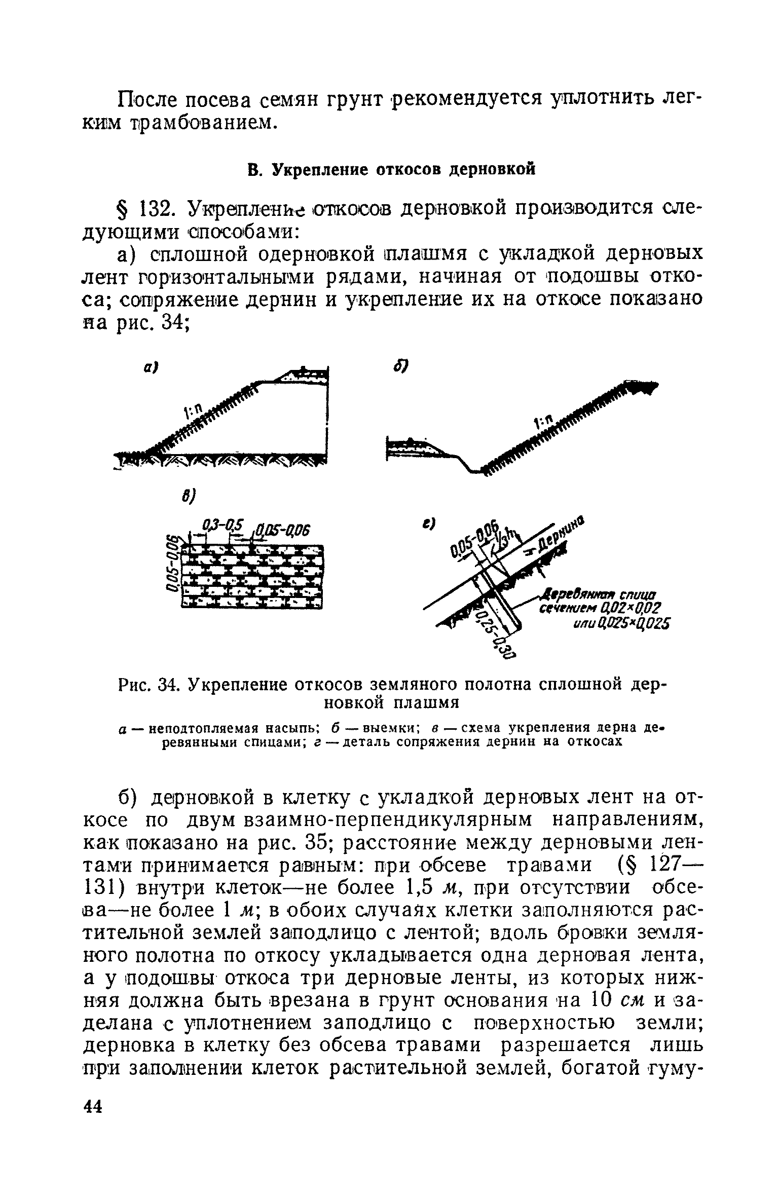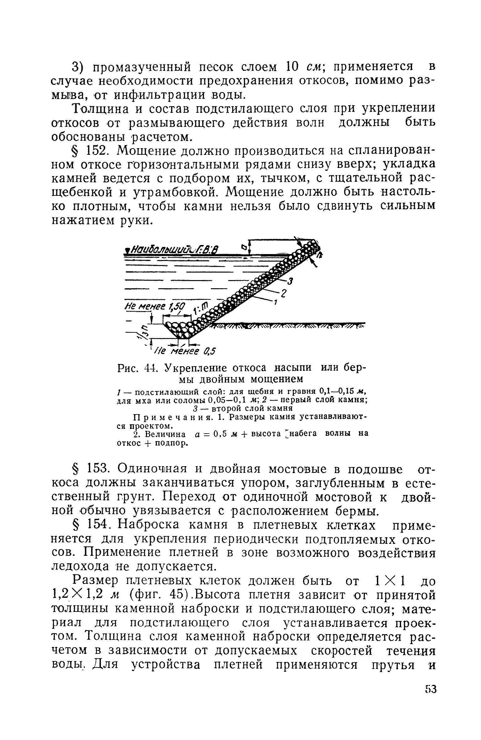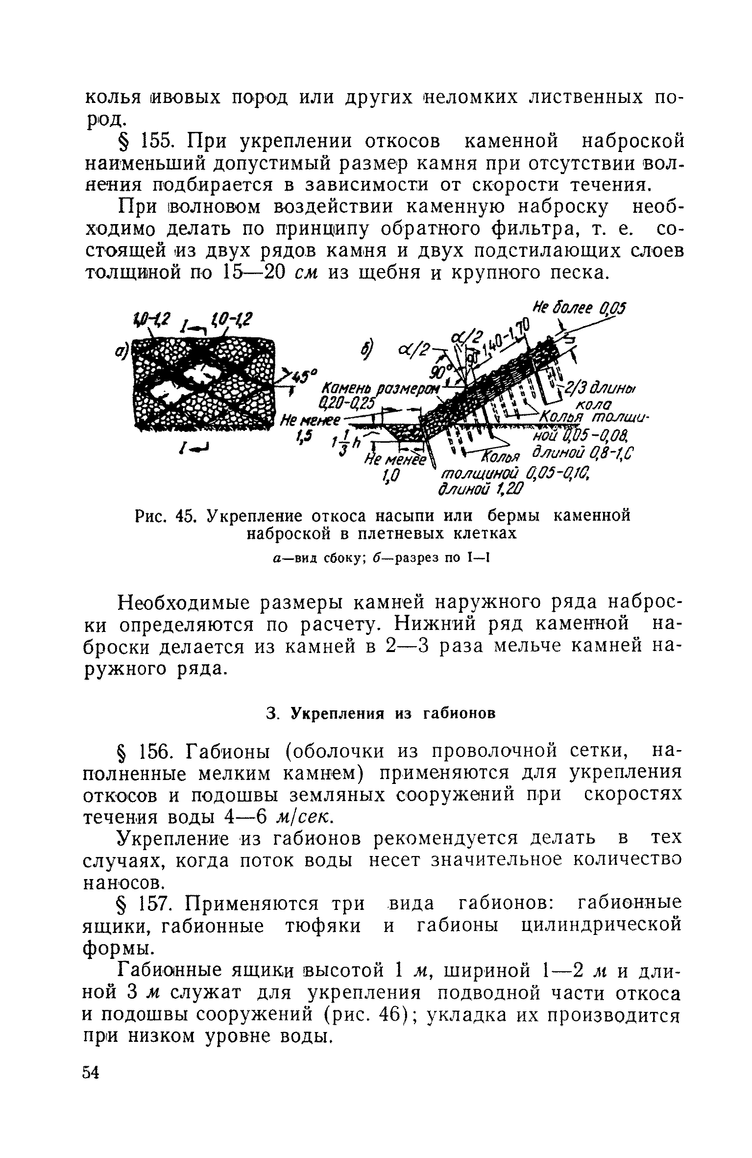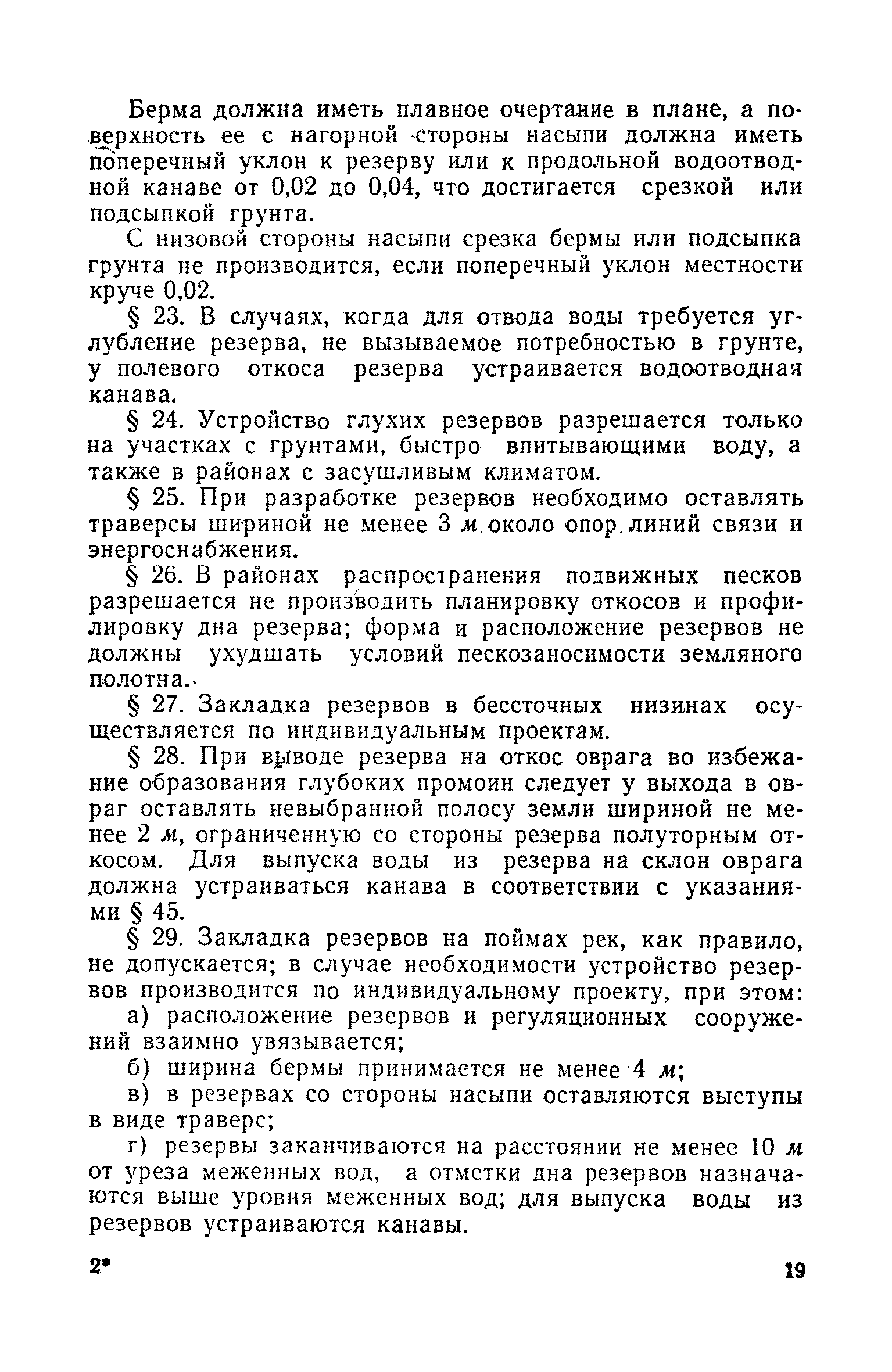 | Оглавление: | Глава 1. Общие положения 1. Основные требования 2. Проектная документация для сооружения земляного полотна 3. Полоса отвода Глава II. Конструкции земляного полотна 1. Типовые поперечные профили земляного полотна 2. Резервы, кавальеры и банкеты 3. Устройства для отвода поверхностных вод А. Общие указания Б. Продольные водоотводные канавы В. Нагорные канавы Г. Кюветы 4. Устройства для отвода грунтовых вод 5. Земляное полотно в сложных условиях А. Конструкции насыпей, возводимых на болотах Б. Конструкции насыпей при пересечении водоемов, водотоков и затопляемых мест В. Конструкции земляного полотна в песчаных районах с засушливым климатом Г. Конструкции насыпей из засоленных грунтов Д. Мероприятия по обеспечению устойчивости земляного полотна в карстовых районах Е. Противооползневые мероприятия Ж. Защита от каменных в снежных обвалов и от селевых выносов 6. Укрепления земляного полотна, водоотводных и регуляционных сооружений А. Общие указания Б. Укрепление откосов обсевом и дерновкой В. Укрепление откосов дерновкой Г. Смешанные типы ‚укреплений откосов Д. Укрепление земляного полотна в районах распространения песков Е. Железобетонные покрытия Ж. Укрепление камнем З. Укрепление из габионов И. Хворостяные укрепления К. Укрепление посадкой кустарника и деревьев Л. Укрепление кюветов, водоотводных и нагорных канав 7. Конструктивные особенности земляного полотна вторых путей Глава III. Основные требования по организации и подготовке производства земляных работ 1. Общие указания 2. Выбор ведущих землеройных и транспортных машин, а также методов взрывных и гидромеханизированных работ 3. Основные требования по организации работ на объекте 4. Восстановление и закрепление трассы 5. Разбивка земляного полотна 6. Временные автомобильные дороги Глава IV. Сооружение земляного полотна I. Основные требования 1. Подготовка основания насыпей 2. Грунты для возведения насыпей 3. Размещение и разравнивание грунтов в насыпях 4. Нормы и способы уплотнения насыпей 5. Запас на осадку насыпей 6. Отсыпка насыпей и полунасыпей на косогорах 7. Отсыпка конусов, засыпка труб и прогалов у устоев мостов 8. Отвод поверхностных и грунтовых вод при разработке выемок 9. Уширение выемок 10. Сооружение земляного полотна в районах распространения песков и засушливого климата 11. Укрепление основной площадки и откосов земляного полотна II. Указания по производству работ 1. Подготовительные работы А. Рубка леса и кустарника, корчевка пней, удаление валунов, срезка растительного слоя грунта Б. Разработка нагорных и водоотводных канав, устройство дренажей В. Устройство землевозных дорог 2. Основные работы А. Разработка выемок и карьеров экскаваторами оборудованными прямыми лопатами Б. Разработка выемок и возведение насыпей экскаваторами, оборудованными драглайнами В. Возведение насыпей транспортными машинами Г. Разработка выемок и возведение насыпей скреперами Д. Возведение насыпей грейдер-элеваторами Е. Разработка выемок и возведение насыпей бульдозерами Ж. Разработка выемок и возведение насыпей способом гидромеханизации З. Разработка выемок в грунтах, требующих предварительного рыхления взрывным способом И. Разработка выемок и полувыемок методом взрыва на выброс 3. Возведение насыпей на болотах 4. Планировка основной площадки и откосов земляного полотн