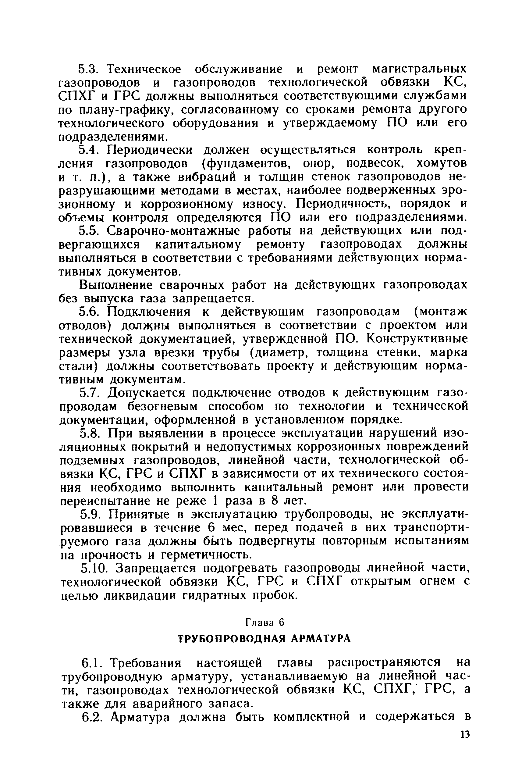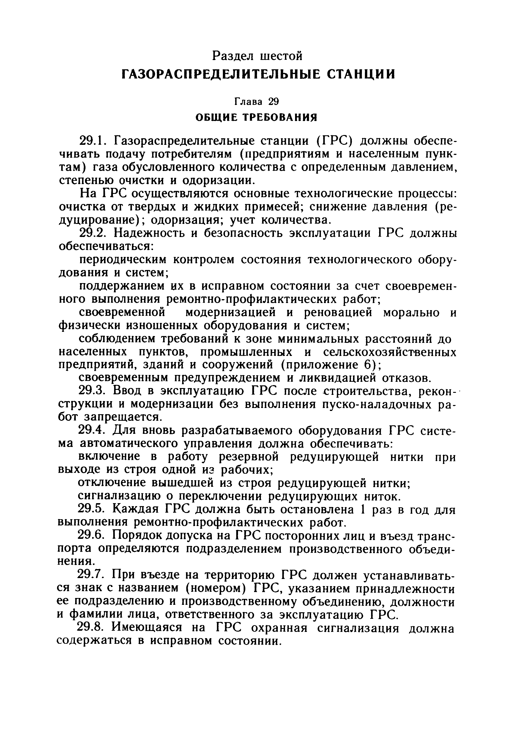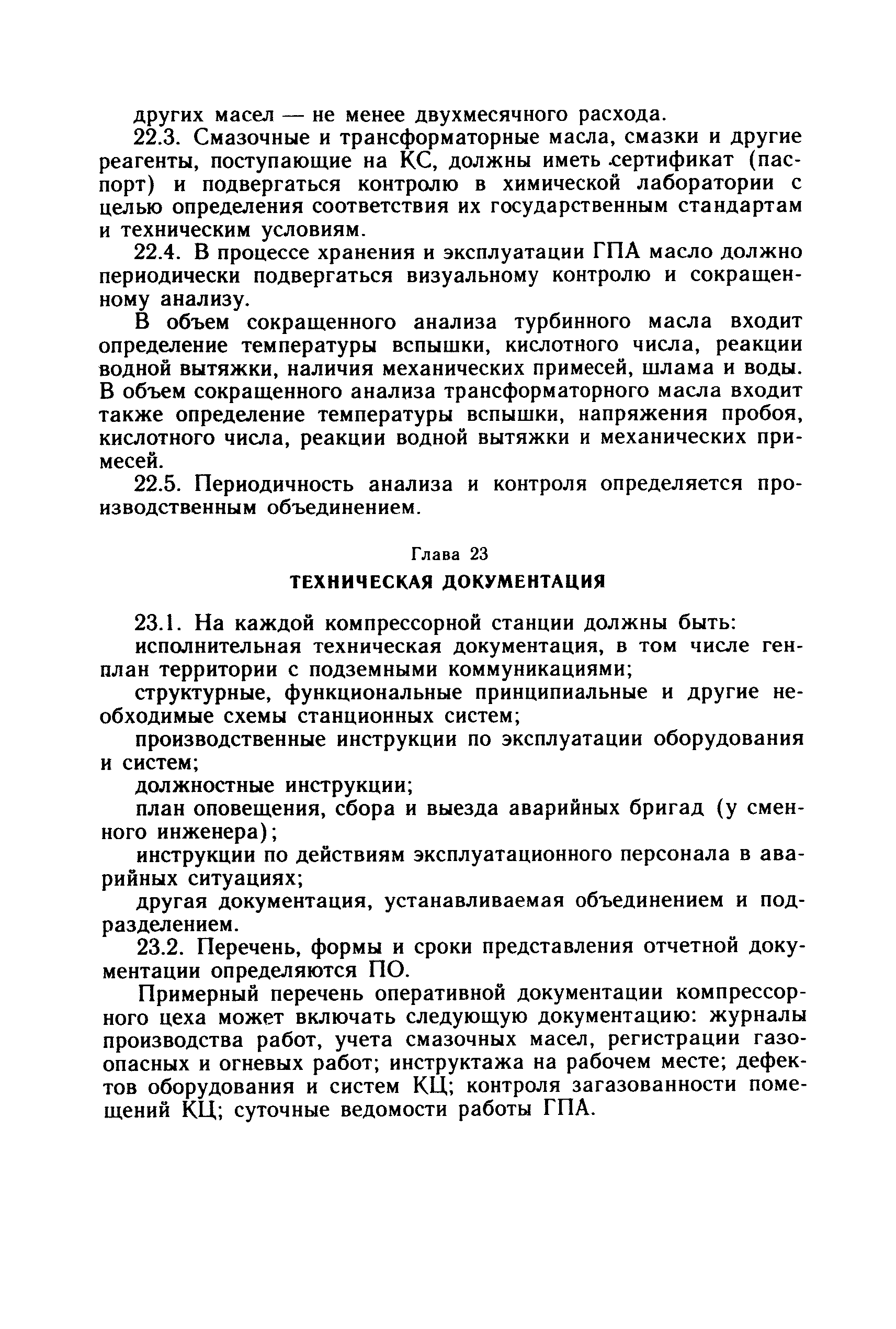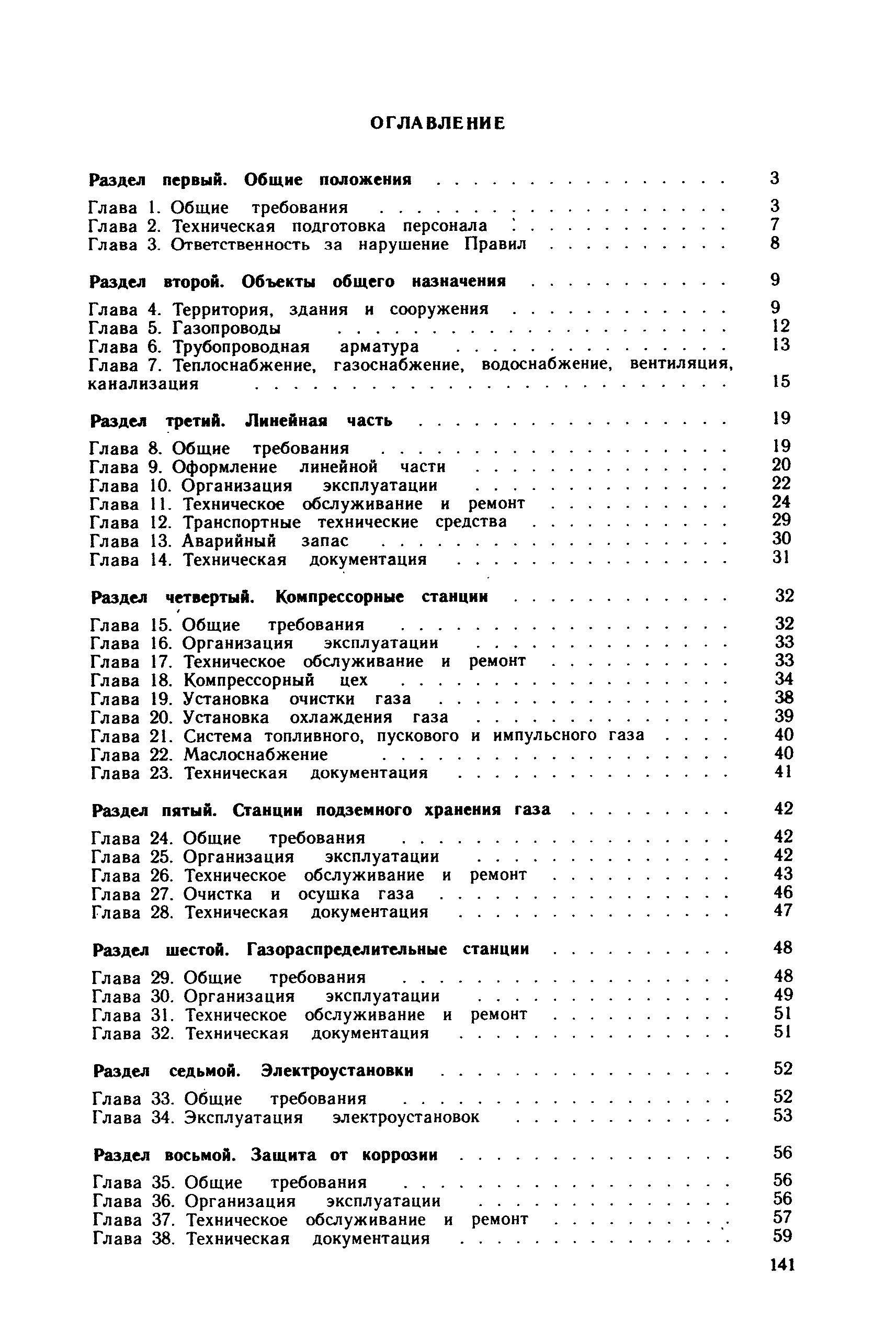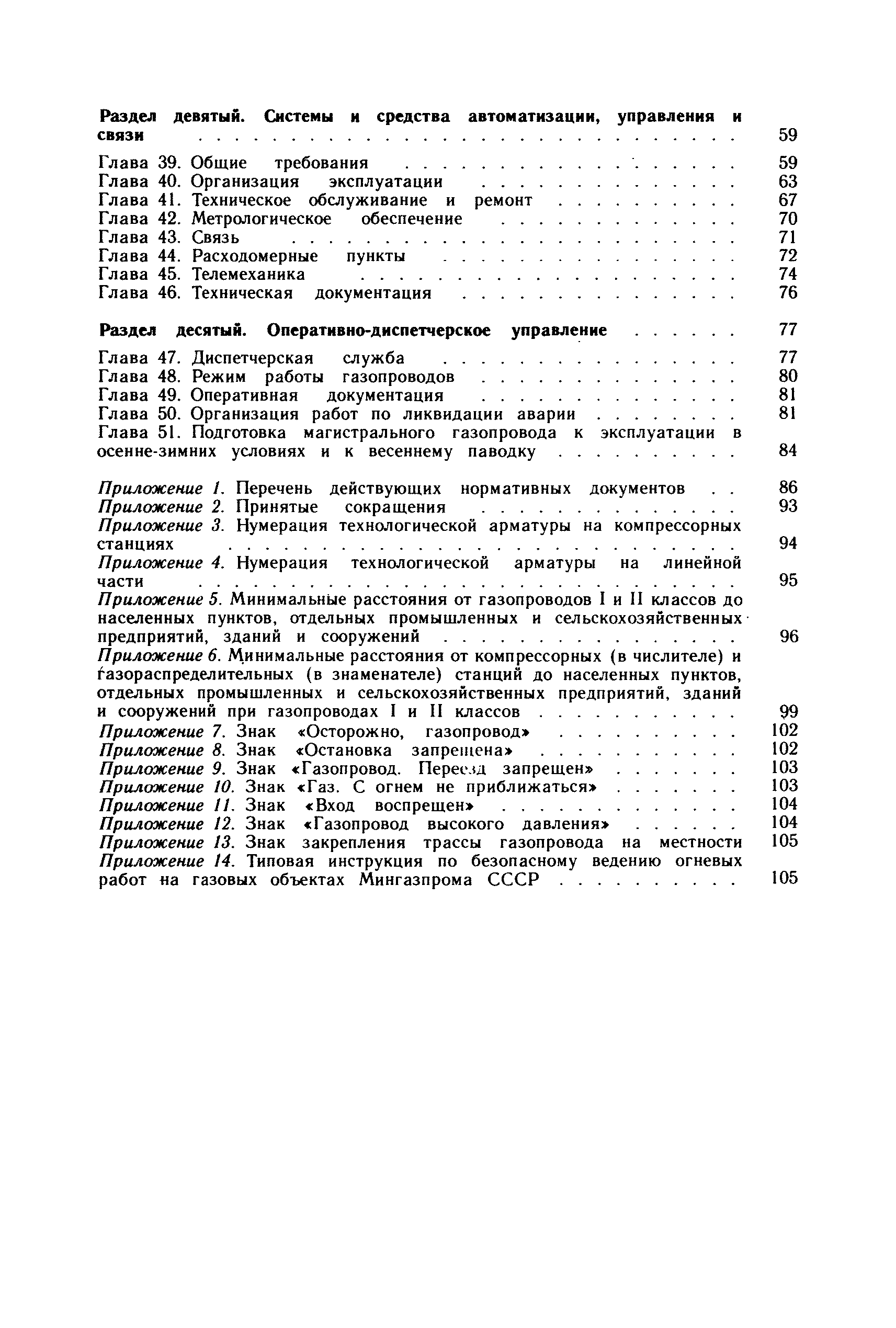 | Оглавление: | Раздел первый. Общие положения Глава 1. Общие требования Глава 2. Техническая подготовка персонала Глава 3. Ответственность за нарушение Правил Раздел второй. Объекты общего назначения Глава 4. Территория, здания и сооружения Глава 5. Газопроводы Глава 6. Трубопроводная арматура Глава 7. Теплоснабжение, газоснабжение, водоснабжение, вентиляция, канализация Раздел третий. Линейная часть Глава 8. Общие требования Глава 9. Оформление линейной части Глава 10. Организация эксплуатации Глава 11. Техническое обслуживание и ремонт Глава 12. Транспортные технические средства Глава 13. Аварийный запас Глава 14. Техническая документация Раздел четвертый. Компрессорные станции Глава 15. Общие требования Глава 16. Организация эксплуатации Глава 17. Техническое обслуживание и ремонт Глава 18. Компрессорный цех Глава 19. Установка очистки газа Глава 20. Установка охлаждения газа Глава 21. Система топливного, пускового и импульсного Глава 22. Маслоснабжение Глава 23. Техническая документация Раздел пятый. Станции подземного хранения газа Глава 24. Общие требования Глава 25. Организация эксплуатации Глава 26. Техническое обслуживание и ремонт Глава 27. Очистка и осушка газа Глава 28. Техническая документация Раздел шестой. Газораспределительные станции Глава 29. Общие требования Глава 30. Организация эксплуатации Глава 31. Техническое обслуживание и ремонт Глава 32. Техническая документация Раздел седьмой. Электроустановки Глава 33. Общие требования Глава 34. Эксплуатация электроустановок Раздел восьмой. Защита от коррозии Глава 35. Общие требования Глава 36. Организация эксплуатации Глава 37. Техническое обслуживание и ремонт Глава 38. Техническая документация Раздел девятый. Системы и средства автоматизации, управления и связи Глава 39. Общие требования Глава 40. Организация эксплуатации Глава 41. Техническое обслуживание и ремонт Глава 42. Метрологическое обеспечение Глава 43. Связь Глава 44. Расходомерные пункты Глава 45. Телемеханика Глава 46. Техническая документация Раздел десятый. Оперативно-диспетчерское управление Глава 47. Диспетчерская служба Глава 48. Режим работы газопроводов Глава 49. Оперативная документация Глава 50. Организация работ по ликвидации аварии Глава 51. Подготовка магистрального газопровода к эксплуатации в осенне-зимних условиях и к весеннему паводку Приложение 1. Перечень действующих нормативных документов . Приложение 2. Принятые сокращения Приложение 3. Нумерация технологической арматуры на компрессорных станциях Приложение 4. Нумерация технологической арматуры на линейной части Приложение 5. Минимальные расстояния от газопроводов I и II классов до населенных пунктов, отдельных промышленных и сельскохозяйственных предприятий, зданий и сооружений Приложение 6. Минимальные расстояния от компрессорных (в числителе) и газораспределительных (в знаменателе) станций до населенных пунктов, отдельных промышленных и сельскохозяйственных предприятий, зданий и сооружений при газопроводах I и II классов Приложение 7. Знак "Осторожно, газопровод" Приложение 8. Знак "Остановка запрещена" Приложение 9. Знак "Газопровод. Переезд запрещен" Приложение 10. Знак "Газ. С огнем не приближаться" Приложение 11. Знак "Вход воспрещен" Приложение 12. Знак "Газопровод высокого давления" Приложение 13. Знак закрепления трассы газопровода на местности Приложе