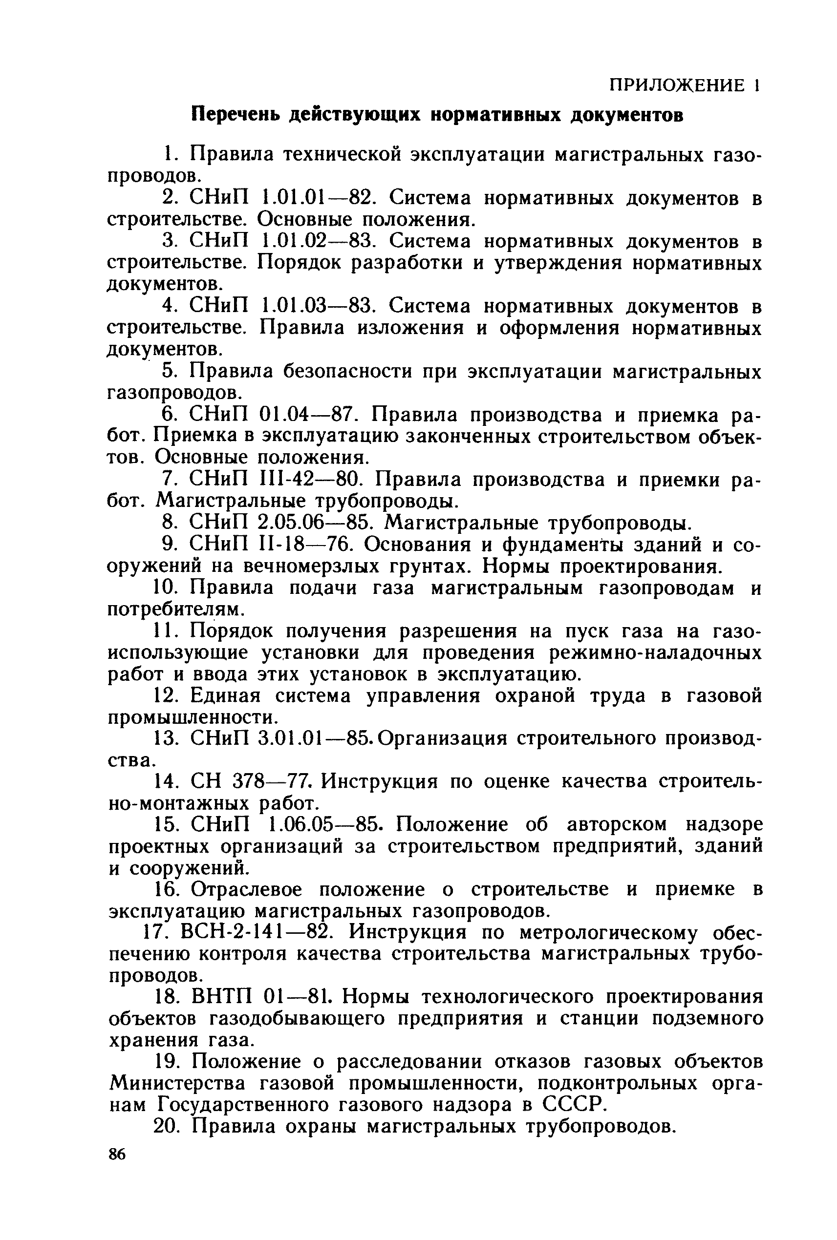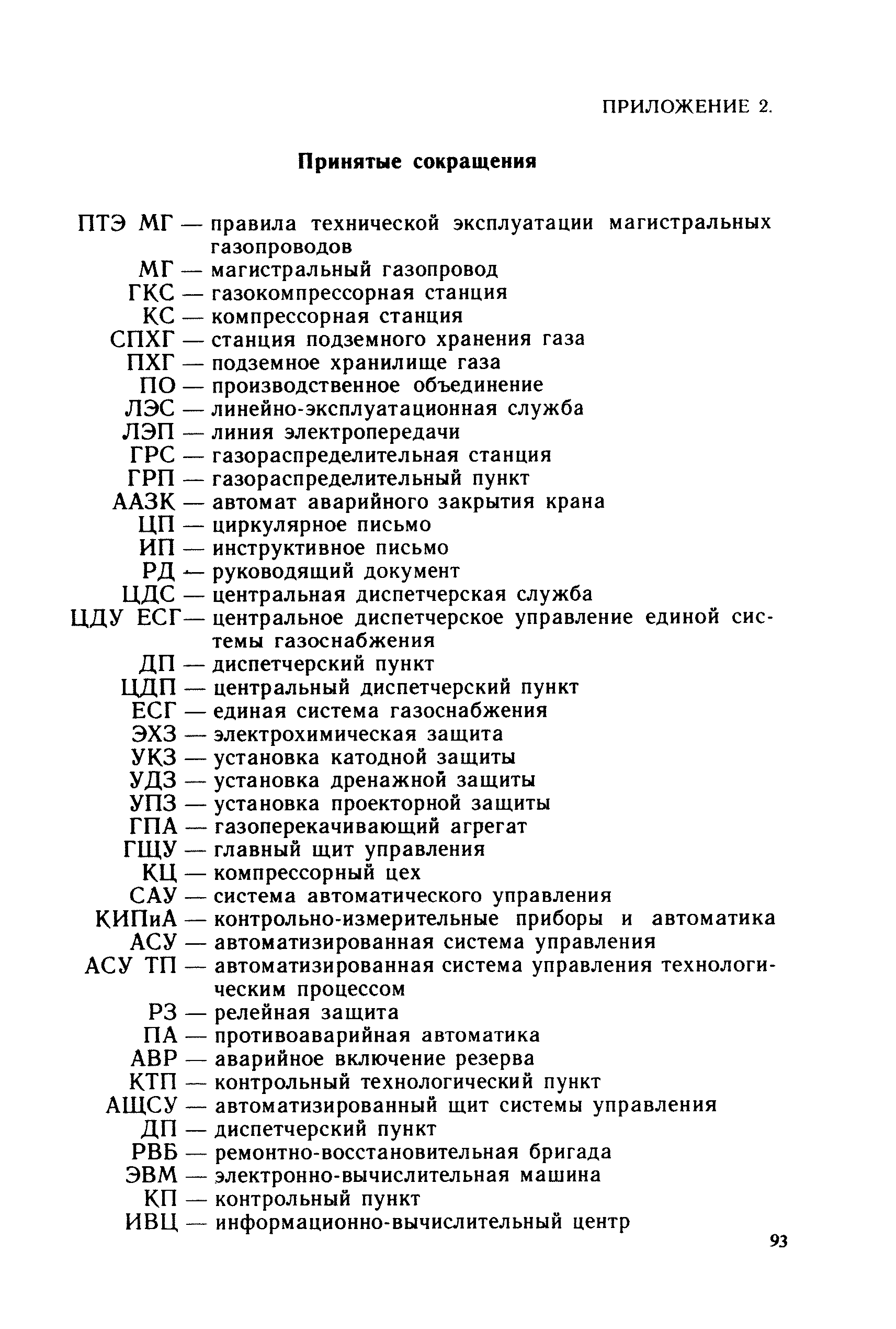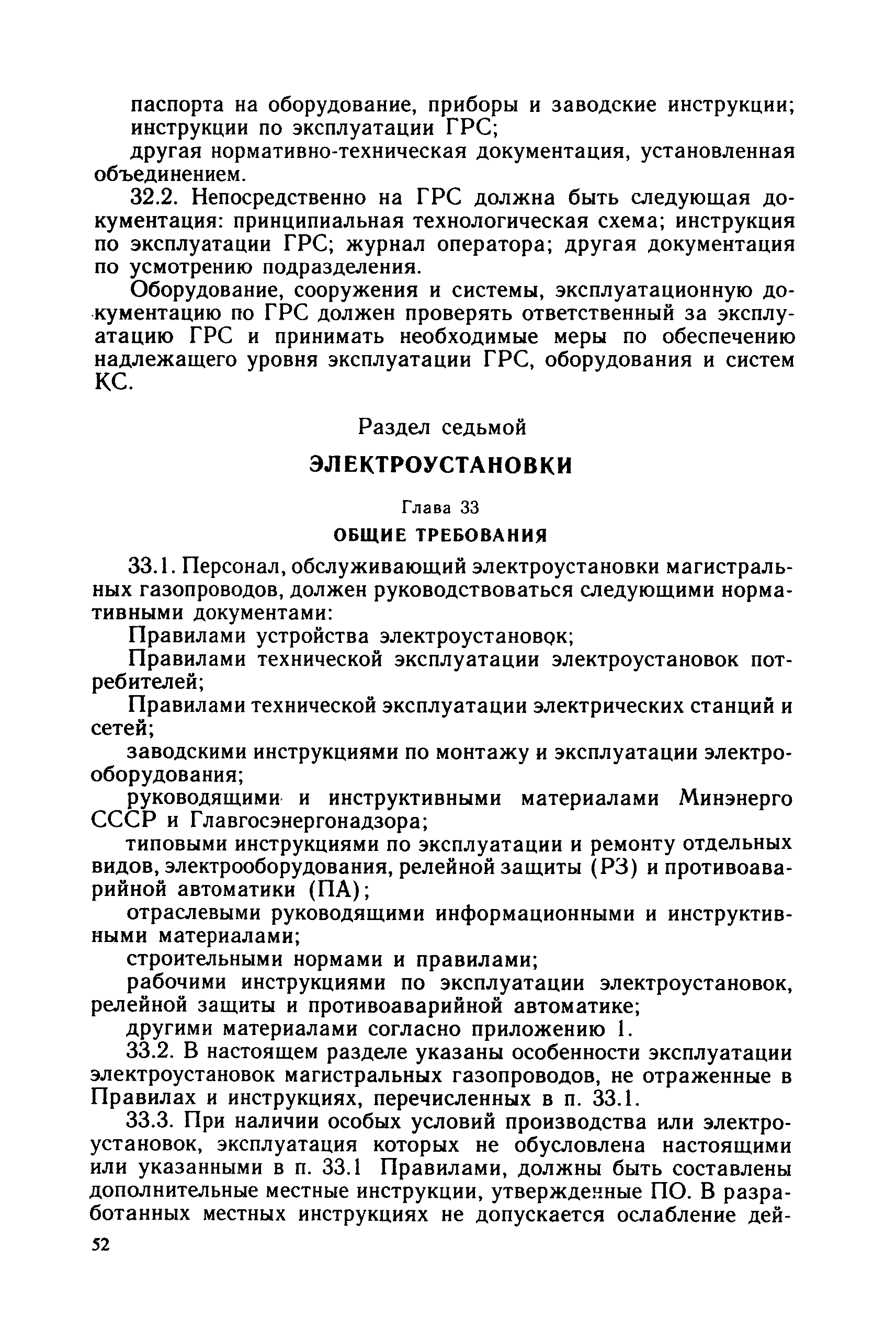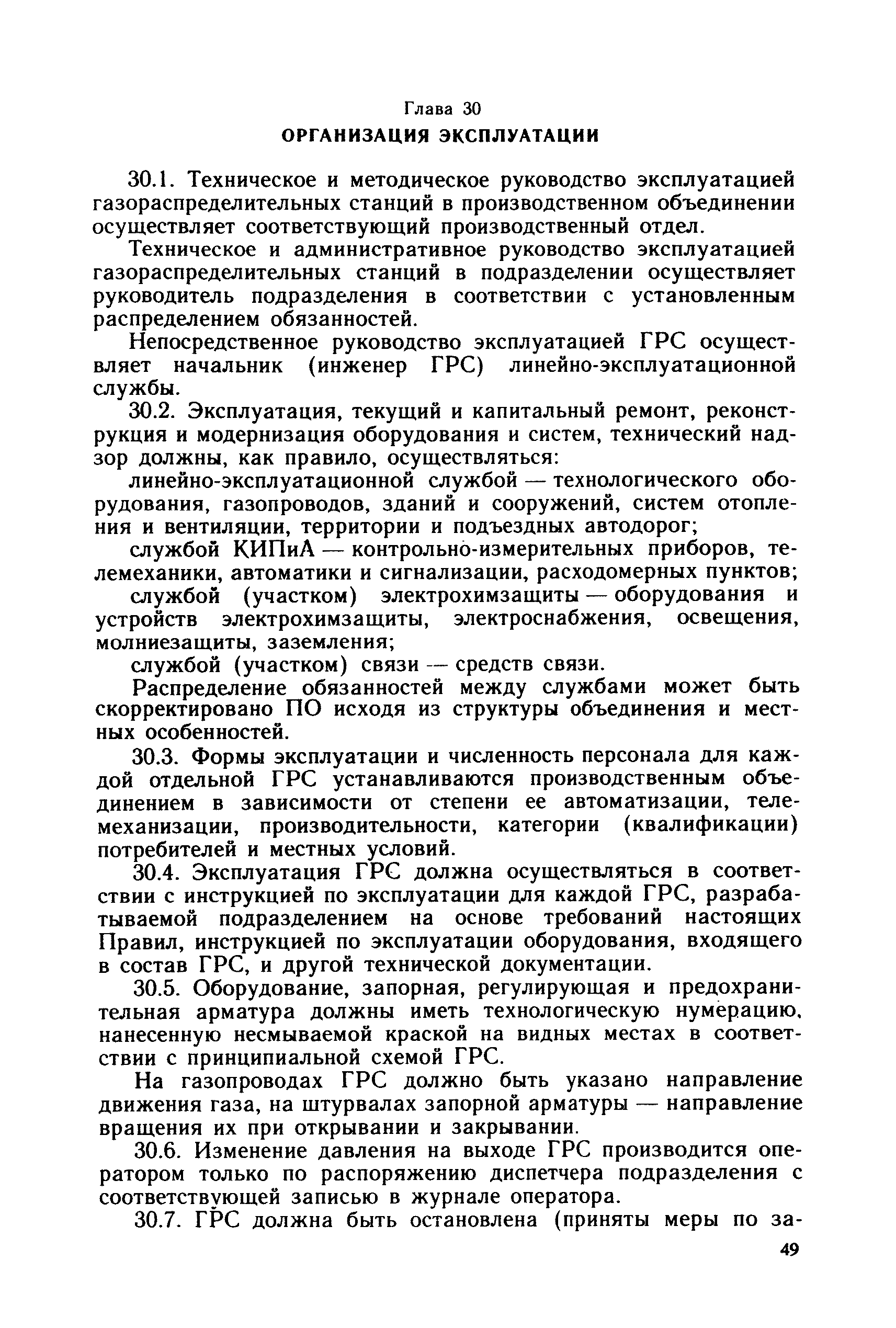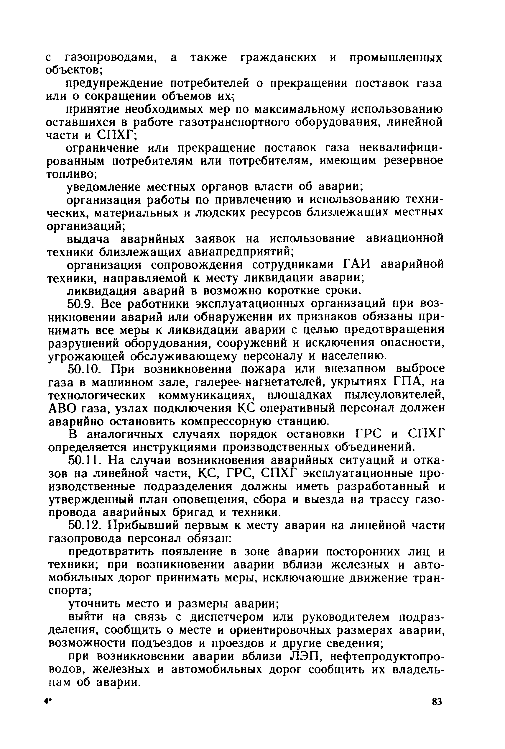 | Оглавление: | Раздел первый. Общие положения Глава 1. Общие требования Глава 2. Техническая подготовка персонала Глава 3. Ответственность за нарушение Правил Раздел второй. Объекты общего назначения Глава 4. Территория, здания и сооружения Глава 5. Газопроводы Глава 6. Трубопроводная арматура Глава 7. Теплоснабжение, газоснабжение, водоснабжение, вентиляция, канализация Раздел третий. Линейная часть Глава 8. Общие требования Глава 9. Оформление линейной части Глава 10. Организация эксплуатации Глава 11. Техническое обслуживание и ремонт Глава 12. Транспортные технические средства Глава 13. Аварийный запас Глава 14. Техническая документация Раздел четвертый. Компрессорные станции Глава 15. Общие требования Глава 16. Организация эксплуатации Глава 17. Техническое обслуживание и ремонт Глава 18. Компрессорный цех Глава 19. Установка очистки газа Глава 20. Установка охлаждения газа Глава 21. Система топливного, пускового и импульсного Глава 22. Маслоснабжение Глава 23. Техническая документация Раздел пятый. Станции подземного хранения газа Глава 24. Общие требования Глава 25. Организация эксплуатации Глава 26. Техническое обслуживание и ремонт Глава 27. Очистка и осушка газа Глава 28. Техническая документация Раздел шестой. Газораспределительные станции Глава 29. Общие требования Глава 30. Организация эксплуатации Глава 31. Техническое обслуживание и ремонт Глава 32. Техническая документация Раздел седьмой. Электроустановки Глава 33. Общие требования Глава 34. Эксплуатация электроустановок Раздел восьмой. Защита от коррозии Глава 35. Общие требования Глава 36. Организация эксплуатации Глава 37. Техническое обслуживание и ремонт Глава 38. Техническая документация Раздел девятый. Системы и средства автоматизации, управления и связи Глава 39. Общие требования Глава 40. Организация эксплуатации Глава 41. Техническое обслуживание и ремонт Глава 42. Метрологическое обеспечение Глава 43. Связь Глава 44. Расходомерные пункты Глава 45. Телемеханика Глава 46. Техническая документация Раздел десятый. Оперативно-диспетчерское управление Глава 47. Диспетчерская служба Глава 48. Режим работы газопроводов Глава 49. Оперативная документация Глава 50. Организация работ по ликвидации аварии Глава 51. Подготовка магистрального газопровода к эксплуатации в осенне-зимних условиях и к весеннему паводку Приложение 1. Перечень действующих нормативных документов . Приложение 2. Принятые сокращения Приложение 3. Нумерация технологической арматуры на компрессорных станциях Приложение 4. Нумерация технологической арматуры на линейной части Приложение 5. Минимальные расстояния от газопроводов I и II классов до населенных пунктов, отдельных промышленных и сельскохозяйственных предприятий, зданий и сооружений Приложение 6. Минимальные расстояния от компрессорных (в числителе) и газораспределительных (в знаменателе) станций до населенных пунктов, отдельных промышленных и сельскохозяйственных предприятий, зданий и сооружений при газопроводах I и II классов Приложение 7. Знак "Осторожно, газопровод" Приложение 8. Знак "Остановка запрещена" Приложение 9. Знак "Газопровод. Переезд запрещен" Приложение 10. Знак "Газ. С огнем не приближаться" Приложение 11. Знак "Вход воспрещен" Приложение 12. Знак "Газопровод высокого давления" Приложение 13. Знак закрепления трассы газопровода на местности Приложе