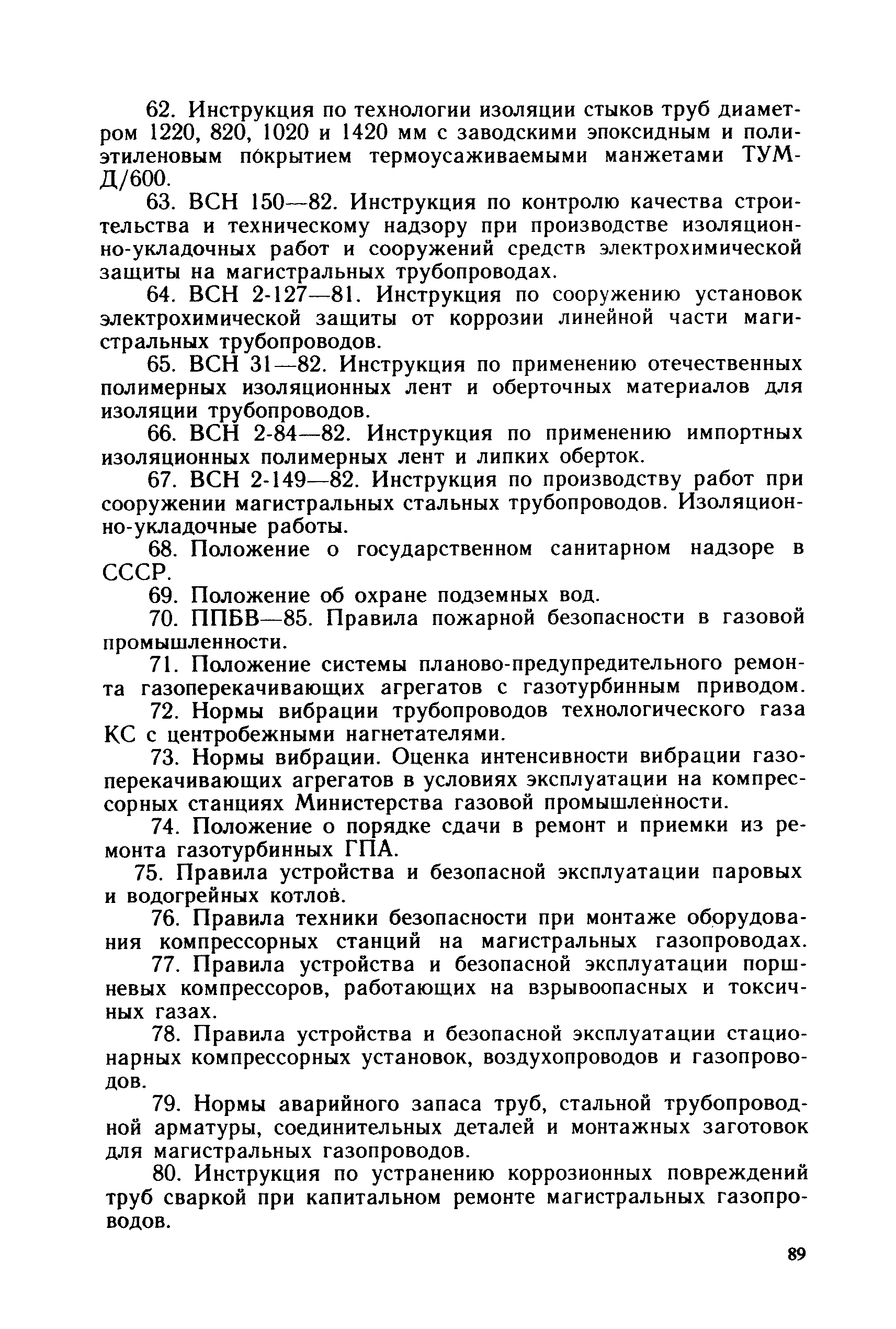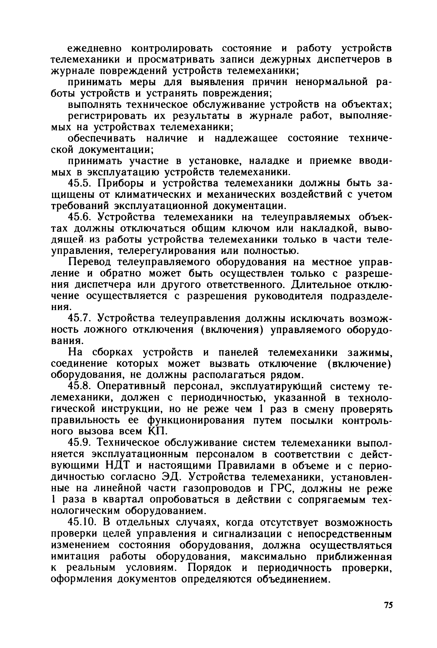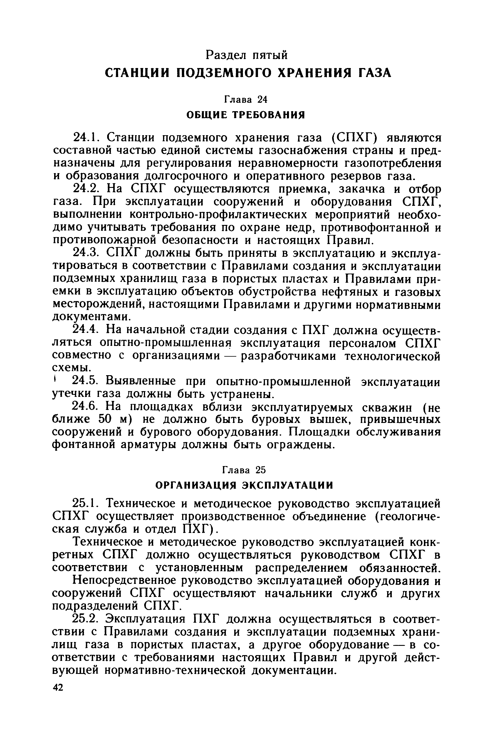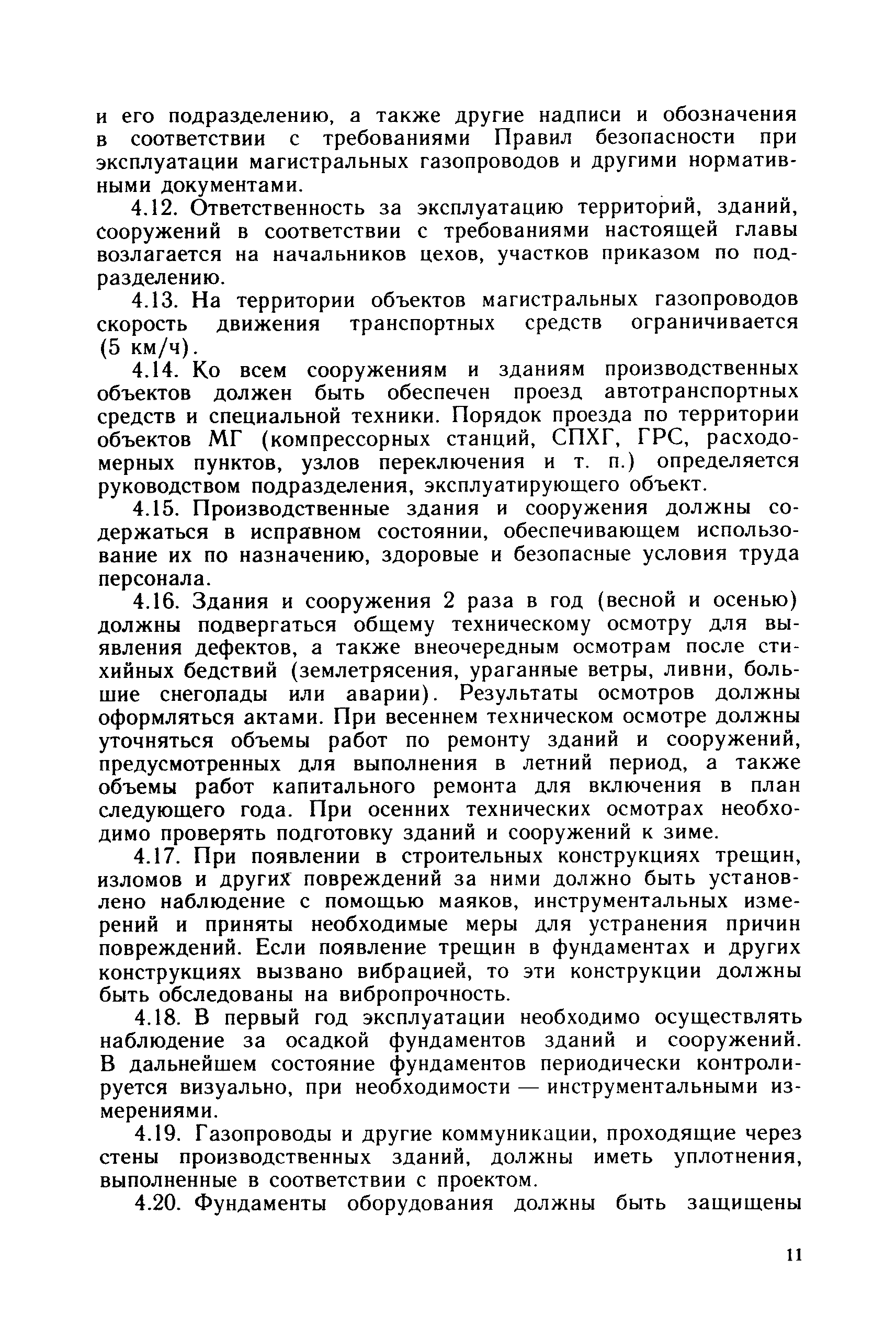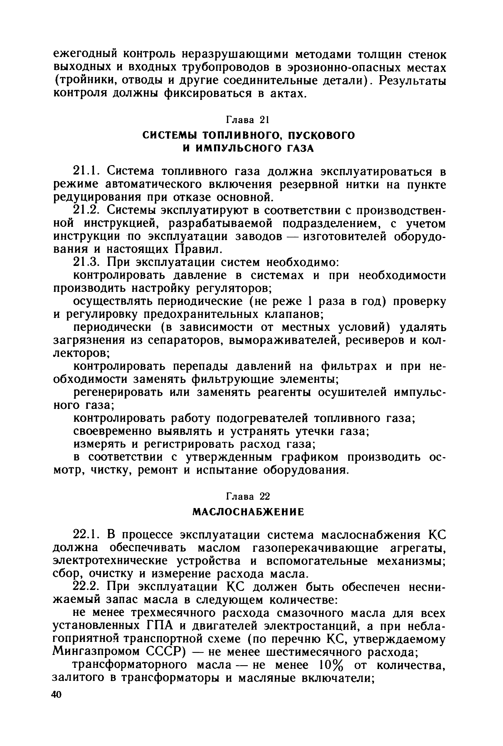 | Оглавление: | Раздел первый. Общие положения Глава 1. Общие требования Глава 2. Техническая подготовка персонала Глава 3. Ответственность за нарушение Правил Раздел второй. Объекты общего назначения Глава 4. Территория, здания и сооружения Глава 5. Газопроводы Глава 6. Трубопроводная арматура Глава 7. Теплоснабжение, газоснабжение, водоснабжение, вентиляция, канализация Раздел третий. Линейная часть Глава 8. Общие требования Глава 9. Оформление линейной части Глава 10. Организация эксплуатации Глава 11. Техническое обслуживание и ремонт Глава 12. Транспортные технические средства Глава 13. Аварийный запас Глава 14. Техническая документация Раздел четвертый. Компрессорные станции Глава 15. Общие требования Глава 16. Организация эксплуатации Глава 17. Техническое обслуживание и ремонт Глава 18. Компрессорный цех Глава 19. Установка очистки газа Глава 20. Установка охлаждения газа Глава 21. Система топливного, пускового и импульсного Глава 22. Маслоснабжение Глава 23. Техническая документация Раздел пятый. Станции подземного хранения газа Глава 24. Общие требования Глава 25. Организация эксплуатации Глава 26. Техническое обслуживание и ремонт Глава 27. Очистка и осушка газа Глава 28. Техническая документация Раздел шестой. Газораспределительные станции Глава 29. Общие требования Глава 30. Организация эксплуатации Глава 31. Техническое обслуживание и ремонт Глава 32. Техническая документация Раздел седьмой. Электроустановки Глава 33. Общие требования Глава 34. Эксплуатация электроустановок Раздел восьмой. Защита от коррозии Глава 35. Общие требования Глава 36. Организация эксплуатации Глава 37. Техническое обслуживание и ремонт Глава 38. Техническая документация Раздел девятый. Системы и средства автоматизации, управления и связи Глава 39. Общие требования Глава 40. Организация эксплуатации Глава 41. Техническое обслуживание и ремонт Глава 42. Метрологическое обеспечение Глава 43. Связь Глава 44. Расходомерные пункты Глава 45. Телемеханика Глава 46. Техническая документация Раздел десятый. Оперативно-диспетчерское управление Глава 47. Диспетчерская служба Глава 48. Режим работы газопроводов Глава 49. Оперативная документация Глава 50. Организация работ по ликвидации аварии Глава 51. Подготовка магистрального газопровода к эксплуатации в осенне-зимних условиях и к весеннему паводку Приложение 1. Перечень действующих нормативных документов . Приложение 2. Принятые сокращения Приложение 3. Нумерация технологической арматуры на компрессорных станциях Приложение 4. Нумерация технологической арматуры на линейной части Приложение 5. Минимальные расстояния от газопроводов I и II классов до населенных пунктов, отдельных промышленных и сельскохозяйственных предприятий, зданий и сооружений Приложение 6. Минимальные расстояния от компрессорных (в числителе) и газораспределительных (в знаменателе) станций до населенных пунктов, отдельных промышленных и сельскохозяйственных предприятий, зданий и сооружений при газопроводах I и II классов Приложение 7. Знак "Осторожно, газопровод" Приложение 8. Знак "Остановка запрещена" Приложение 9. Знак "Газопровод. Переезд запрещен" Приложение 10. Знак "Газ. С огнем не приближаться" Приложение 11. Знак "Вход воспрещен" Приложение 12. Знак "Газопровод высокого давления" Приложение 13. Знак закрепления трассы газопровода на местности Приложе