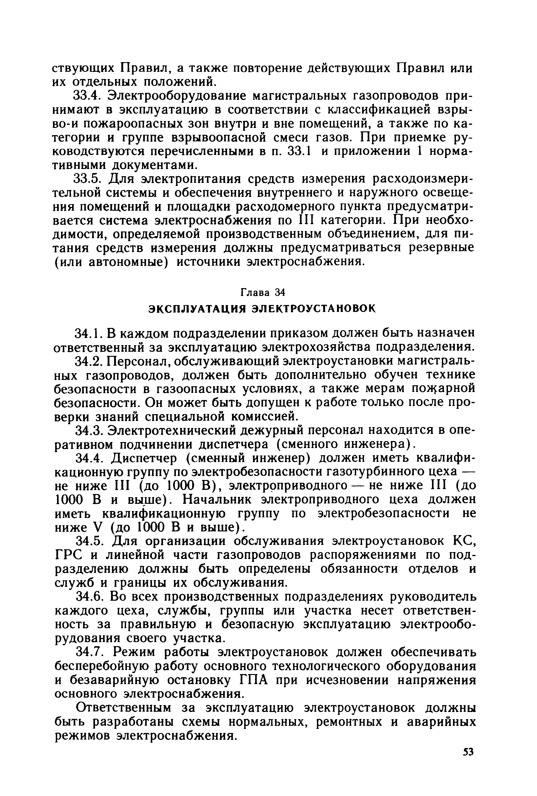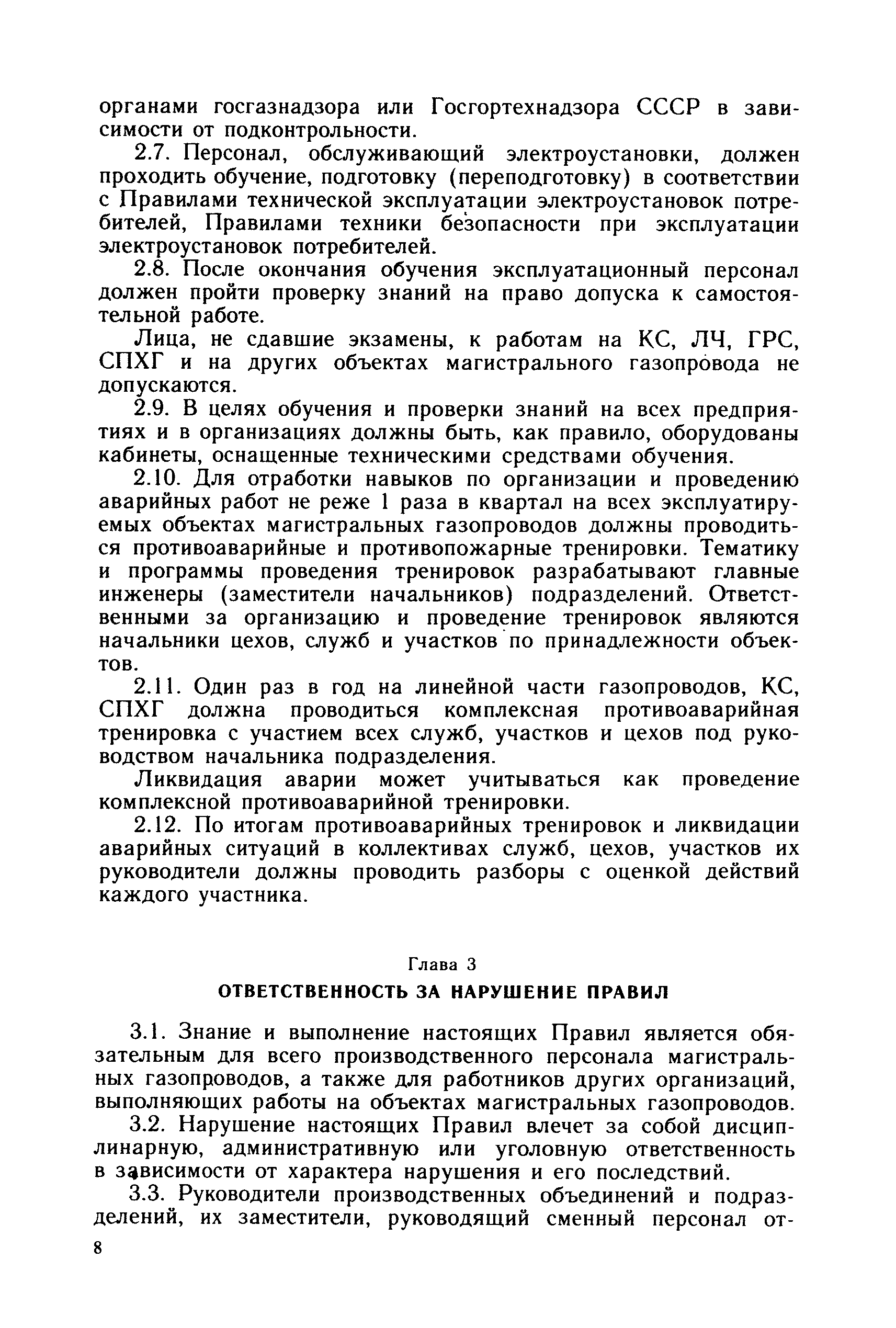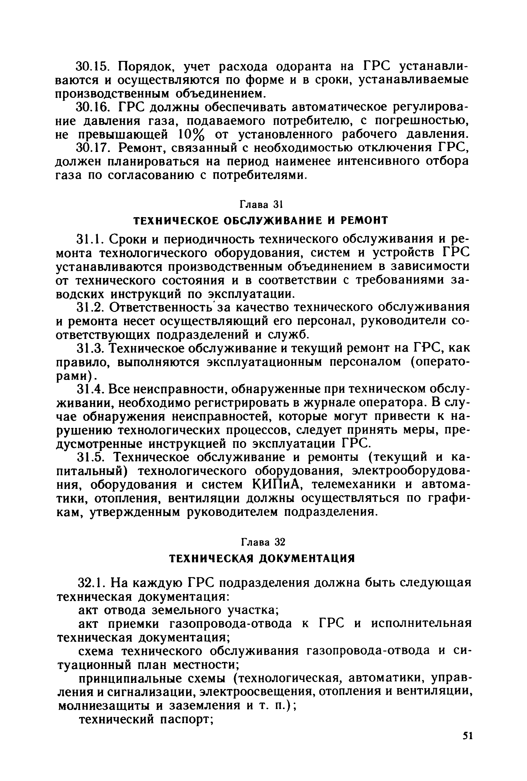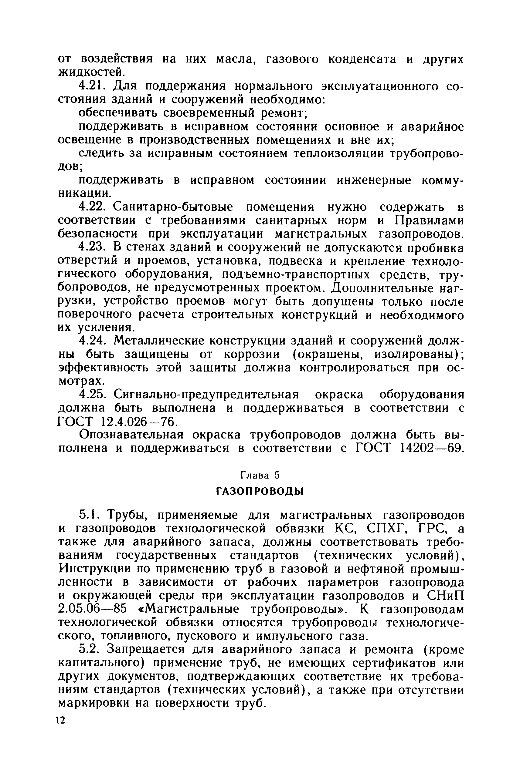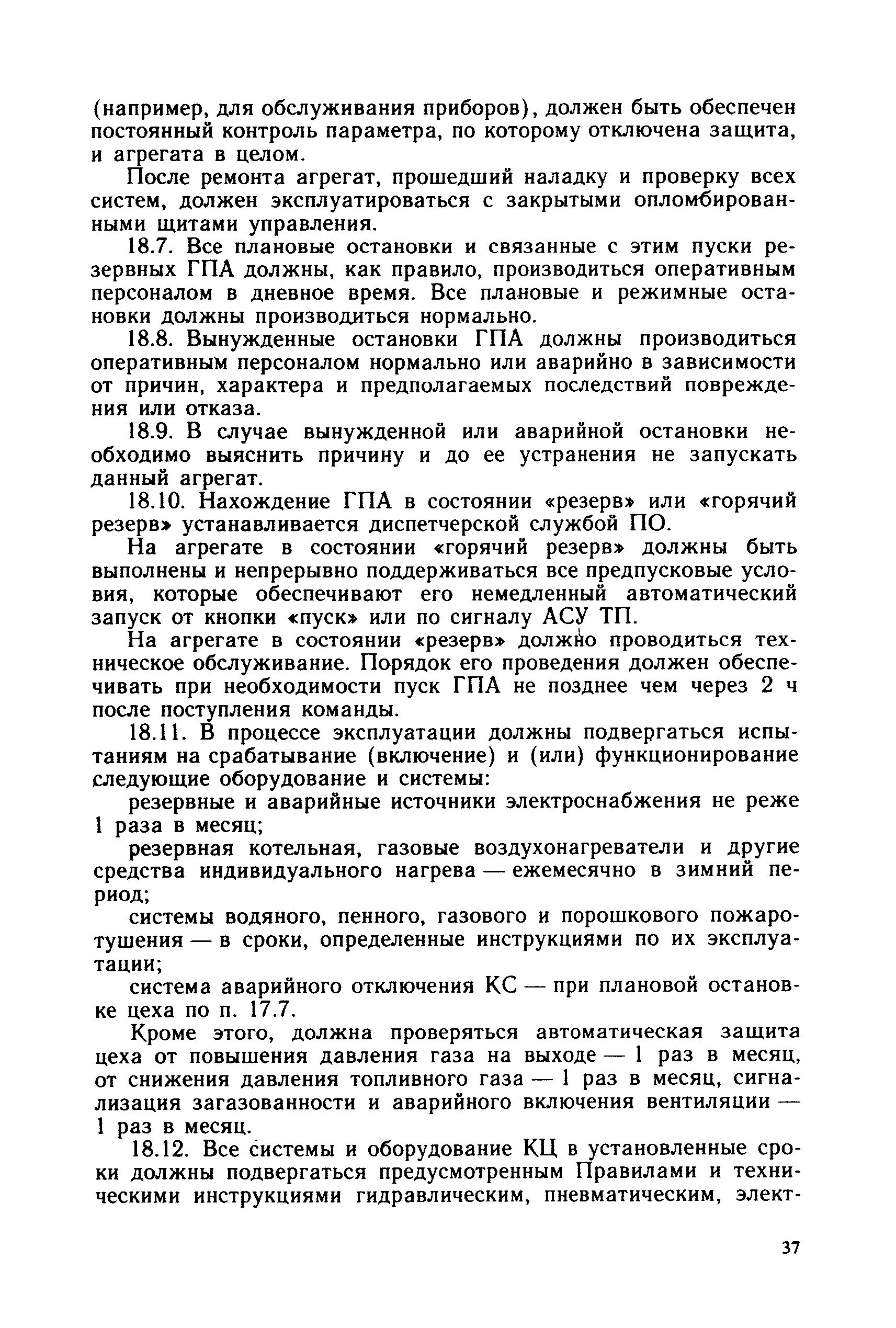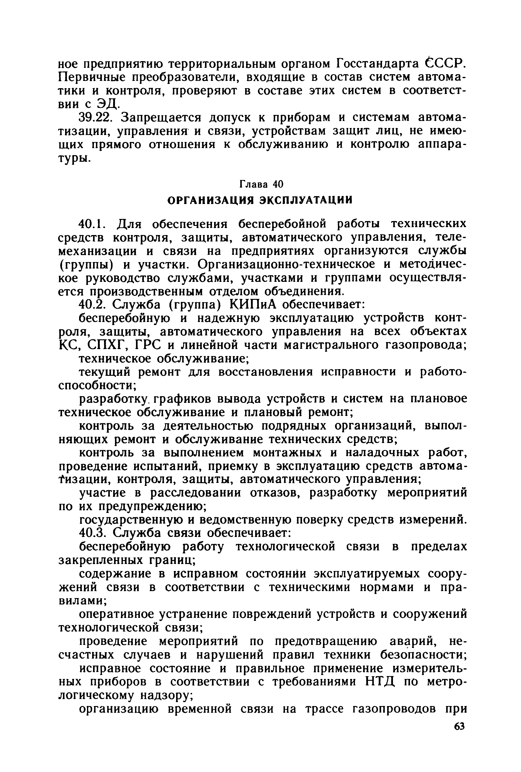| Оглавление: | Раздел первый. Общие положения Глава 1. Общие требования Глава 2. Техническая подготовка персонала Глава 3. Ответственность за нарушение Правил Раздел второй. Объекты общего назначения Глава 4. Территория, здания и сооружения Глава 5. Газопроводы Глава 6. Трубопроводная арматура Глава 7. Теплоснабжение, газоснабжение, водоснабжение, вентиляция, канализация Раздел третий. Линейная часть Глава 8. Общие требования Глава 9. Оформление линейной части Глава 10. Организация эксплуатации Глава 11. Техническое обслуживание и ремонт Глава 12. Транспортные технические средства Глава 13. Аварийный запас Глава 14. Техническая документация Раздел четвертый. Компрессорные станции Глава 15. Общие требования Глава 16. Организация эксплуатации Глава 17. Техническое обслуживание и ремонт Глава 18. Компрессорный цех Глава 19. Установка очистки газа Глава 20. Установка охлаждения газа Глава 21. Система топливного, пускового и импульсного Глава 22. Маслоснабжение Глава 23. Техническая документация Раздел пятый. Станции подземного хранения газа Глава 24. Общие требования Глава 25. Организация эксплуатации Глава 26. Техническое обслуживание и ремонт Глава 27. Очистка и осушка газа Глава 28. Техническая документация Раздел шестой. Газораспределительные станции Глава 29. Общие требования Глава 30. Организация эксплуатации Глава 31. Техническое обслуживание и ремонт Глава 32. Техническая документация Раздел седьмой. Электроустановки Глава 33. Общие требования Глава 34. Эксплуатация электроустановок Раздел восьмой. Защита от коррозии Глава 35. Общие требования Глава 36. Организация эксплуатации Глава 37. Техническое обслуживание и ремонт Глава 38. Техническая документация Раздел девятый. Системы и средства автоматизации, управления и связи Глава 39. Общие требования Глава 40. Организация эксплуатации Глава 41. Техническое обслуживание и ремонт Глава 42. Метрологическое обеспечение Глава 43. Связь Глава 44. Расходомерные пункты Глава 45. Телемеханика Глава 46. Техническая документация Раздел десятый. Оперативно-диспетчерское управление Глава 47. Диспетчерская служба Глава 48. Режим работы газопроводов Глава 49. Оперативная документация Глава 50. Организация работ по ликвидации аварии Глава 51. Подготовка магистрального газопровода к эксплуатации в осенне-зимних условиях и к весеннему паводку Приложение 1. Перечень действующих нормативных документов . Приложение 2. Принятые сокращения Приложение 3. Нумерация технологической арматуры на компрессорных станциях Приложение 4. Нумерация технологической арматуры на линейной части Приложение 5. Минимальные расстояния от газопроводов I и II классов до населенных пунктов, отдельных промышленных и сельскохозяйственных предприятий, зданий и сооружений Приложение 6. Минимальные расстояния от компрессорных (в числителе) и газораспределительных (в знаменателе) станций до населенных пунктов, отдельных промышленных и сельскохозяйственных предприятий, зданий и сооружений при газопроводах I и II классов Приложение 7. Знак "Осторожно, газопровод" Приложение 8. Знак "Остановка запрещена" Приложение 9. Знак "Газопровод. Переезд запрещен" Приложение 10. Знак "Газ. С огнем не приближаться" Приложение 11. Знак "Вход воспрещен" Приложение 12. Знак "Газопровод высокого давления" Приложение 13. Знак закрепления трассы газопровода на местности Приложе