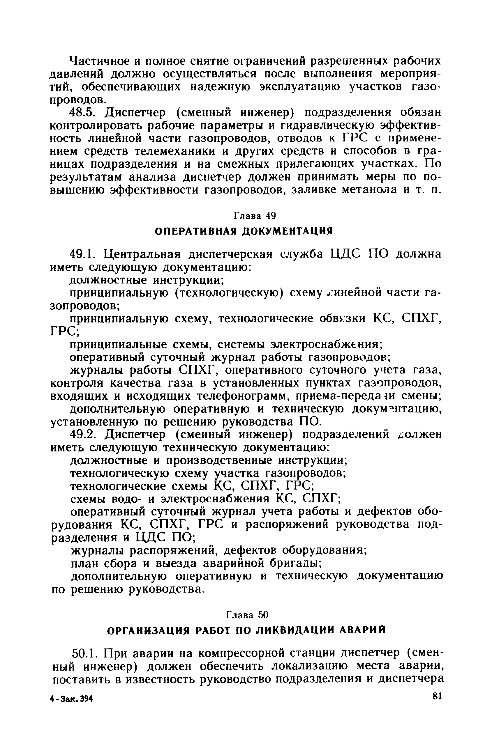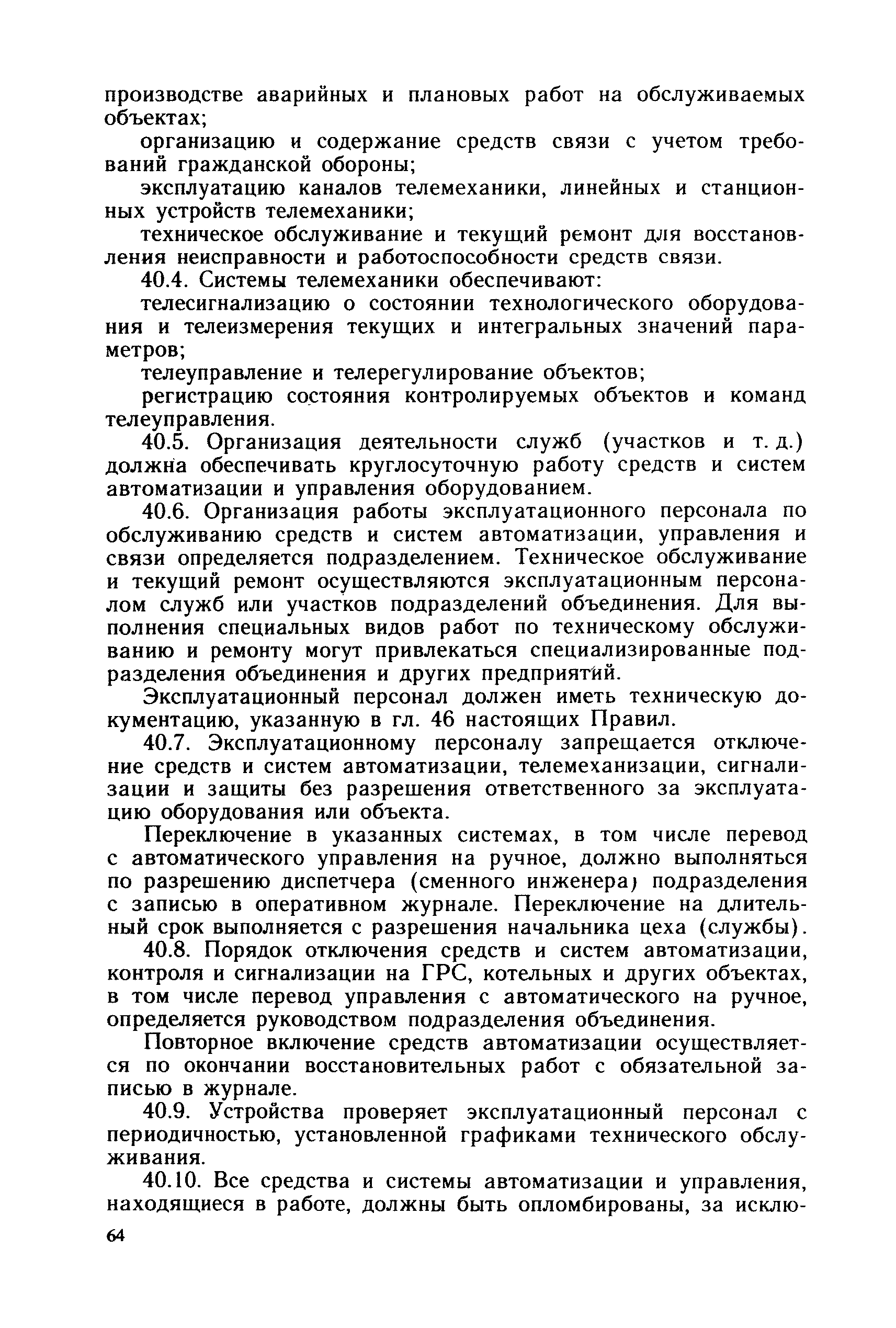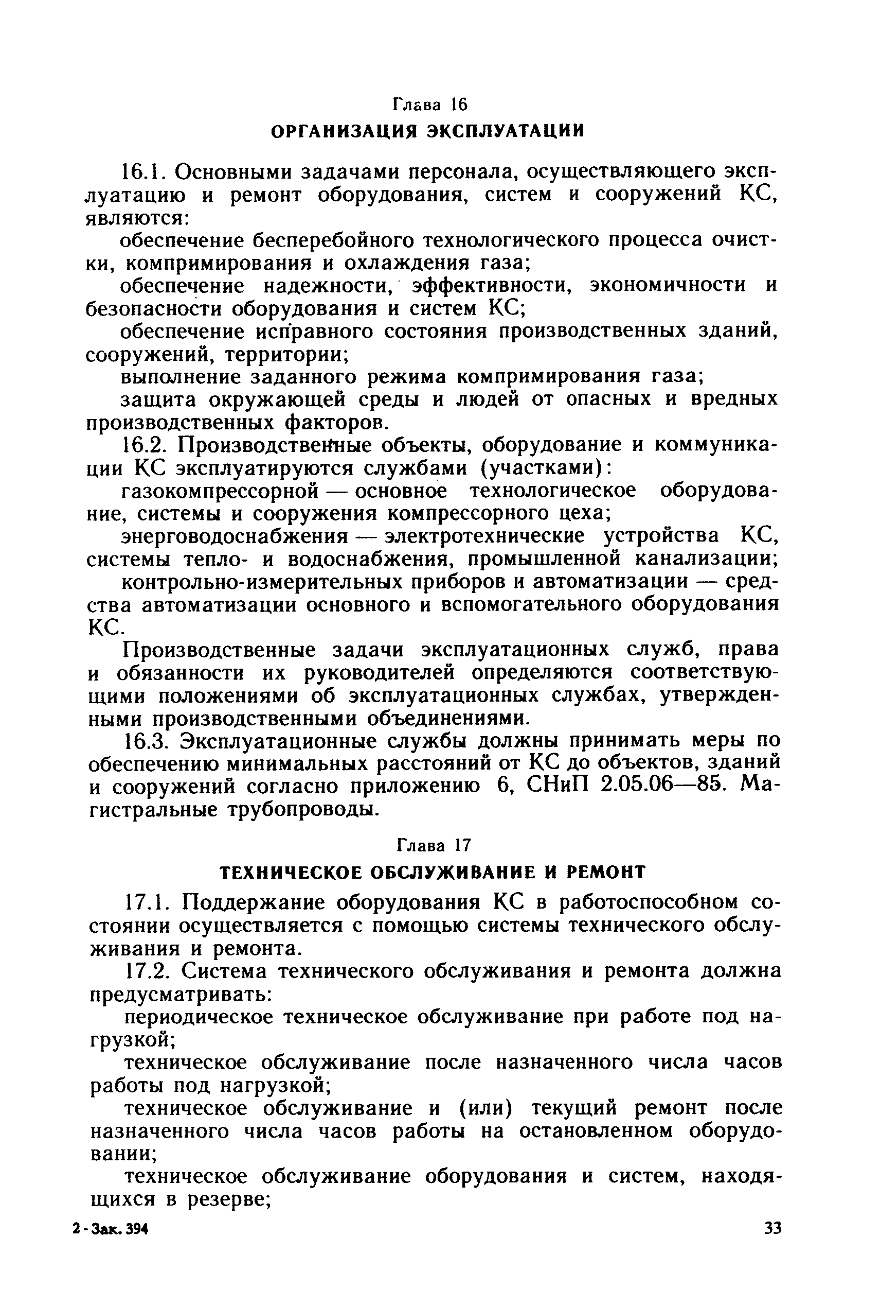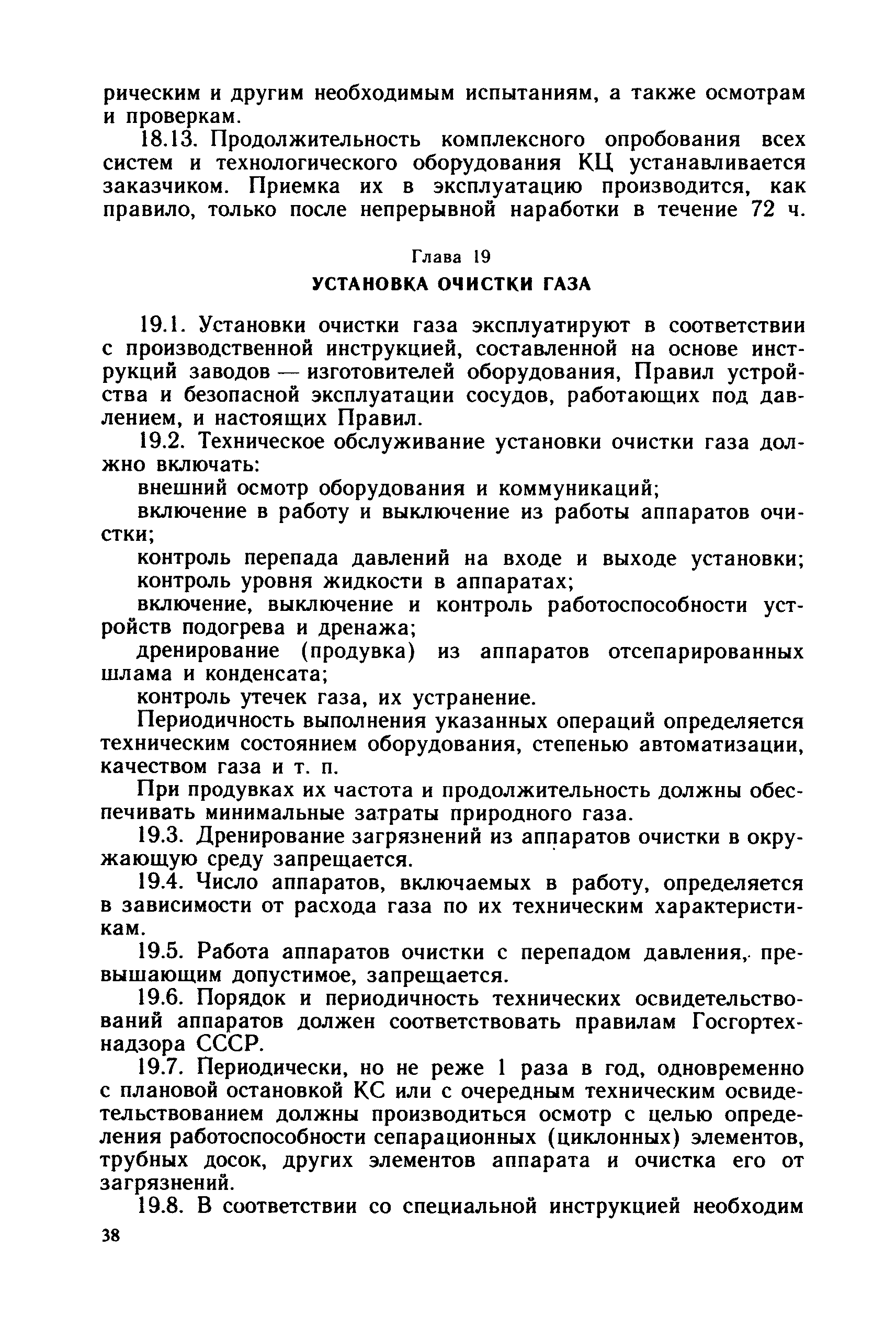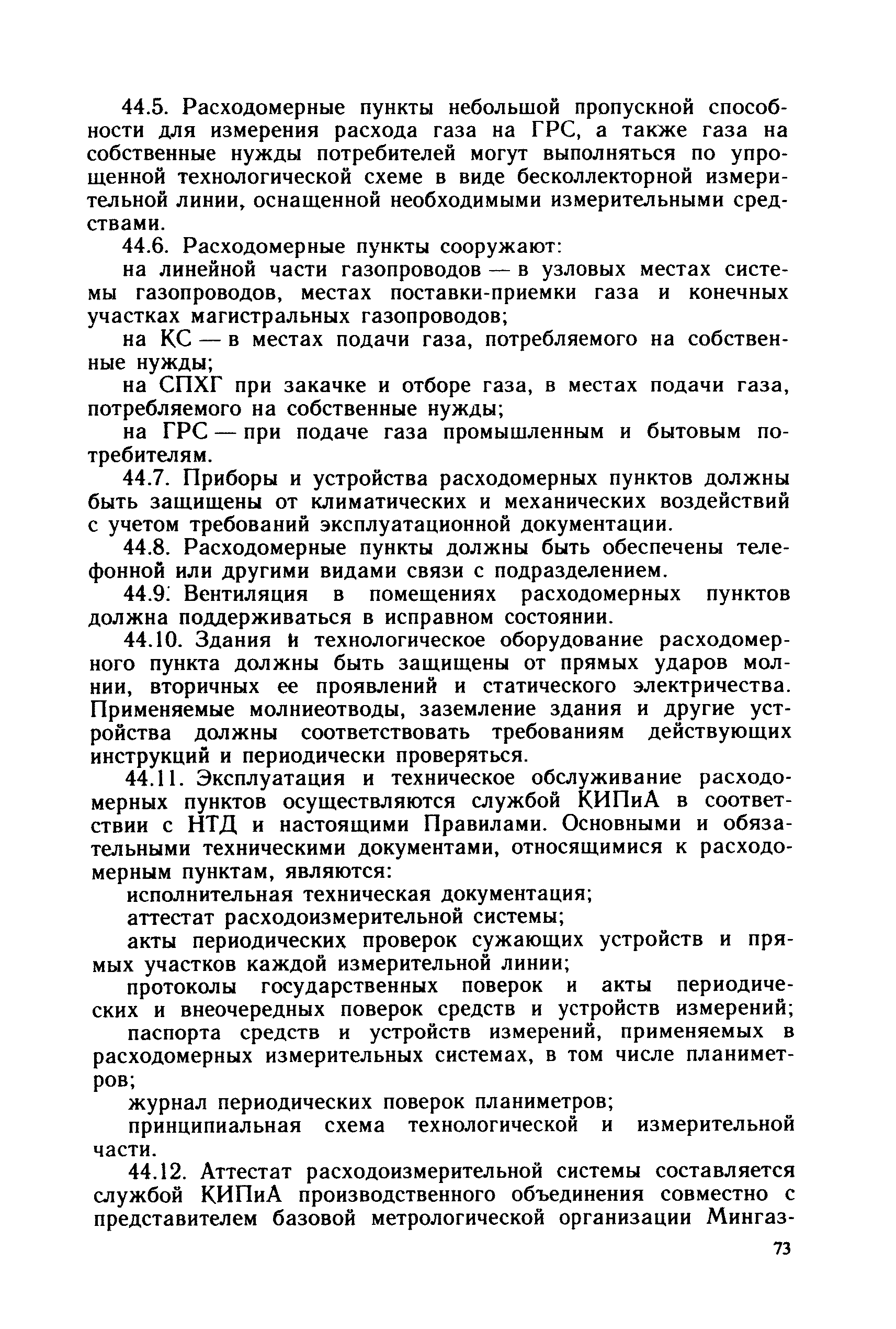 | Оглавление: | Раздел первый. Общие положения Глава 1. Общие требования Глава 2. Техническая подготовка персонала Глава 3. Ответственность за нарушение Правил Раздел второй. Объекты общего назначения Глава 4. Территория, здания и сооружения Глава 5. Газопроводы Глава 6. Трубопроводная арматура Глава 7. Теплоснабжение, газоснабжение, водоснабжение, вентиляция, канализация Раздел третий. Линейная часть Глава 8. Общие требования Глава 9. Оформление линейной части Глава 10. Организация эксплуатации Глава 11. Техническое обслуживание и ремонт Глава 12. Транспортные технические средства Глава 13. Аварийный запас Глава 14. Техническая документация Раздел четвертый. Компрессорные станции Глава 15. Общие требования Глава 16. Организация эксплуатации Глава 17. Техническое обслуживание и ремонт Глава 18. Компрессорный цех Глава 19. Установка очистки газа Глава 20. Установка охлаждения газа Глава 21. Система топливного, пускового и импульсного Глава 22. Маслоснабжение Глава 23. Техническая документация Раздел пятый. Станции подземного хранения газа Глава 24. Общие требования Глава 25. Организация эксплуатации Глава 26. Техническое обслуживание и ремонт Глава 27. Очистка и осушка газа Глава 28. Техническая документация Раздел шестой. Газораспределительные станции Глава 29. Общие требования Глава 30. Организация эксплуатации Глава 31. Техническое обслуживание и ремонт Глава 32. Техническая документация Раздел седьмой. Электроустановки Глава 33. Общие требования Глава 34. Эксплуатация электроустановок Раздел восьмой. Защита от коррозии Глава 35. Общие требования Глава 36. Организация эксплуатации Глава 37. Техническое обслуживание и ремонт Глава 38. Техническая документация Раздел девятый. Системы и средства автоматизации, управления и связи Глава 39. Общие требования Глава 40. Организация эксплуатации Глава 41. Техническое обслуживание и ремонт Глава 42. Метрологическое обеспечение Глава 43. Связь Глава 44. Расходомерные пункты Глава 45. Телемеханика Глава 46. Техническая документация Раздел десятый. Оперативно-диспетчерское управление Глава 47. Диспетчерская служба Глава 48. Режим работы газопроводов Глава 49. Оперативная документация Глава 50. Организация работ по ликвидации аварии Глава 51. Подготовка магистрального газопровода к эксплуатации в осенне-зимних условиях и к весеннему паводку Приложение 1. Перечень действующих нормативных документов . Приложение 2. Принятые сокращения Приложение 3. Нумерация технологической арматуры на компрессорных станциях Приложение 4. Нумерация технологической арматуры на линейной части Приложение 5. Минимальные расстояния от газопроводов I и II классов до населенных пунктов, отдельных промышленных и сельскохозяйственных предприятий, зданий и сооружений Приложение 6. Минимальные расстояния от компрессорных (в числителе) и газораспределительных (в знаменателе) станций до населенных пунктов, отдельных промышленных и сельскохозяйственных предприятий, зданий и сооружений при газопроводах I и II классов Приложение 7. Знак "Осторожно, газопровод" Приложение 8. Знак "Остановка запрещена" Приложение 9. Знак "Газопровод. Переезд запрещен" Приложение 10. Знак "Газ. С огнем не приближаться" Приложение 11. Знак "Вход воспрещен" Приложение 12. Знак "Газопровод высокого давления" Приложение 13. Знак закрепления трассы газопровода на местности Приложе