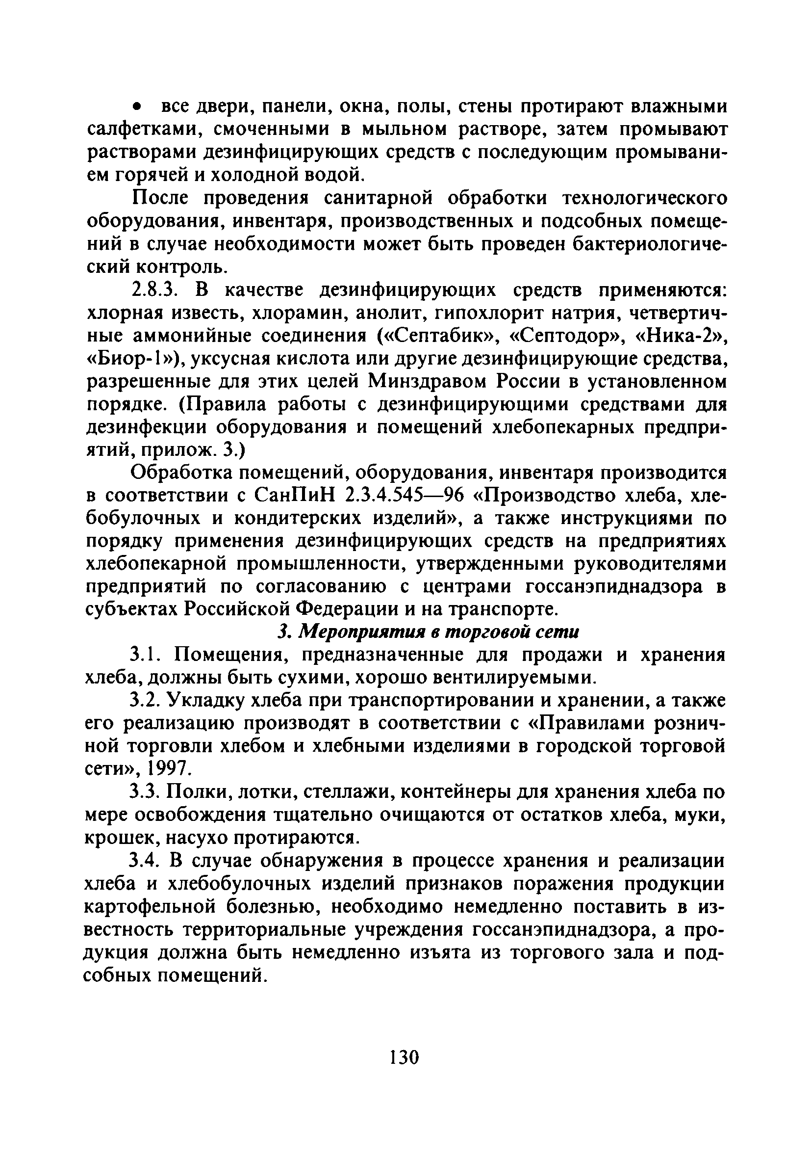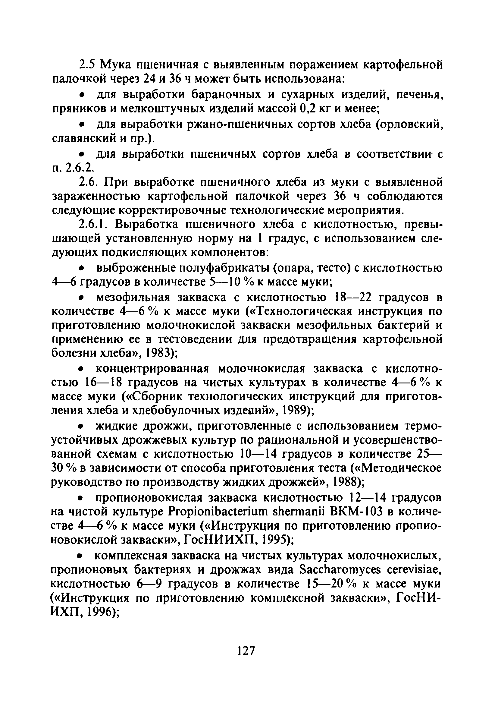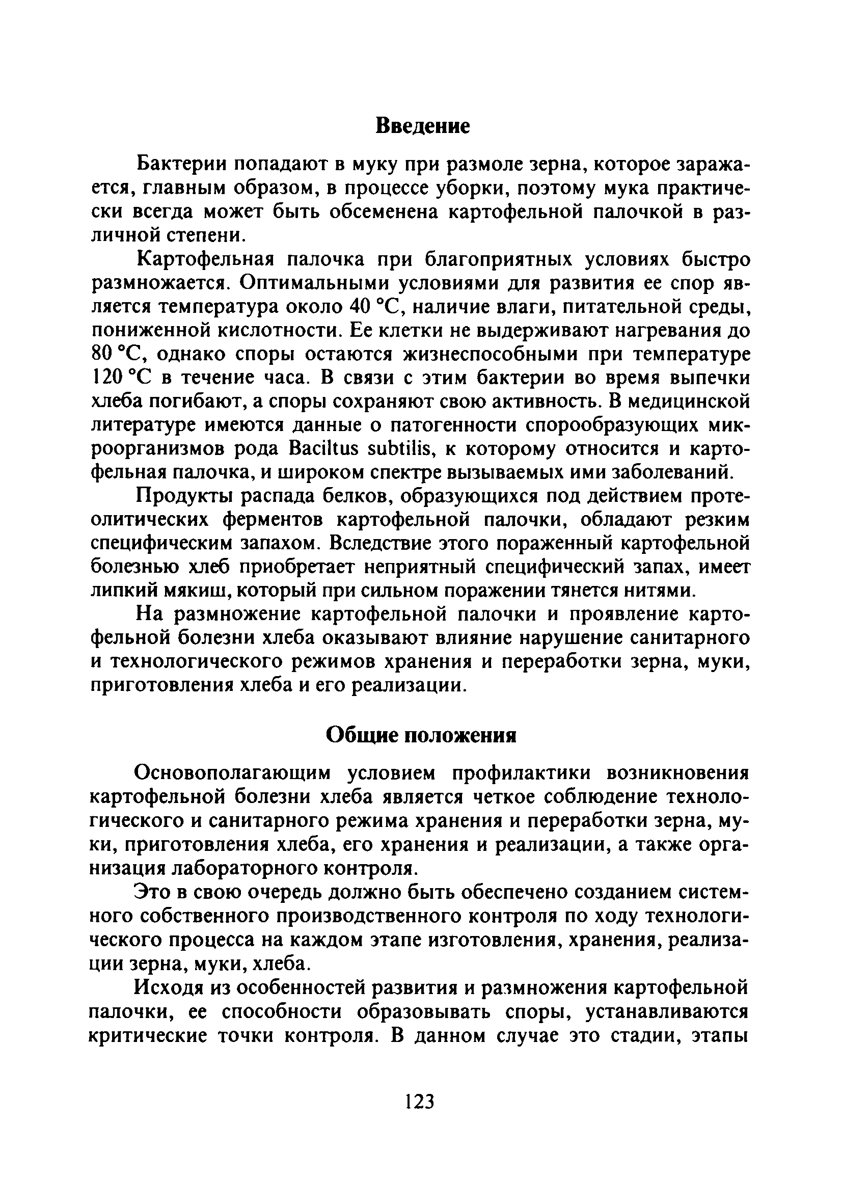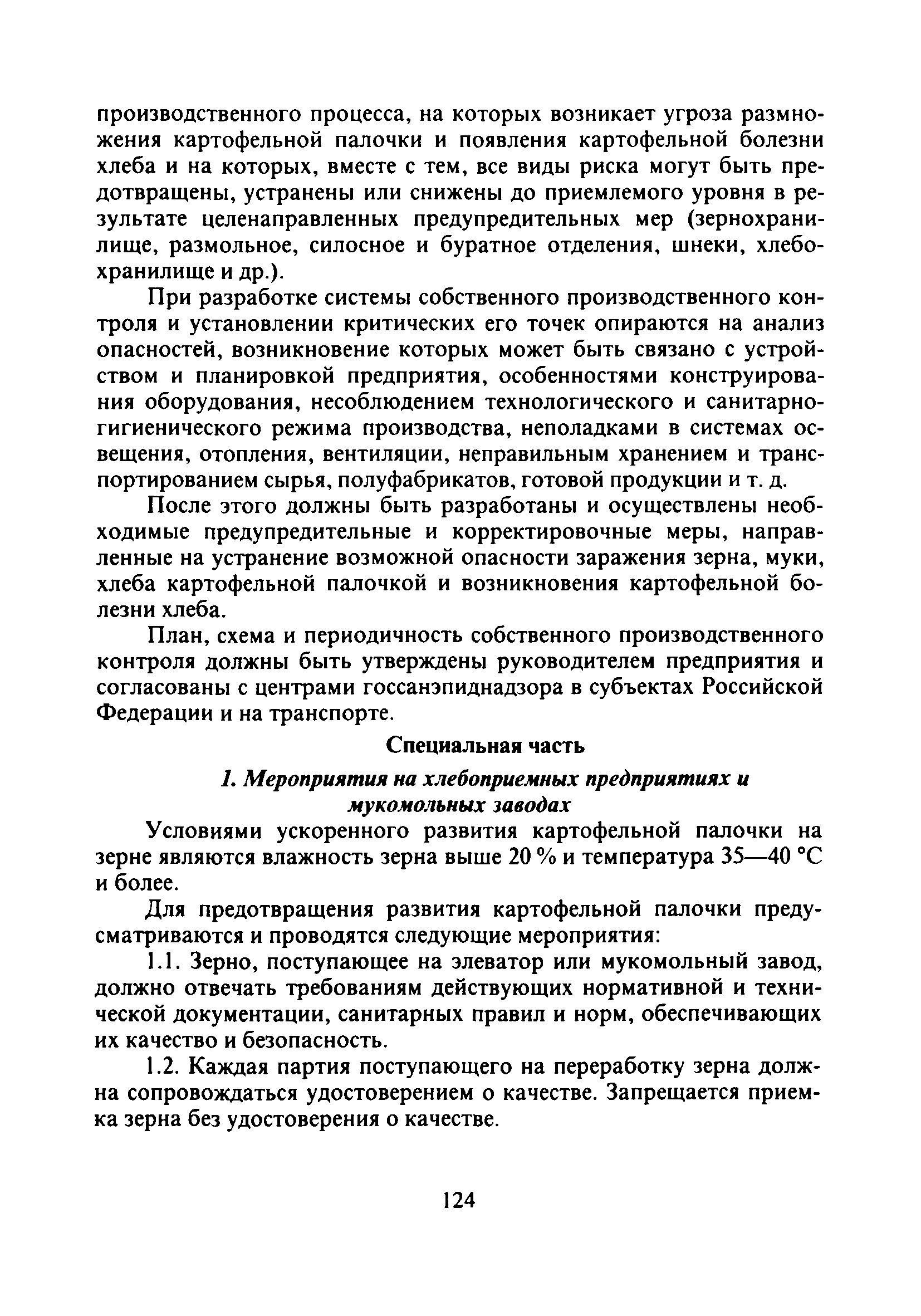 | Оглавление: | Введение Общие положения Специальная часть 1. Мероприятия на хлебоприемных предприятиях и мукомольных заводах 2. Мероприятия на хлебопекарных предприятиях 3. Мероприятия в торговой сети 4. Ответственность за выполнение Приложение 1. Метод пробной лабораторной выпечки хлеба Приложение 2. Экспресс-метод диагностики картофельной болезни по определению активности споровых бактерий в хлебопекарном сырье и готовой продукции Приложение 3. Правила работы с дезинфицирующими средствами для дезинфекции оборудования и помещений хлебопекарных предприятий Приложение 4. Журнал лабораторно-производственного контроля зараженности картофельной палочкой |
