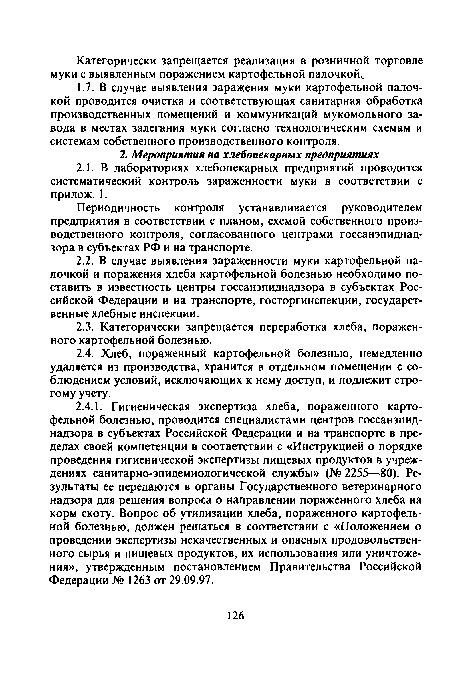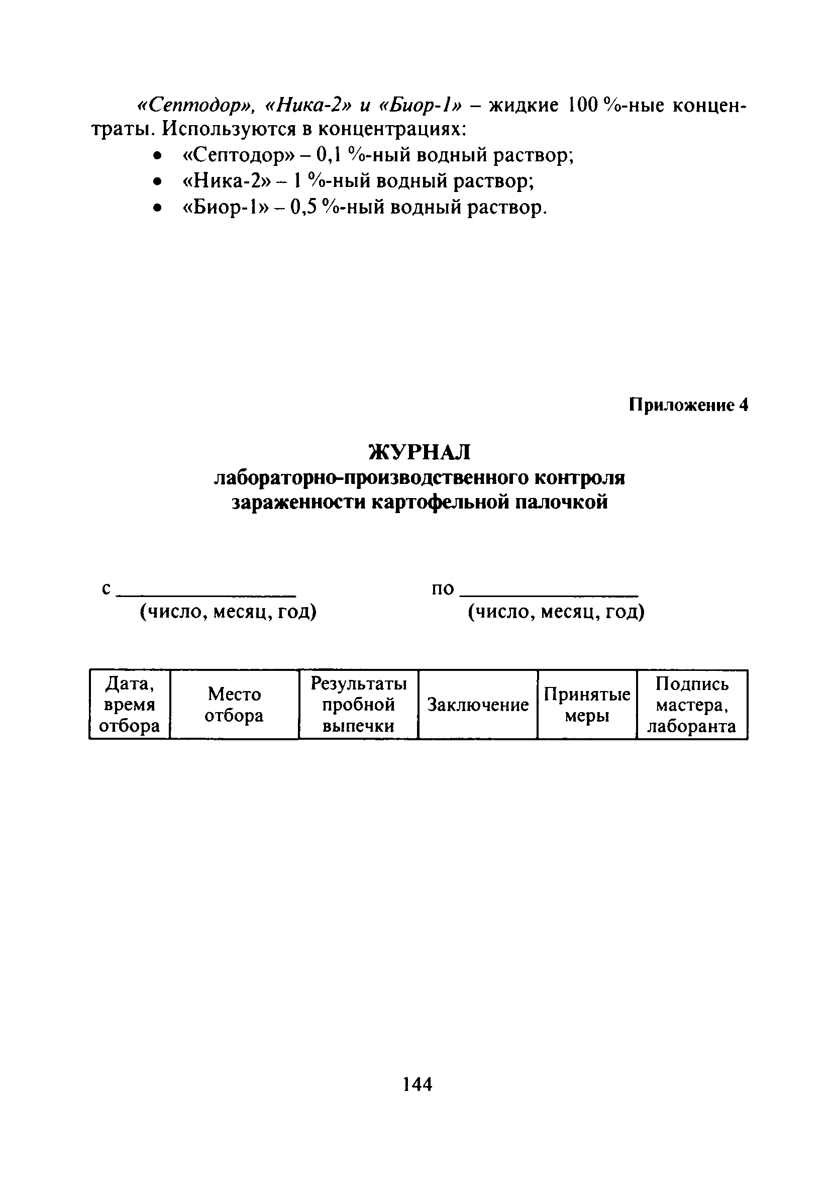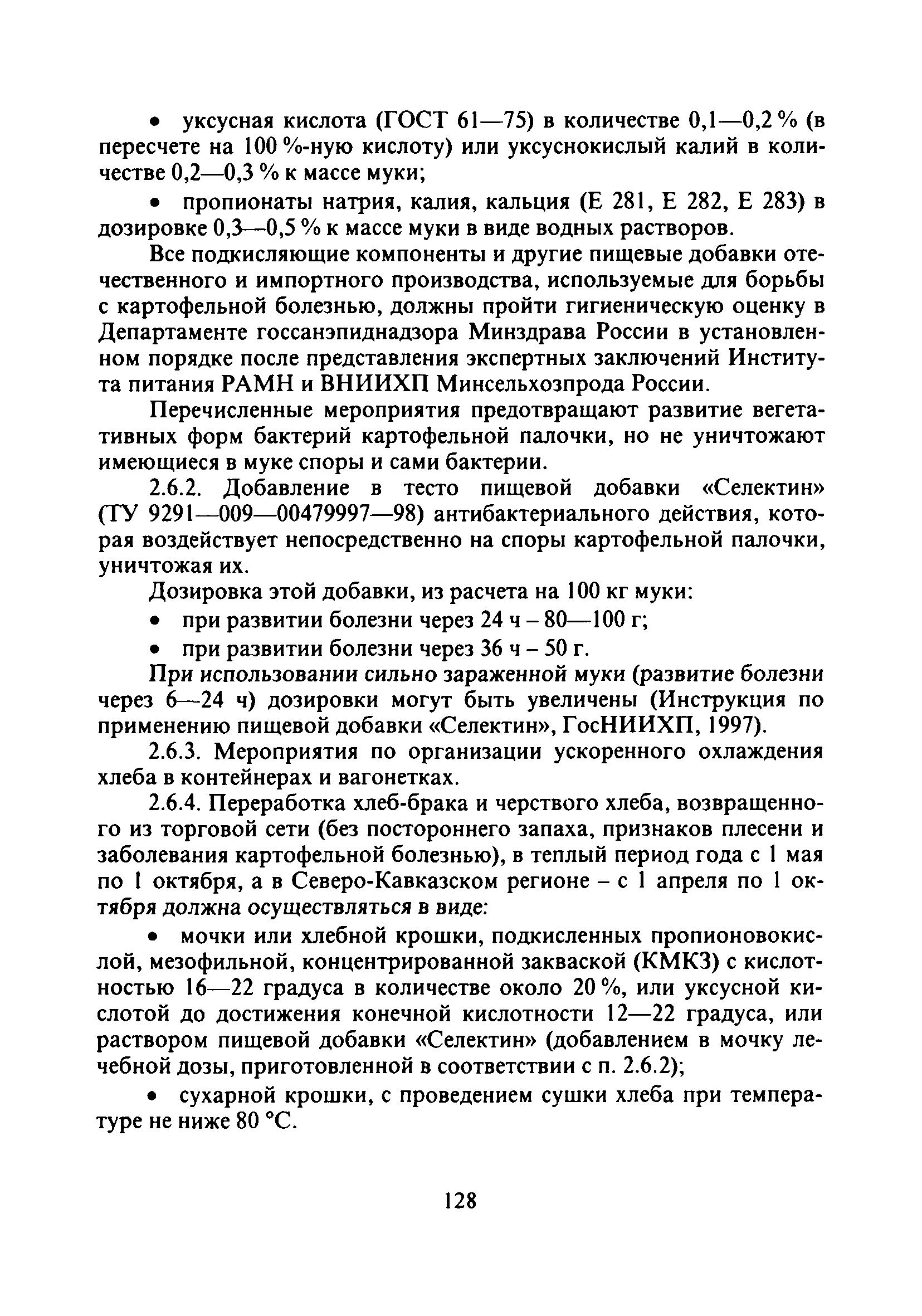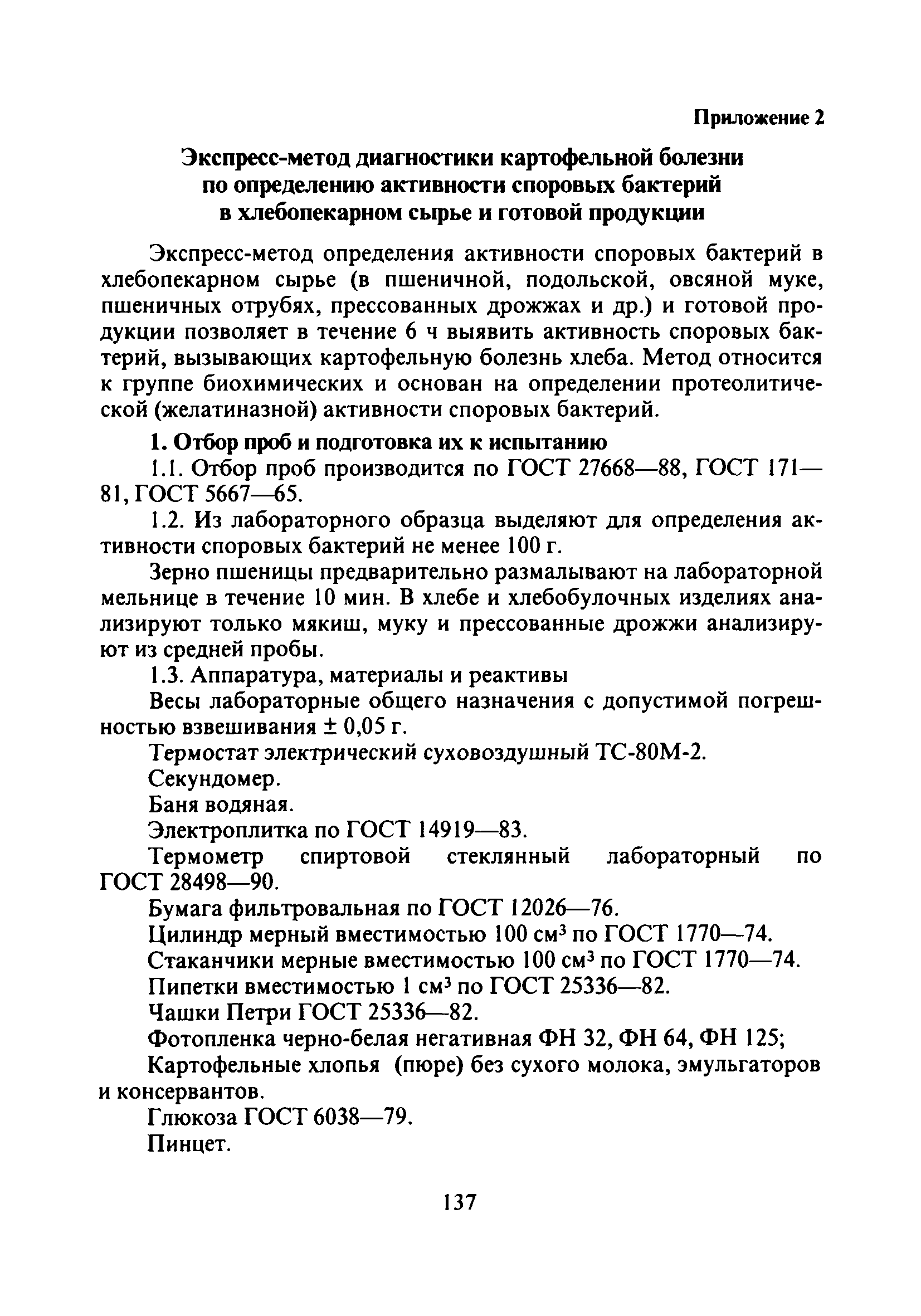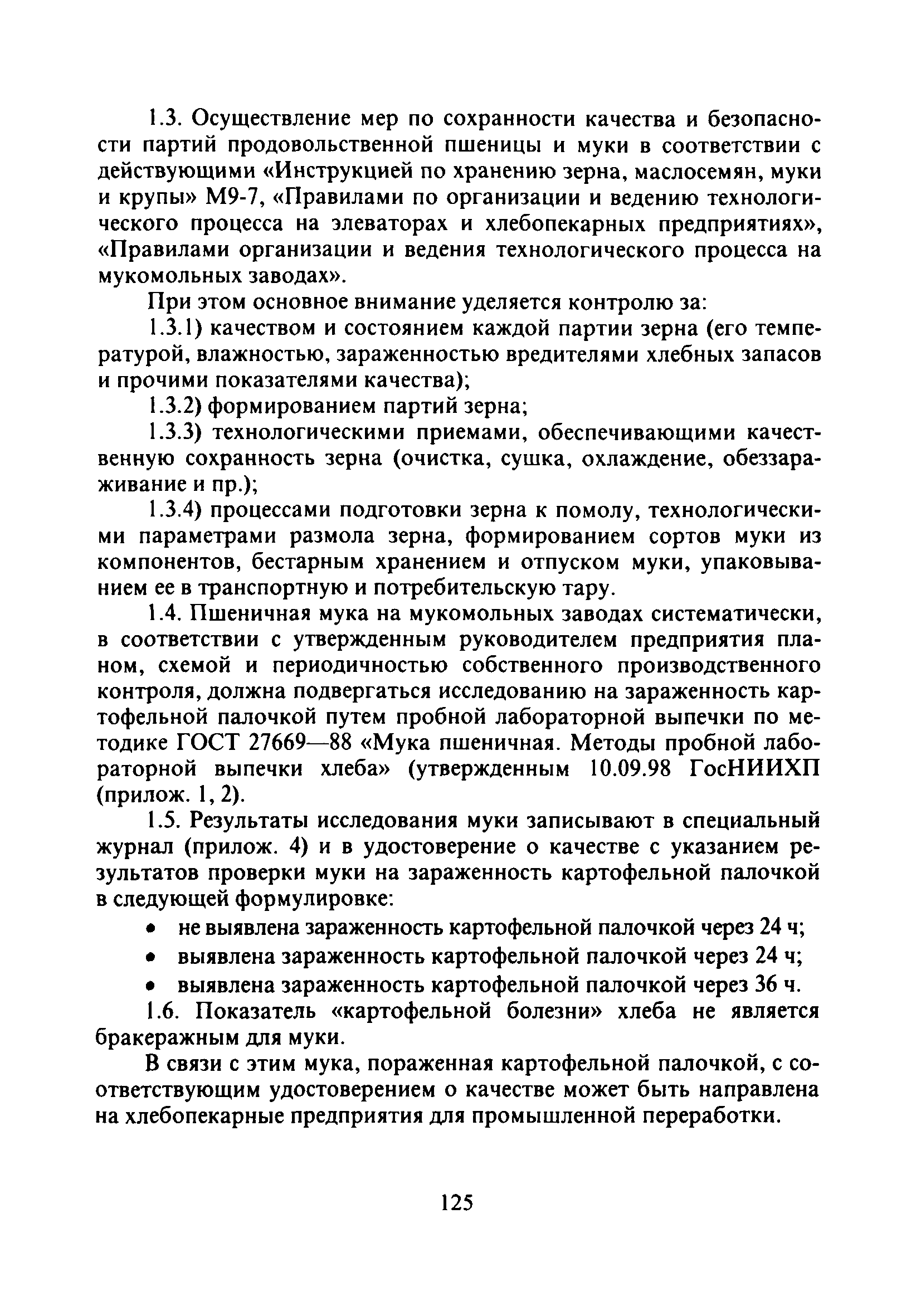 | Оглавление: | Введение Общие положения Специальная часть 1. Мероприятия на хлебоприемных предприятиях и мукомольных заводах 2. Мероприятия на хлебопекарных предприятиях 3. Мероприятия в торговой сети 4. Ответственность за выполнение Приложение 1. Метод пробной лабораторной выпечки хлеба Приложение 2. Экспресс-метод диагностики картофельной болезни по определению активности споровых бактерий в хлебопекарном сырье и готовой продукции Приложение 3. Правила работы с дезинфицирующими средствами для дезинфекции оборудования и помещений хлебопекарных предприятий Приложение 4. Журнал лабораторно-производственного контроля зараженности картофельной палочкой |