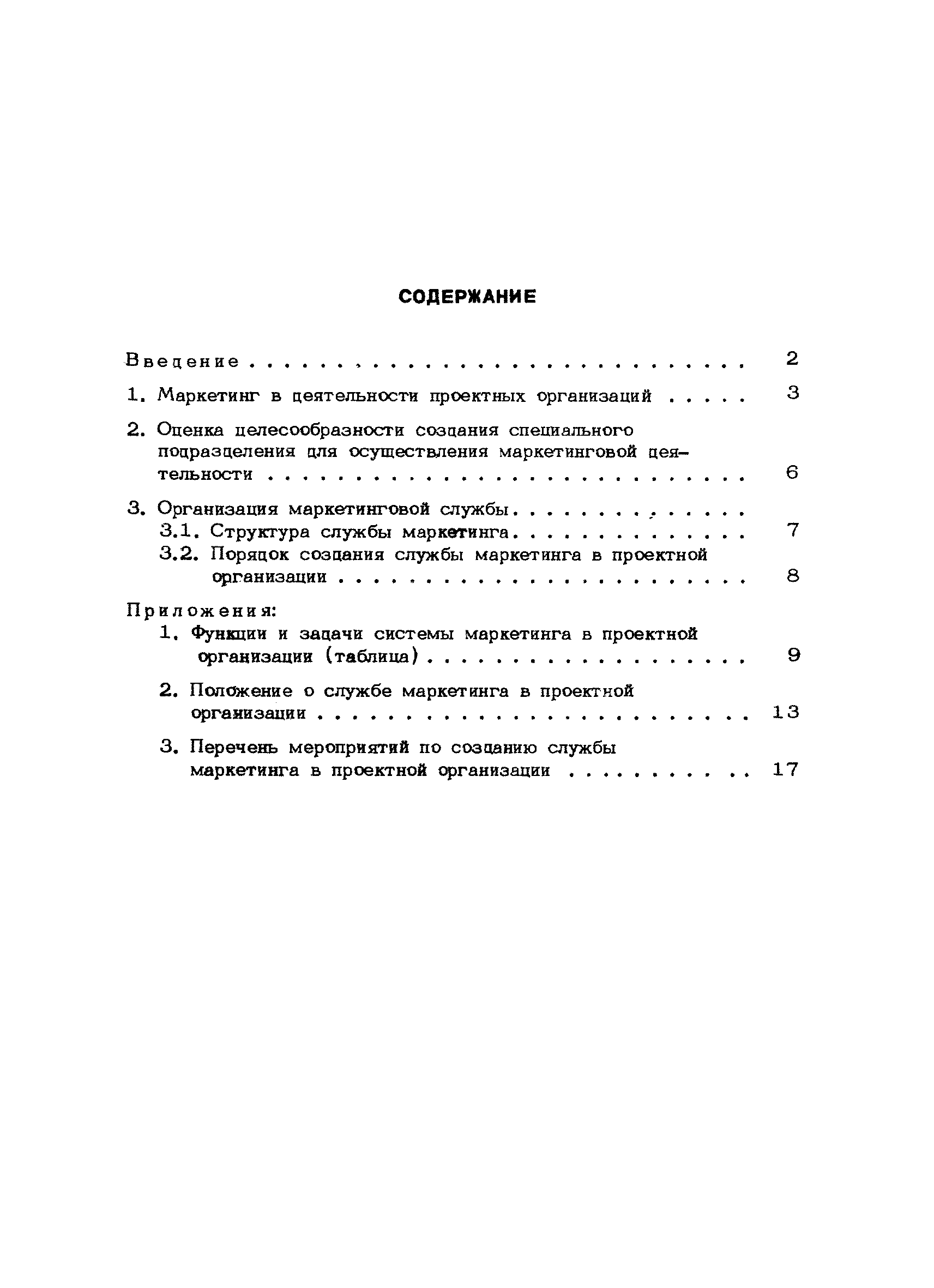 | Оглавление: | Введение 1. Маркетинг в деятельности проектных организаций 2. Оценка целесообразности создания специального подразделения для осуществления маркетинговой деятельности 3. Организация маркетинговой службы 3.1. Структура службы маркетинга 3.2. Порядок создания службы маркетинга в проектной организации Приложение 1. Функции и задачи системы маркетинга в проектной организации (таблица) Приложение 2. Положение о службе маркетинга в проектной организации Приложение 3. Перечень мероприятий по созданию службы маркетинга в проектной организации |