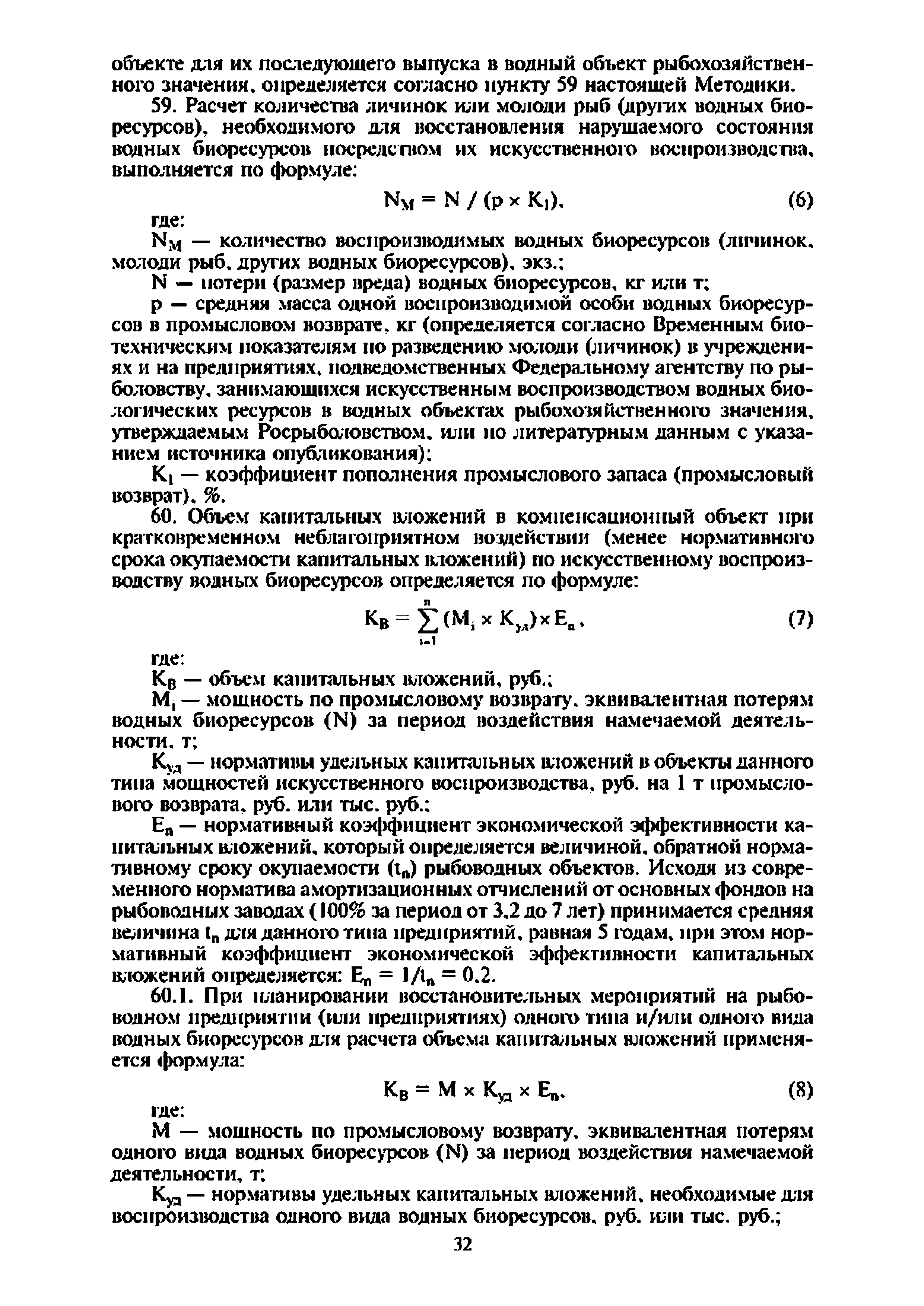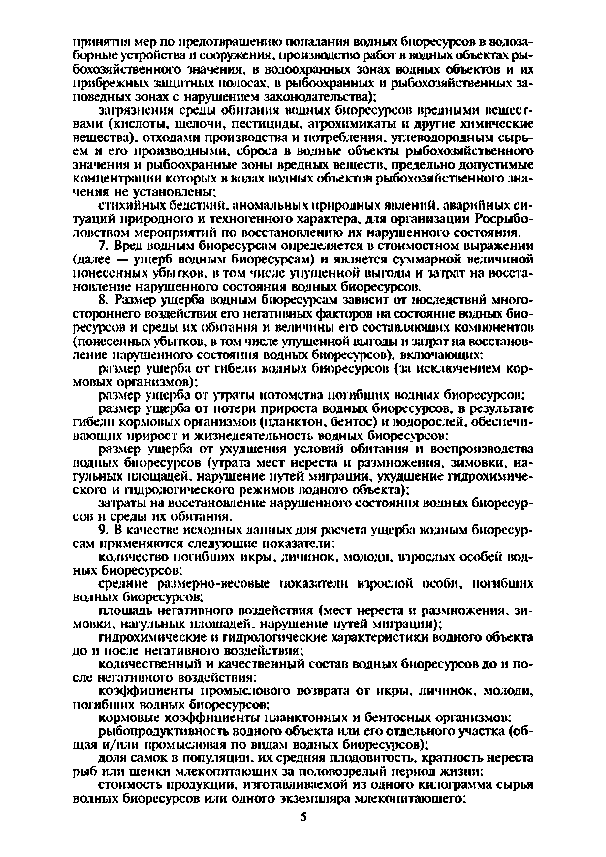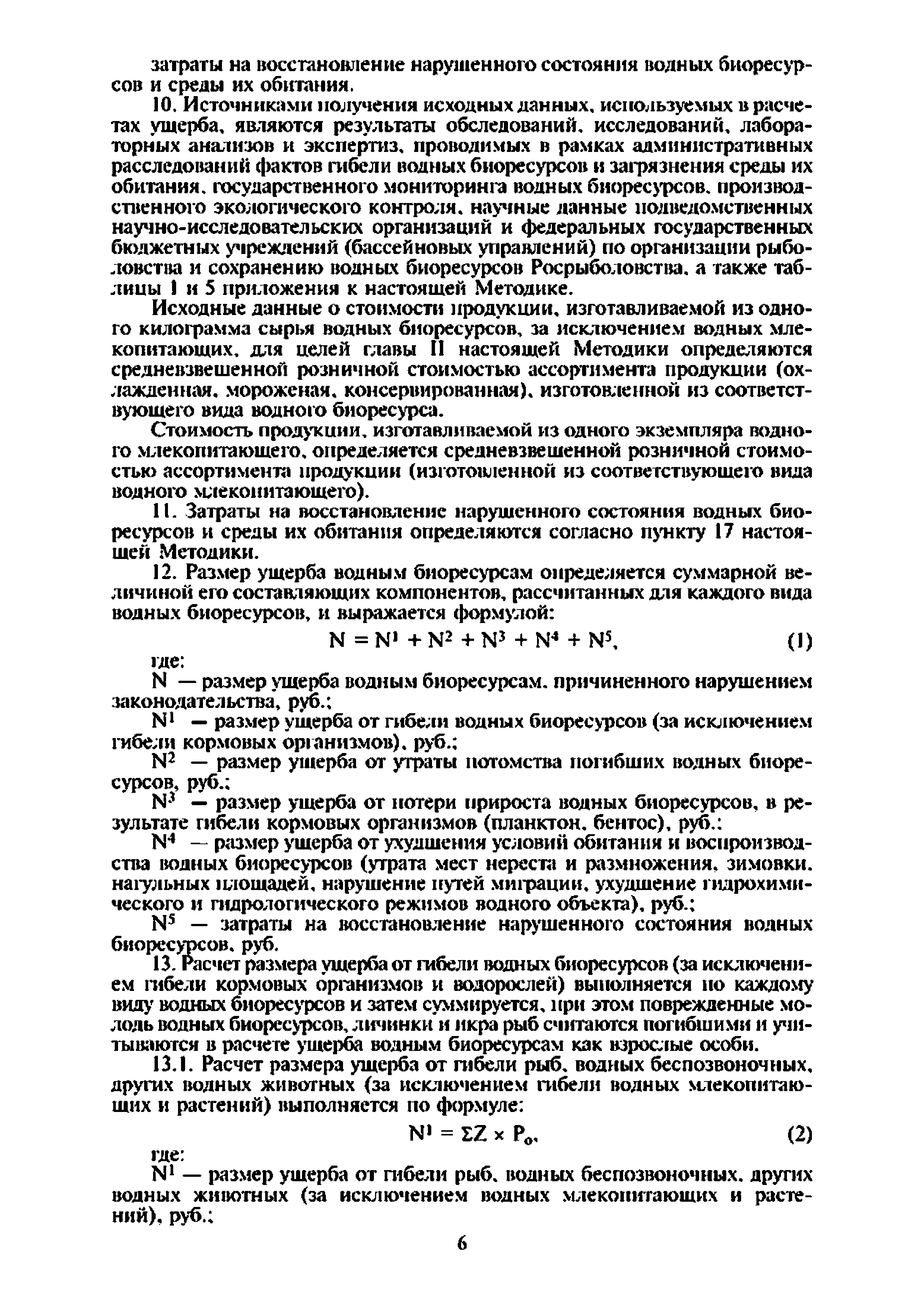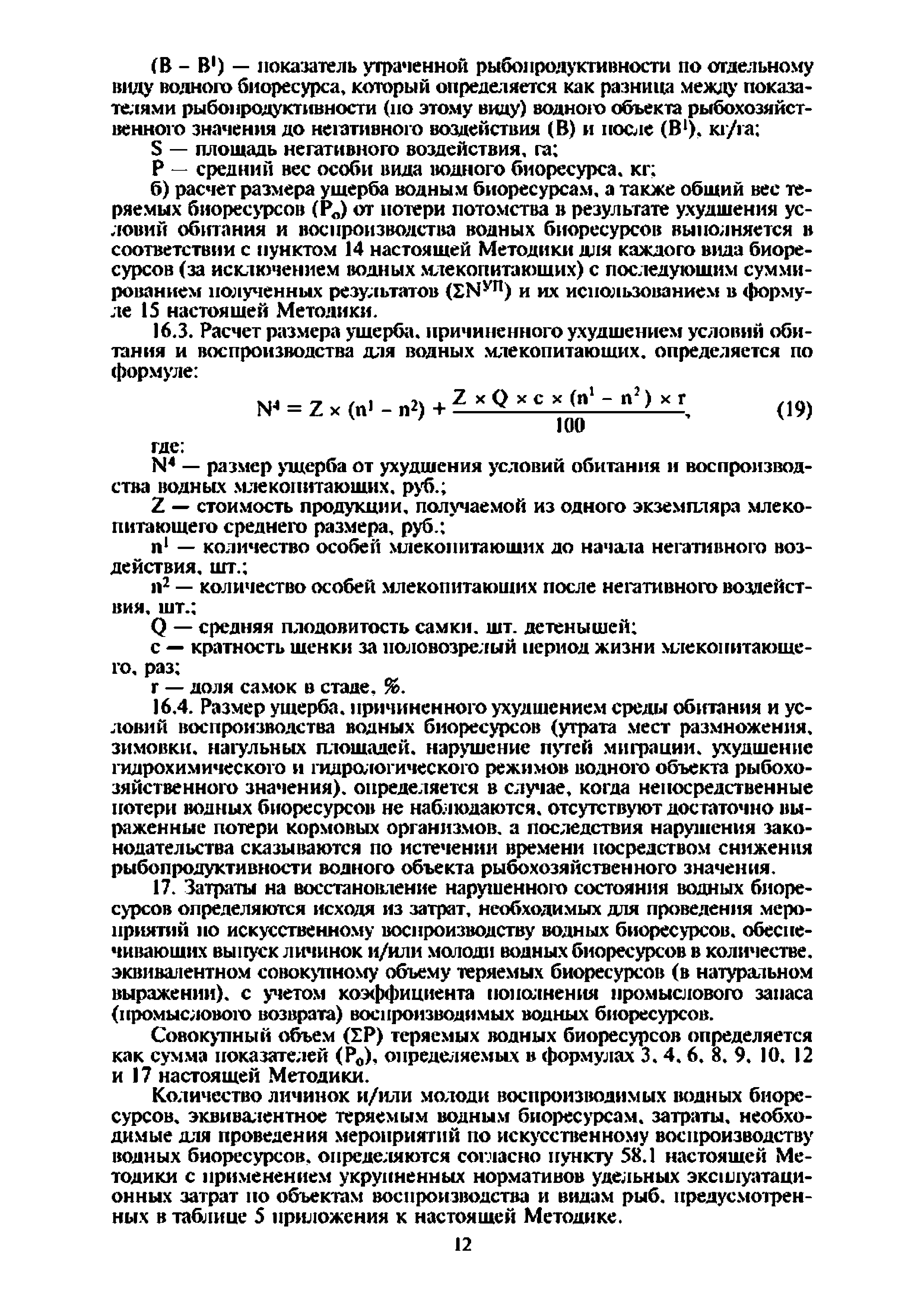Методика исчисления размера вреда, причиненного водным биологическим ресурсам| Статус: | действует | | Название рус.: | Методика исчисления размера вреда, причиненного водным биологическим ресурсам | | Дата добавления в базу: | 12.02.2016 | | Дата актуализации: | 01.01.2021 | | Дата введения: | 13.07.2012 | | Дата окончания срока действия: | 16.03.2021 | | Область применения: | Методика определяет процедуру исчисления размера вреда, причиненного водным биологическим ресурсам | | Оглавление: | I. Общие положения II. Расчет размера вреда, причиненного водным биоресурсам в результате нарушения законодательства в области рыболовства и сохранения водных биологических ресурсов, а также в результате стихийных бедствий, аномальных природных явлений, аварийных ситуаций природного и техногенного характера III. Расчет размера вреда водным биоресурсам от осуществления планируемой хозяйственной и иной деятельности, влияющей на состояние водных биоресурсов и среды их обитания Приложение. Таблица 1. Коэффициенты, характеризующие биопродукционные процессы в водных объектах по основным рыбохозяйственным бассейнам Таблица 2. Коэффициенты пополнения промыслового запаса (промысловый возврат) от икры, личинок, молоди водных биоресурсов по основным рыбохозяйственным бассейнам Таблица 3. Нормативы удельных капитальных вложений по объектам воспроизводства и видам рыб по основным рыбохозяйственным бассейнам Таблица 4. Укрупненные нормативы удельных капитальных вложений по объектам воспроизводства и видам рыб по основным рыбохозяйственным бассейнам Таблица 5. Укрупненные нормативы удельных эксплуатационных затрат по объектам воспроизводства и видам рыб по основным рыбохозяйственным бассейнам | | Утверждён: | 25.11.2011 Федеральное агентство по рыболовству (1166)