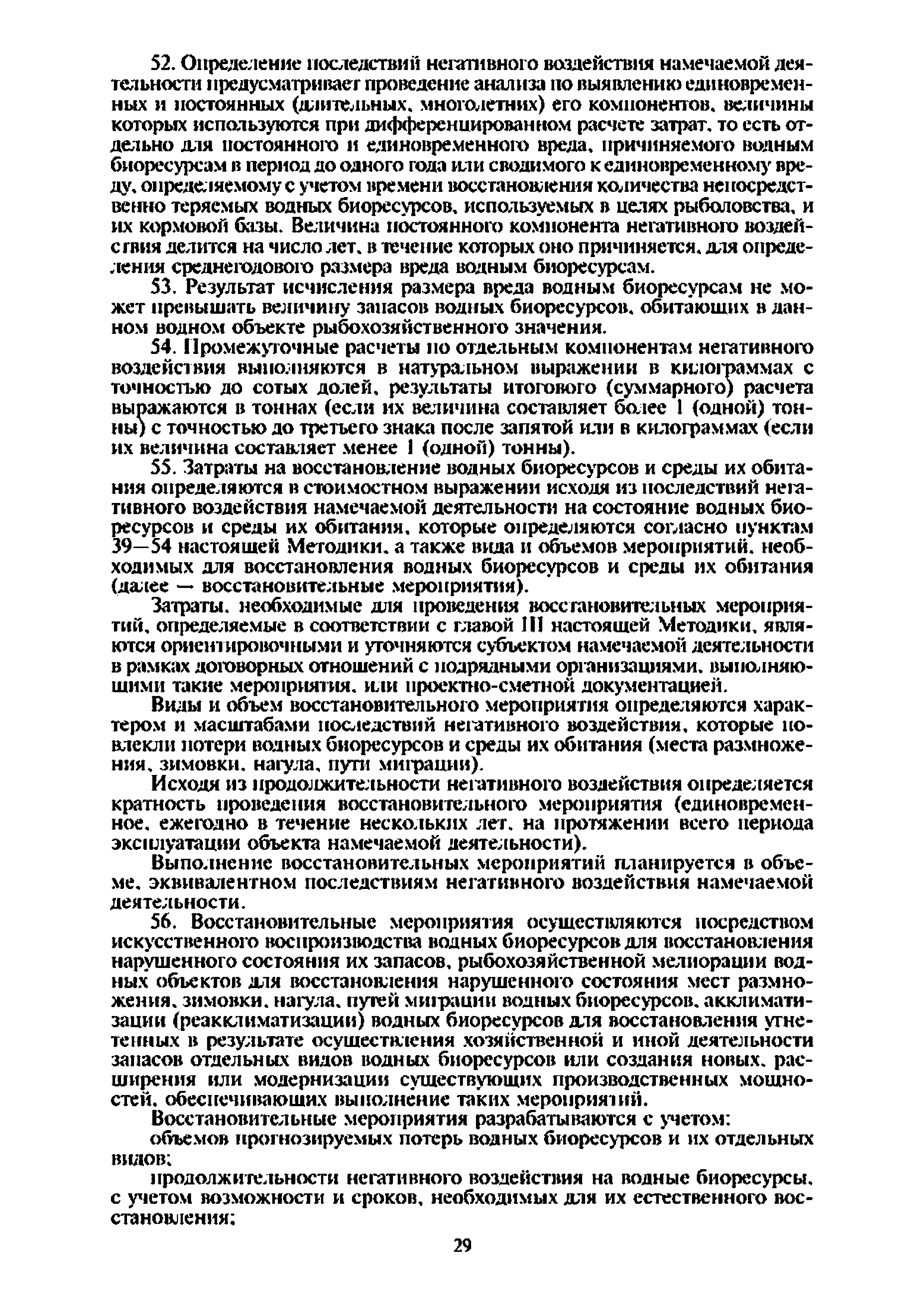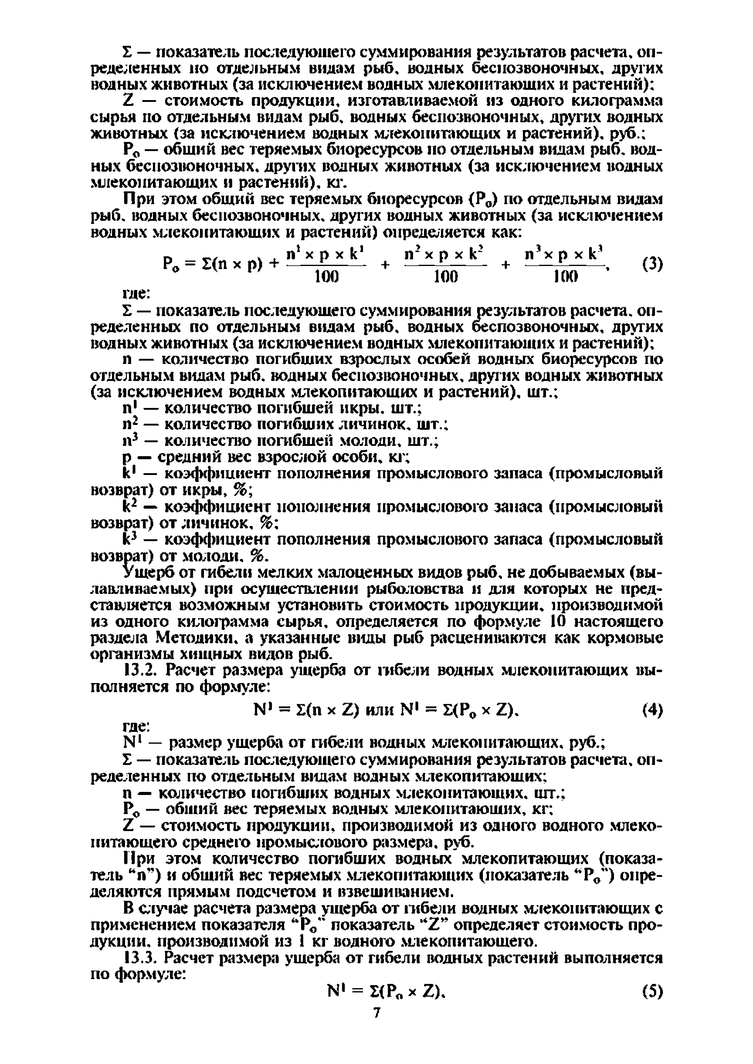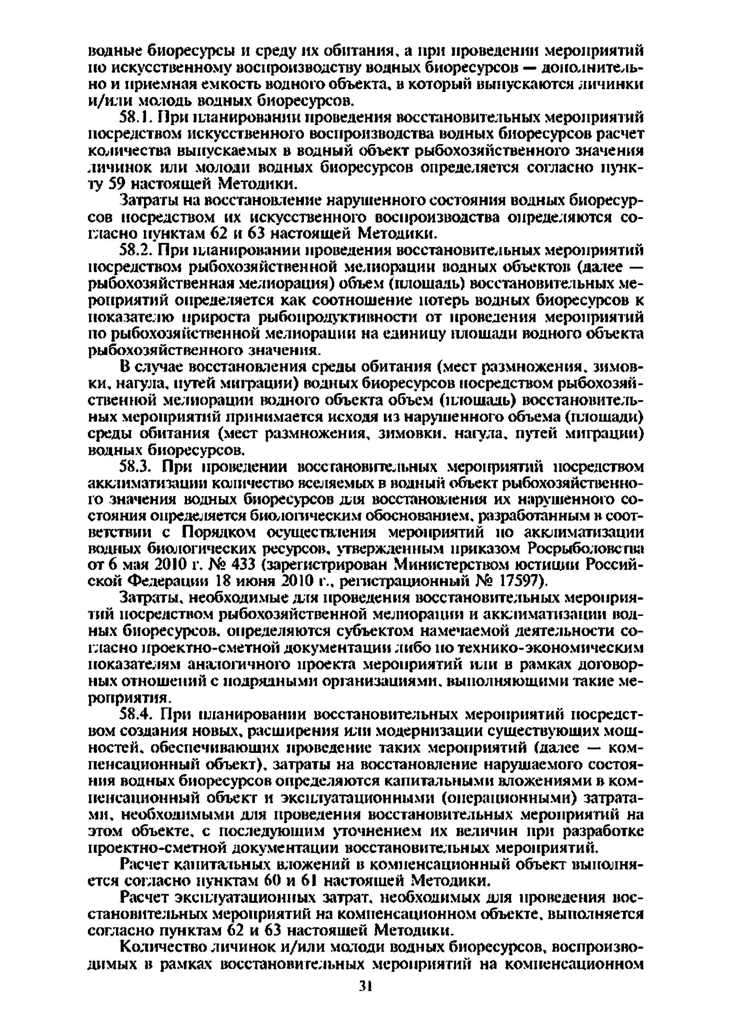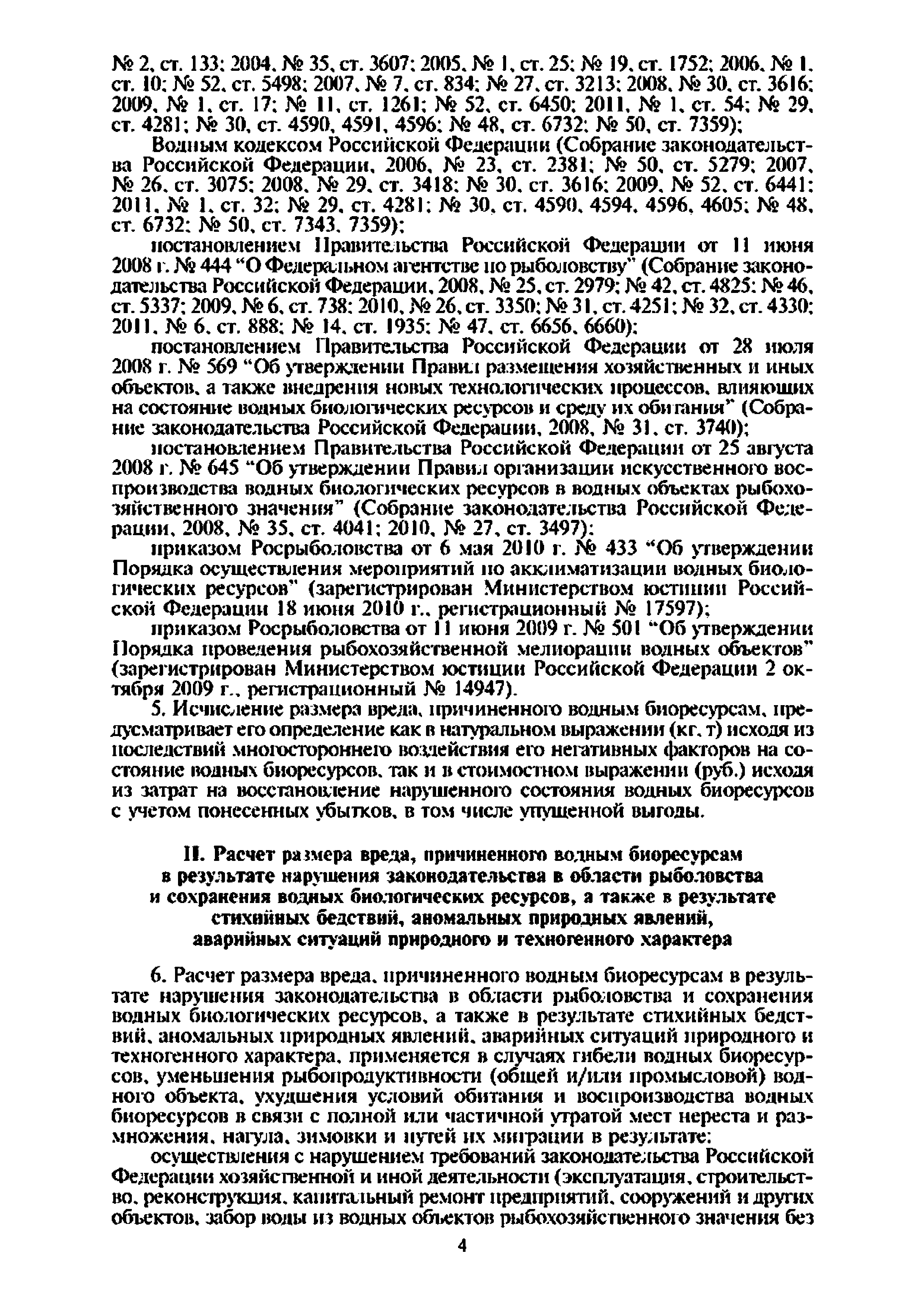 Методика исчисления размера вреда, причиненного водным биологическим ресурсам| Статус: | действует | | Название рус.: | Методика исчисления размера вреда, причиненного водным биологическим ресурсам | | Дата добавления в базу: | 12.02.2016 | | Дата актуализации: | 01.01.2021 | | Дата введения: | 13.07.2012 | | Дата окончания срока действия: | 16.03.2021 | | Область применения: | Методика определяет процедуру исчисления размера вреда, причиненного водным биологическим ресурсам | | Оглавление: | I. Общие положения II. Расчет размера вреда, причиненного водным биоресурсам в результате нарушения законодательства в области рыболовства и сохранения водных биологических ресурсов, а также в результате стихийных бедствий, аномальных природных явлений, аварийных ситуаций природного и техногенного характера III. Расчет размера вреда водным биоресурсам от осуществления планируемой хозяйственной и иной деятельности, влияющей на состояние водных биоресурсов и среды их обитания Приложение. Таблица 1. Коэффициенты, характеризующие биопродукционные процессы в водных объектах по основным рыбохозяйственным бассейнам Таблица 2. Коэффициенты пополнения промыслового запаса (промысловый возврат) от икры, личинок, молоди водных биоресурсов по основным рыбохозяйственным бассейнам Таблица 3. Нормативы удельных капитальных вложений по объектам воспроизводства и видам рыб по основным рыбохозяйственным бассейнам Таблица 4. Укрупненные нормативы удельных капитальных вложений по объектам воспроизводства и видам рыб по основным рыбохозяйственным бассейнам Таблица 5. Укрупненные нормативы удельных эксплуатационных затрат по объектам воспроизводства и видам рыб по основным рыбохозяйственным бассейнам | | Утверждён: | 25.11.2011 Федеральное агентство по рыболовству (1166)