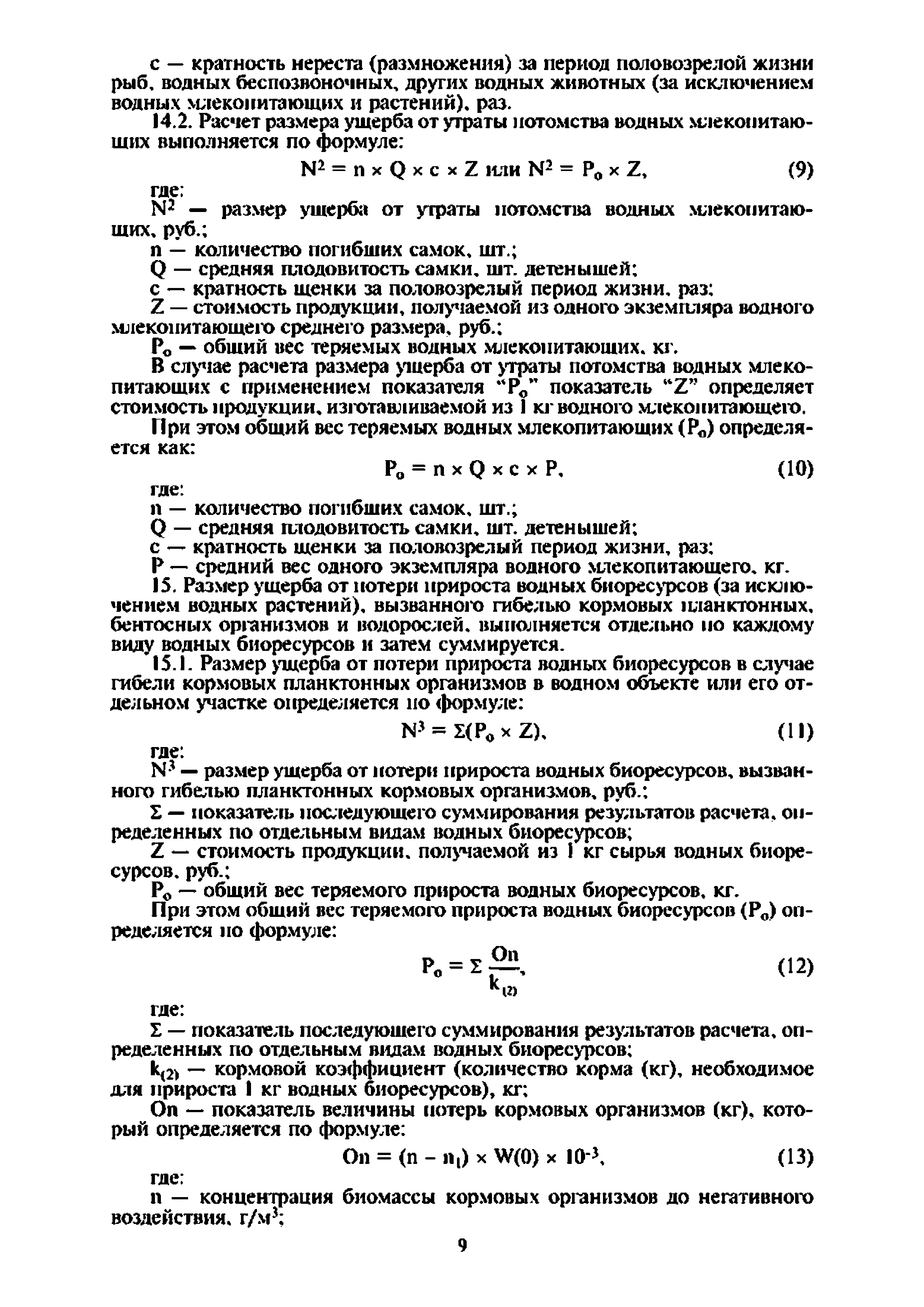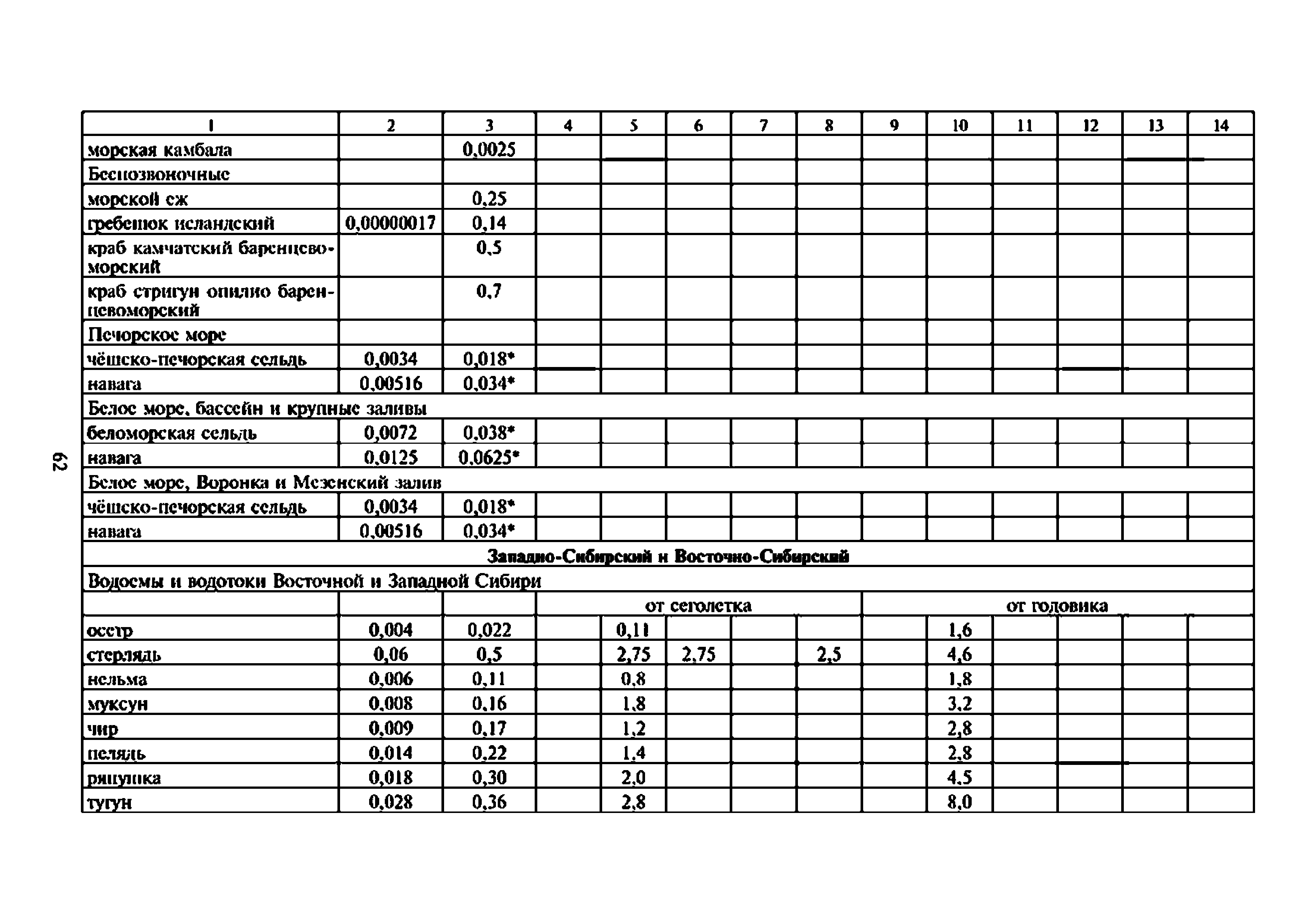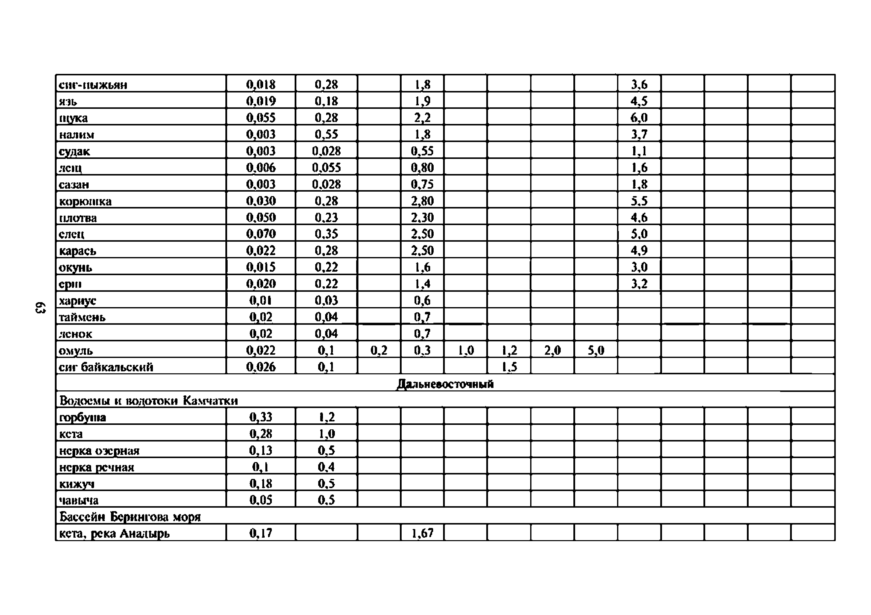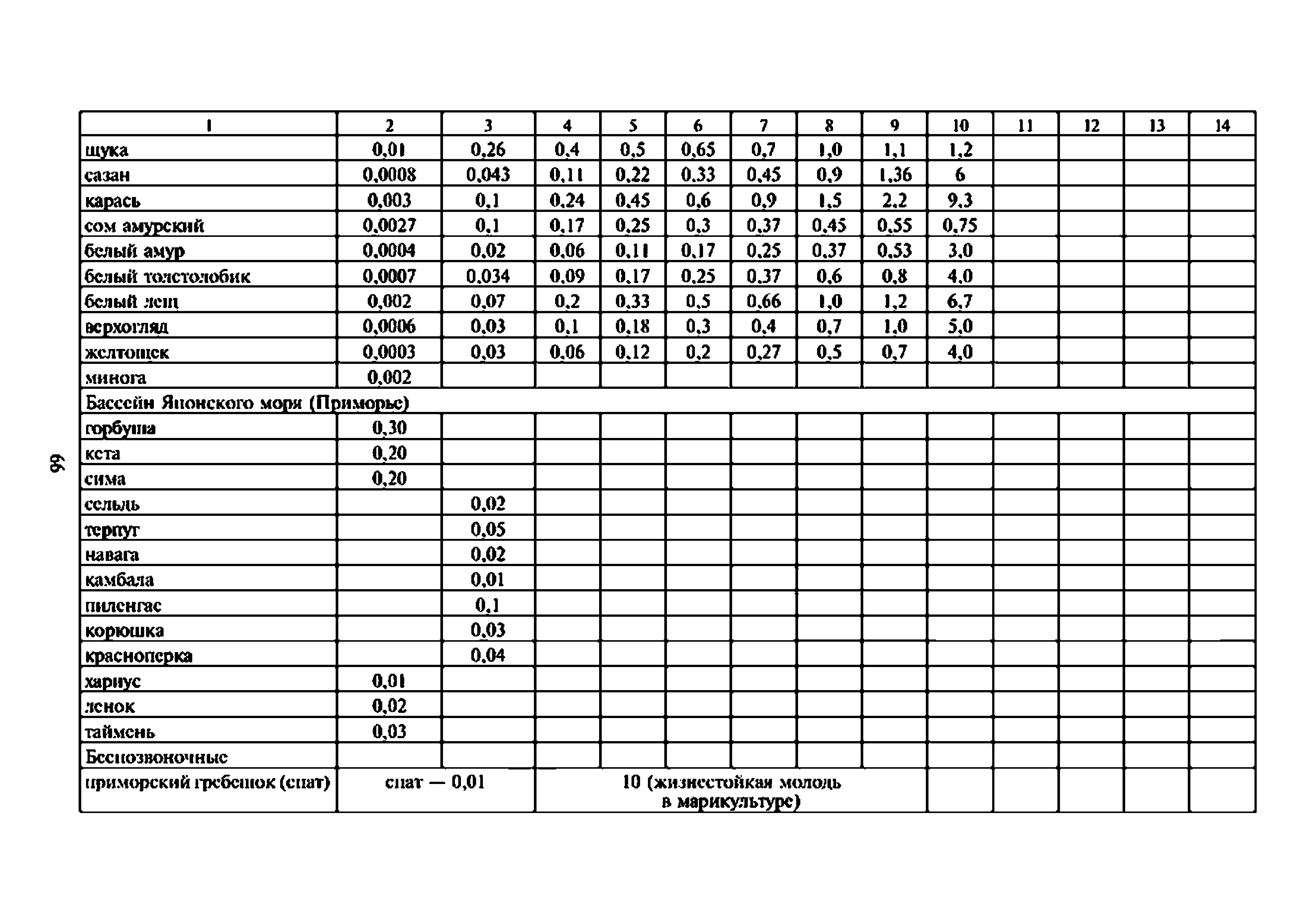 Методика исчисления размера вреда, причиненного водным биологическим ресурсам| Статус: | действует | | Название рус.: | Методика исчисления размера вреда, причиненного водным биологическим ресурсам | | Дата добавления в базу: | 12.02.2016 | | Дата актуализации: | 01.01.2021 | | Дата введения: | 13.07.2012 | | Дата окончания срока действия: | 16.03.2021 | | Область применения: | Методика определяет процедуру исчисления размера вреда, причиненного водным биологическим ресурсам | | Оглавление: | I. Общие положения II. Расчет размера вреда, причиненного водным биоресурсам в результате нарушения законодательства в области рыболовства и сохранения водных биологических ресурсов, а также в результате стихийных бедствий, аномальных природных явлений, аварийных ситуаций природного и техногенного характера III. Расчет размера вреда водным биоресурсам от осуществления планируемой хозяйственной и иной деятельности, влияющей на состояние водных биоресурсов и среды их обитания Приложение. Таблица 1. Коэффициенты, характеризующие биопродукционные процессы в водных объектах по основным рыбохозяйственным бассейнам Таблица 2. Коэффициенты пополнения промыслового запаса (промысловый возврат) от икры, личинок, молоди водных биоресурсов по основным рыбохозяйственным бассейнам Таблица 3. Нормативы удельных капитальных вложений по объектам воспроизводства и видам рыб по основным рыбохозяйственным бассейнам Таблица 4. Укрупненные нормативы удельных капитальных вложений по объектам воспроизводства и видам рыб по основным рыбохозяйственным бассейнам Таблица 5. Укрупненные нормативы удельных эксплуатационных затрат по объектам воспроизводства и видам рыб по основным рыбохозяйственным бассейнам | | Утверждён: | 25.11.2011 Федеральное агентство по рыболовству (1166)