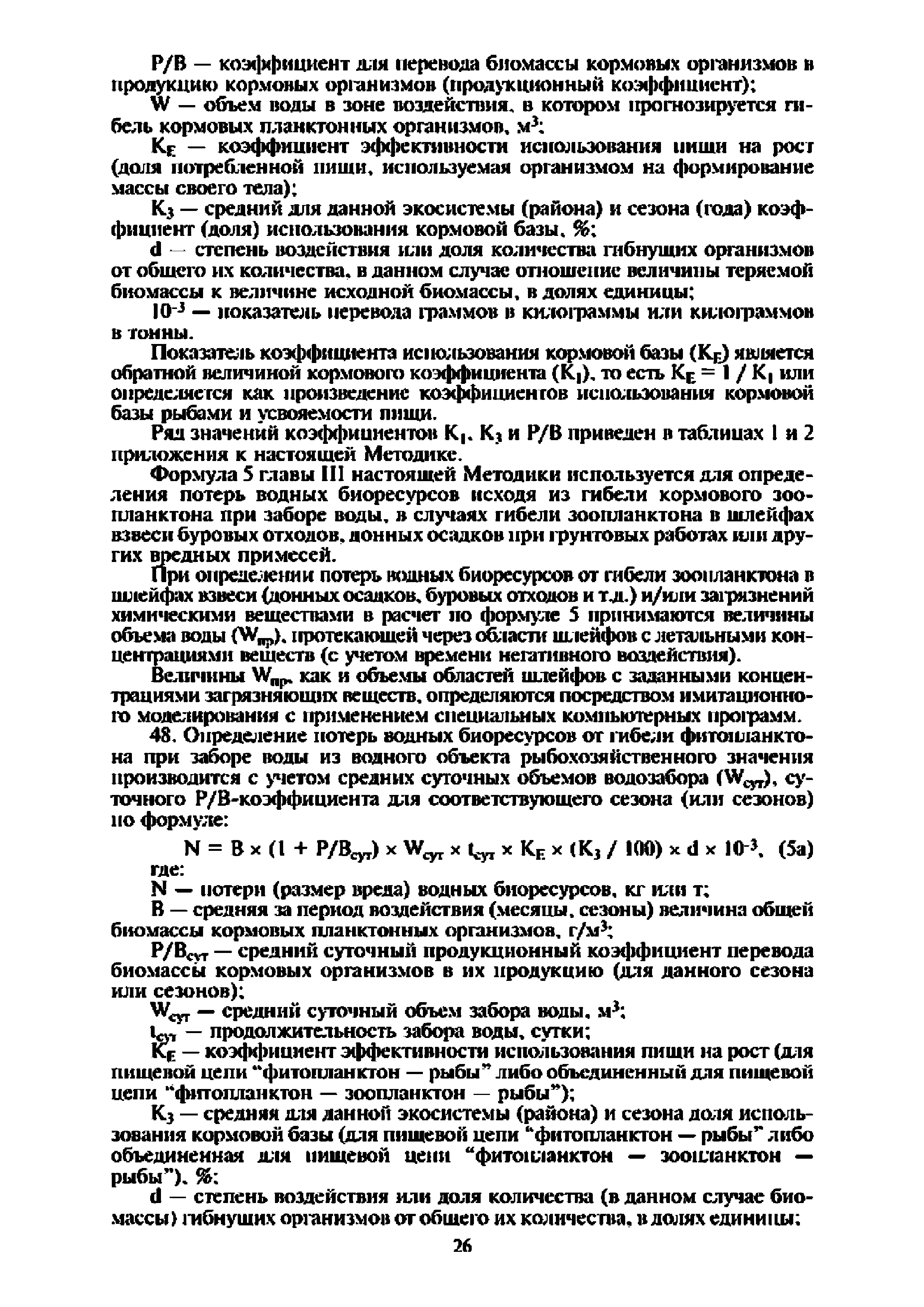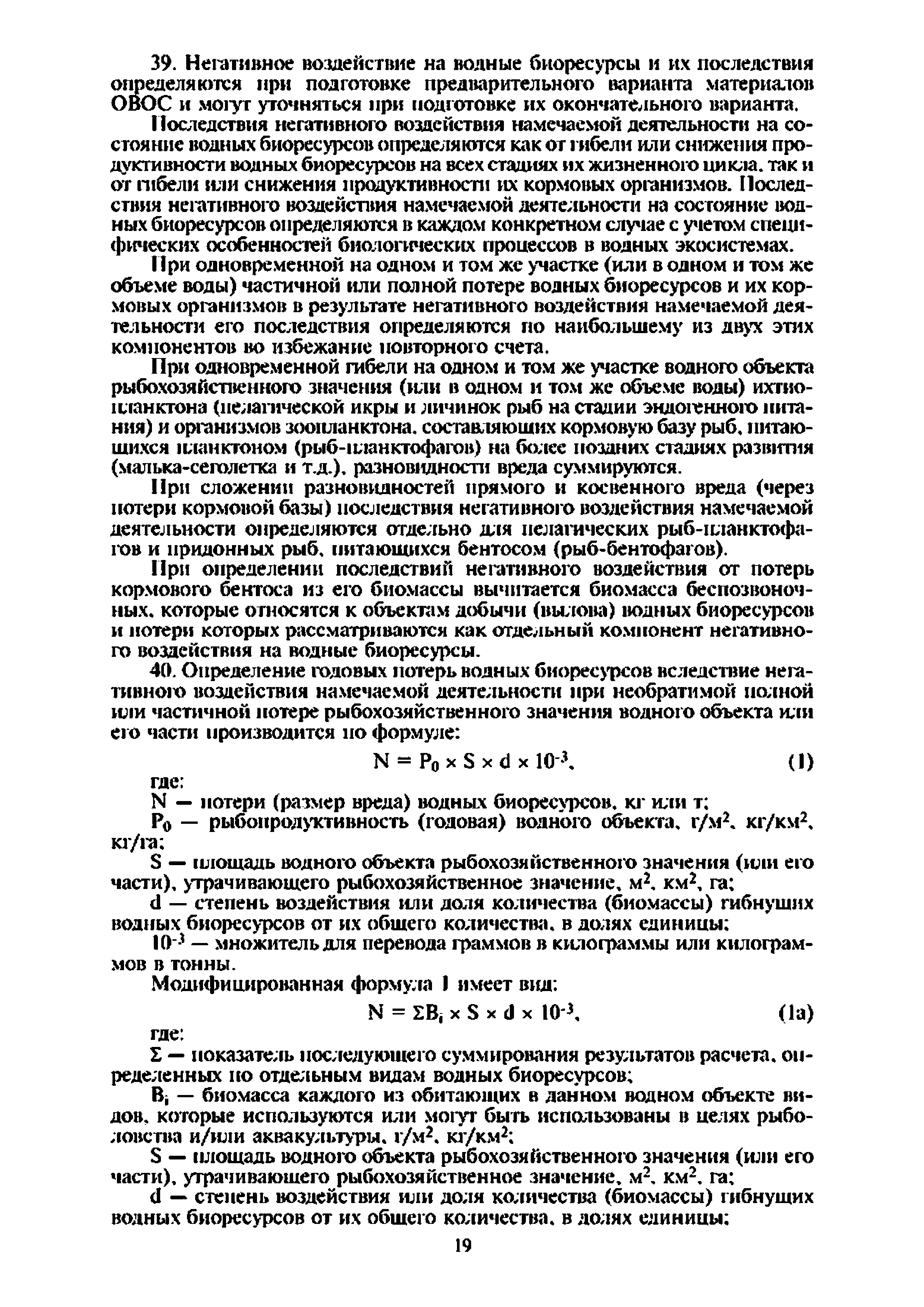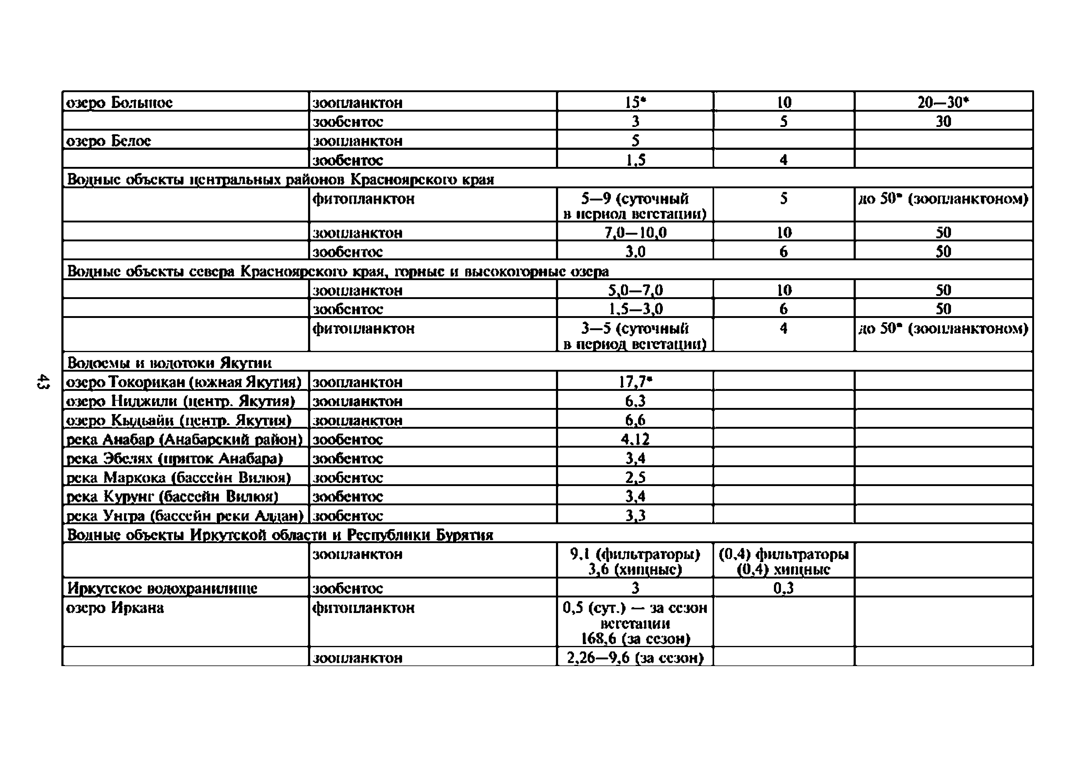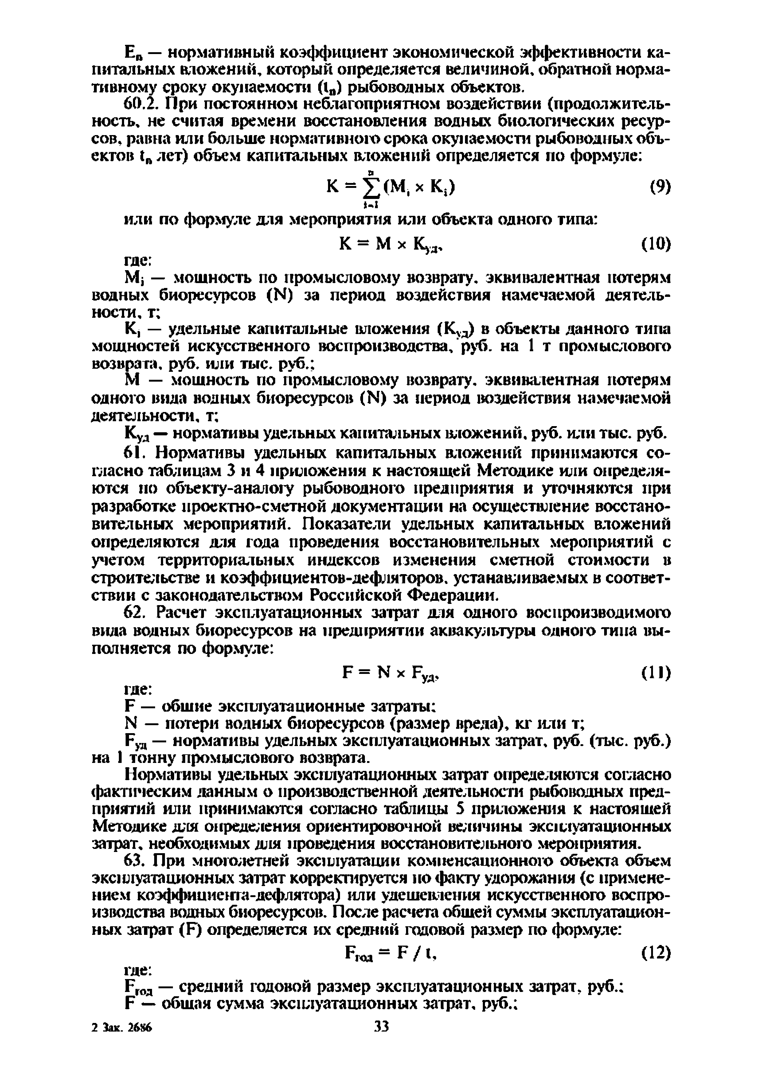 Методика исчисления размера вреда, причиненного водным биологическим ресурсам| Статус: | действует | | Название рус.: | Методика исчисления размера вреда, причиненного водным биологическим ресурсам | | Дата добавления в базу: | 12.02.2016 | | Дата актуализации: | 01.01.2021 | | Дата введения: | 13.07.2012 | | Дата окончания срока действия: | 16.03.2021 | | Область применения: | Методика определяет процедуру исчисления размера вреда, причиненного водным биологическим ресурсам | | Оглавление: | I. Общие положения II. Расчет размера вреда, причиненного водным биоресурсам в результате нарушения законодательства в области рыболовства и сохранения водных биологических ресурсов, а также в результате стихийных бедствий, аномальных природных явлений, аварийных ситуаций природного и техногенного характера III. Расчет размера вреда водным биоресурсам от осуществления планируемой хозяйственной и иной деятельности, влияющей на состояние водных биоресурсов и среды их обитания Приложение. Таблица 1. Коэффициенты, характеризующие биопродукционные процессы в водных объектах по основным рыбохозяйственным бассейнам Таблица 2. Коэффициенты пополнения промыслового запаса (промысловый возврат) от икры, личинок, молоди водных биоресурсов по основным рыбохозяйственным бассейнам Таблица 3. Нормативы удельных капитальных вложений по объектам воспроизводства и видам рыб по основным рыбохозяйственным бассейнам Таблица 4. Укрупненные нормативы удельных капитальных вложений по объектам воспроизводства и видам рыб по основным рыбохозяйственным бассейнам Таблица 5. Укрупненные нормативы удельных эксплуатационных затрат по объектам воспроизводства и видам рыб по основным рыбохозяйственным бассейнам | | Утверждён: | 25.11.2011 Федеральное агентство по рыболовству (1166)