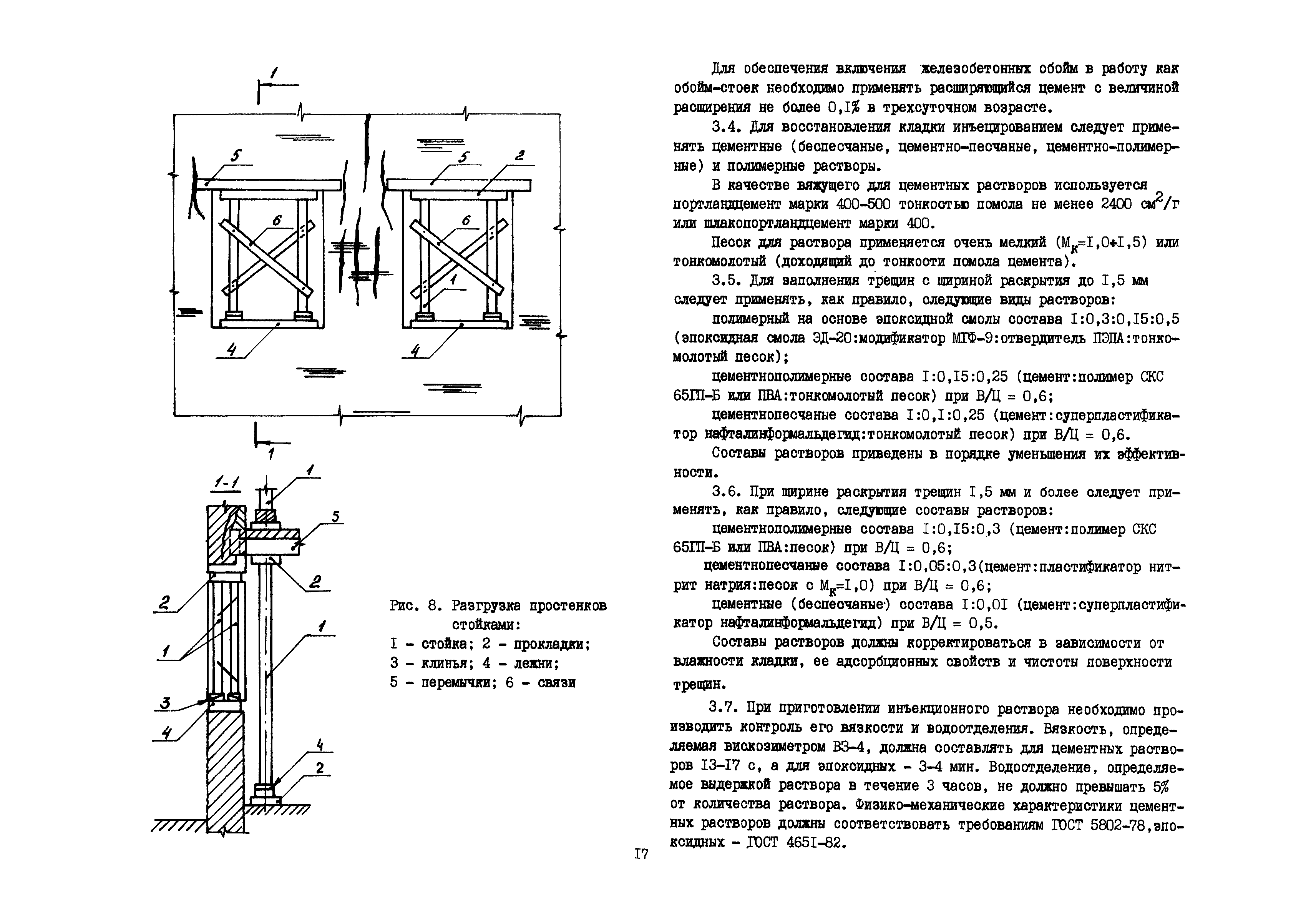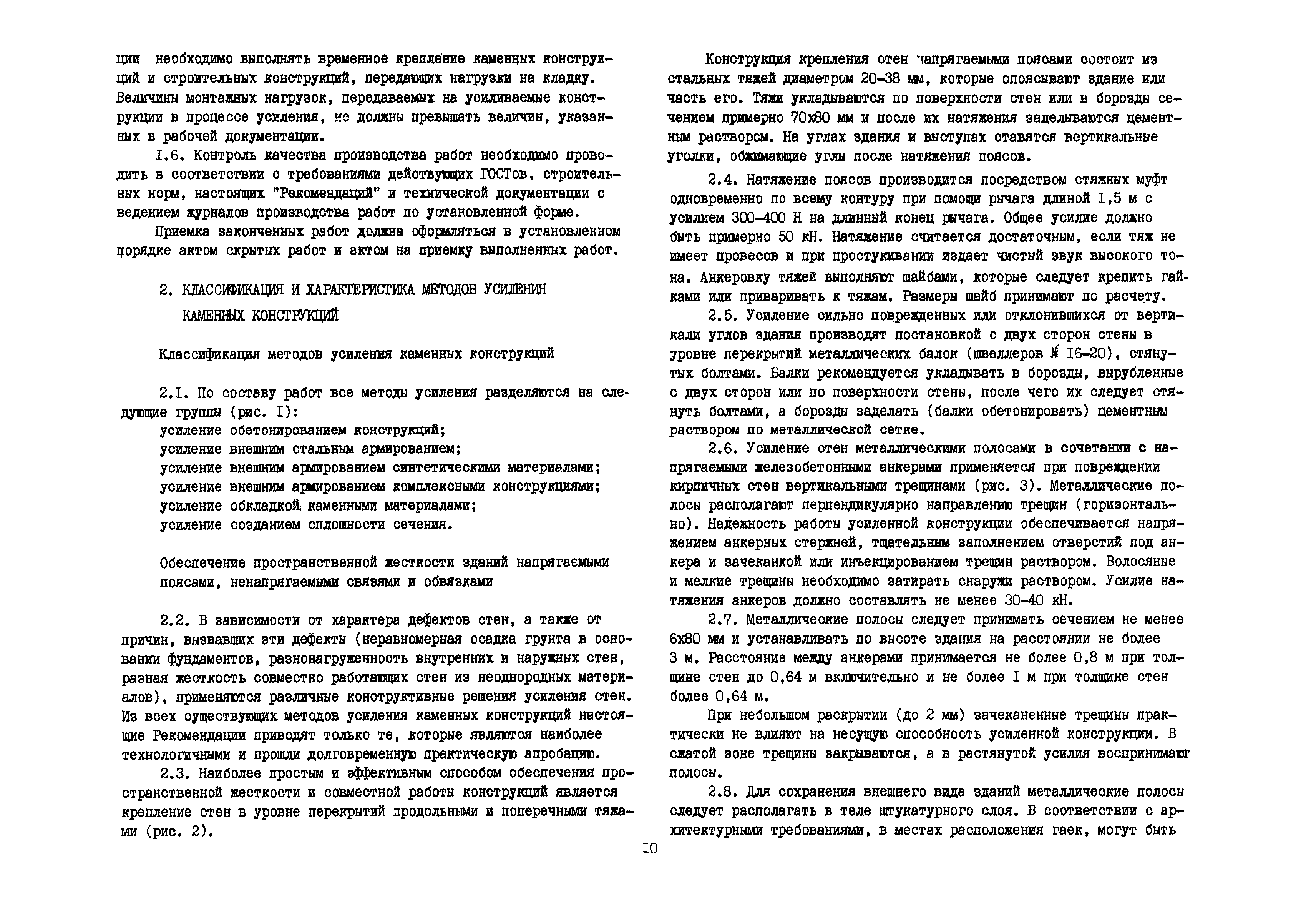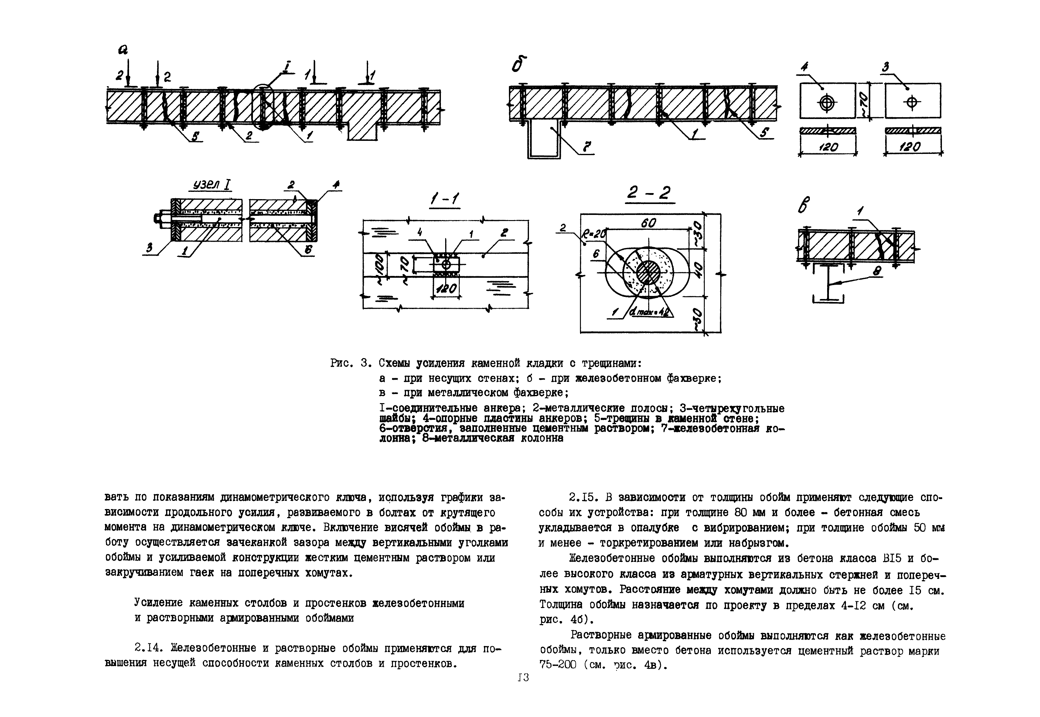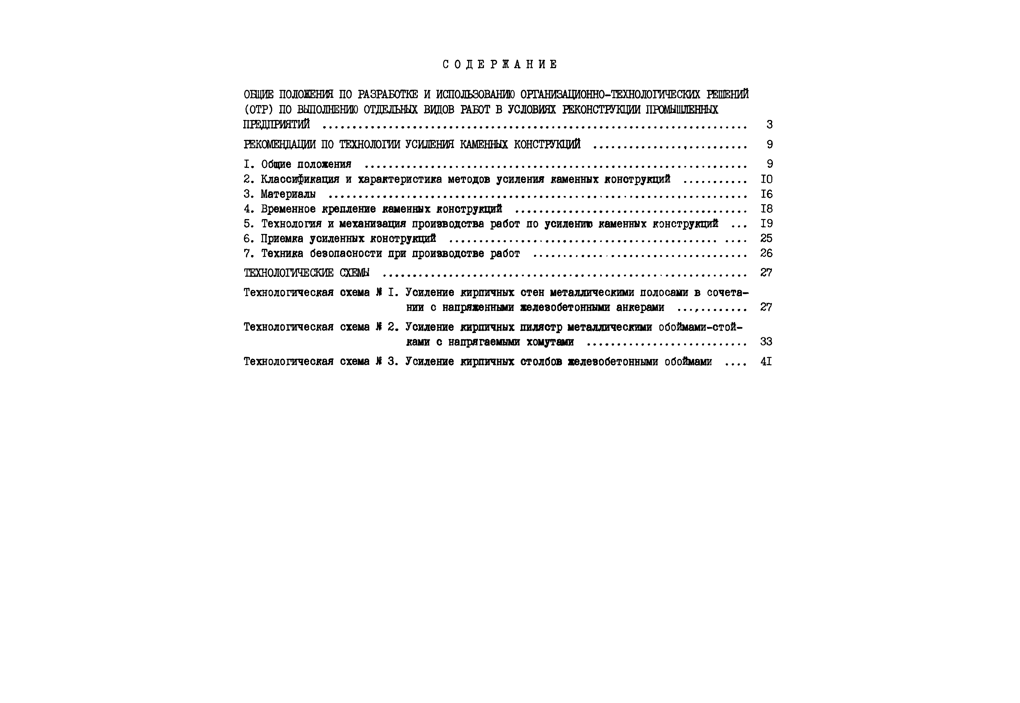 | Оглавление: | Общие положения по разработке и использованию организационно-технологических решений (ОТР) по выполнению отдельных видов работ в условиях реконструкции промышленных предприятий Рекомендации по технологии усиления каменных конструкций 1 Общие положения 2 Классификация и характеристика методов усиления каменных конструкций 3 Материалы 4 Временное крепление каменных конструкций 5 Технология и механизация производства работ по усилению каменных конструкций 6 Приемка усиленных конструкций 7 Техника безопасности при производстве работ Технологические схемы Технологическая схема № 1. Усиление кирпичных стен металлическими полосами в сочетании с напряженными железобетонными анкерами Технологическая схема № 2. Усиление кирпичных пилястр металлическими обоймами—стойками с напрягаемыми хомутами Технологическая схема № 3. Усиление кирпичных столбов железобетонными обоймами |