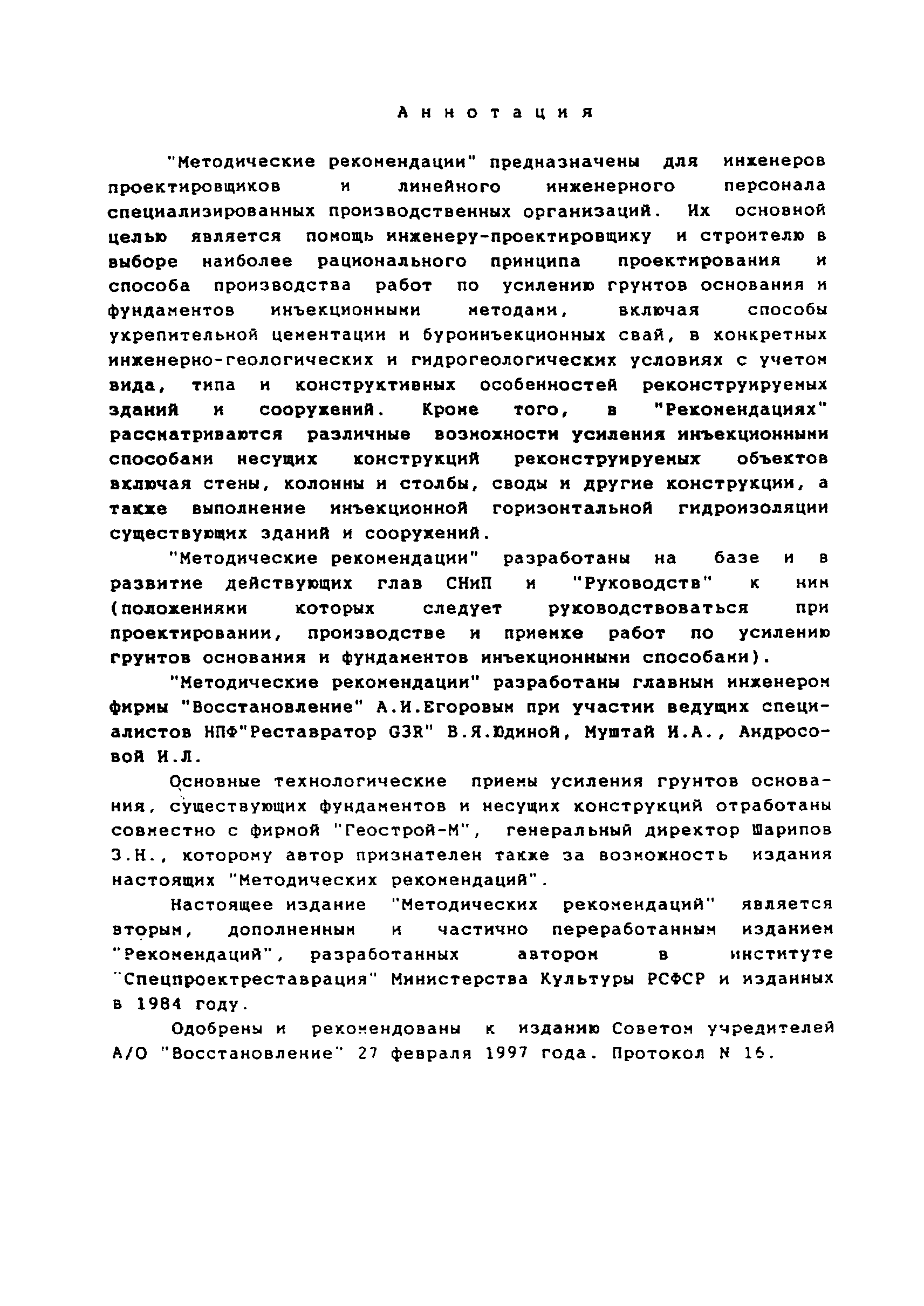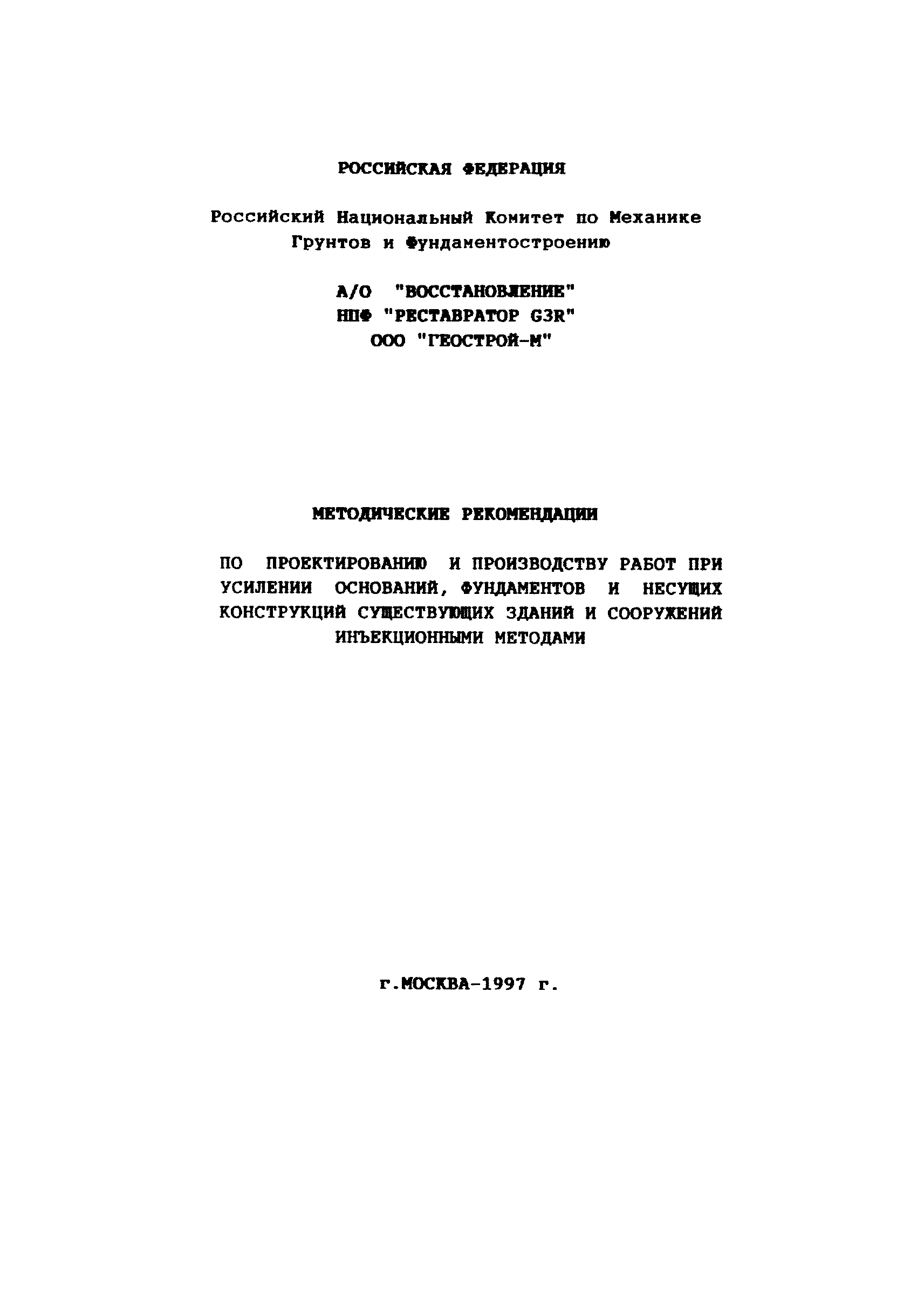 | Название рус.: | Методические рекомендации по проектированию и производству работ при усилении оснований, фундаментов и несущих конструкций существующих зданий и сооружений инъекционными методами |