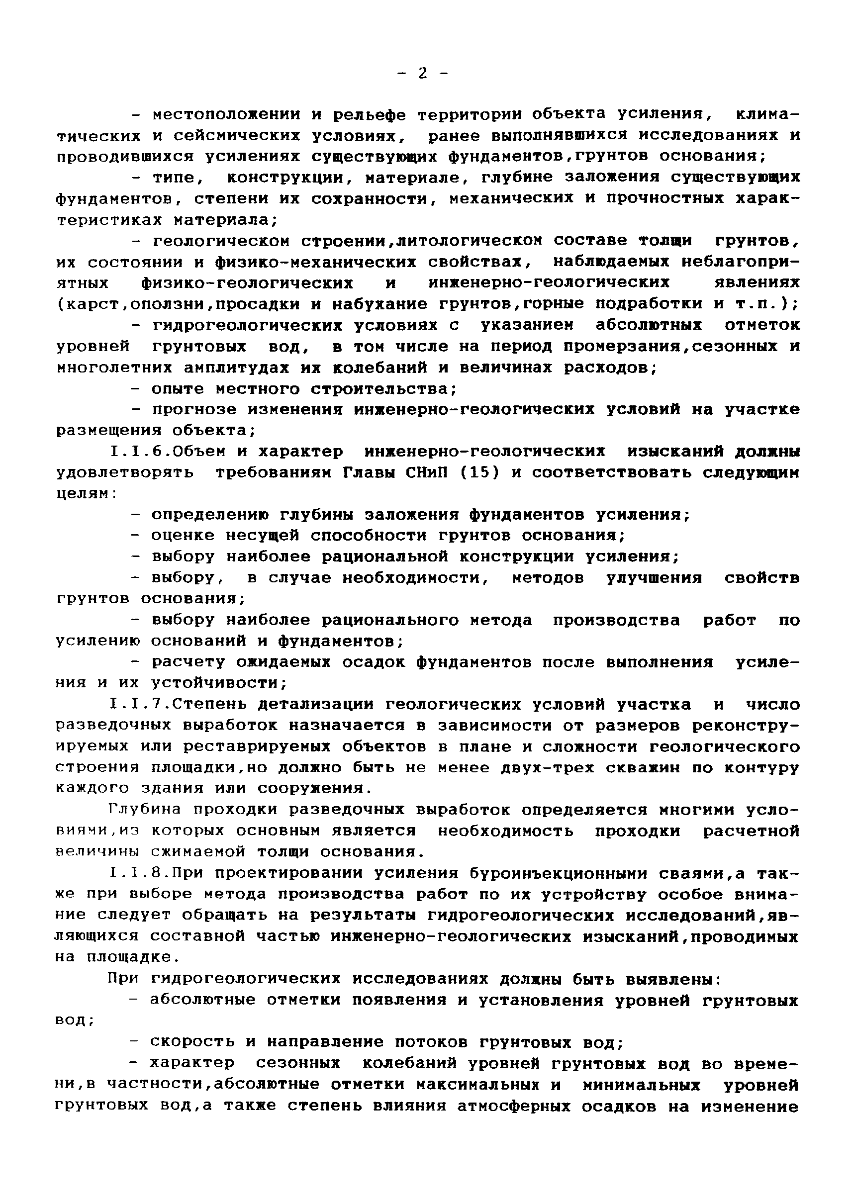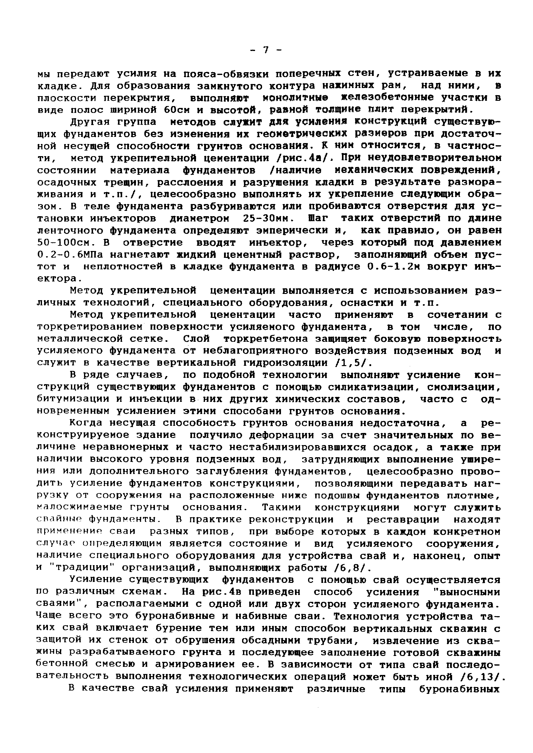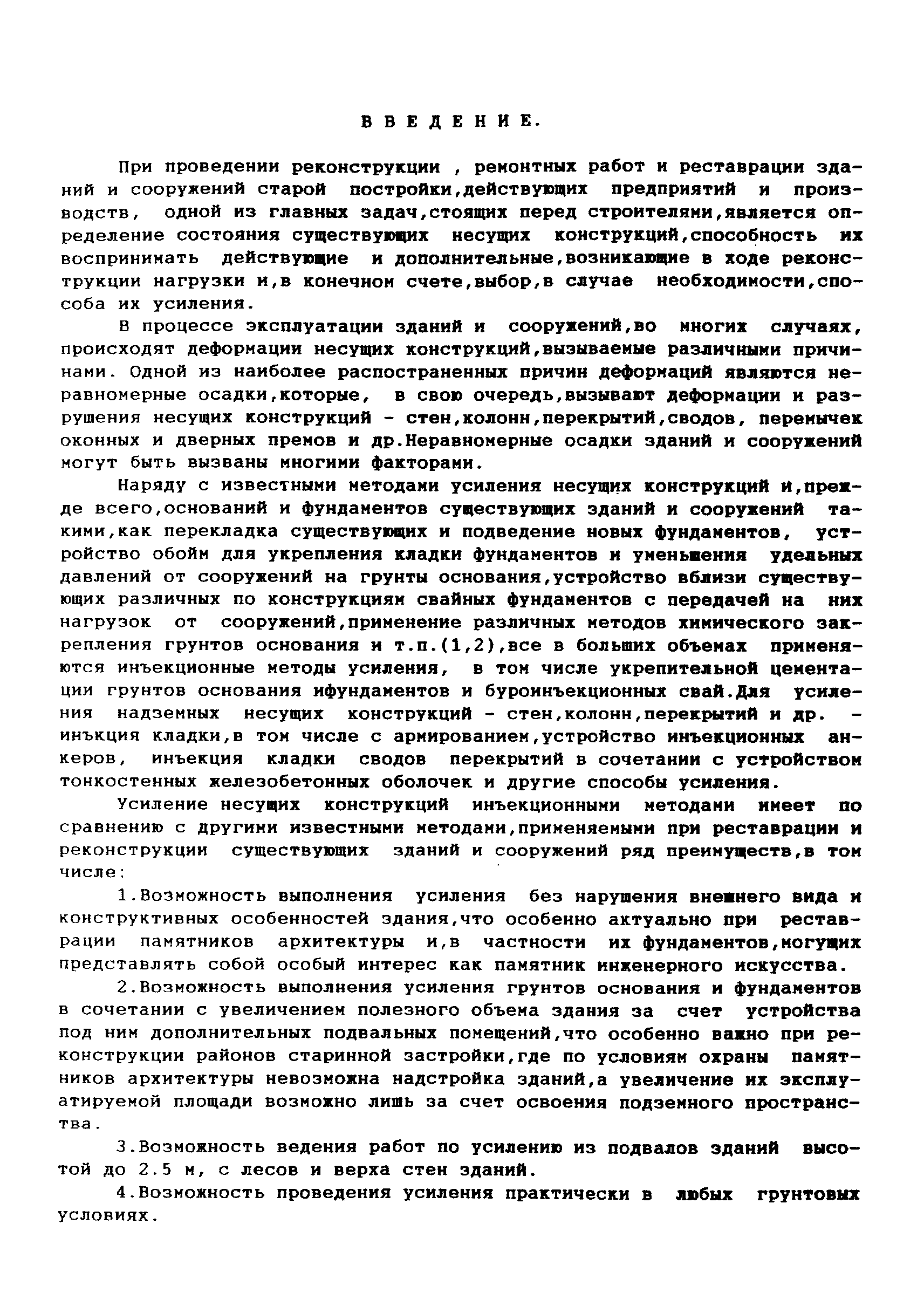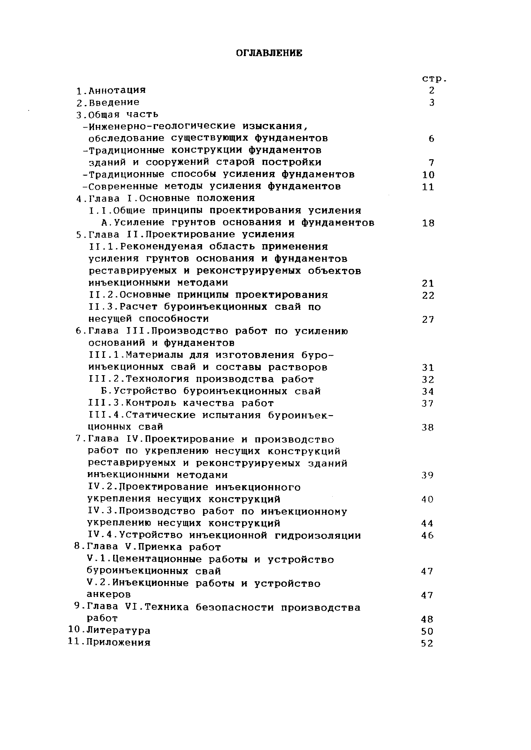 | Оглавление: | 1 Аннотация 2 Введение 3.Общая часть Инженерно-геологические изыскания, обследование существующих фундаментов Традиционные конструкции фундаментов зданий и сооружений старой постройки Традиционные способы усиления фундаментов Современные методы усиления фундаментов 4.Глава I. Основные положения I.I Общие принципы проектирования усиления А. Усиление грунтов основания и фундаментов 5 Глава II. Проектирование усиления II. 1. Рекомендуемая область применения усиления грунтов основания и фундаментов реставрируемых и реконструируемых объектов инъекционными методами II.2. Основные принципы проектирования II.3. Расчет буроинъекционных свай по несущей способности 6.Глава III.Производство работ по усилению оснований и фундаментов III.I Материалы для изготовления буроинъекционных свай и составы растворов III.2 Технология производства работ Б. Устройство буроинъекционных свай III.3. Контроль качества работ III.4. Статические испытания буроинъекционных свай 7.Глава IV. Проектирование и производство работ по укреплению несущих конструкций реставрируемых и реконструируемых зданий инъекционными методами IV.2. Проектирование инъекционного укрепления несущих конструкций IV.3. Производство работ по инъекционному укреплению несущих конструкций IV. 4. Устройство инъекционной гидроизоляции 8. Глава V. Приемка работ V.1. Цементационные работы и устройство буроинъекционных свай V.2. Инъекционные работы и устройство анкеров 9. Глава VI. Техника безопасности производства работ 10. Литература Приложение 1. Форма журнала производства работ по укрепительной цементации (инъекции). Журнал производства работ по укрепительной цементации Приложение 2. Форма журнала изготовления буроинъекционных свай (титульный лист) |