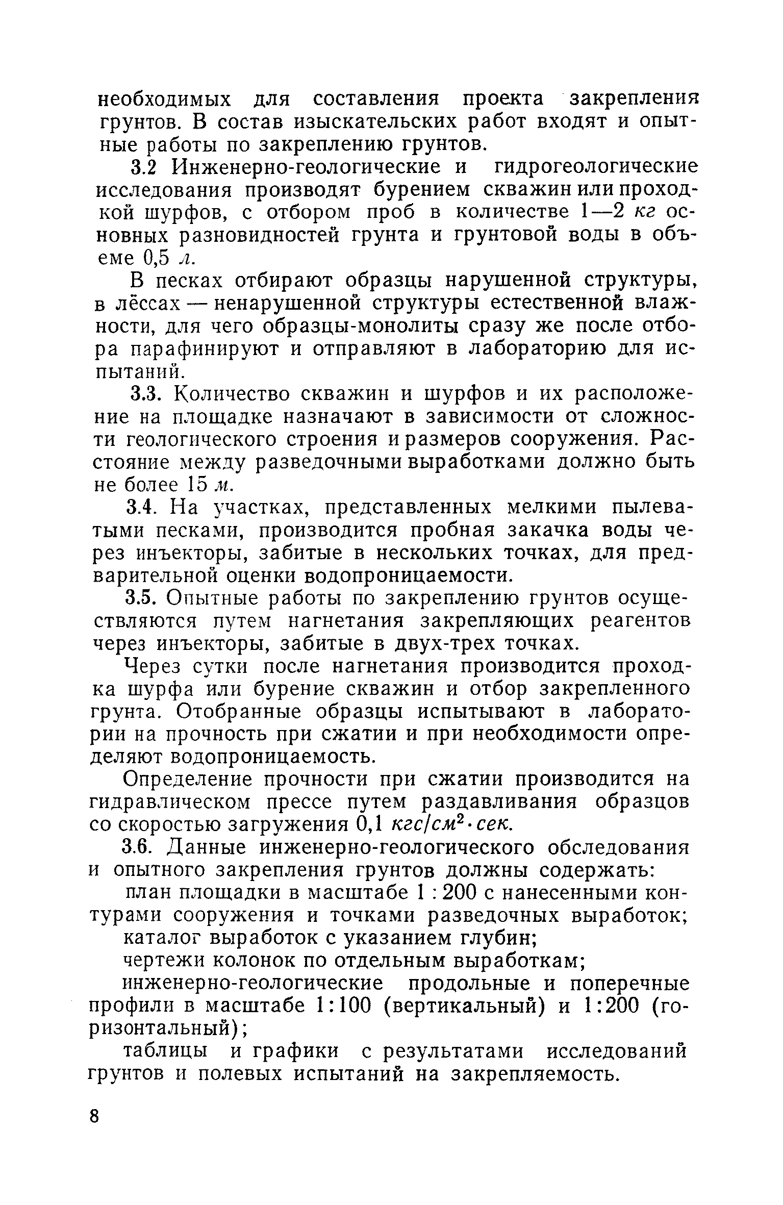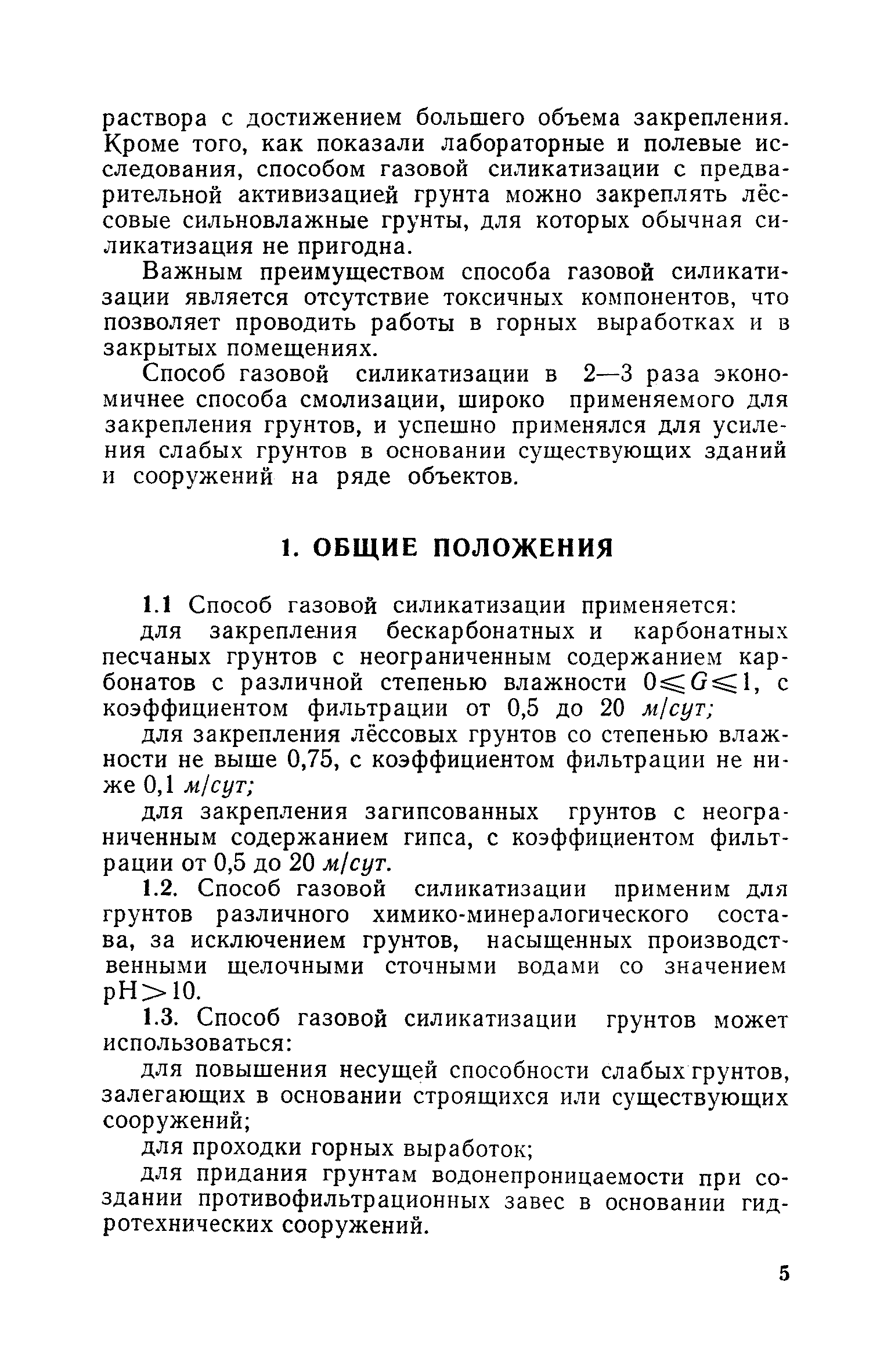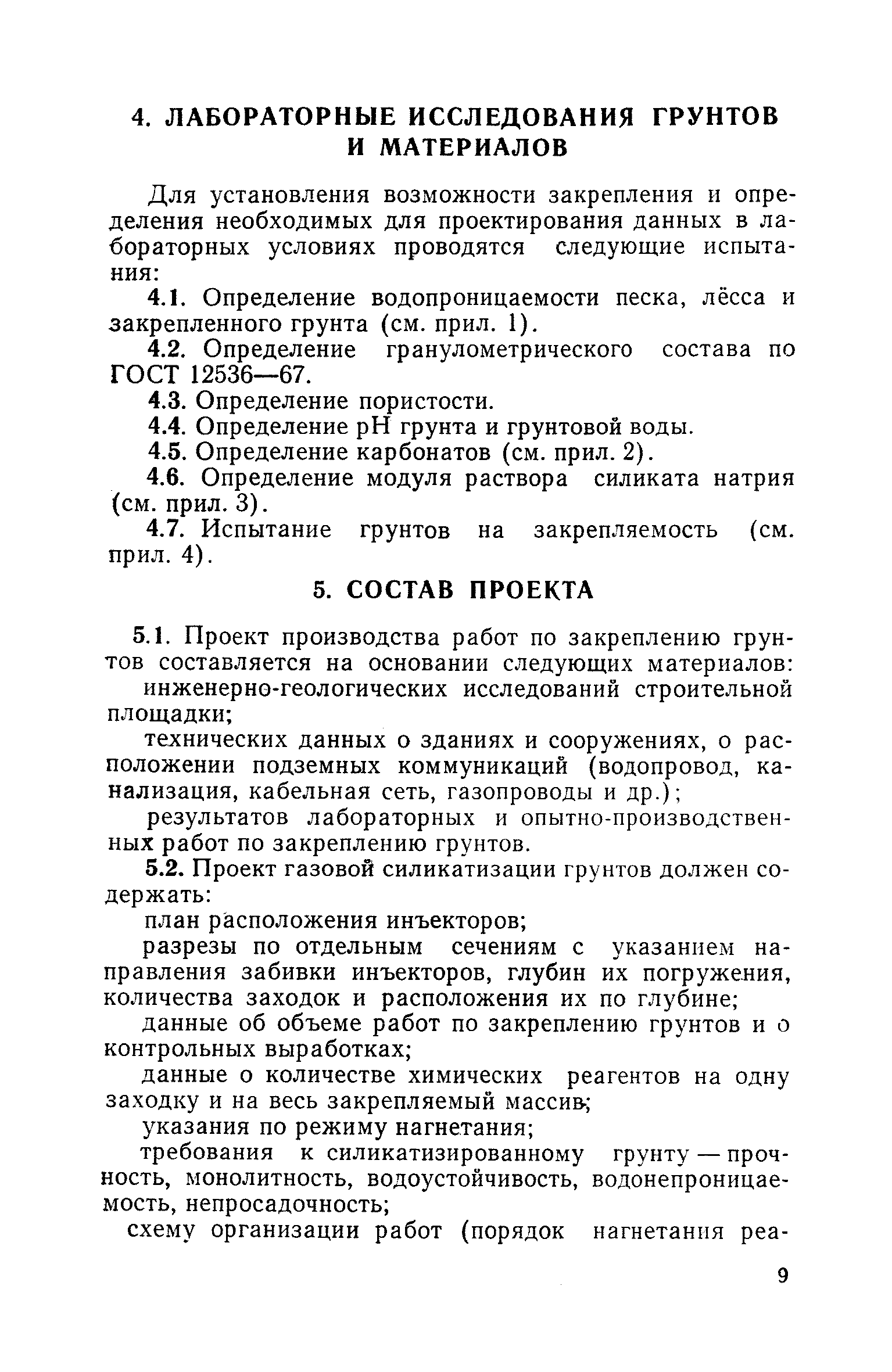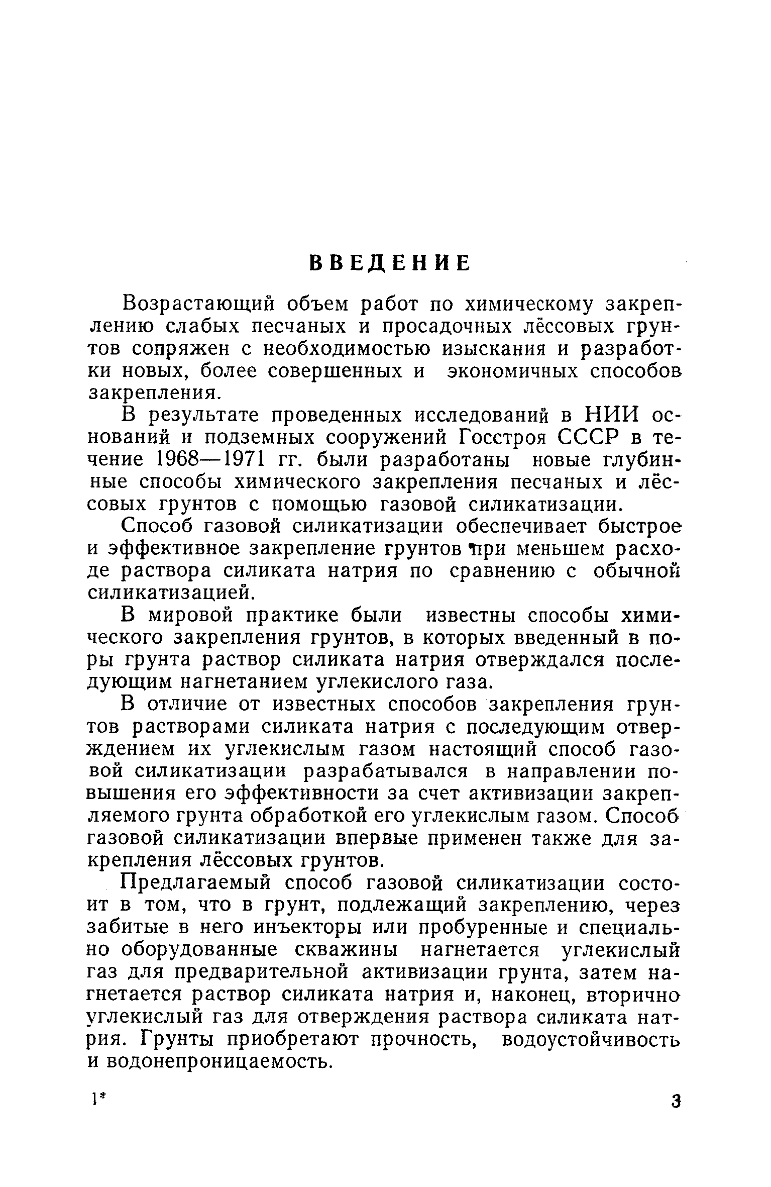 | Оглавление: | Введение 1. Общие положения 2. Материалы 3. Изыскательские работы 4. Лабораторные исследования грунтов и материалов 5. Состав проекта Основные указания по проектированию 6. Оборудование 7. Производство работ Погружение и извлечение ннъекторов Нагнетание реагентов Вспомогательные работы 8. Техника безопасности 9. Контроль качества и документация Приложение 1. Определение водопроницаемости песка, лесса и закрепленного грунта Приложение 2. Определение содержания карбонатов в грунтах Приложение 3. Определение модуля раствора силиката натрия Приложение 4. Испытание грунтов на закрепляемость Приложение 5.Отбор и изготовление образцов из закрепленного грунта ненарушенной структуры Приложение 6. Журнал производства работ по газовой силикатизации (форма) Приложение 7. Норма расхода концентрированного силикатного раствора на закрепление 1 м3 грунта |