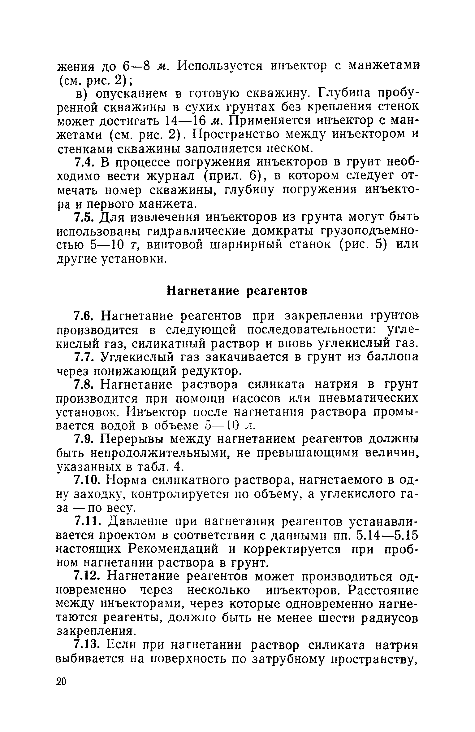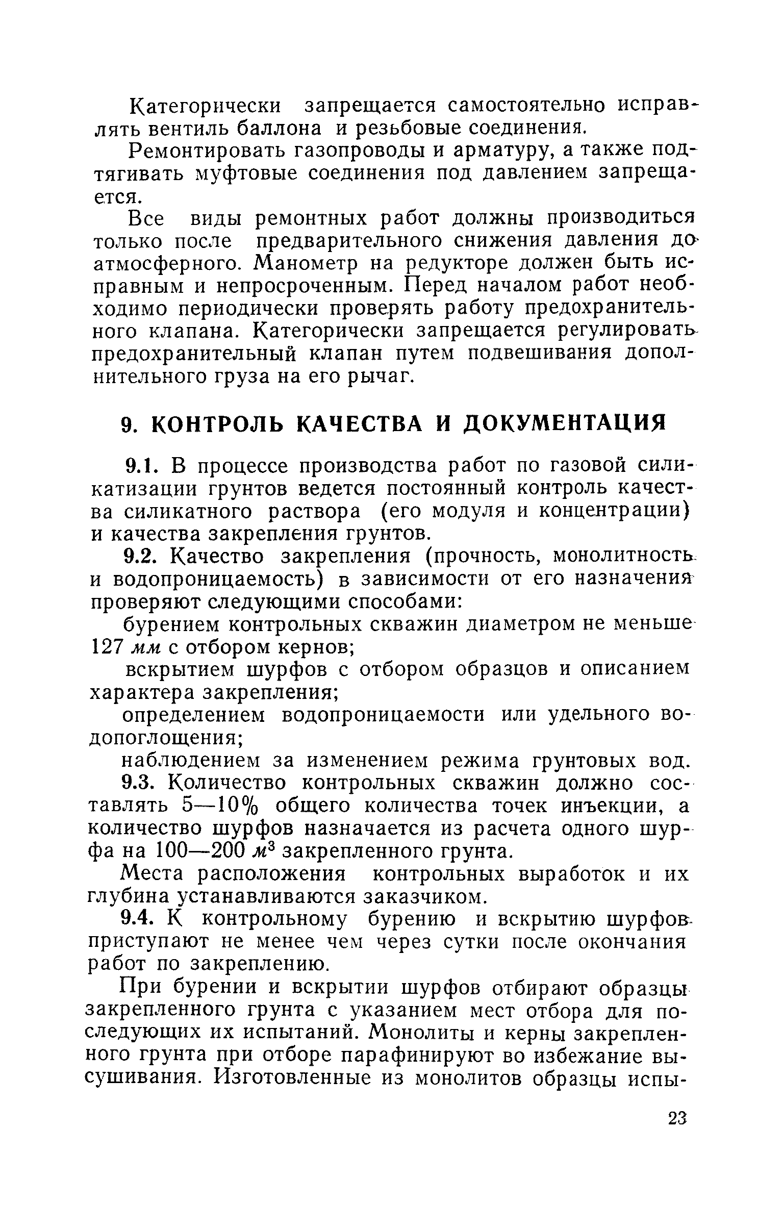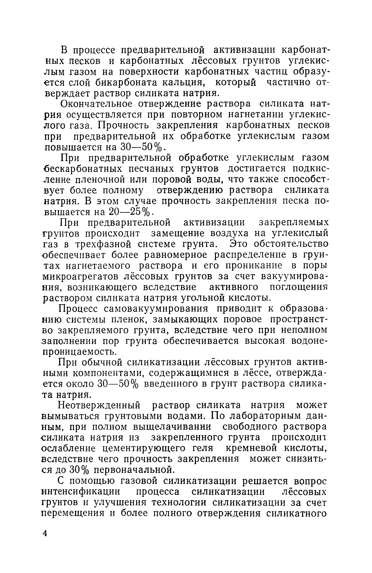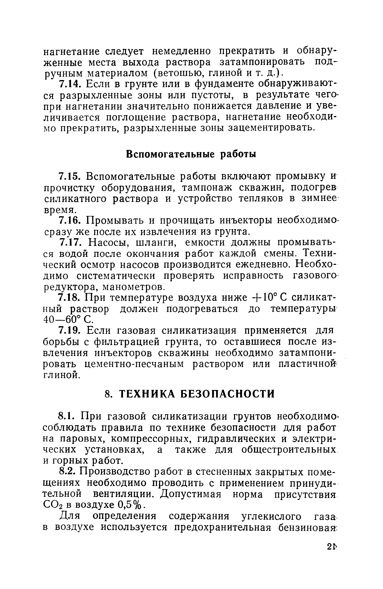 | Оглавление: | Введение 1. Общие положения 2. Материалы 3. Изыскательские работы 4. Лабораторные исследования грунтов и материалов 5. Состав проекта Основные указания по проектированию 6. Оборудование 7. Производство работ Погружение и извлечение ннъекторов Нагнетание реагентов Вспомогательные работы 8. Техника безопасности 9. Контроль качества и документация Приложение 1. Определение водопроницаемости песка, лесса и закрепленного грунта Приложение 2. Определение содержания карбонатов в грунтах Приложение 3. Определение модуля раствора силиката натрия Приложение 4. Испытание грунтов на закрепляемость Приложение 5.Отбор и изготовление образцов из закрепленного грунта ненарушенной структуры Приложение 6. Журнал производства работ по газовой силикатизации (форма) Приложение 7. Норма расхода концентрированного силикатного раствора на закрепление 1 м3 грунта |