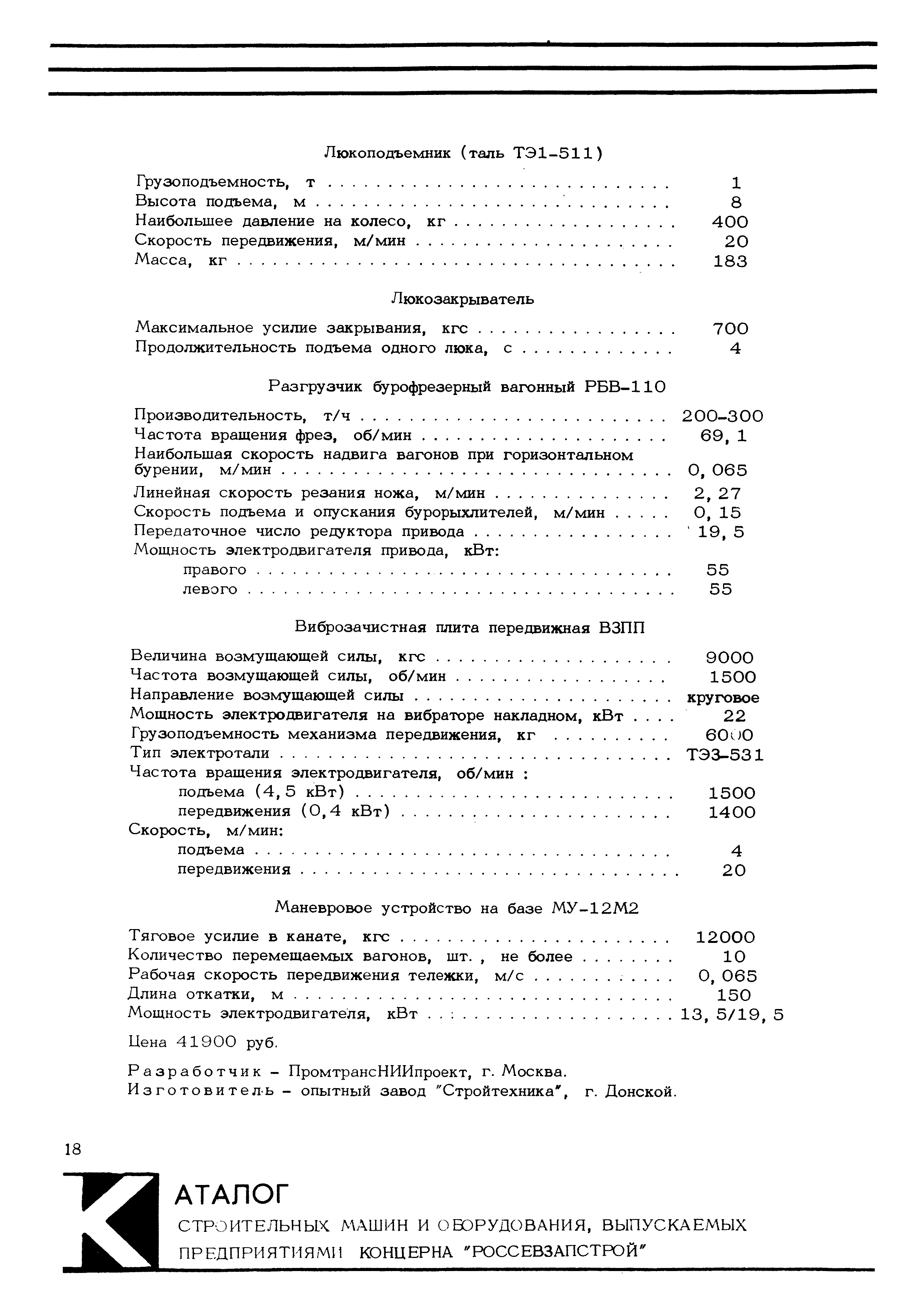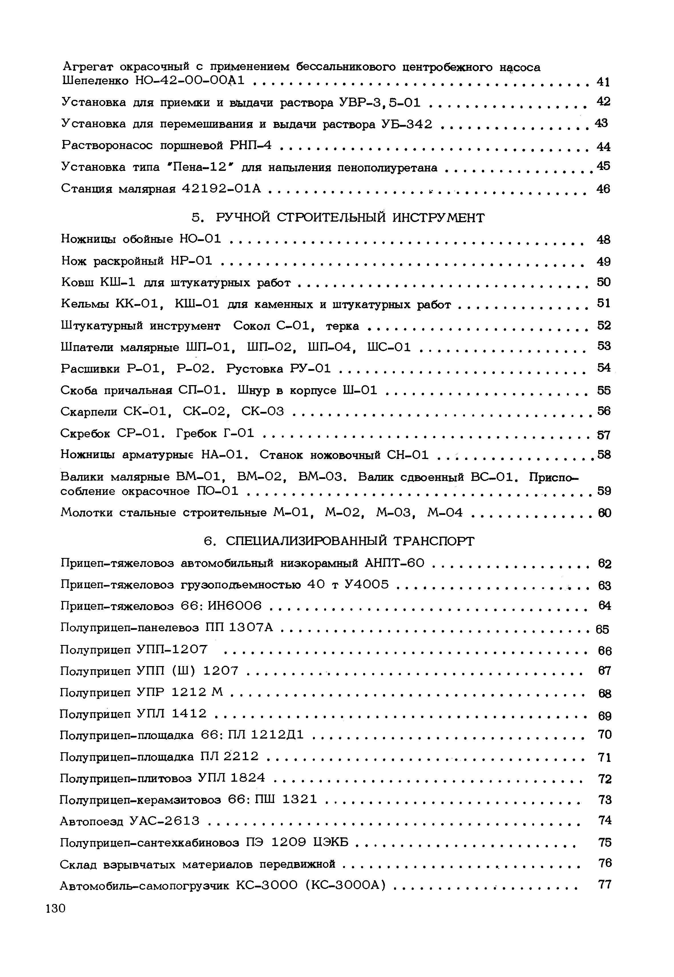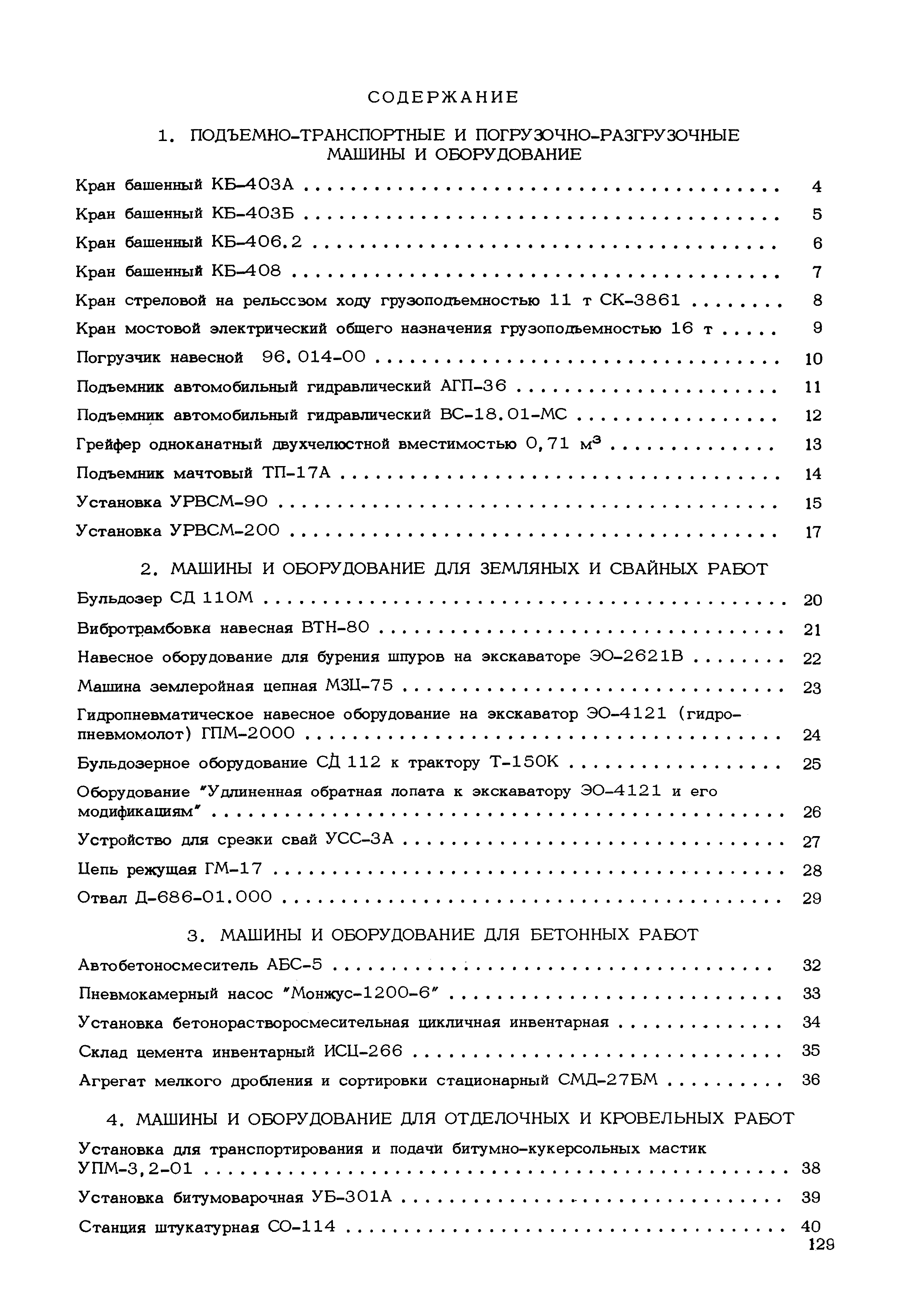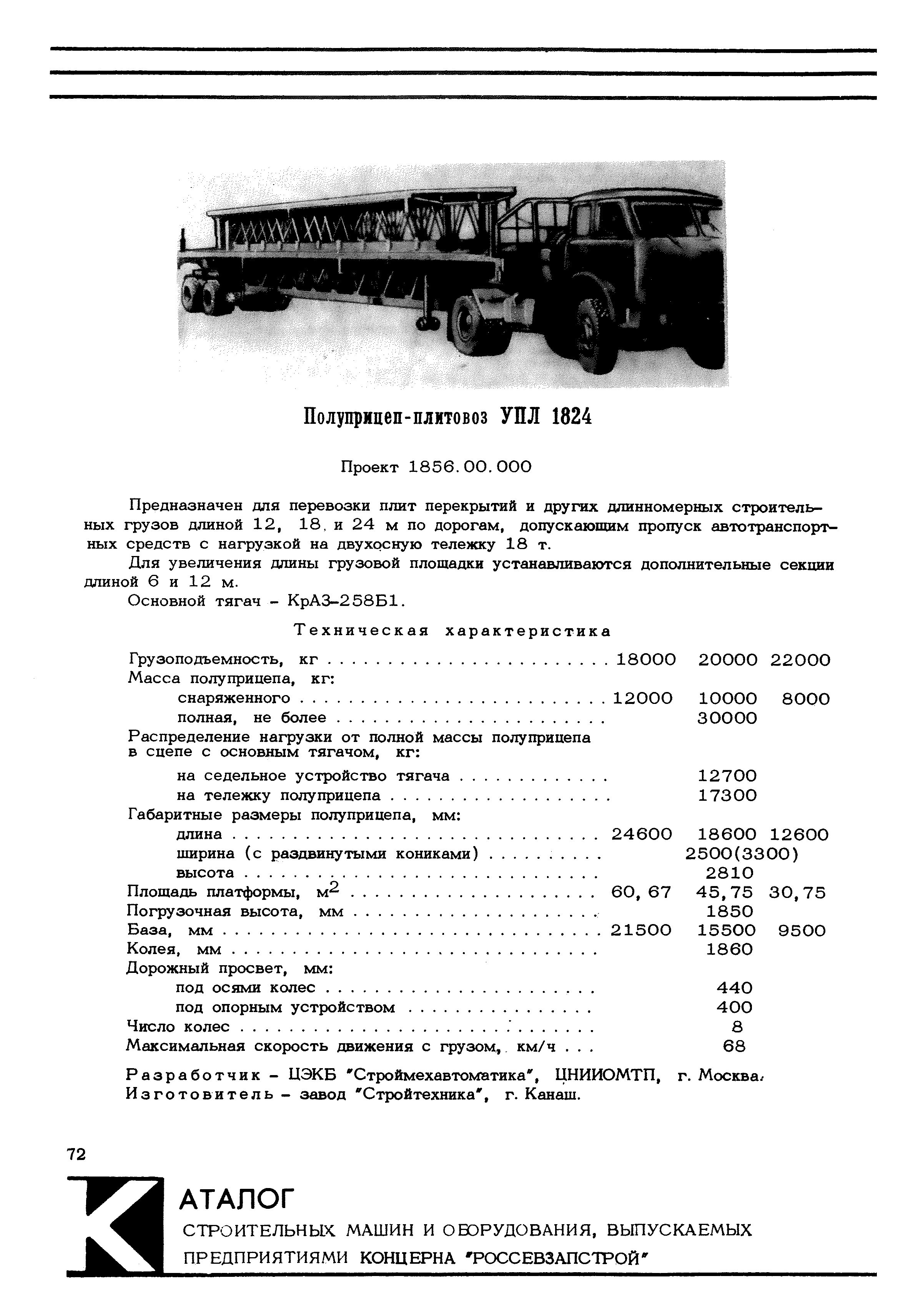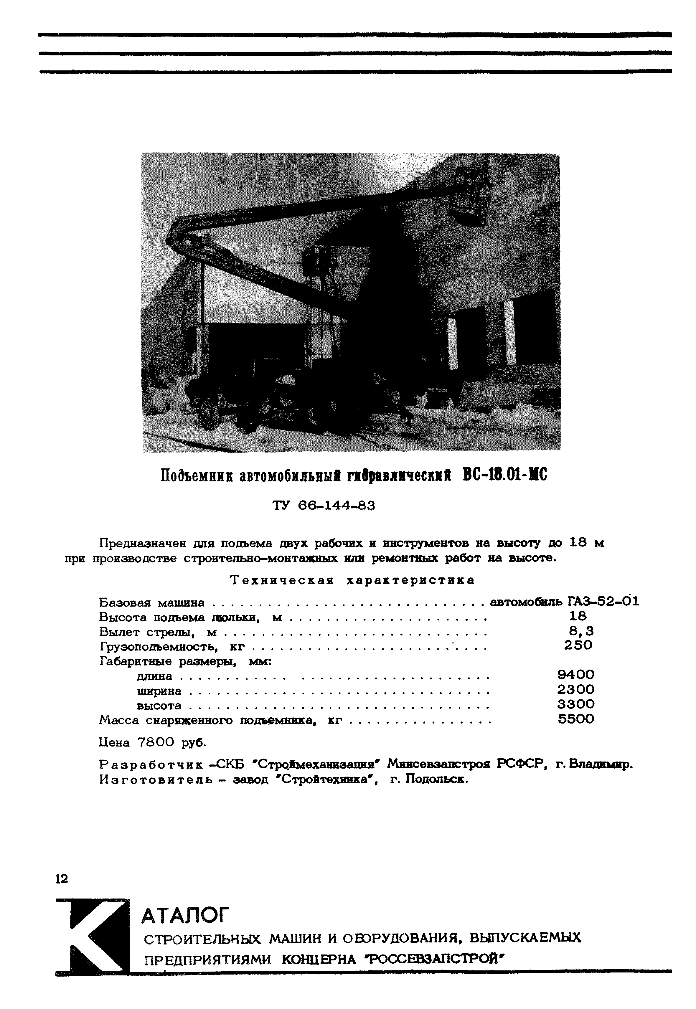 Каталог строительных машин и оборудования, выпускаемых предприятиями концерна "Россевзапстрой"| Статус: | справочные материалы, мп, тпр | | Название рус.: | Каталог строительных машин и оборудования, выпускаемых предприятиями концерна "Россевзапстрой" | | Дата добавления в базу: | 12.02.2016 | | Дата актуализации: | 01.01.2021 | | Оглавление: | 1 Подъемно-транспортные и погрузочно0разгрузочные машины и оборудование Кран башенный КБ—403А Кран башенный КБ-403Б Кран башенный КБ—406.2 Кран башенный КБ—408 Кран стреловой на рельсовом ходу грузоподъемностью 11т СК—З 861 Кран мостовой электрический общего назначения грузоподъемностью 16 т Погрузчик навесной 96,014—00 Подъёмник автомобильный гидравлический АГП—36 Подъемник автомобильный гидравлический ВС—18,01—МС Грейфер одноканатный двухчелюстной вместимостью 0,71 м3 Подъемник мачтовый ТП—17А Установка УРВСМ-90 Установка УРВСМ-200 2. Машины и оборудование для земляных и свайных работ Бульдозер СД 11ОМ Вибротрамбовка навесная ВТН—80 Навесное оборудование для бурения шнуров на экскаваторе ЭО—262 1В Машина землеройная цепная МЗЦ—75 Гидропневматическое навесное оборудование на экскаватор ЭО—4121 (гидропневмомолот) ГПМ—2000 Бульдозерное оборудование СД 112 к трактору Т—150К Оборудование "Удлиненная обратная лопата к экскаватору ЭО—4121 и его модификациями" Устройство для срезки свай УСС—ЗА Цепь режущая ГМ—17 Отвал Д-686-01.000 3. Машины и оборудование для бетонных работ Автобетоносмеситель АБС—5 Пневмокамерный насос "Монжус—1200—6" Установка бетонорастворосмесительная цикличная инвентарная Склад цемента инвентарный ИСП—266 Агрегат мелкого дробления и сортировки стационарный СМД—27БМ 4. Машины и оборудование для отделочных и кровельных работ Установка для транспортирования и подачи битумно—кукерсольных мастик УПМ-3,2-01 Установка битумоварочная УБ-З01А Станция штукатурная СО-114 Агрегат окрасочных с применением бессальникового центробежного насоса Шепеленко Н0—42—00—001 Установка для приемки и выдачи раствора УВР—3,5—01 Установка для перемешивания и выдачи раствора УБ—342 Растворонасос поршневой РНП—4 Установка типа "Пена—12" для напыления пенополиуретана Станция малярная 42192—01А 5. Ручной строительный инструмент Ножницы обойные Н0-01 Нож раскройный НР—01 Ковш КШ—1 для штукатурных работ Кельмы КК—01, КШ—01 для каменных и штукатурных работ Штукатурный инструмент Сокол С—01, терка Шпатели малярные ШП-01, ШП-02, ШП-04, ШС-01 Расшивки Р—01, Р—02. Рустовка РУ—01 Скоба причальная СП—01. Шнур в корпусе Ш—01 Скарпели СК-01, СК-02, СК-03 Скребок СР—01. Гребок Г—01 Ножницы арматурные НА—01. Станок ножовочный СН—01 Валики малярные ВМ-01, ВМ-02, ВМ-0З. Валик сдвоенный ВС-01. Приспособление окрасочное П0—01 Молотки стальные строительные М—01, М—02, М—0З, М—04 6. Специализированный транспорт Прицеп—тяжеловоз автомобильный низкорамный АНПТ—60 Прицеп—тяжеловоз грузоподъемностью 40 т У4005 Прицеп-тяжеловоз 66: ИН6006 Полуприцеп—панелевоз ПП 1307А Полуприцеп УПП—1207 Полуприцеп УПП (Ш) 1207 Полуприцеп УПР 1212 М Полуприцеп УПЛ 1412 Полуприцеп—площадка 66: ПЛ 1212Д1 Полуприцеп—площадка ПЛ 2212 Полуприцеп—плитовоз УПЛ 1824 Полуприцеп—керамзитовоз 66: ПШ 1321 Автопоезд УАС—2613 Полуприцеп—сантехкабиновоз ПЭ 1209 ЦЭКБ Склад взрывчатых материалов передвижной Автомобиль-самопогрузчик КС-3000 (КС-3000А) Самосвал малогабаритный СМ—1500 Самосвал малогабаритный СМ—1100 ПГ Автошпаклевоз 66: ЦЯ 0