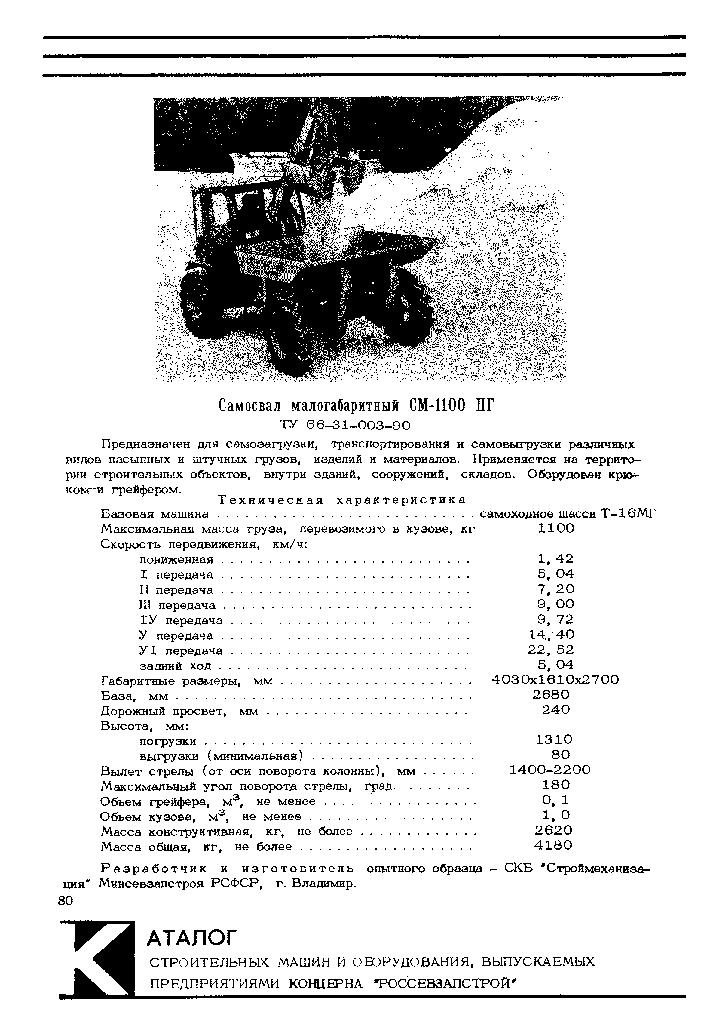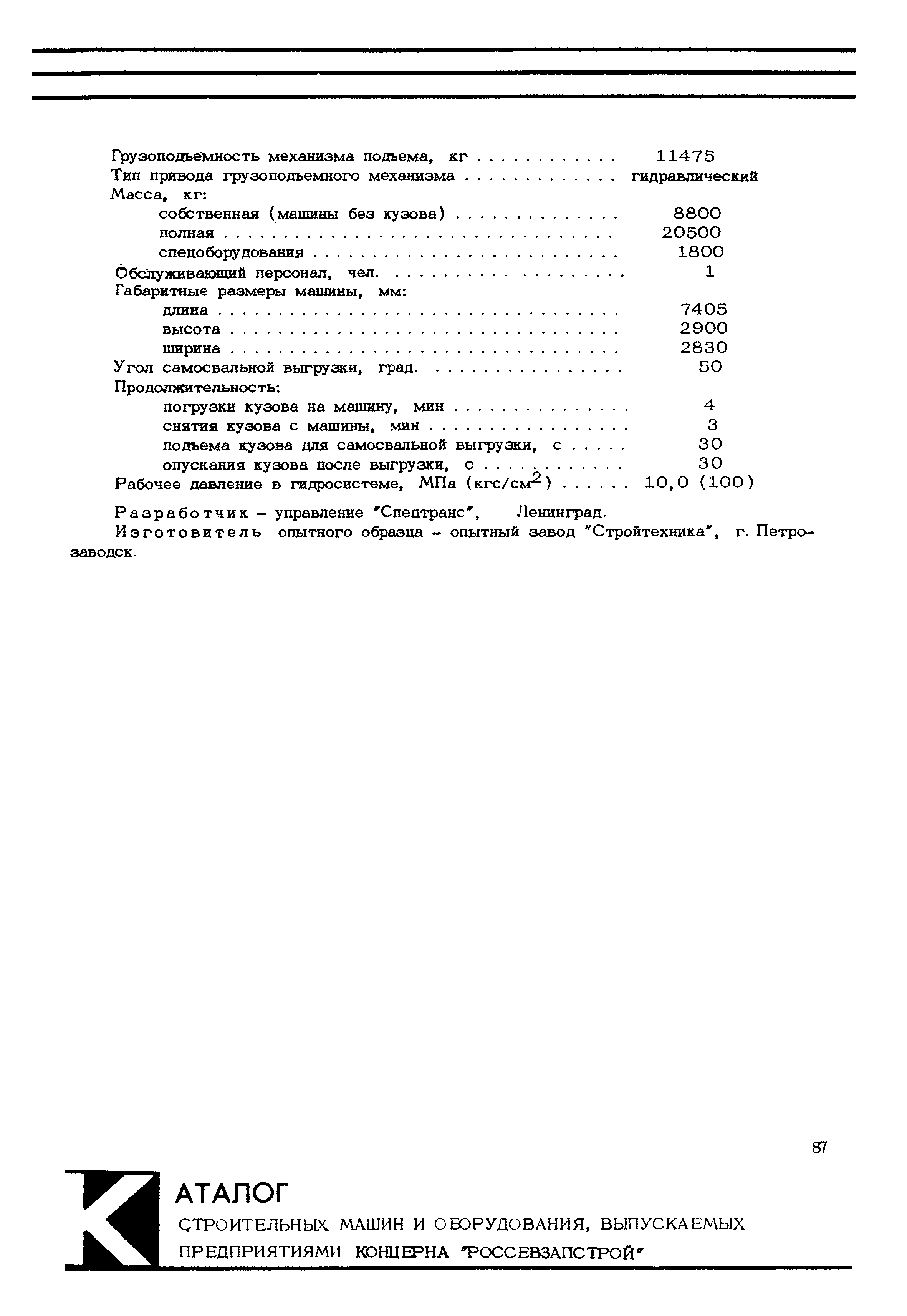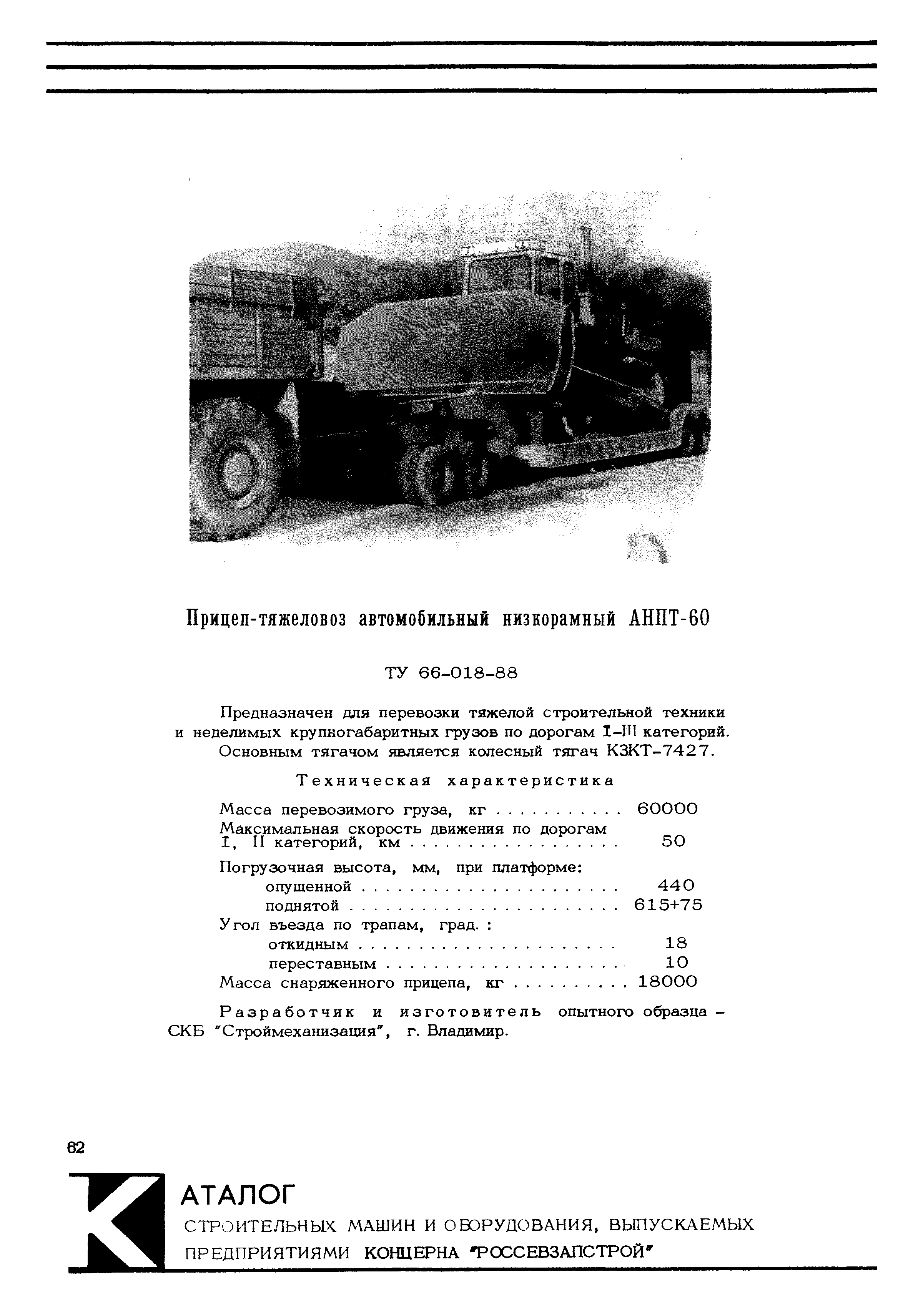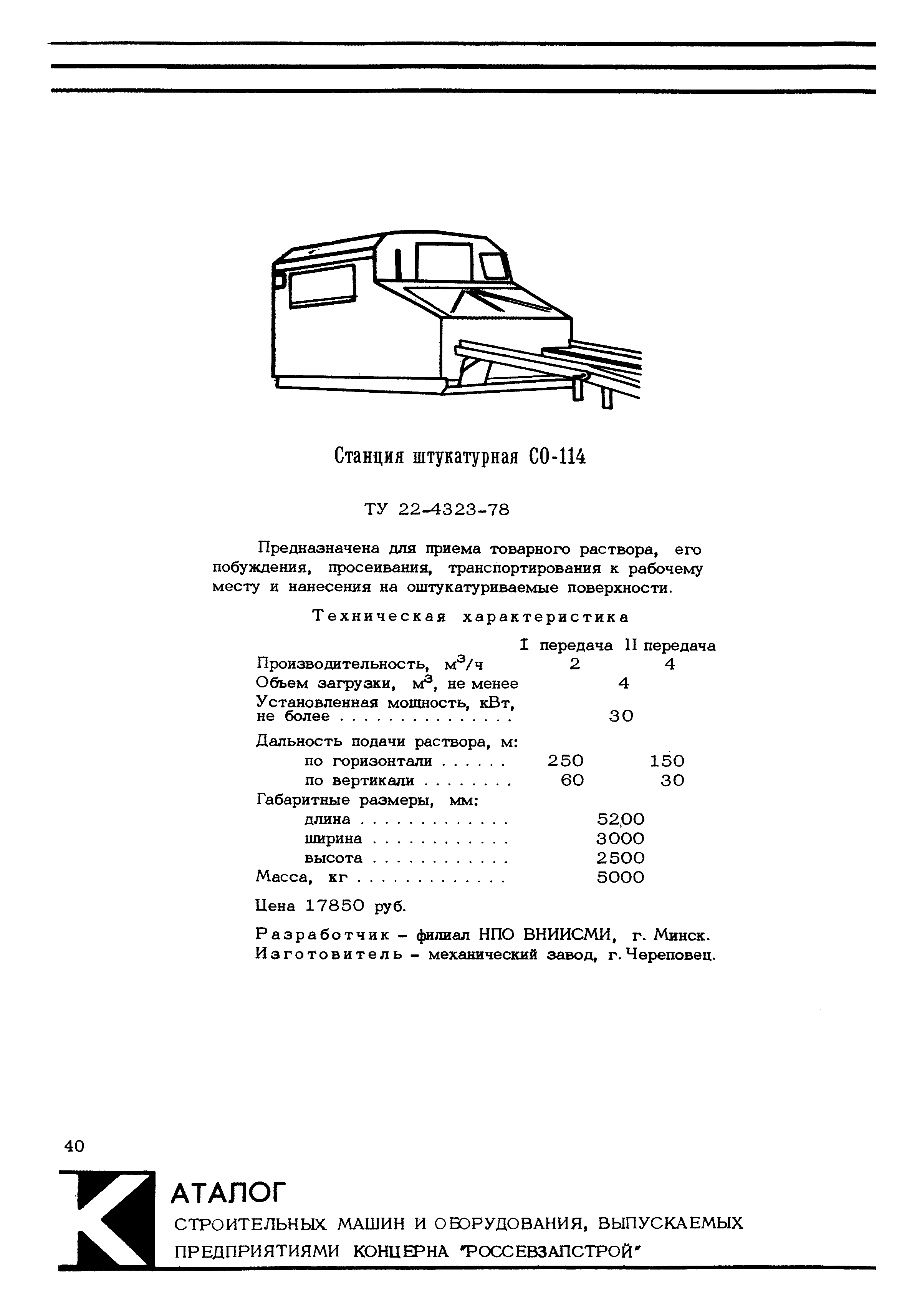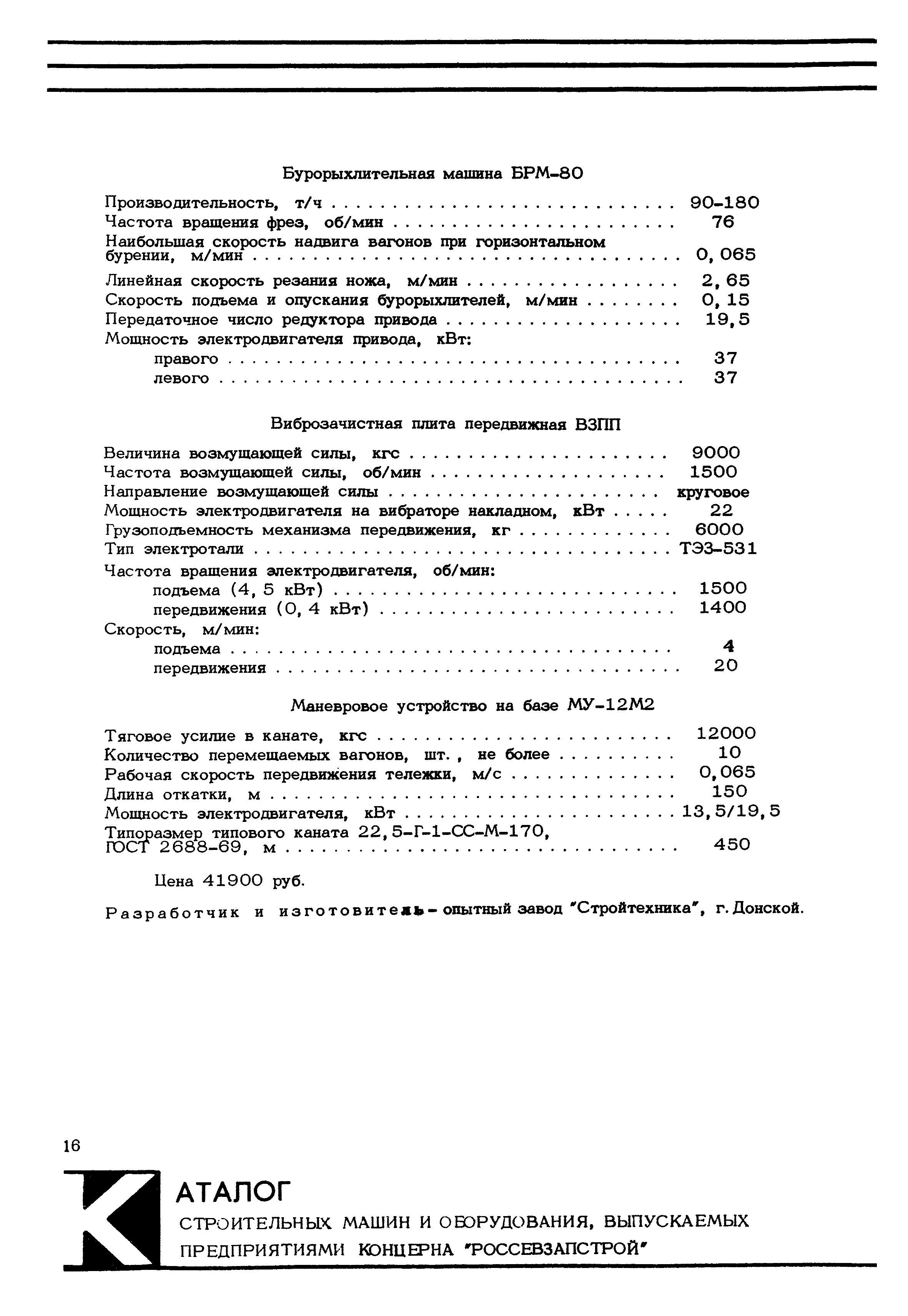 Каталог строительных машин и оборудования, выпускаемых предприятиями концерна "Россевзапстрой"| Статус: | справочные материалы, мп, тпр | | Название рус.: | Каталог строительных машин и оборудования, выпускаемых предприятиями концерна "Россевзапстрой" | | Дата добавления в базу: | 12.02.2016 | | Дата актуализации: | 01.01.2021 | | Оглавление: | 1 Подъемно-транспортные и погрузочно0разгрузочные машины и оборудование Кран башенный КБ—403А Кран башенный КБ-403Б Кран башенный КБ—406.2 Кран башенный КБ—408 Кран стреловой на рельсовом ходу грузоподъемностью 11т СК—З 861 Кран мостовой электрический общего назначения грузоподъемностью 16 т Погрузчик навесной 96,014—00 Подъёмник автомобильный гидравлический АГП—36 Подъемник автомобильный гидравлический ВС—18,01—МС Грейфер одноканатный двухчелюстной вместимостью 0,71 м3 Подъемник мачтовый ТП—17А Установка УРВСМ-90 Установка УРВСМ-200 2. Машины и оборудование для земляных и свайных работ Бульдозер СД 11ОМ Вибротрамбовка навесная ВТН—80 Навесное оборудование для бурения шнуров на экскаваторе ЭО—262 1В Машина землеройная цепная МЗЦ—75 Гидропневматическое навесное оборудование на экскаватор ЭО—4121 (гидропневмомолот) ГПМ—2000 Бульдозерное оборудование СД 112 к трактору Т—150К Оборудование "Удлиненная обратная лопата к экскаватору ЭО—4121 и его модификациями" Устройство для срезки свай УСС—ЗА Цепь режущая ГМ—17 Отвал Д-686-01.000 3. Машины и оборудование для бетонных работ Автобетоносмеситель АБС—5 Пневмокамерный насос "Монжус—1200—6" Установка бетонорастворосмесительная цикличная инвентарная Склад цемента инвентарный ИСП—266 Агрегат мелкого дробления и сортировки стационарный СМД—27БМ 4. Машины и оборудование для отделочных и кровельных работ Установка для транспортирования и подачи битумно—кукерсольных мастик УПМ-3,2-01 Установка битумоварочная УБ-З01А Станция штукатурная СО-114 Агрегат окрасочных с применением бессальникового центробежного насоса Шепеленко Н0—42—00—001 Установка для приемки и выдачи раствора УВР—3,5—01 Установка для перемешивания и выдачи раствора УБ—342 Растворонасос поршневой РНП—4 Установка типа "Пена—12" для напыления пенополиуретана Станция малярная 42192—01А 5. Ручной строительный инструмент Ножницы обойные Н0-01 Нож раскройный НР—01 Ковш КШ—1 для штукатурных работ Кельмы КК—01, КШ—01 для каменных и штукатурных работ Штукатурный инструмент Сокол С—01, терка Шпатели малярные ШП-01, ШП-02, ШП-04, ШС-01 Расшивки Р—01, Р—02. Рустовка РУ—01 Скоба причальная СП—01. Шнур в корпусе Ш—01 Скарпели СК-01, СК-02, СК-03 Скребок СР—01. Гребок Г—01 Ножницы арматурные НА—01. Станок ножовочный СН—01 Валики малярные ВМ-01, ВМ-02, ВМ-0З. Валик сдвоенный ВС-01. Приспособление окрасочное П0—01 Молотки стальные строительные М—01, М—02, М—0З, М—04 6. Специализированный транспорт Прицеп—тяжеловоз автомобильный низкорамный АНПТ—60 Прицеп—тяжеловоз грузоподъемностью 40 т У4005 Прицеп-тяжеловоз 66: ИН6006 Полуприцеп—панелевоз ПП 1307А Полуприцеп УПП—1207 Полуприцеп УПП (Ш) 1207 Полуприцеп УПР 1212 М Полуприцеп УПЛ 1412 Полуприцеп—площадка 66: ПЛ 1212Д1 Полуприцеп—площадка ПЛ 2212 Полуприцеп—плитовоз УПЛ 1824 Полуприцеп—керамзитовоз 66: ПШ 1321 Автопоезд УАС—2613 Полуприцеп—сантехкабиновоз ПЭ 1209 ЦЭКБ Склад взрывчатых материалов передвижной Автомобиль-самопогрузчик КС-3000 (КС-3000А) Самосвал малогабаритный СМ—1500 Самосвал малогабаритный СМ—1100 ПГ Автошпаклевоз 66: ЦЯ 0