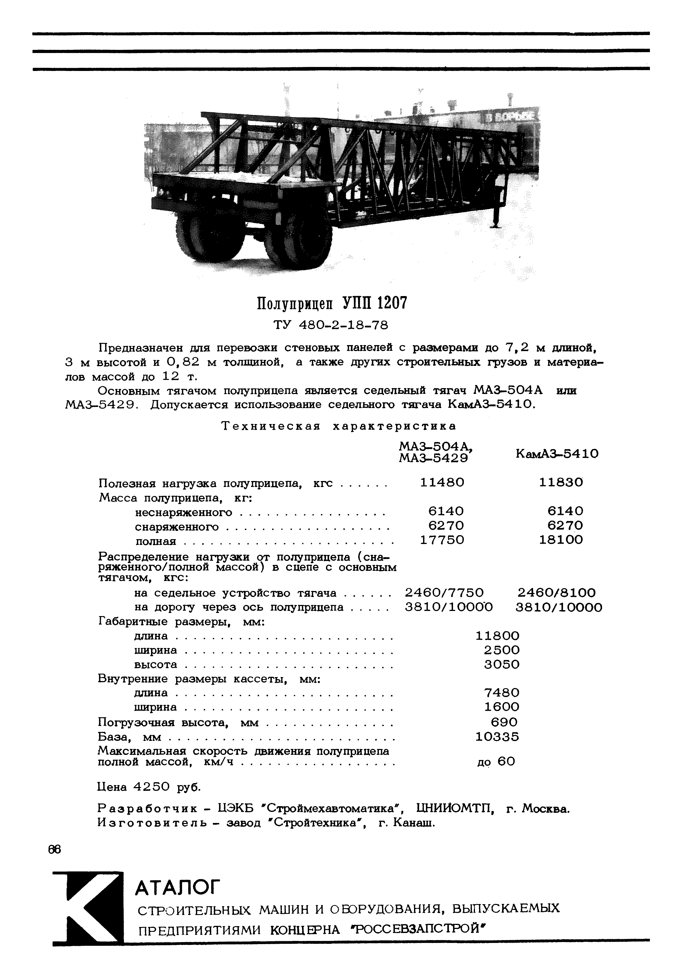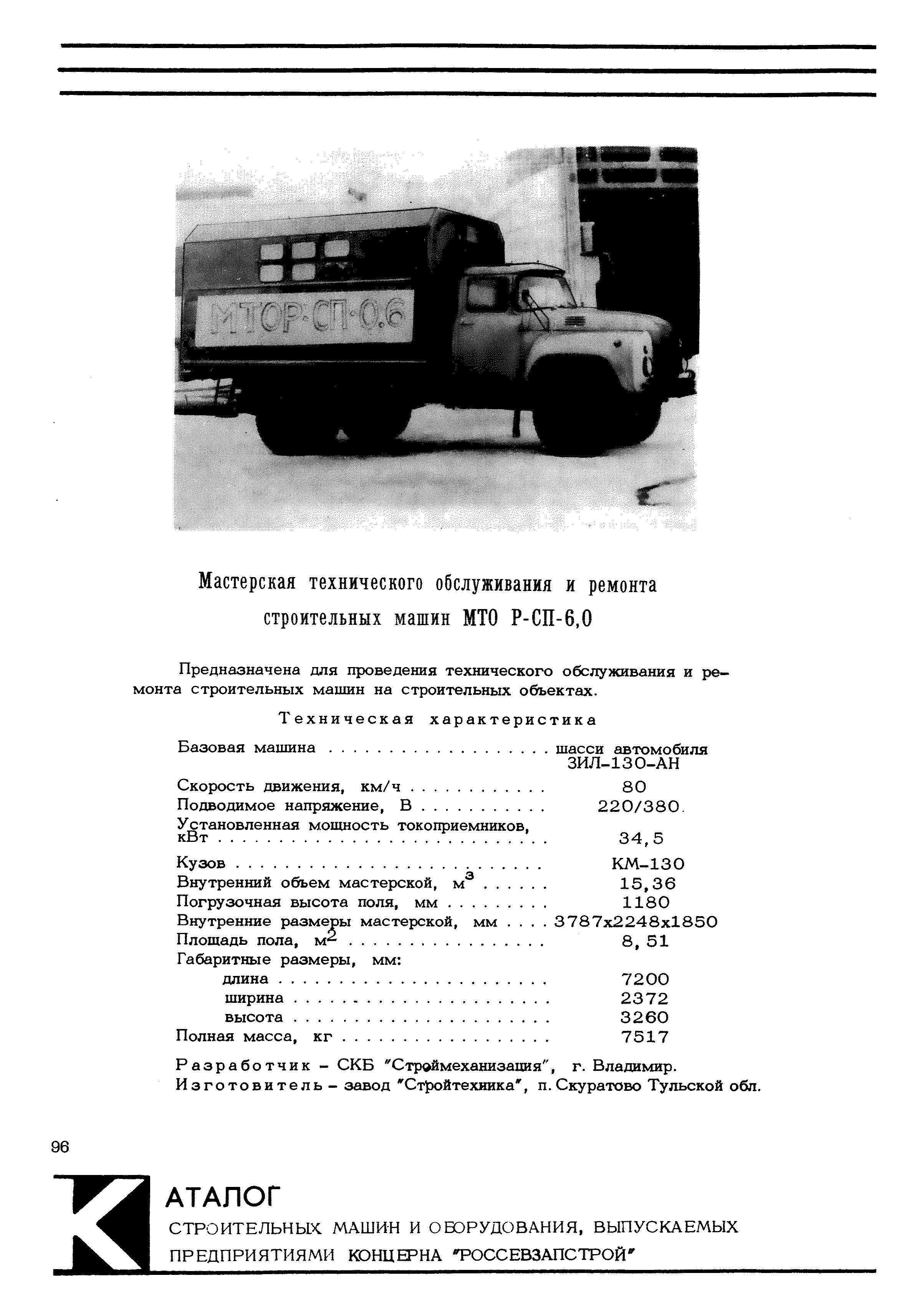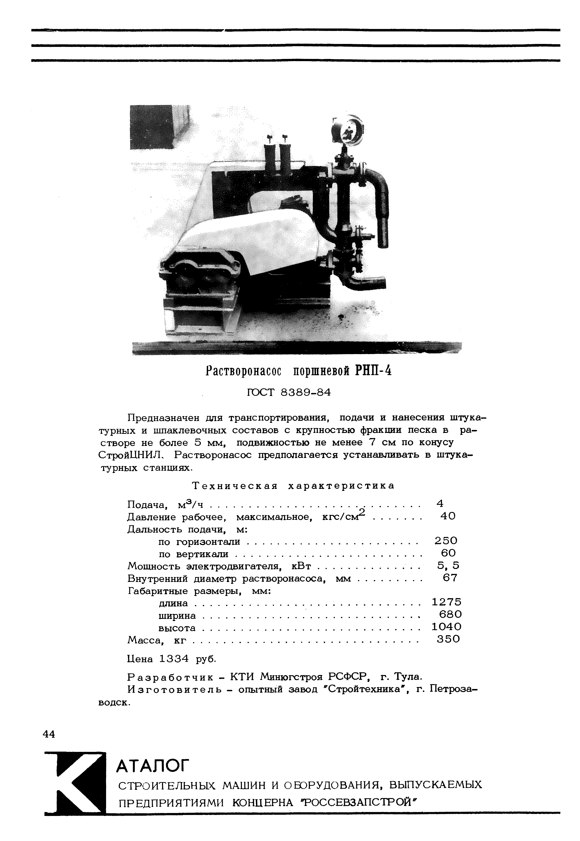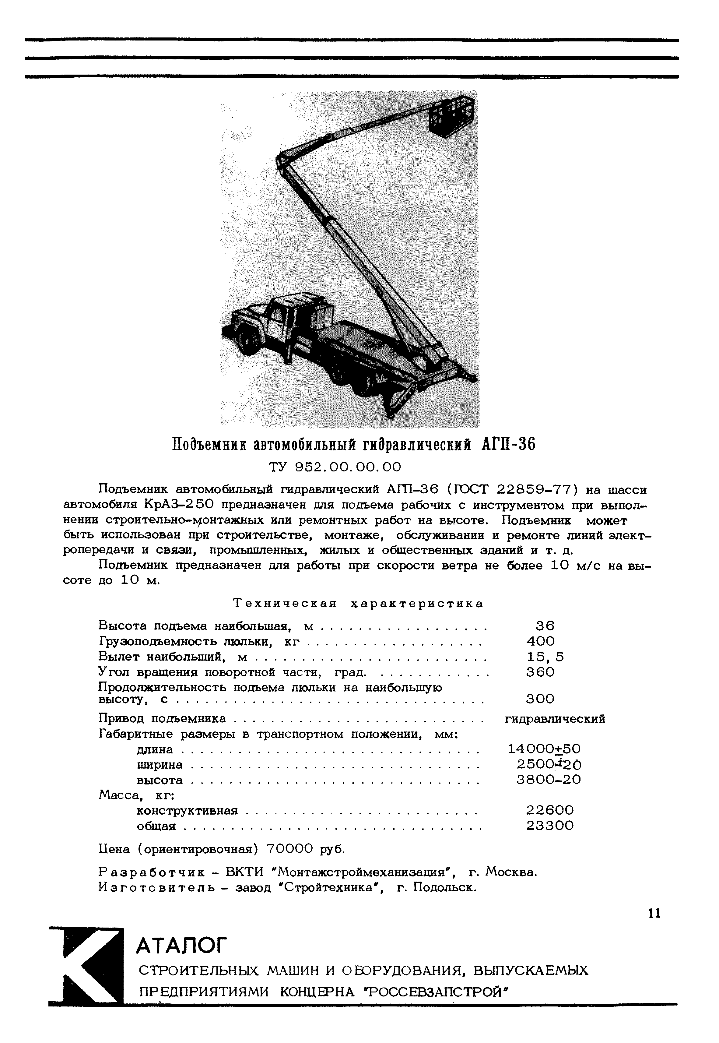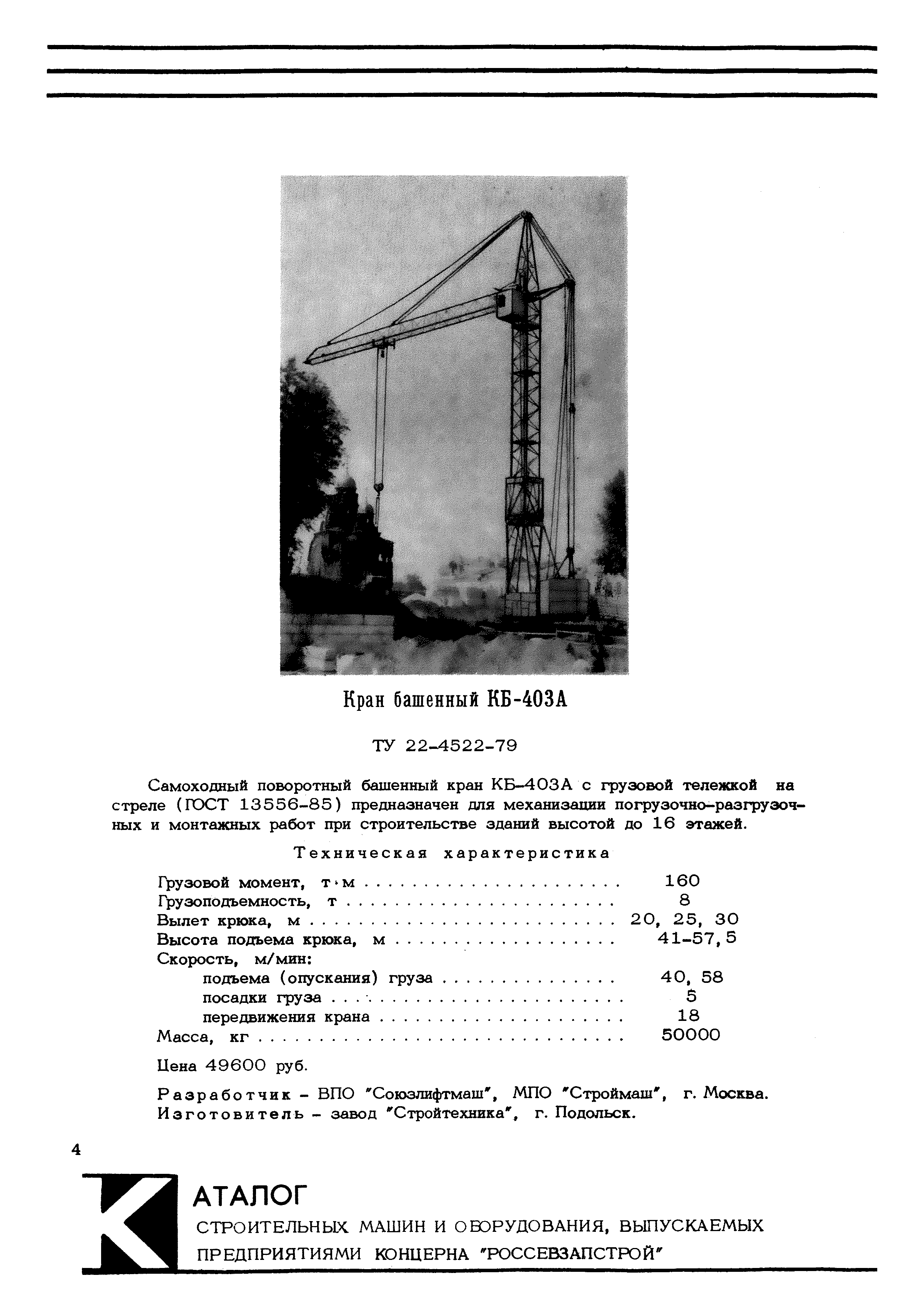 Каталог строительных машин и оборудования, выпускаемых предприятиями концерна "Россевзапстрой"| Статус: | справочные материалы, мп, тпр | | Название рус.: | Каталог строительных машин и оборудования, выпускаемых предприятиями концерна "Россевзапстрой" | | Дата добавления в базу: | 12.02.2016 | | Дата актуализации: | 01.01.2021 | | Оглавление: | 1 Подъемно-транспортные и погрузочно0разгрузочные машины и оборудование Кран башенный КБ—403А Кран башенный КБ-403Б Кран башенный КБ—406.2 Кран башенный КБ—408 Кран стреловой на рельсовом ходу грузоподъемностью 11т СК—З 861 Кран мостовой электрический общего назначения грузоподъемностью 16 т Погрузчик навесной 96,014—00 Подъёмник автомобильный гидравлический АГП—36 Подъемник автомобильный гидравлический ВС—18,01—МС Грейфер одноканатный двухчелюстной вместимостью 0,71 м3 Подъемник мачтовый ТП—17А Установка УРВСМ-90 Установка УРВСМ-200 2. Машины и оборудование для земляных и свайных работ Бульдозер СД 11ОМ Вибротрамбовка навесная ВТН—80 Навесное оборудование для бурения шнуров на экскаваторе ЭО—262 1В Машина землеройная цепная МЗЦ—75 Гидропневматическое навесное оборудование на экскаватор ЭО—4121 (гидропневмомолот) ГПМ—2000 Бульдозерное оборудование СД 112 к трактору Т—150К Оборудование "Удлиненная обратная лопата к экскаватору ЭО—4121 и его модификациями" Устройство для срезки свай УСС—ЗА Цепь режущая ГМ—17 Отвал Д-686-01.000 3. Машины и оборудование для бетонных работ Автобетоносмеситель АБС—5 Пневмокамерный насос "Монжус—1200—6" Установка бетонорастворосмесительная цикличная инвентарная Склад цемента инвентарный ИСП—266 Агрегат мелкого дробления и сортировки стационарный СМД—27БМ 4. Машины и оборудование для отделочных и кровельных работ Установка для транспортирования и подачи битумно—кукерсольных мастик УПМ-3,2-01 Установка битумоварочная УБ-З01А Станция штукатурная СО-114 Агрегат окрасочных с применением бессальникового центробежного насоса Шепеленко Н0—42—00—001 Установка для приемки и выдачи раствора УВР—3,5—01 Установка для перемешивания и выдачи раствора УБ—342 Растворонасос поршневой РНП—4 Установка типа "Пена—12" для напыления пенополиуретана Станция малярная 42192—01А 5. Ручной строительный инструмент Ножницы обойные Н0-01 Нож раскройный НР—01 Ковш КШ—1 для штукатурных работ Кельмы КК—01, КШ—01 для каменных и штукатурных работ Штукатурный инструмент Сокол С—01, терка Шпатели малярные ШП-01, ШП-02, ШП-04, ШС-01 Расшивки Р—01, Р—02. Рустовка РУ—01 Скоба причальная СП—01. Шнур в корпусе Ш—01 Скарпели СК-01, СК-02, СК-03 Скребок СР—01. Гребок Г—01 Ножницы арматурные НА—01. Станок ножовочный СН—01 Валики малярные ВМ-01, ВМ-02, ВМ-0З. Валик сдвоенный ВС-01. Приспособление окрасочное П0—01 Молотки стальные строительные М—01, М—02, М—0З, М—04 6. Специализированный транспорт Прицеп—тяжеловоз автомобильный низкорамный АНПТ—60 Прицеп—тяжеловоз грузоподъемностью 40 т У4005 Прицеп-тяжеловоз 66: ИН6006 Полуприцеп—панелевоз ПП 1307А Полуприцеп УПП—1207 Полуприцеп УПП (Ш) 1207 Полуприцеп УПР 1212 М Полуприцеп УПЛ 1412 Полуприцеп—площадка 66: ПЛ 1212Д1 Полуприцеп—площадка ПЛ 2212 Полуприцеп—плитовоз УПЛ 1824 Полуприцеп—керамзитовоз 66: ПШ 1321 Автопоезд УАС—2613 Полуприцеп—сантехкабиновоз ПЭ 1209 ЦЭКБ Склад взрывчатых материалов передвижной Автомобиль-самопогрузчик КС-3000 (КС-3000А) Самосвал малогабаритный СМ—1500 Самосвал малогабаритный СМ—1100 ПГ Автошпаклевоз 66: ЦЯ 0