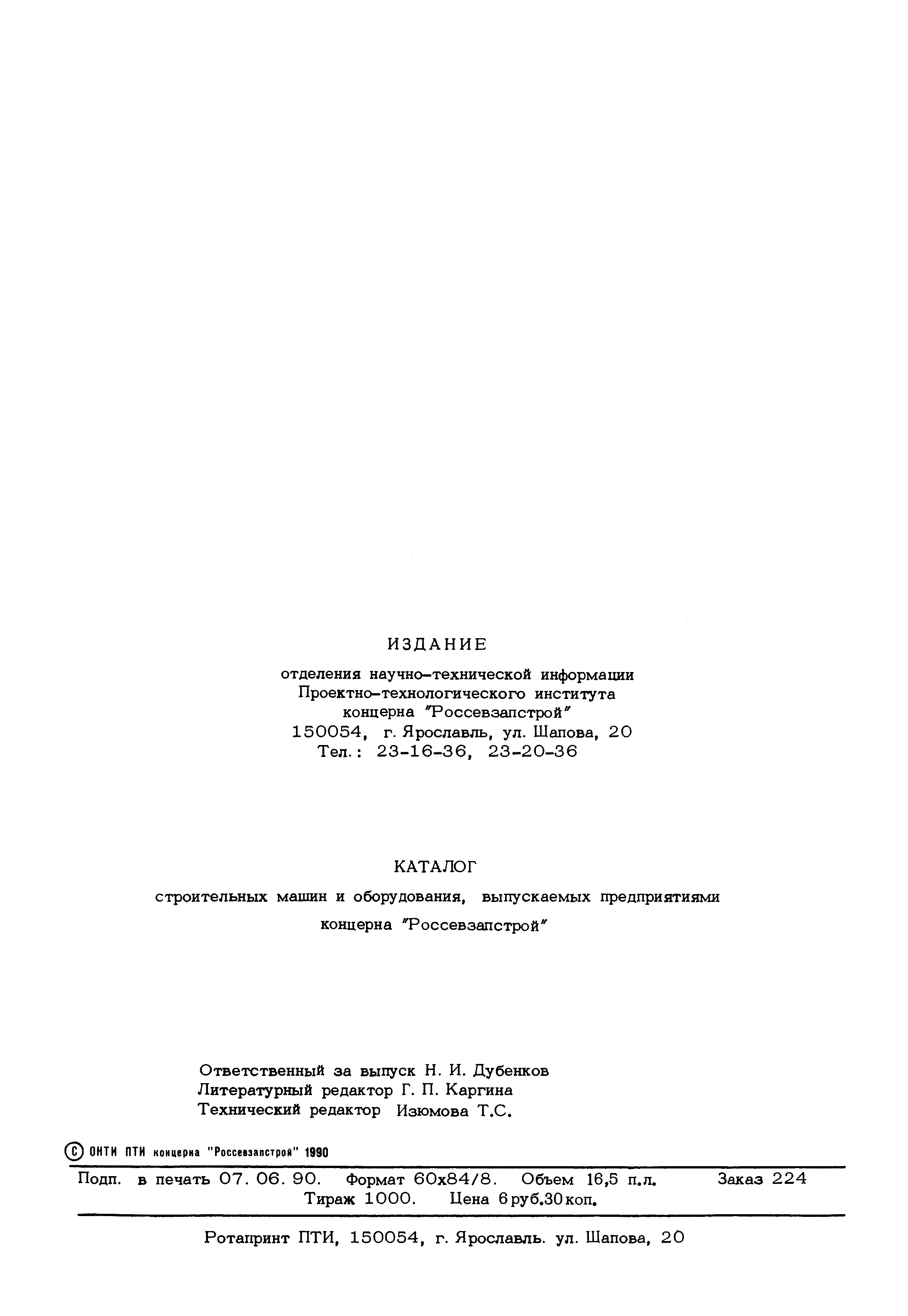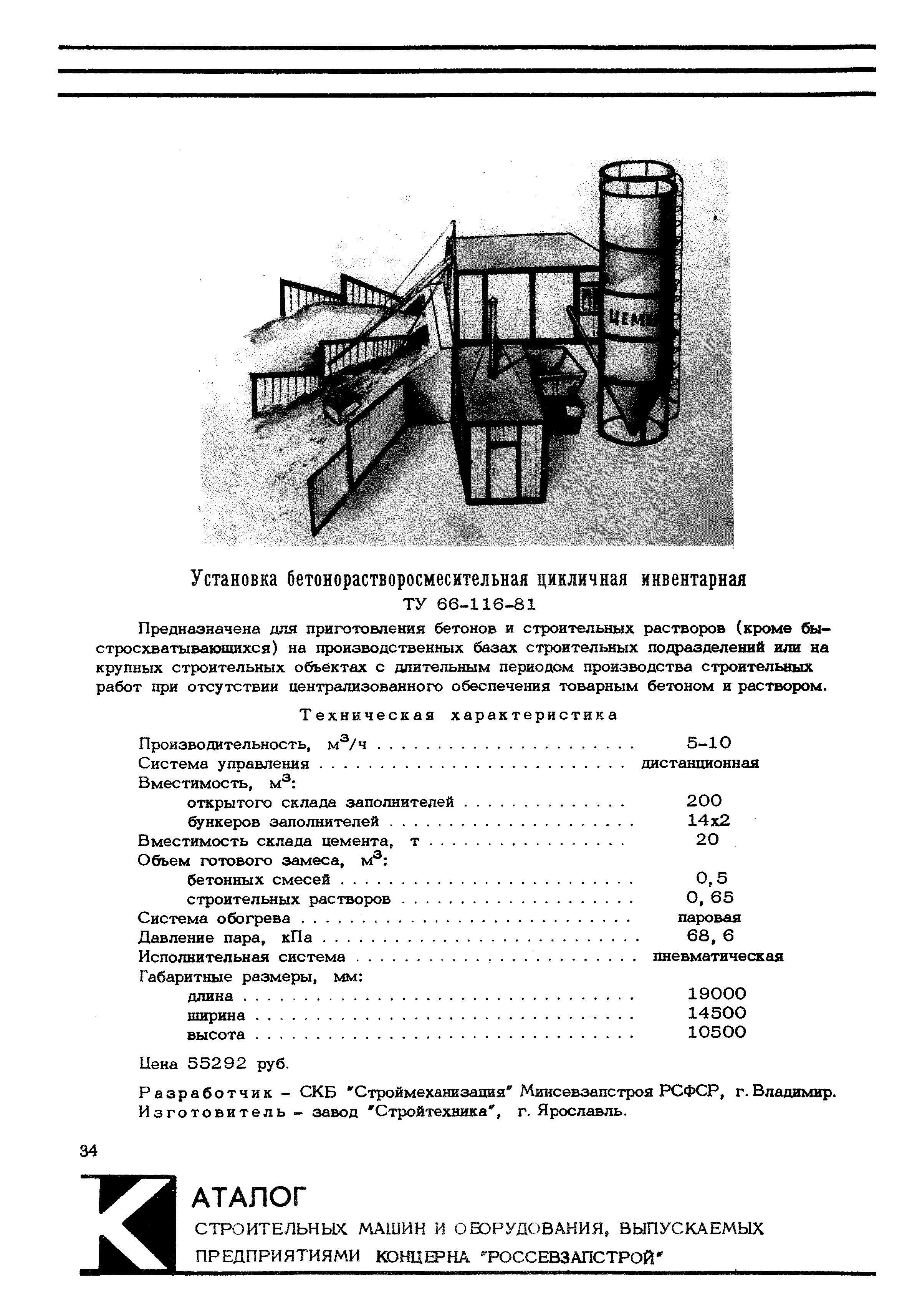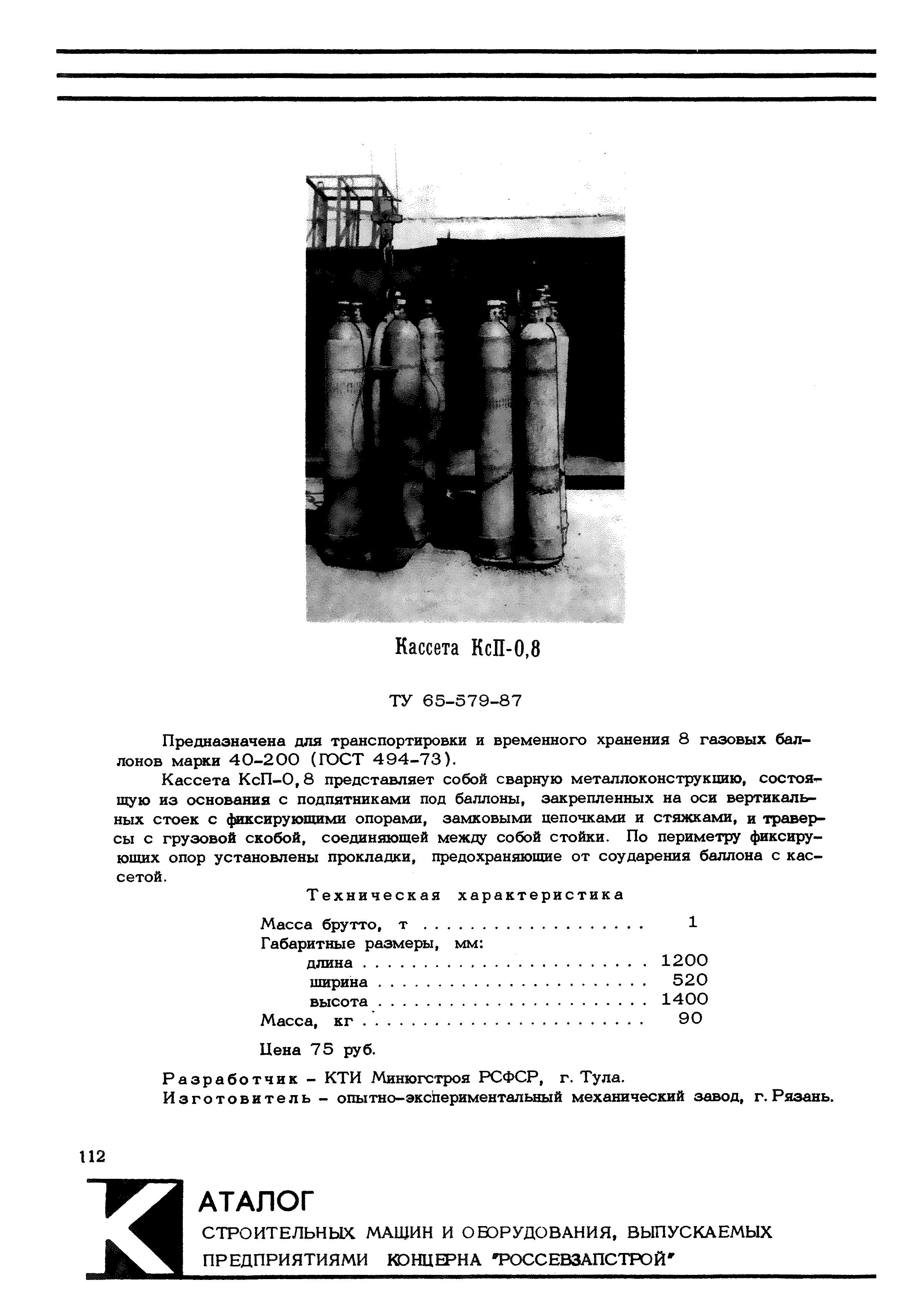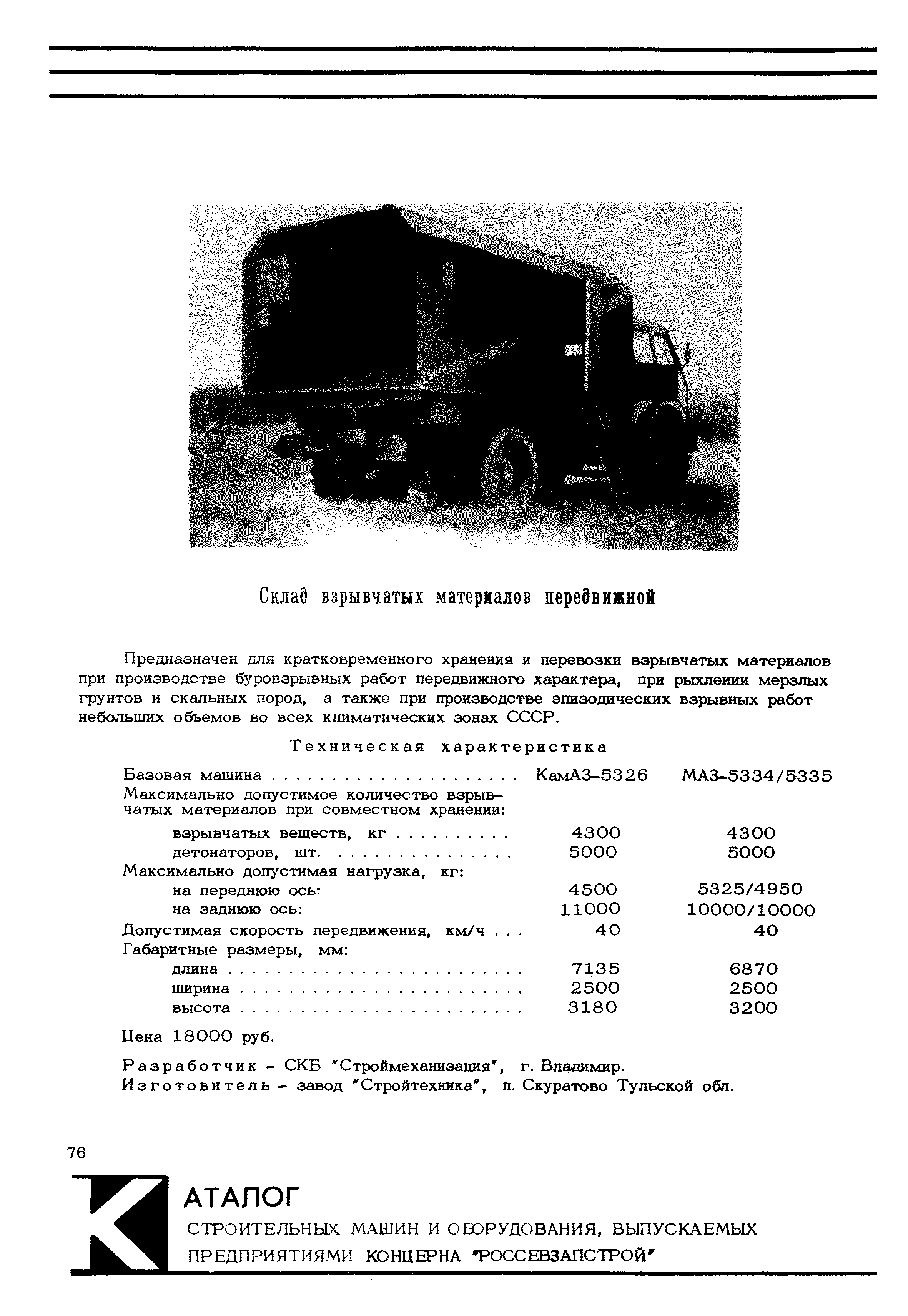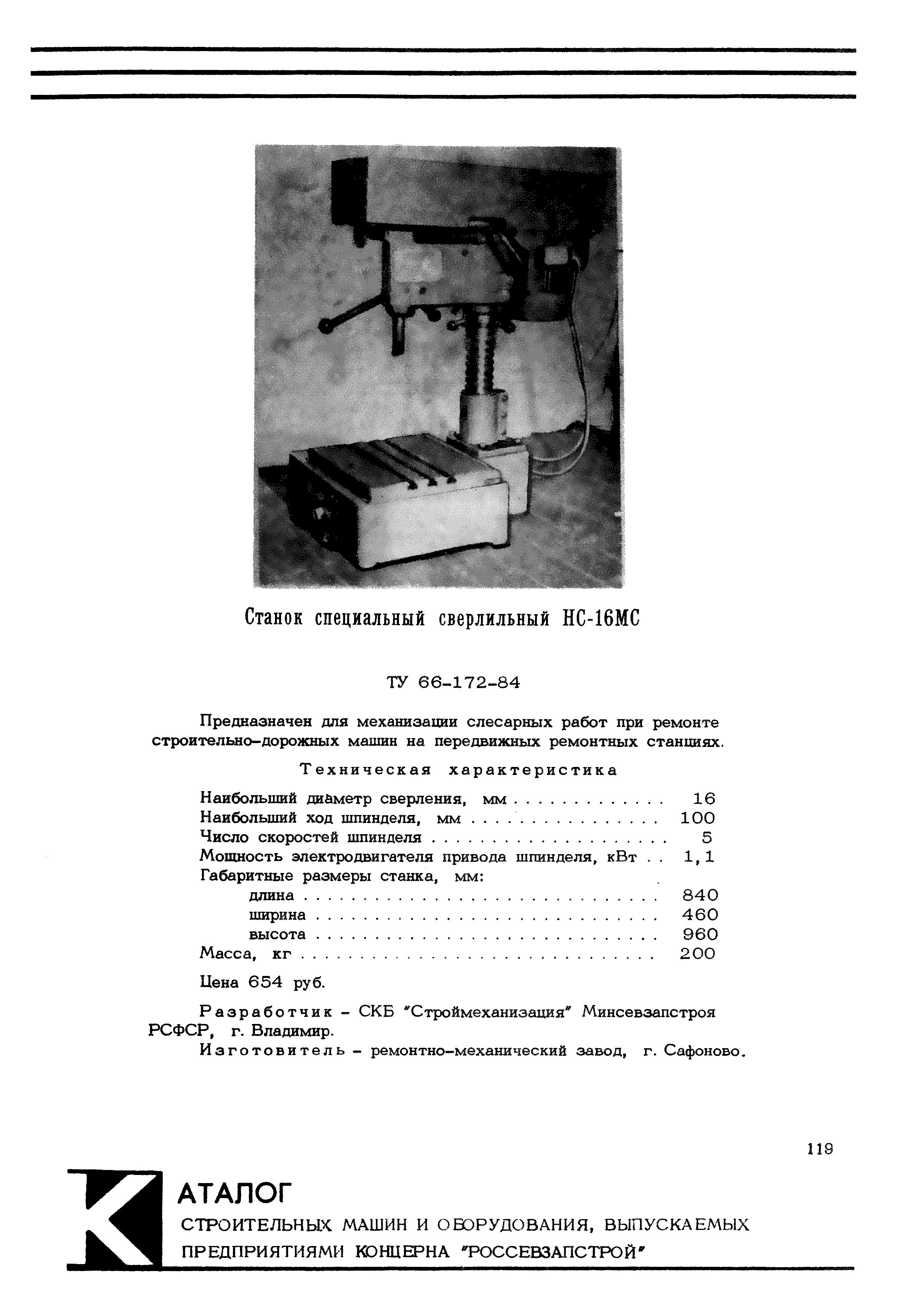 Каталог строительных машин и оборудования, выпускаемых предприятиями концерна "Россевзапстрой"| Статус: | справочные материалы, мп, тпр | | Название рус.: | Каталог строительных машин и оборудования, выпускаемых предприятиями концерна "Россевзапстрой" | | Дата добавления в базу: | 12.02.2016 | | Дата актуализации: | 01.01.2021 | | Оглавление: | 1 Подъемно-транспортные и погрузочно0разгрузочные машины и оборудование Кран башенный КБ—403А Кран башенный КБ-403Б Кран башенный КБ—406.2 Кран башенный КБ—408 Кран стреловой на рельсовом ходу грузоподъемностью 11т СК—З 861 Кран мостовой электрический общего назначения грузоподъемностью 16 т Погрузчик навесной 96,014—00 Подъёмник автомобильный гидравлический АГП—36 Подъемник автомобильный гидравлический ВС—18,01—МС Грейфер одноканатный двухчелюстной вместимостью 0,71 м3 Подъемник мачтовый ТП—17А Установка УРВСМ-90 Установка УРВСМ-200 2. Машины и оборудование для земляных и свайных работ Бульдозер СД 11ОМ Вибротрамбовка навесная ВТН—80 Навесное оборудование для бурения шнуров на экскаваторе ЭО—262 1В Машина землеройная цепная МЗЦ—75 Гидропневматическое навесное оборудование на экскаватор ЭО—4121 (гидропневмомолот) ГПМ—2000 Бульдозерное оборудование СД 112 к трактору Т—150К Оборудование "Удлиненная обратная лопата к экскаватору ЭО—4121 и его модификациями" Устройство для срезки свай УСС—ЗА Цепь режущая ГМ—17 Отвал Д-686-01.000 3. Машины и оборудование для бетонных работ Автобетоносмеситель АБС—5 Пневмокамерный насос "Монжус—1200—6" Установка бетонорастворосмесительная цикличная инвентарная Склад цемента инвентарный ИСП—266 Агрегат мелкого дробления и сортировки стационарный СМД—27БМ 4. Машины и оборудование для отделочных и кровельных работ Установка для транспортирования и подачи битумно—кукерсольных мастик УПМ-3,2-01 Установка битумоварочная УБ-З01А Станция штукатурная СО-114 Агрегат окрасочных с применением бессальникового центробежного насоса Шепеленко Н0—42—00—001 Установка для приемки и выдачи раствора УВР—3,5—01 Установка для перемешивания и выдачи раствора УБ—342 Растворонасос поршневой РНП—4 Установка типа "Пена—12" для напыления пенополиуретана Станция малярная 42192—01А 5. Ручной строительный инструмент Ножницы обойные Н0-01 Нож раскройный НР—01 Ковш КШ—1 для штукатурных работ Кельмы КК—01, КШ—01 для каменных и штукатурных работ Штукатурный инструмент Сокол С—01, терка Шпатели малярные ШП-01, ШП-02, ШП-04, ШС-01 Расшивки Р—01, Р—02. Рустовка РУ—01 Скоба причальная СП—01. Шнур в корпусе Ш—01 Скарпели СК-01, СК-02, СК-03 Скребок СР—01. Гребок Г—01 Ножницы арматурные НА—01. Станок ножовочный СН—01 Валики малярные ВМ-01, ВМ-02, ВМ-0З. Валик сдвоенный ВС-01. Приспособление окрасочное П0—01 Молотки стальные строительные М—01, М—02, М—0З, М—04 6. Специализированный транспорт Прицеп—тяжеловоз автомобильный низкорамный АНПТ—60 Прицеп—тяжеловоз грузоподъемностью 40 т У4005 Прицеп-тяжеловоз 66: ИН6006 Полуприцеп—панелевоз ПП 1307А Полуприцеп УПП—1207 Полуприцеп УПП (Ш) 1207 Полуприцеп УПР 1212 М Полуприцеп УПЛ 1412 Полуприцеп—площадка 66: ПЛ 1212Д1 Полуприцеп—площадка ПЛ 2212 Полуприцеп—плитовоз УПЛ 1824 Полуприцеп—керамзитовоз 66: ПШ 1321 Автопоезд УАС—2613 Полуприцеп—сантехкабиновоз ПЭ 1209 ЦЭКБ Склад взрывчатых материалов передвижной Автомобиль-самопогрузчик КС-3000 (КС-3000А) Самосвал малогабаритный СМ—1500 Самосвал малогабаритный СМ—1100 ПГ Автошпаклевоз 66: ЦЯ 0
