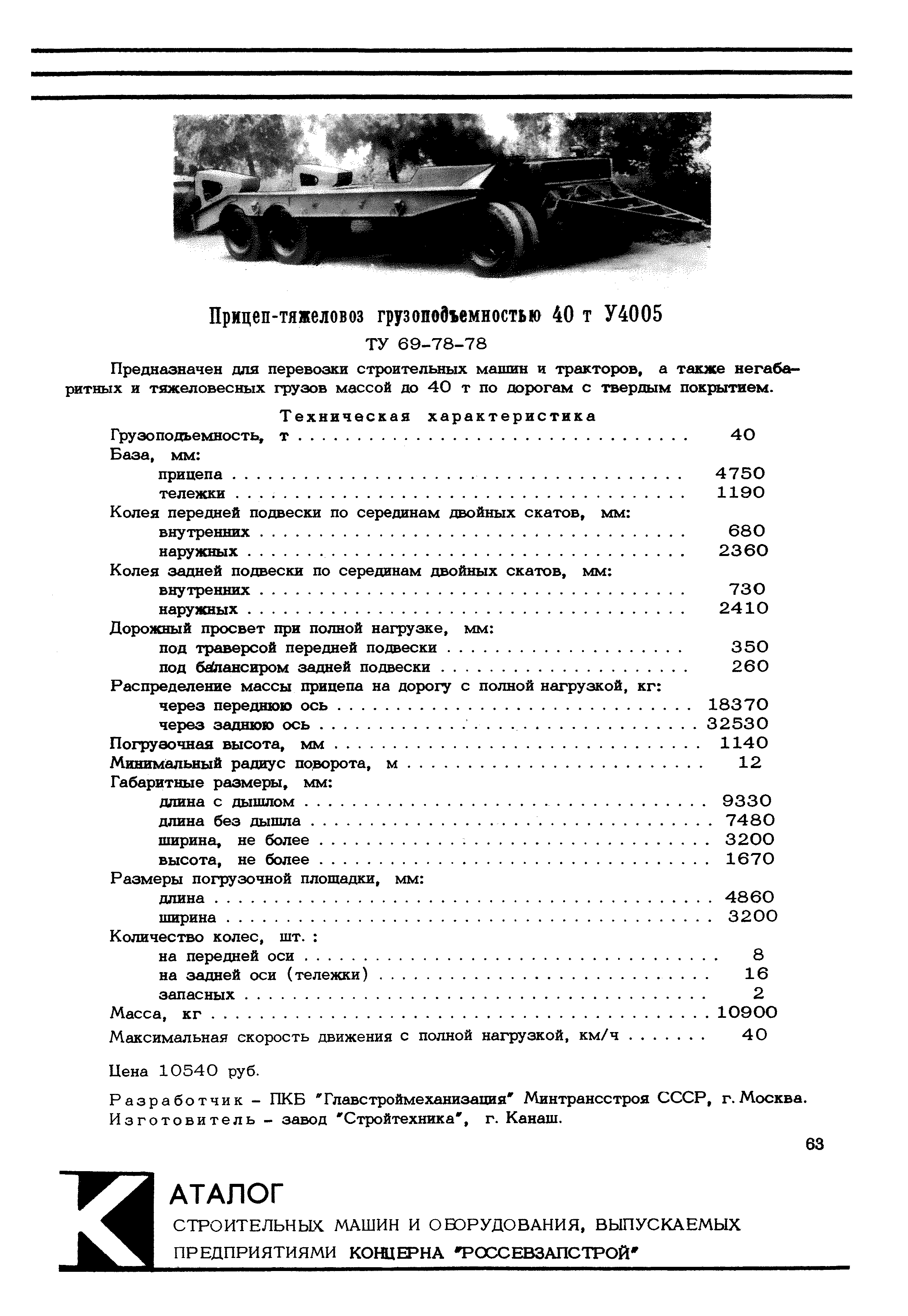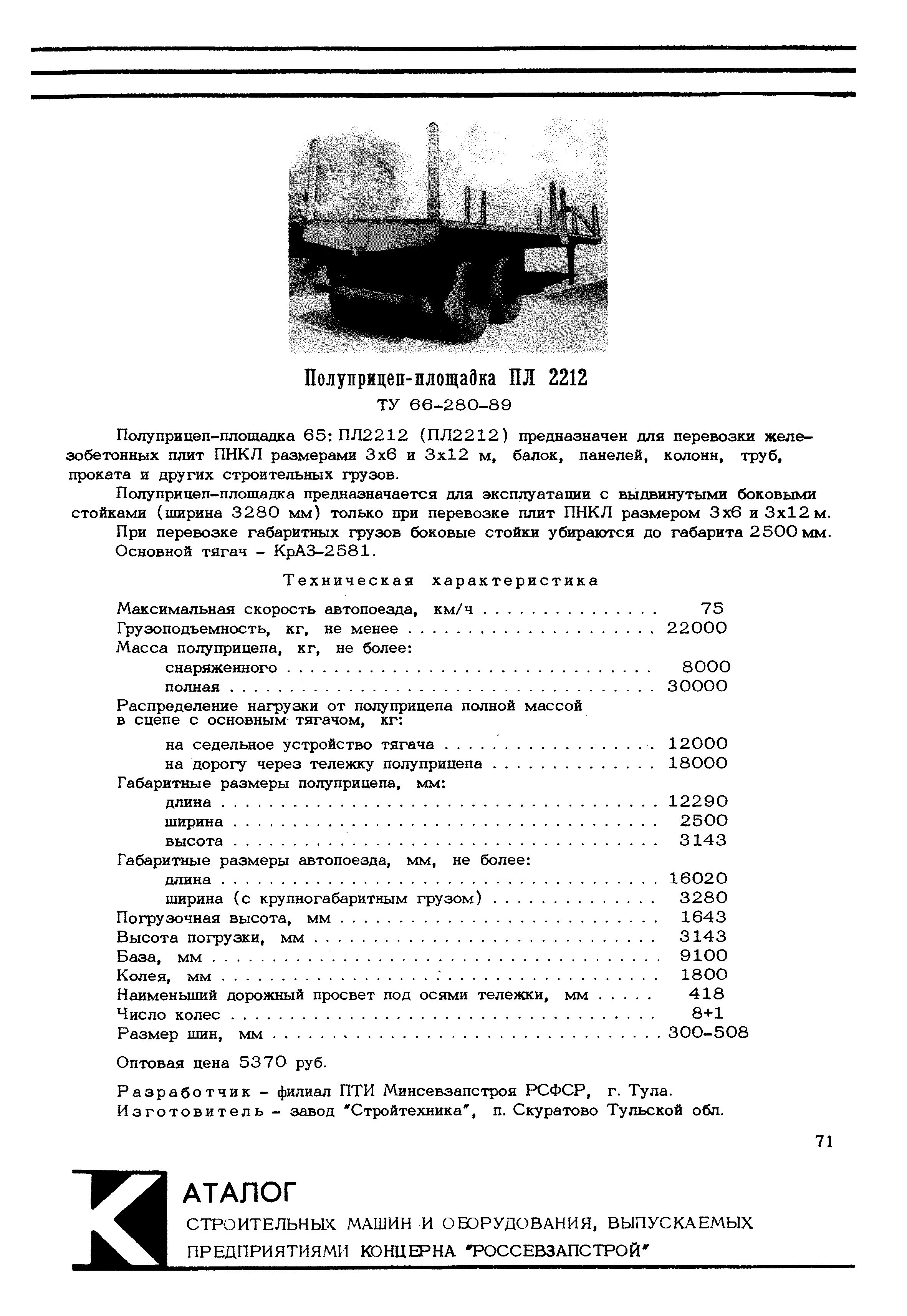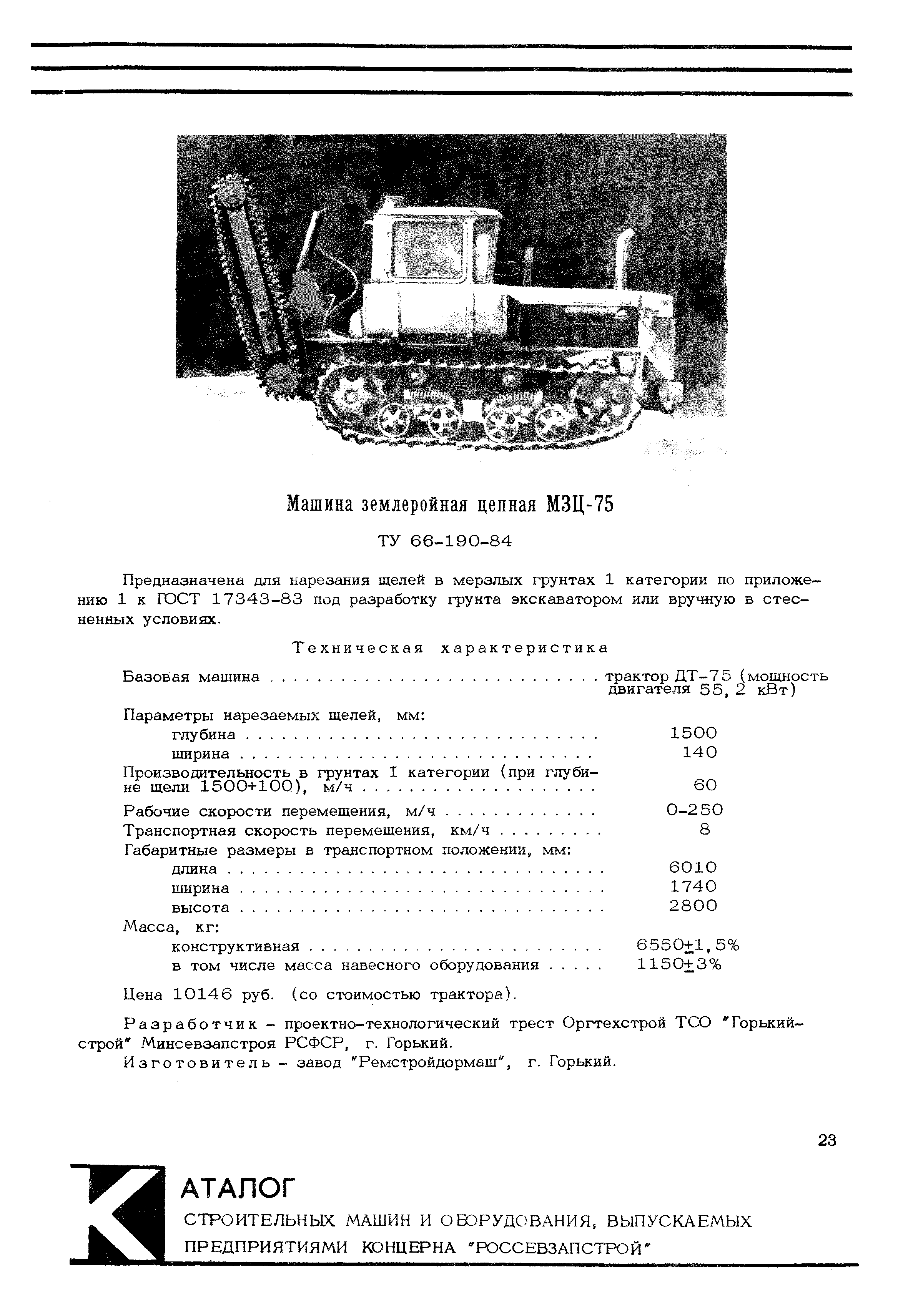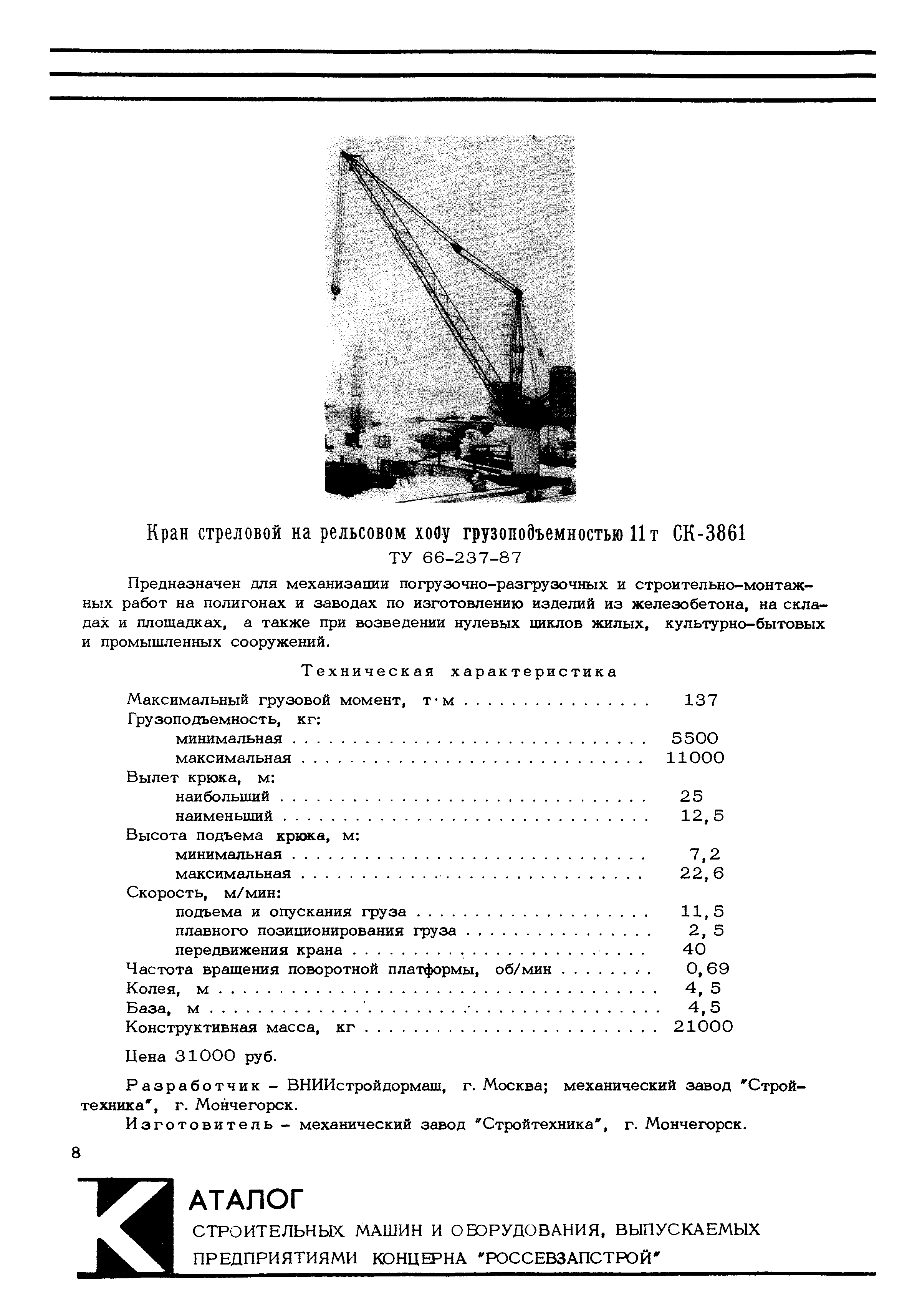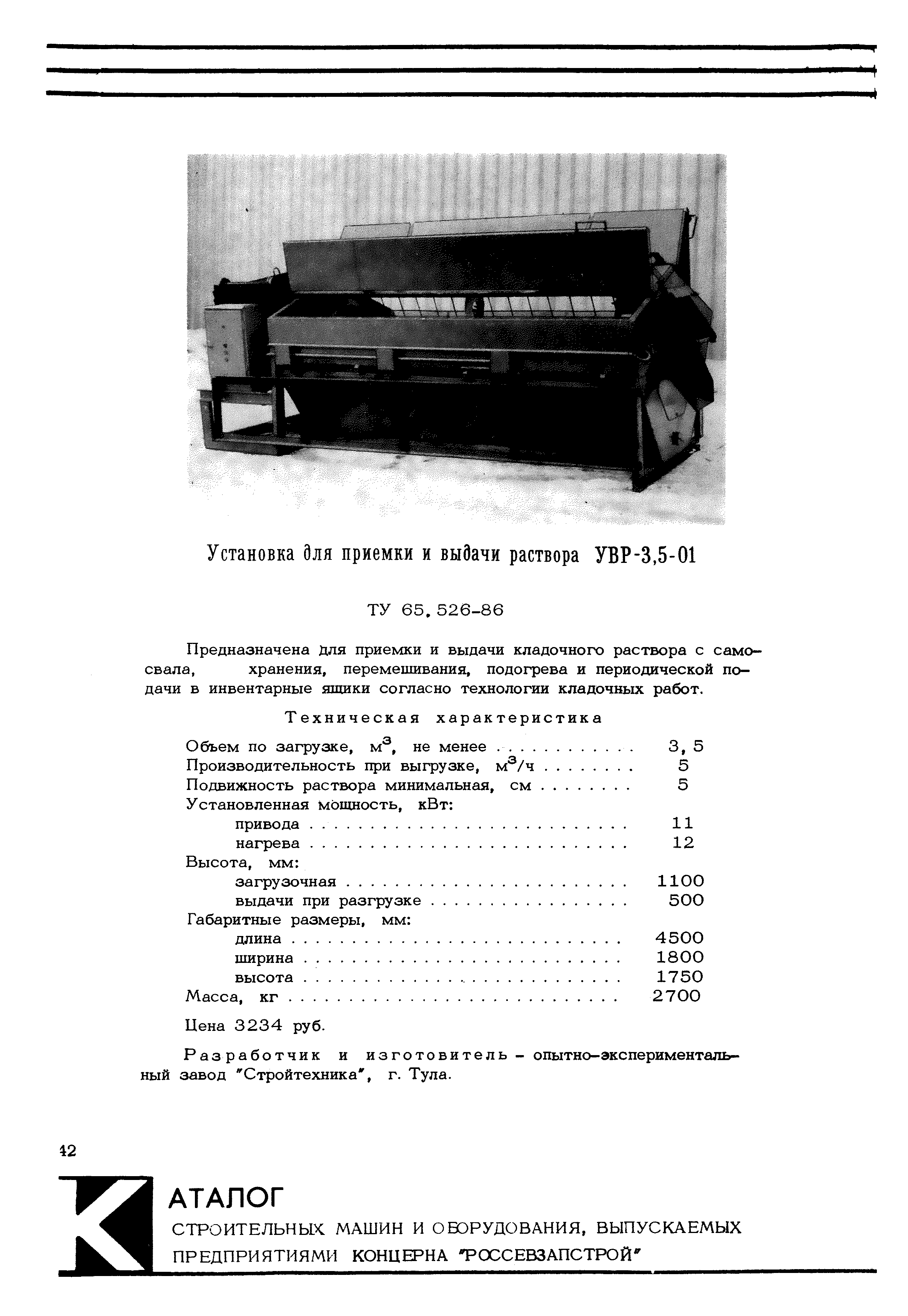 Каталог строительных машин и оборудования, выпускаемых предприятиями концерна "Россевзапстрой"| Статус: | справочные материалы, мп, тпр | | Название рус.: | Каталог строительных машин и оборудования, выпускаемых предприятиями концерна "Россевзапстрой" | | Дата добавления в базу: | 12.02.2016 | | Дата актуализации: | 01.01.2021 | | Оглавление: | 1 Подъемно-транспортные и погрузочно0разгрузочные машины и оборудование Кран башенный КБ—403А Кран башенный КБ-403Б Кран башенный КБ—406.2 Кран башенный КБ—408 Кран стреловой на рельсовом ходу грузоподъемностью 11т СК—З 861 Кран мостовой электрический общего назначения грузоподъемностью 16 т Погрузчик навесной 96,014—00 Подъёмник автомобильный гидравлический АГП—36 Подъемник автомобильный гидравлический ВС—18,01—МС Грейфер одноканатный двухчелюстной вместимостью 0,71 м3 Подъемник мачтовый ТП—17А Установка УРВСМ-90 Установка УРВСМ-200 2. Машины и оборудование для земляных и свайных работ Бульдозер СД 11ОМ Вибротрамбовка навесная ВТН—80 Навесное оборудование для бурения шнуров на экскаваторе ЭО—262 1В Машина землеройная цепная МЗЦ—75 Гидропневматическое навесное оборудование на экскаватор ЭО—4121 (гидропневмомолот) ГПМ—2000 Бульдозерное оборудование СД 112 к трактору Т—150К Оборудование "Удлиненная обратная лопата к экскаватору ЭО—4121 и его модификациями" Устройство для срезки свай УСС—ЗА Цепь режущая ГМ—17 Отвал Д-686-01.000 3. Машины и оборудование для бетонных работ Автобетоносмеситель АБС—5 Пневмокамерный насос "Монжус—1200—6" Установка бетонорастворосмесительная цикличная инвентарная Склад цемента инвентарный ИСП—266 Агрегат мелкого дробления и сортировки стационарный СМД—27БМ 4. Машины и оборудование для отделочных и кровельных работ Установка для транспортирования и подачи битумно—кукерсольных мастик УПМ-3,2-01 Установка битумоварочная УБ-З01А Станция штукатурная СО-114 Агрегат окрасочных с применением бессальникового центробежного насоса Шепеленко Н0—42—00—001 Установка для приемки и выдачи раствора УВР—3,5—01 Установка для перемешивания и выдачи раствора УБ—342 Растворонасос поршневой РНП—4 Установка типа "Пена—12" для напыления пенополиуретана Станция малярная 42192—01А 5. Ручной строительный инструмент Ножницы обойные Н0-01 Нож раскройный НР—01 Ковш КШ—1 для штукатурных работ Кельмы КК—01, КШ—01 для каменных и штукатурных работ Штукатурный инструмент Сокол С—01, терка Шпатели малярные ШП-01, ШП-02, ШП-04, ШС-01 Расшивки Р—01, Р—02. Рустовка РУ—01 Скоба причальная СП—01. Шнур в корпусе Ш—01 Скарпели СК-01, СК-02, СК-03 Скребок СР—01. Гребок Г—01 Ножницы арматурные НА—01. Станок ножовочный СН—01 Валики малярные ВМ-01, ВМ-02, ВМ-0З. Валик сдвоенный ВС-01. Приспособление окрасочное П0—01 Молотки стальные строительные М—01, М—02, М—0З, М—04 6. Специализированный транспорт Прицеп—тяжеловоз автомобильный низкорамный АНПТ—60 Прицеп—тяжеловоз грузоподъемностью 40 т У4005 Прицеп-тяжеловоз 66: ИН6006 Полуприцеп—панелевоз ПП 1307А Полуприцеп УПП—1207 Полуприцеп УПП (Ш) 1207 Полуприцеп УПР 1212 М Полуприцеп УПЛ 1412 Полуприцеп—площадка 66: ПЛ 1212Д1 Полуприцеп—площадка ПЛ 2212 Полуприцеп—плитовоз УПЛ 1824 Полуприцеп—керамзитовоз 66: ПШ 1321 Автопоезд УАС—2613 Полуприцеп—сантехкабиновоз ПЭ 1209 ЦЭКБ Склад взрывчатых материалов передвижной Автомобиль-самопогрузчик КС-3000 (КС-3000А) Самосвал малогабаритный СМ—1500 Самосвал малогабаритный СМ—1100 ПГ Автошпаклевоз 66: ЦЯ 0
