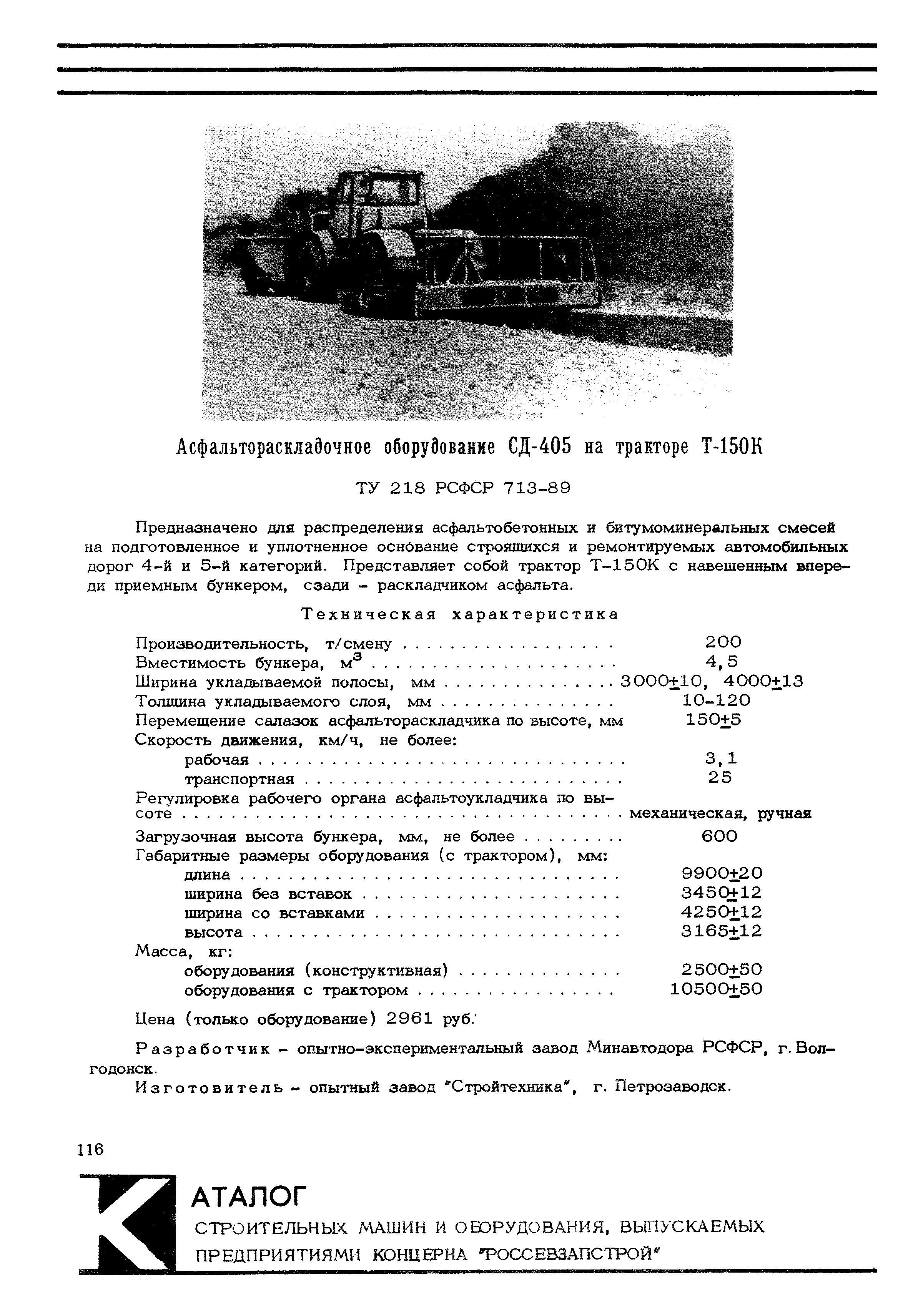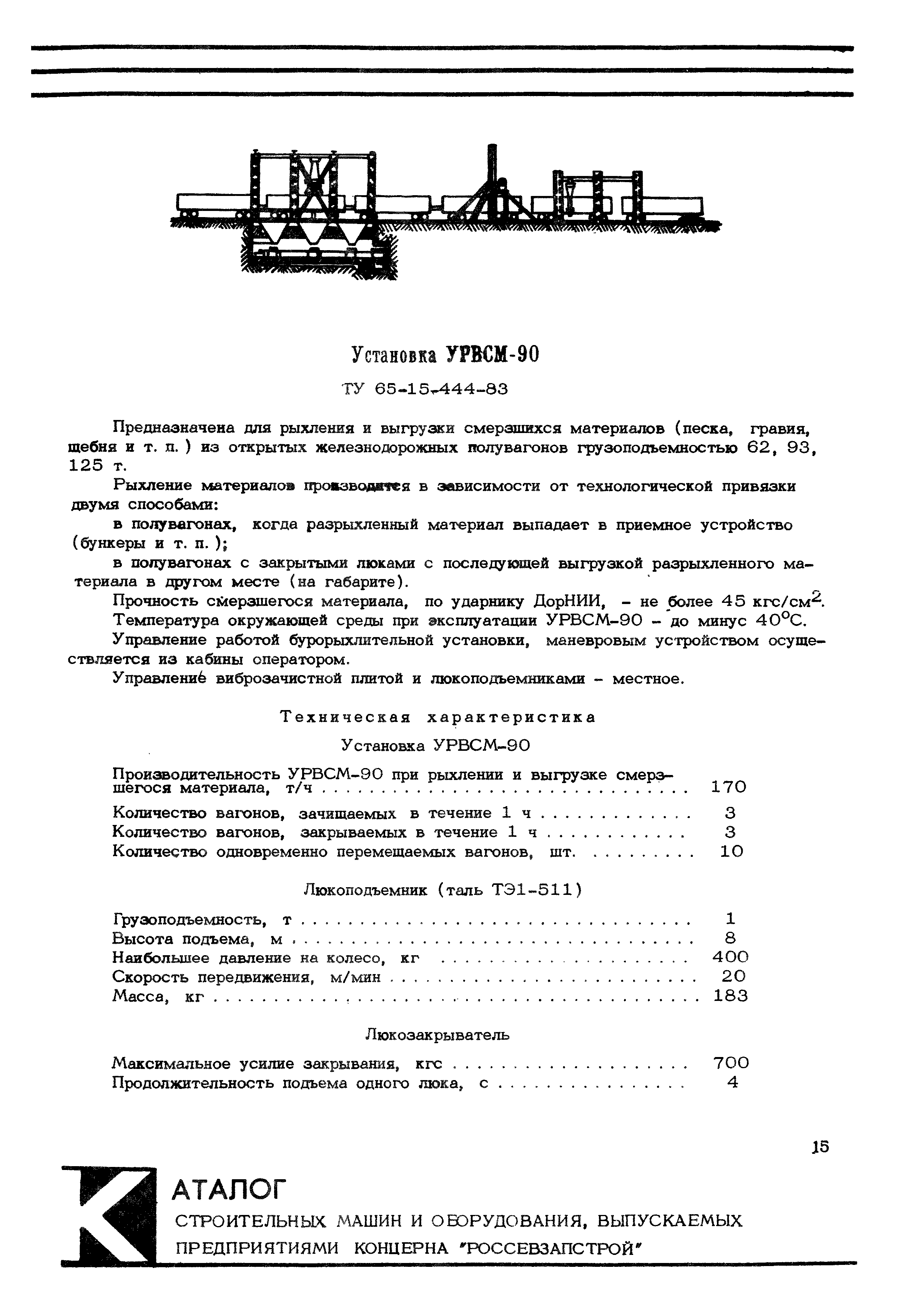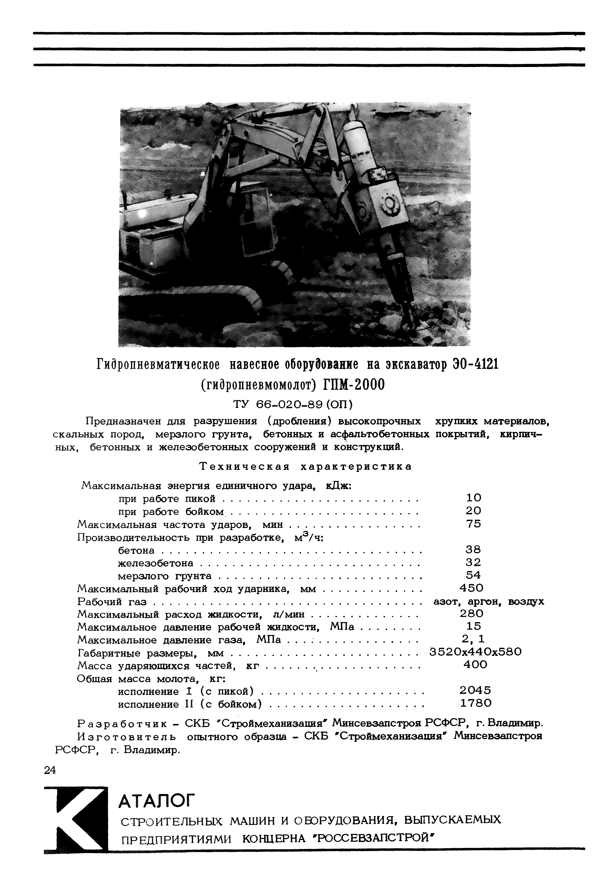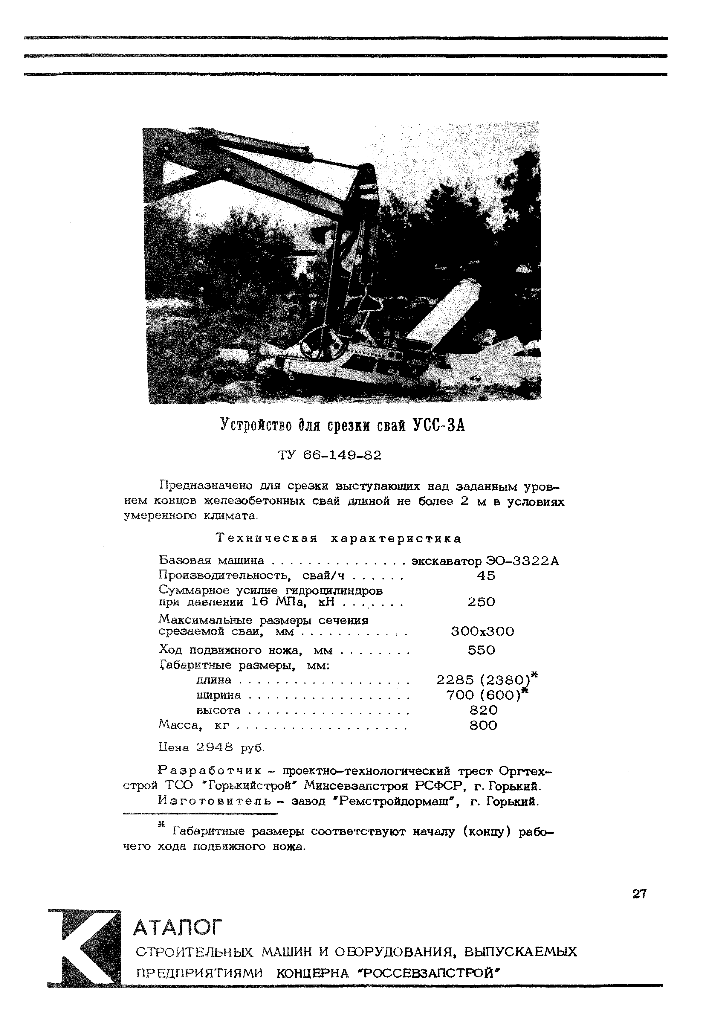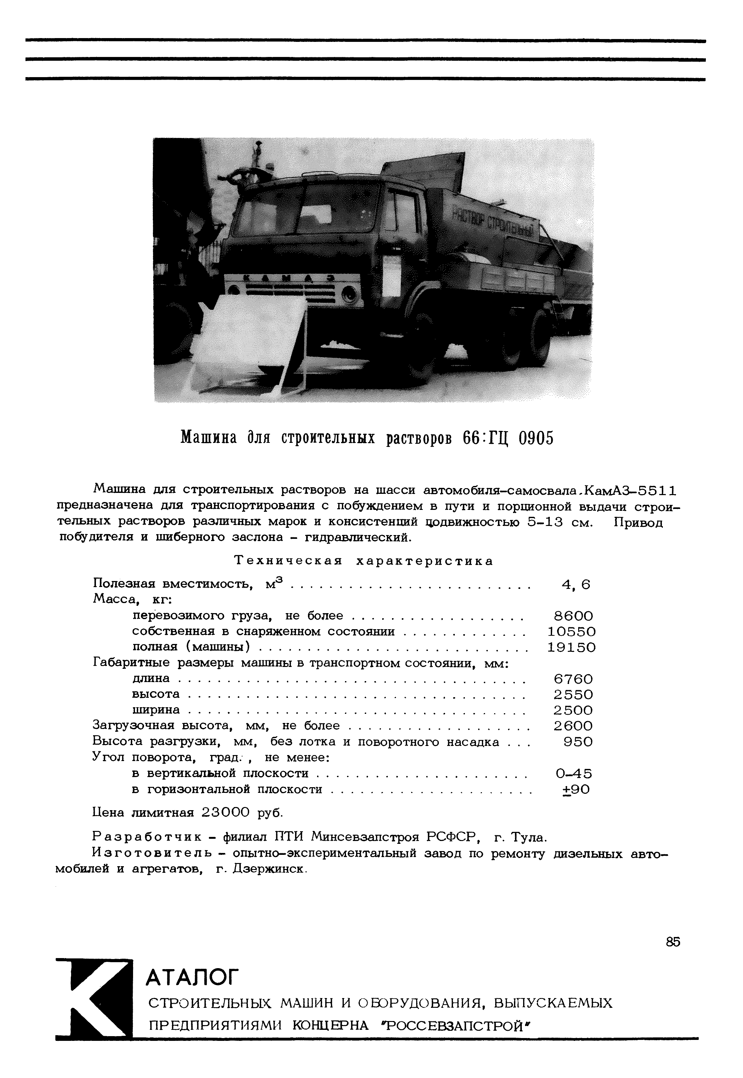 Каталог строительных машин и оборудования, выпускаемых предприятиями концерна "Россевзапстрой"| Статус: | справочные материалы, мп, тпр | | Название рус.: | Каталог строительных машин и оборудования, выпускаемых предприятиями концерна "Россевзапстрой" | | Дата добавления в базу: | 12.02.2016 | | Дата актуализации: | 01.01.2021 | | Оглавление: | 1 Подъемно-транспортные и погрузочно0разгрузочные машины и оборудование Кран башенный КБ—403А Кран башенный КБ-403Б Кран башенный КБ—406.2 Кран башенный КБ—408 Кран стреловой на рельсовом ходу грузоподъемностью 11т СК—З 861 Кран мостовой электрический общего назначения грузоподъемностью 16 т Погрузчик навесной 96,014—00 Подъёмник автомобильный гидравлический АГП—36 Подъемник автомобильный гидравлический ВС—18,01—МС Грейфер одноканатный двухчелюстной вместимостью 0,71 м3 Подъемник мачтовый ТП—17А Установка УРВСМ-90 Установка УРВСМ-200 2. Машины и оборудование для земляных и свайных работ Бульдозер СД 11ОМ Вибротрамбовка навесная ВТН—80 Навесное оборудование для бурения шнуров на экскаваторе ЭО—262 1В Машина землеройная цепная МЗЦ—75 Гидропневматическое навесное оборудование на экскаватор ЭО—4121 (гидропневмомолот) ГПМ—2000 Бульдозерное оборудование СД 112 к трактору Т—150К Оборудование "Удлиненная обратная лопата к экскаватору ЭО—4121 и его модификациями" Устройство для срезки свай УСС—ЗА Цепь режущая ГМ—17 Отвал Д-686-01.000 3. Машины и оборудование для бетонных работ Автобетоносмеситель АБС—5 Пневмокамерный насос "Монжус—1200—6" Установка бетонорастворосмесительная цикличная инвентарная Склад цемента инвентарный ИСП—266 Агрегат мелкого дробления и сортировки стационарный СМД—27БМ 4. Машины и оборудование для отделочных и кровельных работ Установка для транспортирования и подачи битумно—кукерсольных мастик УПМ-3,2-01 Установка битумоварочная УБ-З01А Станция штукатурная СО-114 Агрегат окрасочных с применением бессальникового центробежного насоса Шепеленко Н0—42—00—001 Установка для приемки и выдачи раствора УВР—3,5—01 Установка для перемешивания и выдачи раствора УБ—342 Растворонасос поршневой РНП—4 Установка типа "Пена—12" для напыления пенополиуретана Станция малярная 42192—01А 5. Ручной строительный инструмент Ножницы обойные Н0-01 Нож раскройный НР—01 Ковш КШ—1 для штукатурных работ Кельмы КК—01, КШ—01 для каменных и штукатурных работ Штукатурный инструмент Сокол С—01, терка Шпатели малярные ШП-01, ШП-02, ШП-04, ШС-01 Расшивки Р—01, Р—02. Рустовка РУ—01 Скоба причальная СП—01. Шнур в корпусе Ш—01 Скарпели СК-01, СК-02, СК-03 Скребок СР—01. Гребок Г—01 Ножницы арматурные НА—01. Станок ножовочный СН—01 Валики малярные ВМ-01, ВМ-02, ВМ-0З. Валик сдвоенный ВС-01. Приспособление окрасочное П0—01 Молотки стальные строительные М—01, М—02, М—0З, М—04 6. Специализированный транспорт Прицеп—тяжеловоз автомобильный низкорамный АНПТ—60 Прицеп—тяжеловоз грузоподъемностью 40 т У4005 Прицеп-тяжеловоз 66: ИН6006 Полуприцеп—панелевоз ПП 1307А Полуприцеп УПП—1207 Полуприцеп УПП (Ш) 1207 Полуприцеп УПР 1212 М Полуприцеп УПЛ 1412 Полуприцеп—площадка 66: ПЛ 1212Д1 Полуприцеп—площадка ПЛ 2212 Полуприцеп—плитовоз УПЛ 1824 Полуприцеп—керамзитовоз 66: ПШ 1321 Автопоезд УАС—2613 Полуприцеп—сантехкабиновоз ПЭ 1209 ЦЭКБ Склад взрывчатых материалов передвижной Автомобиль-самопогрузчик КС-3000 (КС-3000А) Самосвал малогабаритный СМ—1500 Самосвал малогабаритный СМ—1100 ПГ Автошпаклевоз 66: ЦЯ 0