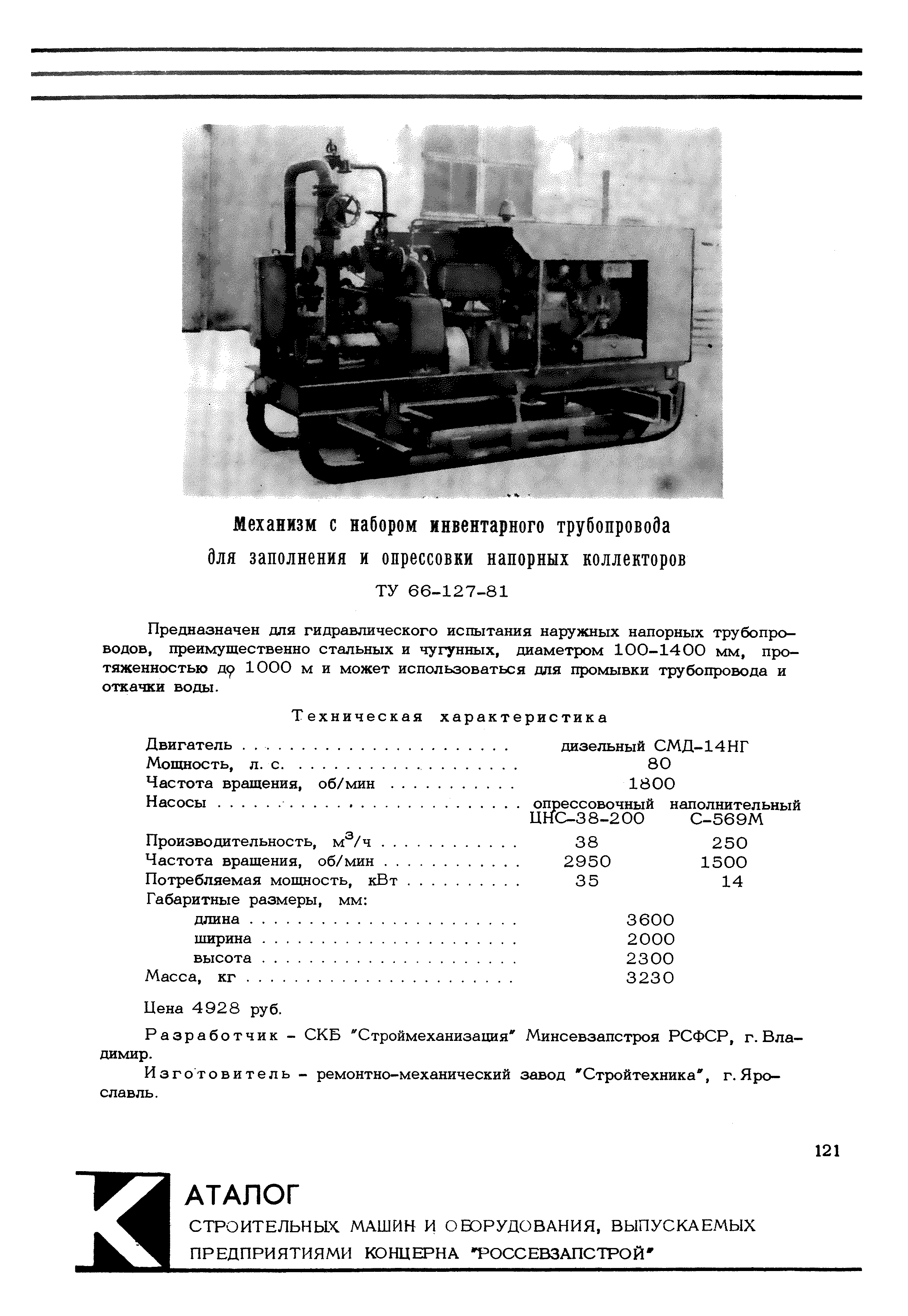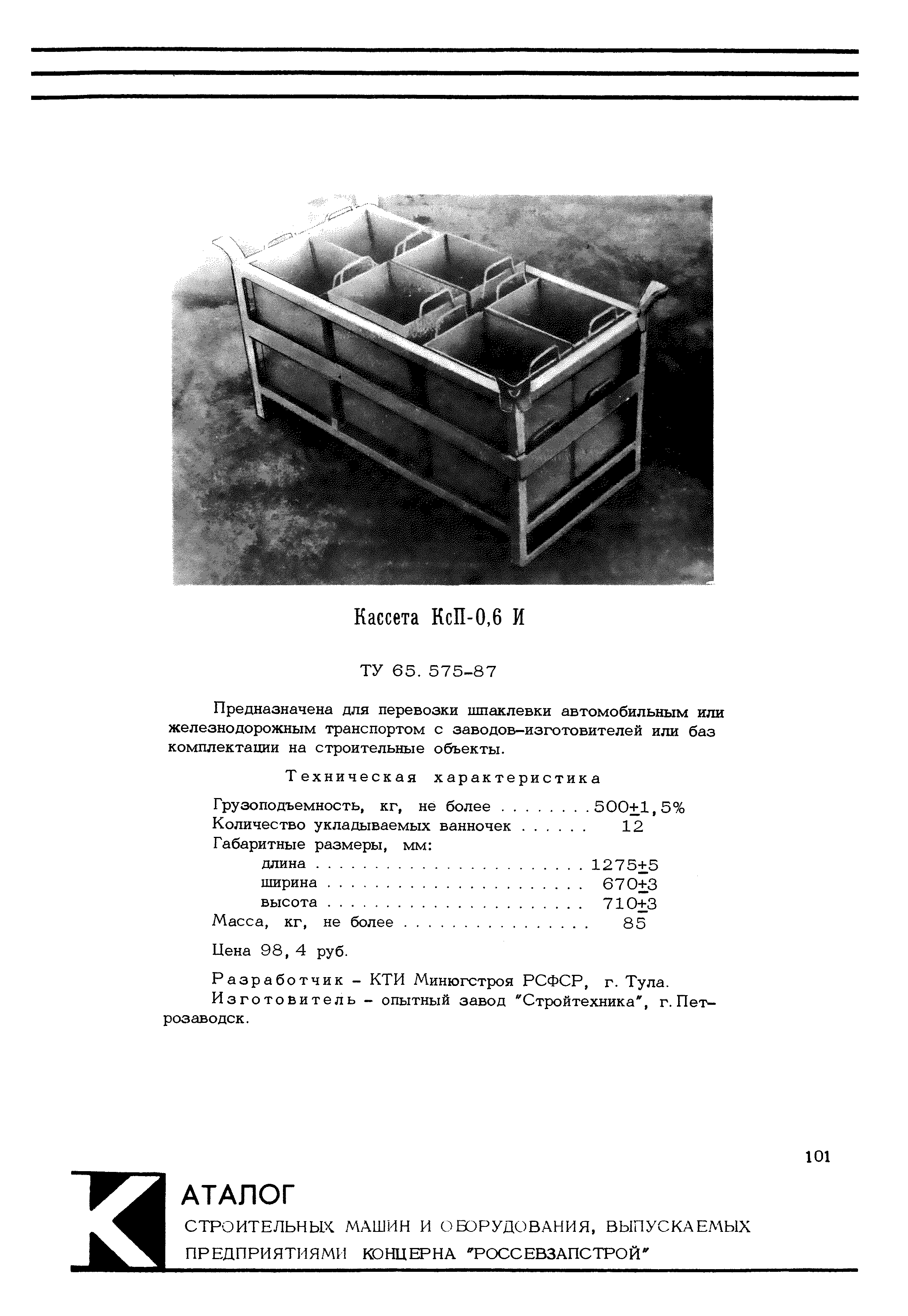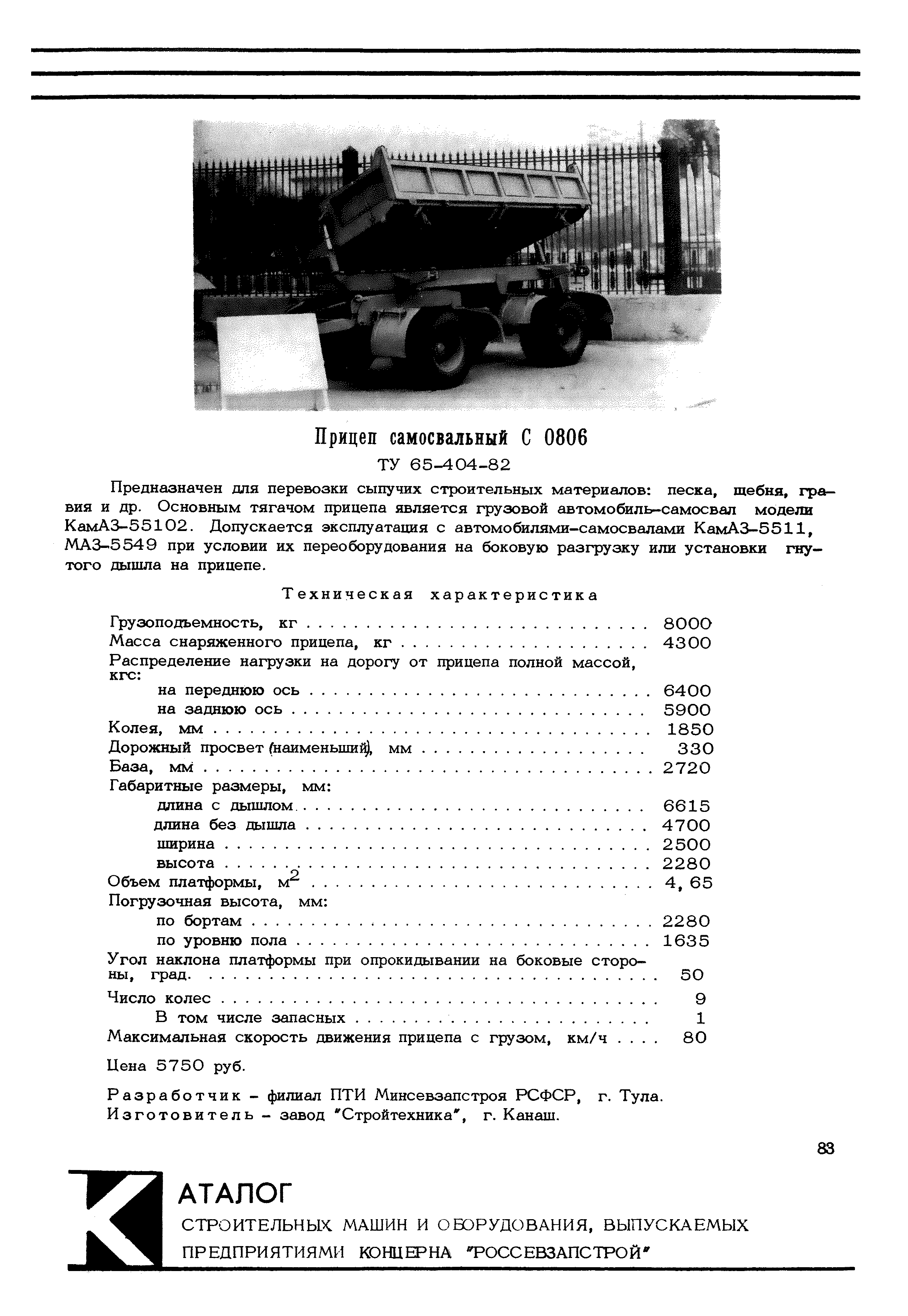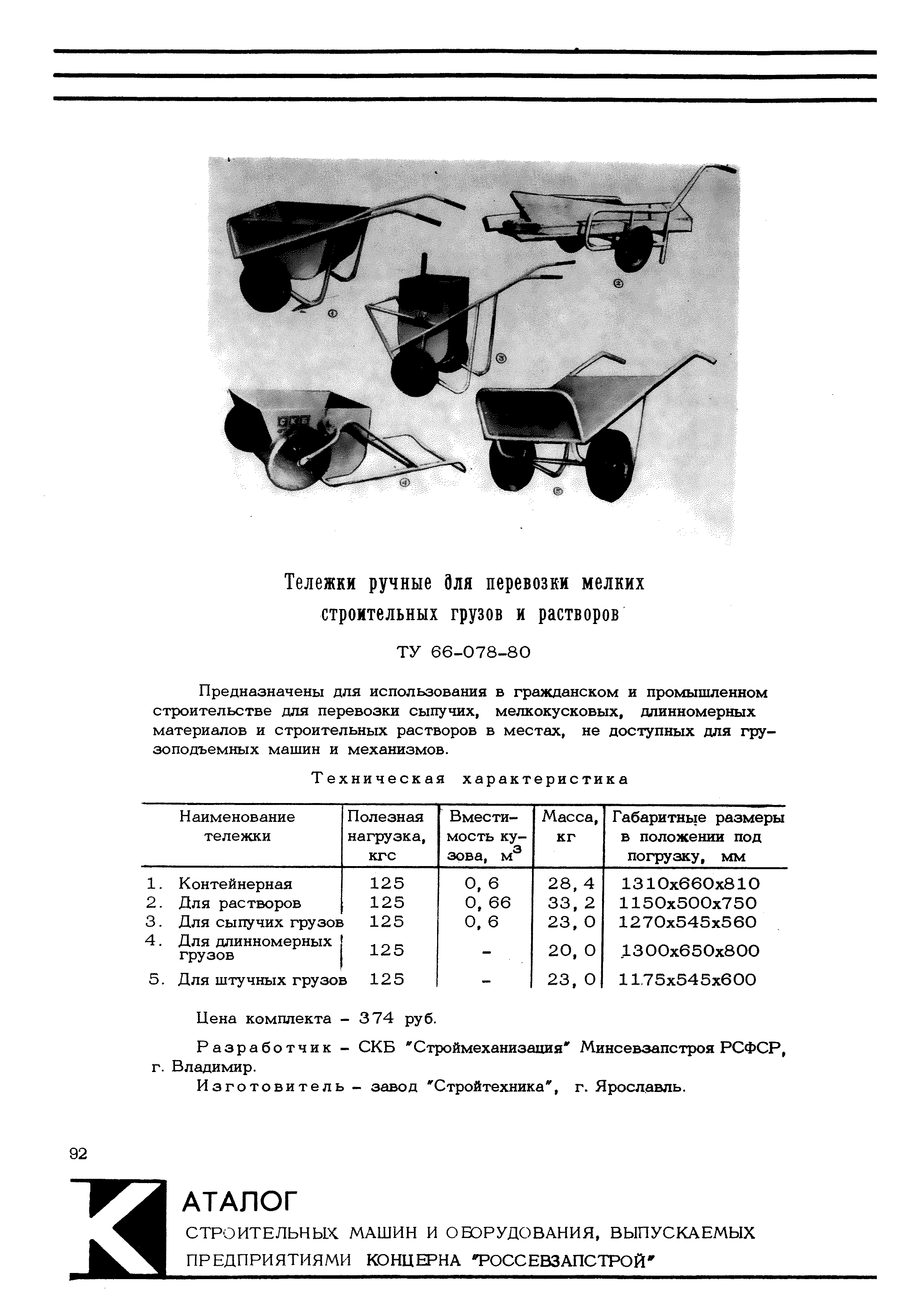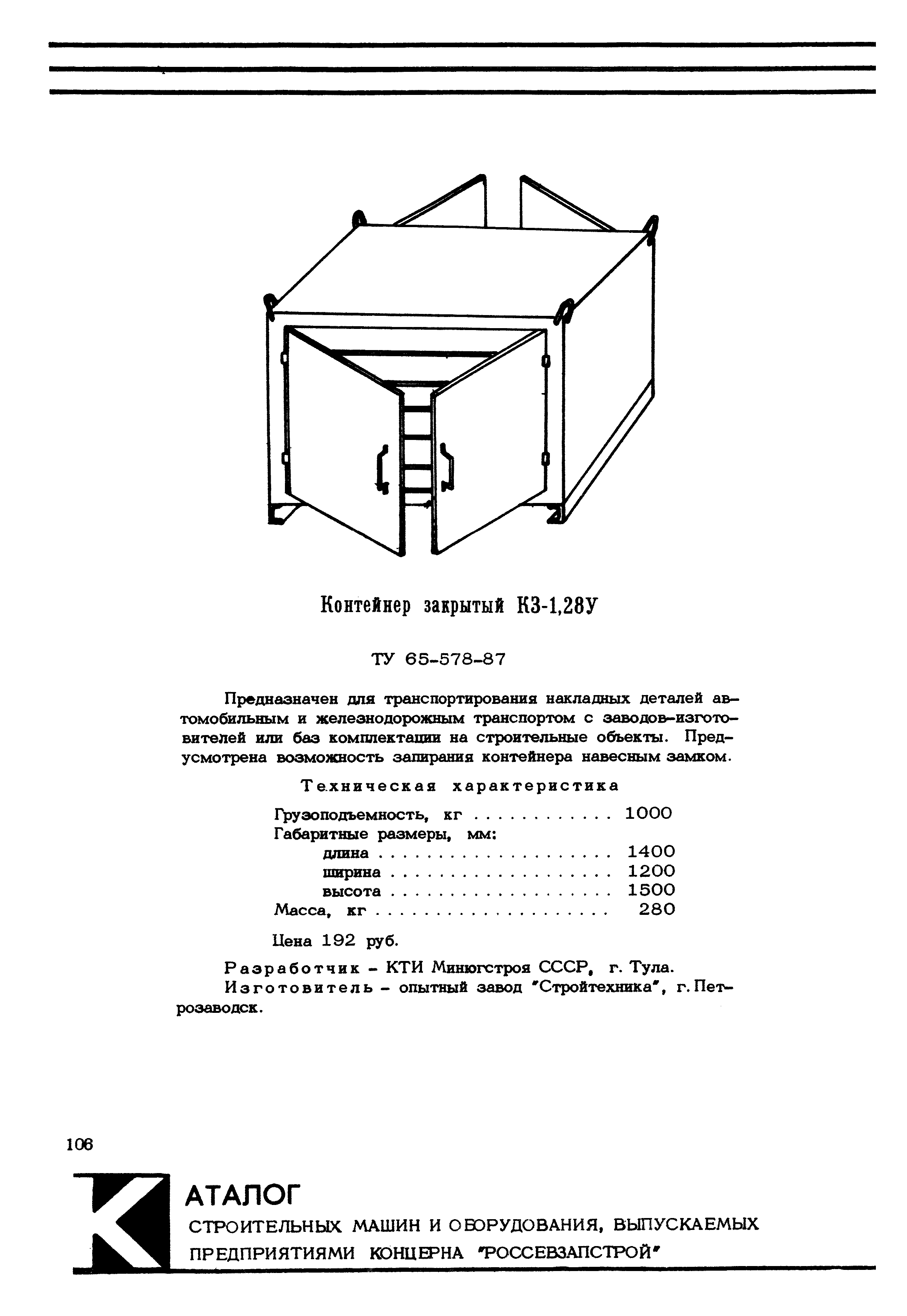 Каталог строительных машин и оборудования, выпускаемых предприятиями концерна "Россевзапстрой"| Статус: | справочные материалы, мп, тпр | | Название рус.: | Каталог строительных машин и оборудования, выпускаемых предприятиями концерна "Россевзапстрой" | | Дата добавления в базу: | 12.02.2016 | | Дата актуализации: | 01.01.2021 | | Оглавление: | 1 Подъемно-транспортные и погрузочно0разгрузочные машины и оборудование Кран башенный КБ—403А Кран башенный КБ-403Б Кран башенный КБ—406.2 Кран башенный КБ—408 Кран стреловой на рельсовом ходу грузоподъемностью 11т СК—З 861 Кран мостовой электрический общего назначения грузоподъемностью 16 т Погрузчик навесной 96,014—00 Подъёмник автомобильный гидравлический АГП—36 Подъемник автомобильный гидравлический ВС—18,01—МС Грейфер одноканатный двухчелюстной вместимостью 0,71 м3 Подъемник мачтовый ТП—17А Установка УРВСМ-90 Установка УРВСМ-200 2. Машины и оборудование для земляных и свайных работ Бульдозер СД 11ОМ Вибротрамбовка навесная ВТН—80 Навесное оборудование для бурения шнуров на экскаваторе ЭО—262 1В Машина землеройная цепная МЗЦ—75 Гидропневматическое навесное оборудование на экскаватор ЭО—4121 (гидропневмомолот) ГПМ—2000 Бульдозерное оборудование СД 112 к трактору Т—150К Оборудование "Удлиненная обратная лопата к экскаватору ЭО—4121 и его модификациями" Устройство для срезки свай УСС—ЗА Цепь режущая ГМ—17 Отвал Д-686-01.000 3. Машины и оборудование для бетонных работ Автобетоносмеситель АБС—5 Пневмокамерный насос "Монжус—1200—6" Установка бетонорастворосмесительная цикличная инвентарная Склад цемента инвентарный ИСП—266 Агрегат мелкого дробления и сортировки стационарный СМД—27БМ 4. Машины и оборудование для отделочных и кровельных работ Установка для транспортирования и подачи битумно—кукерсольных мастик УПМ-3,2-01 Установка битумоварочная УБ-З01А Станция штукатурная СО-114 Агрегат окрасочных с применением бессальникового центробежного насоса Шепеленко Н0—42—00—001 Установка для приемки и выдачи раствора УВР—3,5—01 Установка для перемешивания и выдачи раствора УБ—342 Растворонасос поршневой РНП—4 Установка типа "Пена—12" для напыления пенополиуретана Станция малярная 42192—01А 5. Ручной строительный инструмент Ножницы обойные Н0-01 Нож раскройный НР—01 Ковш КШ—1 для штукатурных работ Кельмы КК—01, КШ—01 для каменных и штукатурных работ Штукатурный инструмент Сокол С—01, терка Шпатели малярные ШП-01, ШП-02, ШП-04, ШС-01 Расшивки Р—01, Р—02. Рустовка РУ—01 Скоба причальная СП—01. Шнур в корпусе Ш—01 Скарпели СК-01, СК-02, СК-03 Скребок СР—01. Гребок Г—01 Ножницы арматурные НА—01. Станок ножовочный СН—01 Валики малярные ВМ-01, ВМ-02, ВМ-0З. Валик сдвоенный ВС-01. Приспособление окрасочное П0—01 Молотки стальные строительные М—01, М—02, М—0З, М—04 6. Специализированный транспорт Прицеп—тяжеловоз автомобильный низкорамный АНПТ—60 Прицеп—тяжеловоз грузоподъемностью 40 т У4005 Прицеп-тяжеловоз 66: ИН6006 Полуприцеп—панелевоз ПП 1307А Полуприцеп УПП—1207 Полуприцеп УПП (Ш) 1207 Полуприцеп УПР 1212 М Полуприцеп УПЛ 1412 Полуприцеп—площадка 66: ПЛ 1212Д1 Полуприцеп—площадка ПЛ 2212 Полуприцеп—плитовоз УПЛ 1824 Полуприцеп—керамзитовоз 66: ПШ 1321 Автопоезд УАС—2613 Полуприцеп—сантехкабиновоз ПЭ 1209 ЦЭКБ Склад взрывчатых материалов передвижной Автомобиль-самопогрузчик КС-3000 (КС-3000А) Самосвал малогабаритный СМ—1500 Самосвал малогабаритный СМ—1100 ПГ Автошпаклевоз 66: ЦЯ 0