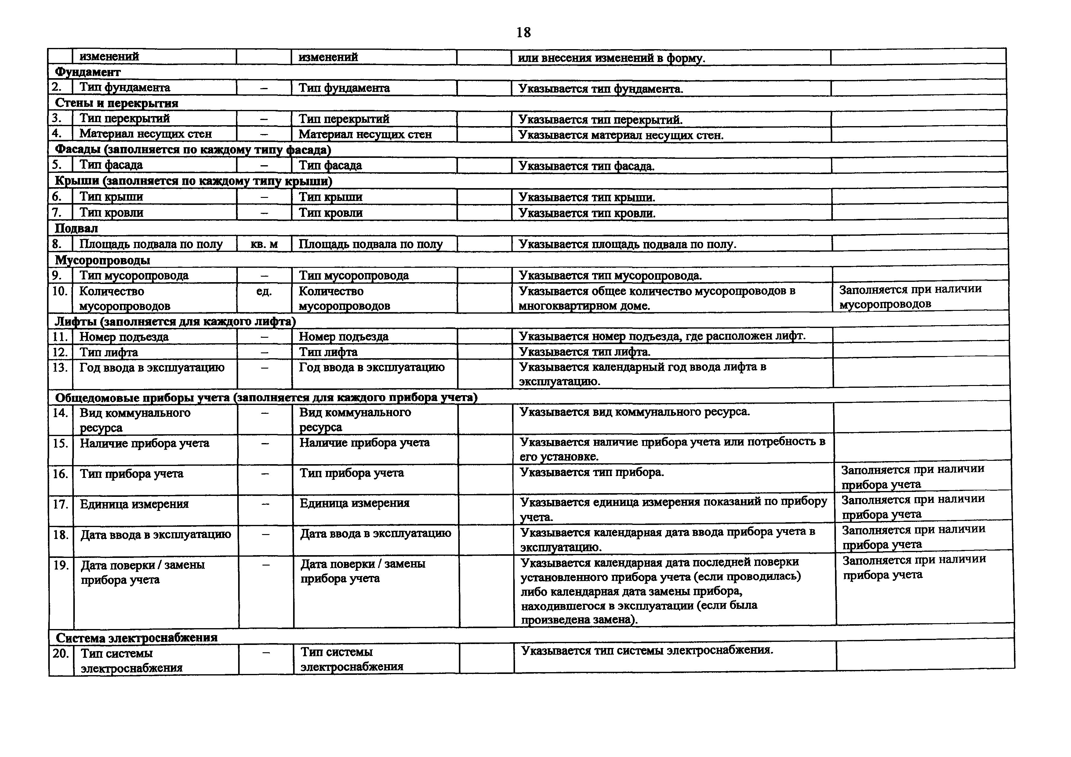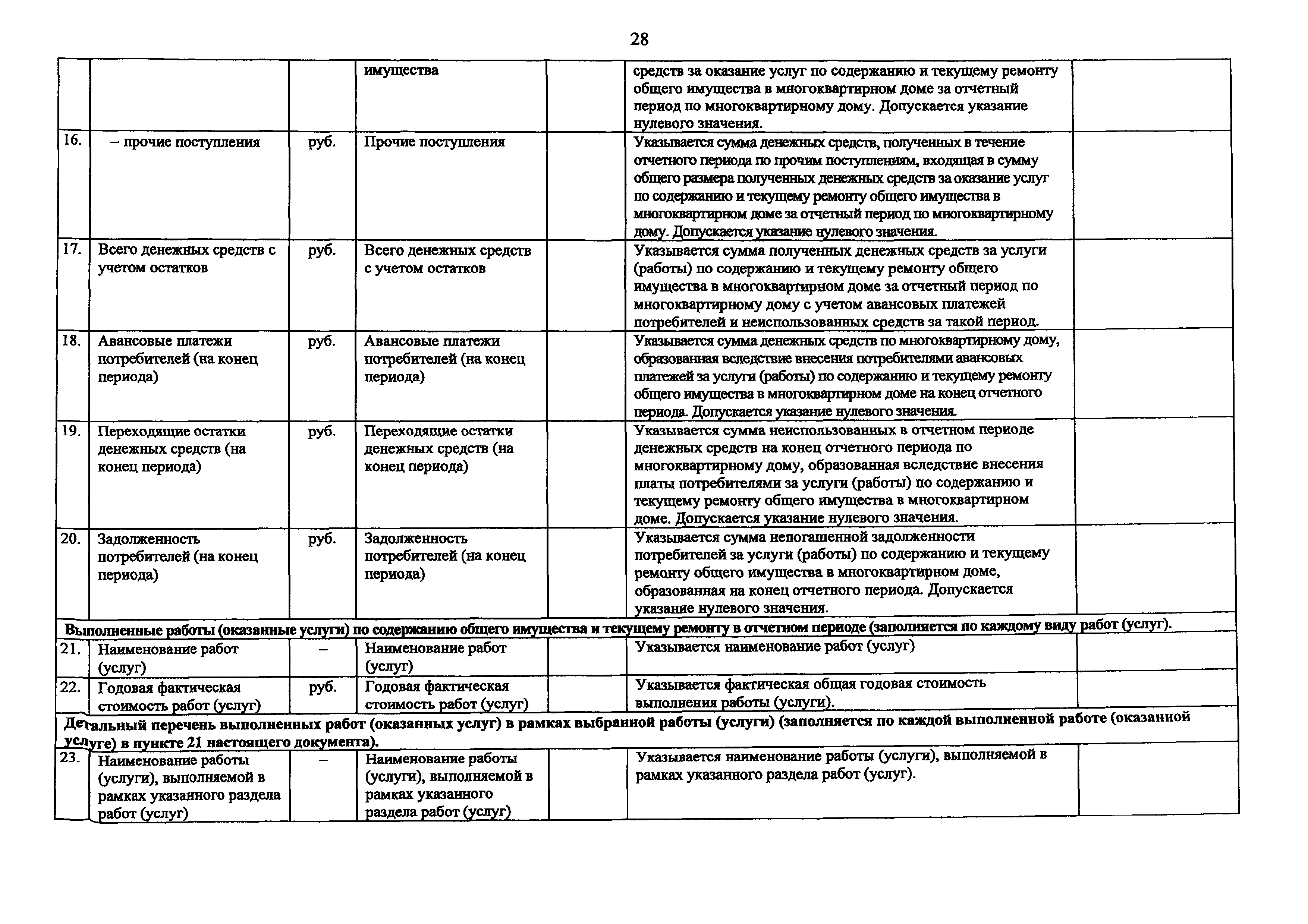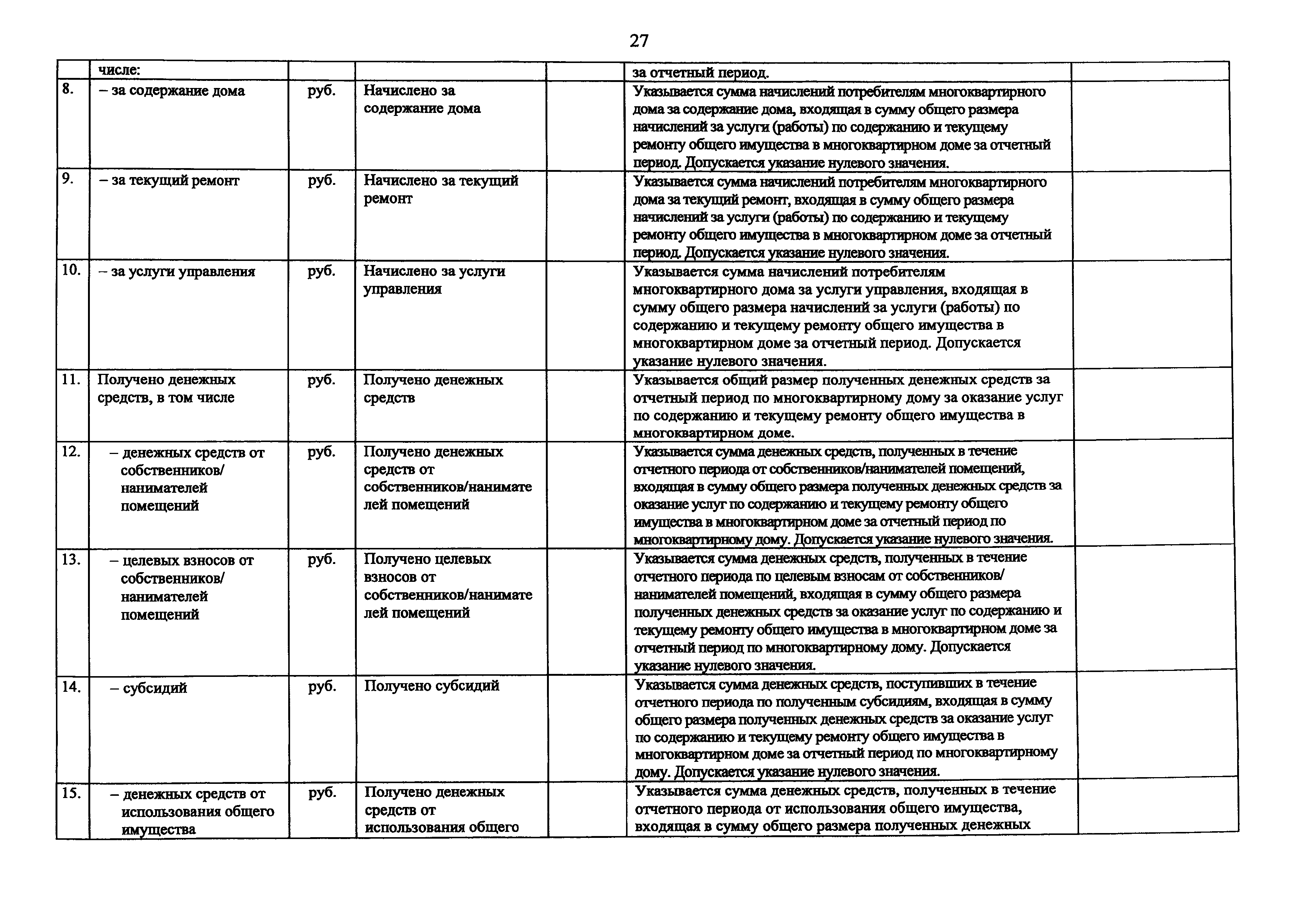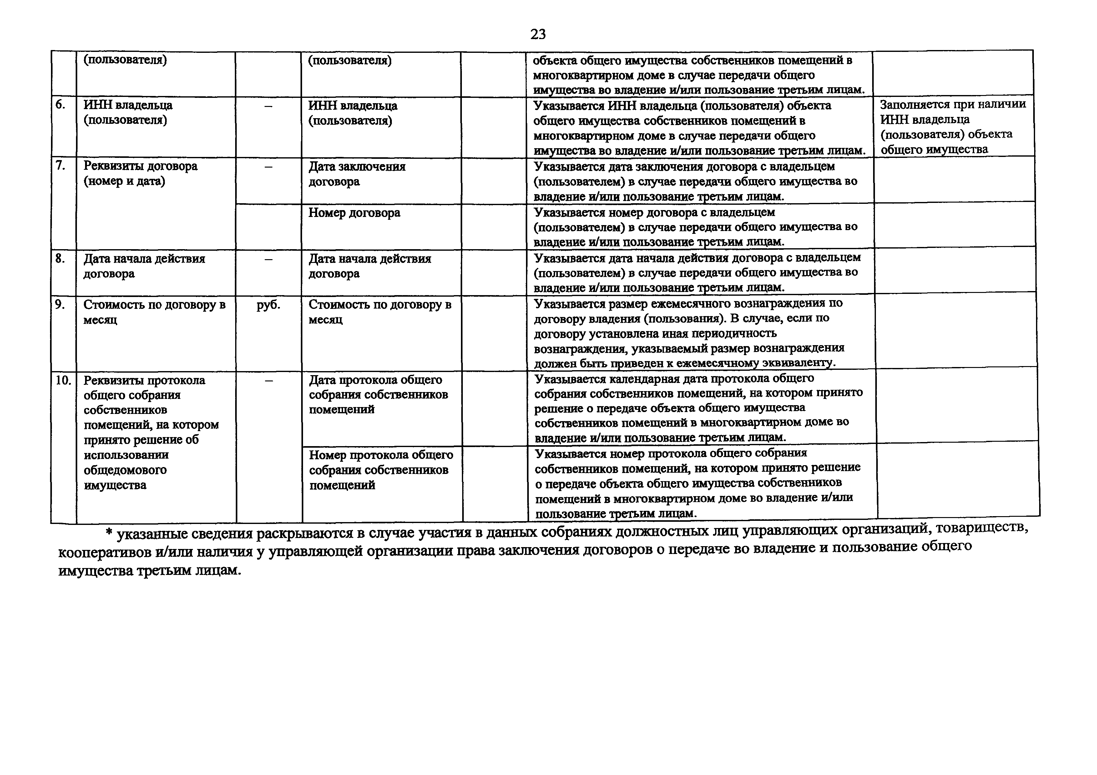 | Оглавление: | Форма 1. Информация об управляющей организации, товариществе, кооперативе Форма 1.1. Общая информация об управляющей организации, товариществе, кооперативе Форма 1.2. Сведения об основных показателях финансово-хозяйственной деятельности управляющей организации, товарищества, кооператива Форма 1.3. Информация о привлечении управляющей организации, товарищества, кооператива к административной ответственности за нарушения в сфере управления многоквартирными домами (заполняется по каждому факту привлечения) Форма 1.4. Перечень многоквартирных домов, управление которыми осуществляют управляющая организация, товарищество, кооператив Форма 1.5. Перечень многоквартирных домов, в отношении которых договоры управления с управляющей организацией были расторгнуты в предыдущем календарном году; перечень многоквартирных домов, собственники помещений в которых в предыдущем календарном году на общем собрании приняли решение о прекращении их объединения в товарищества для совместного управления общим имуществом в многоквартирных домах, а также перечень многоквартирных домов, в которых членами кооперативов в предыдущем календарном году на их общем собрании приняты решения о преобразовании кооперативов в товарищества Форма 2. Сведения о многоквартирном доме, управление которым осуществляет управляющая организация, товарищество, кооператив (заполняется по каждому многоквартирному дому) Форма 2.1. Общие сведения о многоквартирном доме Форма 2.2. Сведения об основных конструктивных элементах многоквартирного дома, оборудовании и системах инженерно-технического обеспечения, входящих в состав общего имущества в многоквартирном доме Форма 2.3. Сведения о выполняемых работах (оказываемых услугах) по содержанию и ремонту общего имущества в многоквартирном доме, иных услугах, связанных с достижением целей управления многоквартирным домом (заполняется по каждой выполняемой работе (оказываемой услуге) Форма 2.4. Сведения об оказываемых коммунальных услугах (заполняется по каждой коммунальной услуге) Форма 2.5. Сведения об использовании общего имущества в многоквартирном доме (заполняется по каждому используемому объекту общего имущества) Форма 2.6. Сведения о капитальном ремонте общего имущества в многоквартирном доме Форма 2.7. Сведения о проведенных общих собраниях собственников помещений в многоквартирном доме (заполняется по каждому собранию собственников помещений) Форма 2.8. Отчет об исполнении управляющей организацией договора управления, а также отчет о выполнении товариществом, кооперативом смет доходов и расходов за год Перечень используемых сокращений |