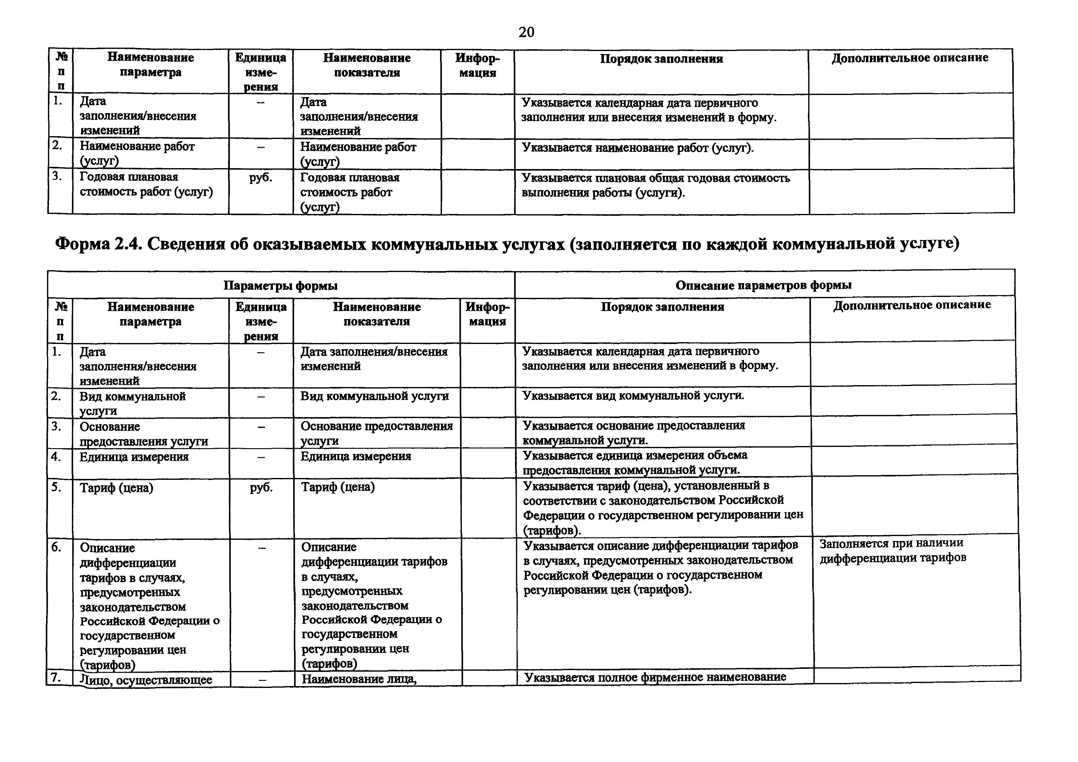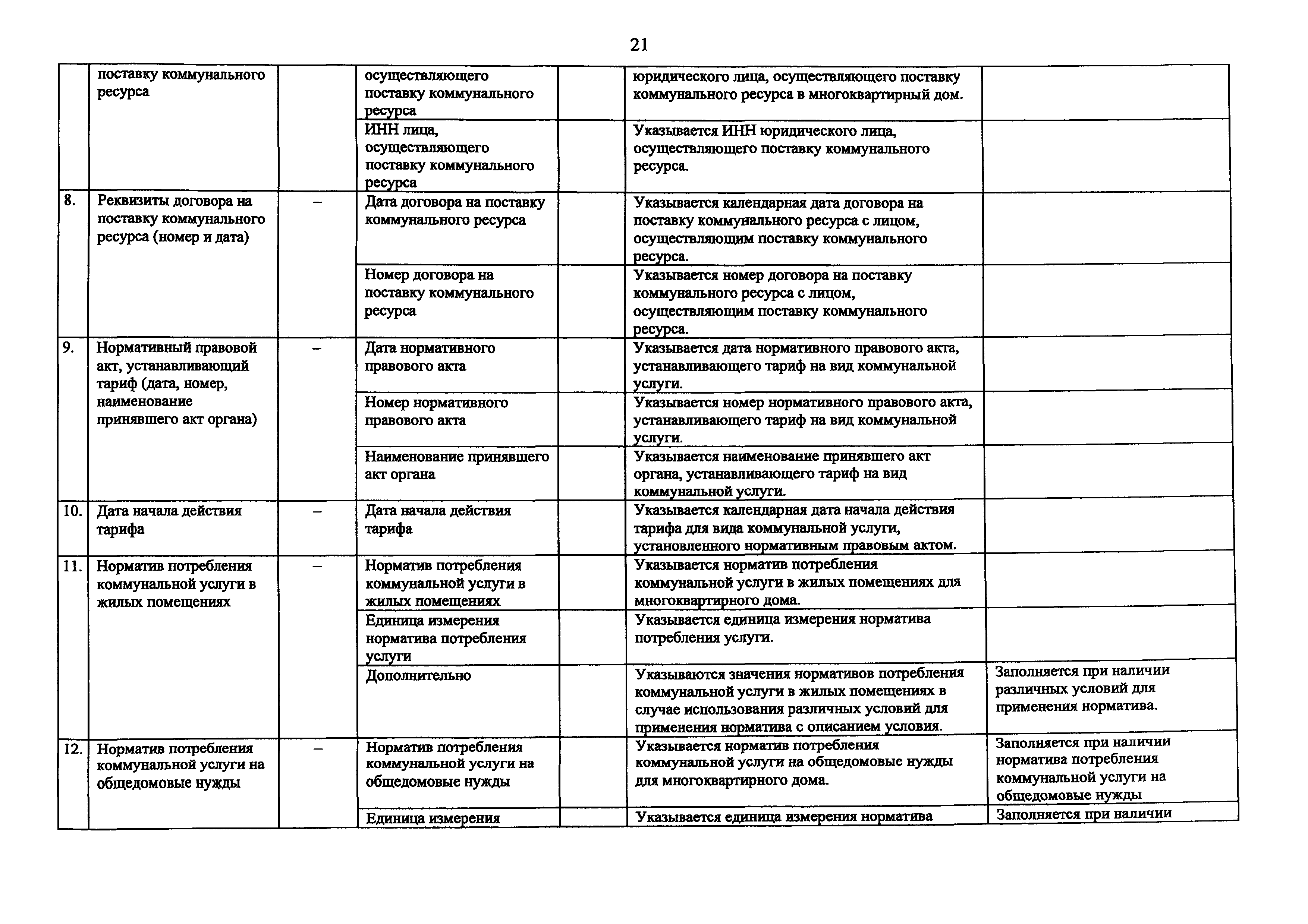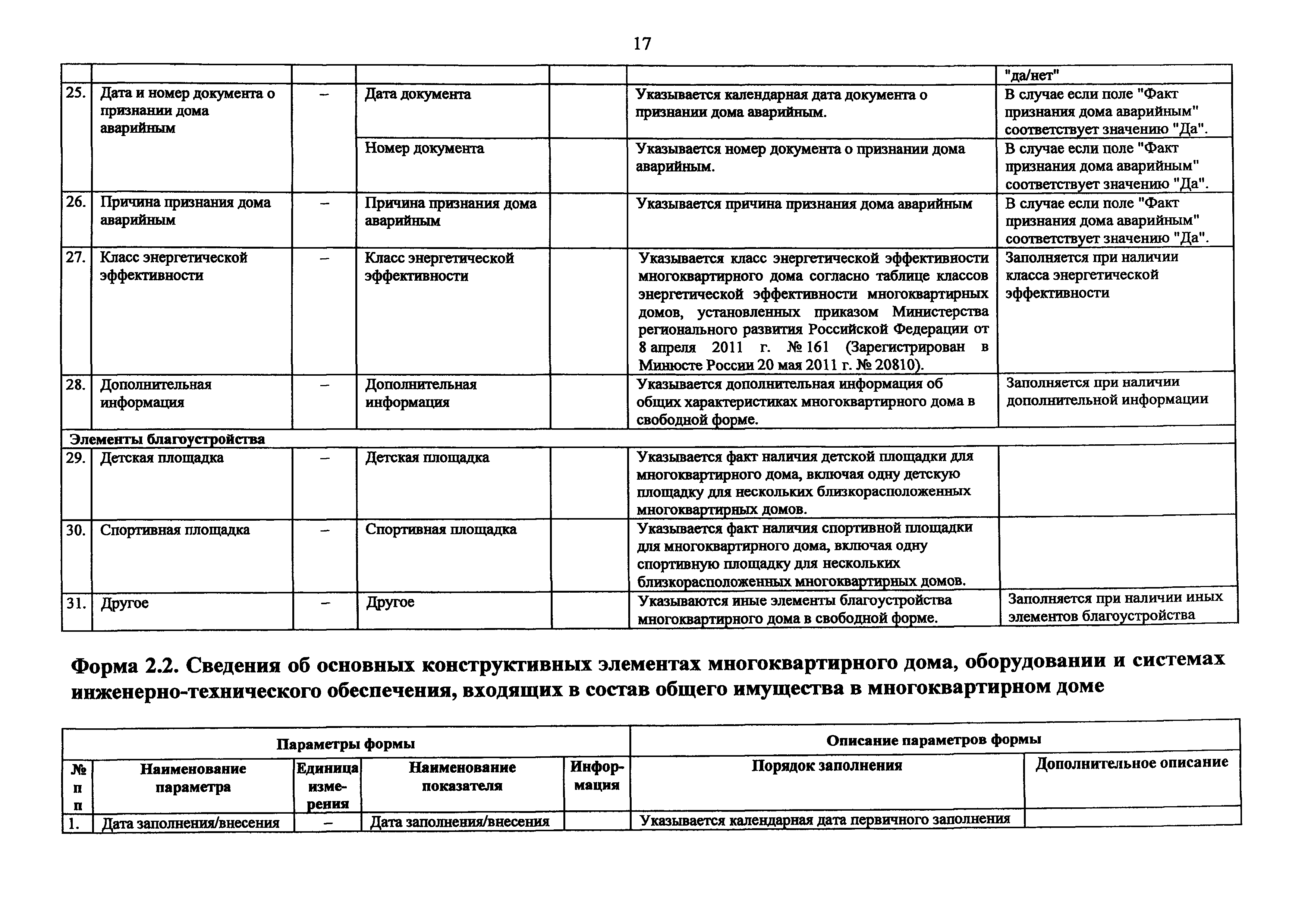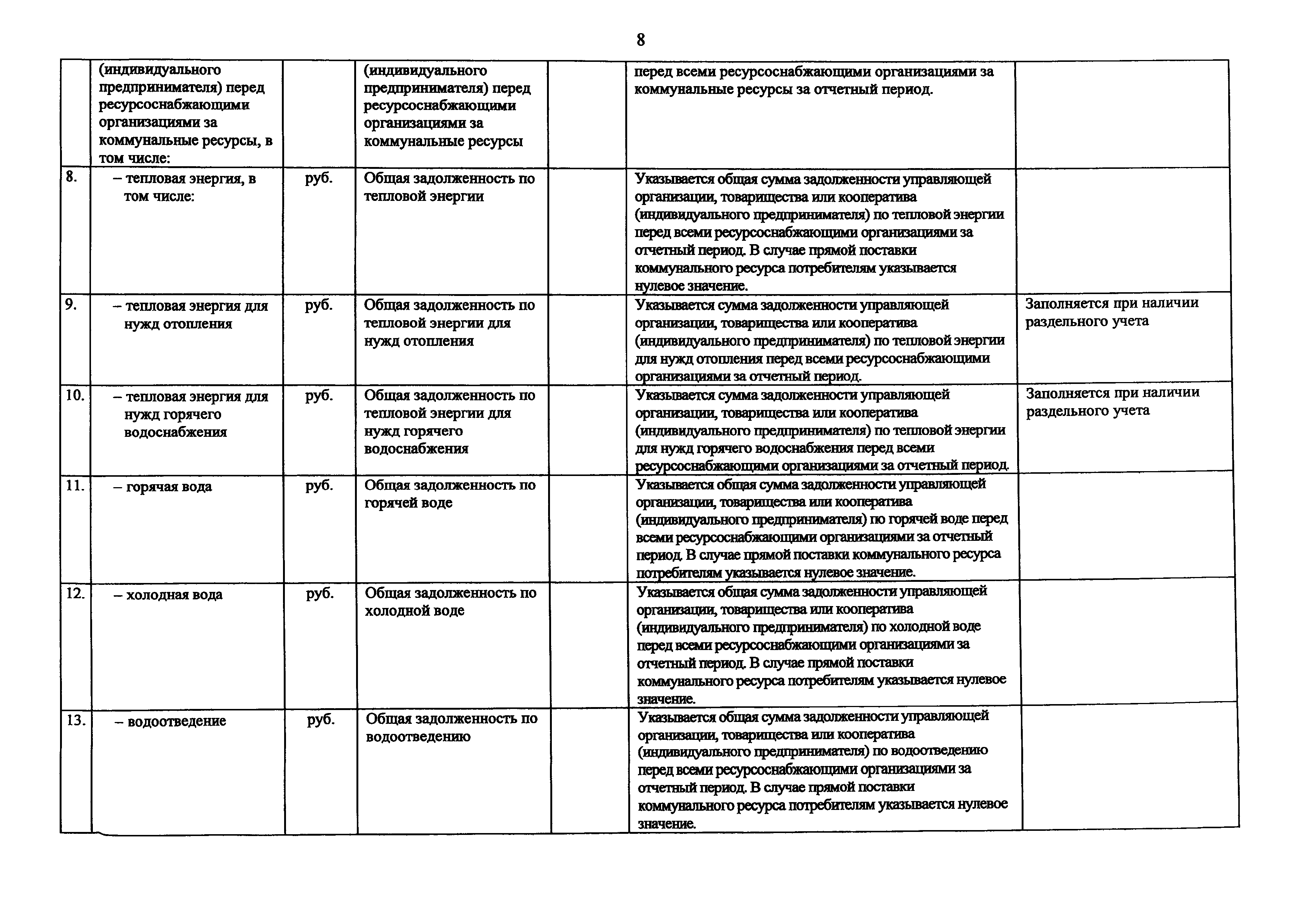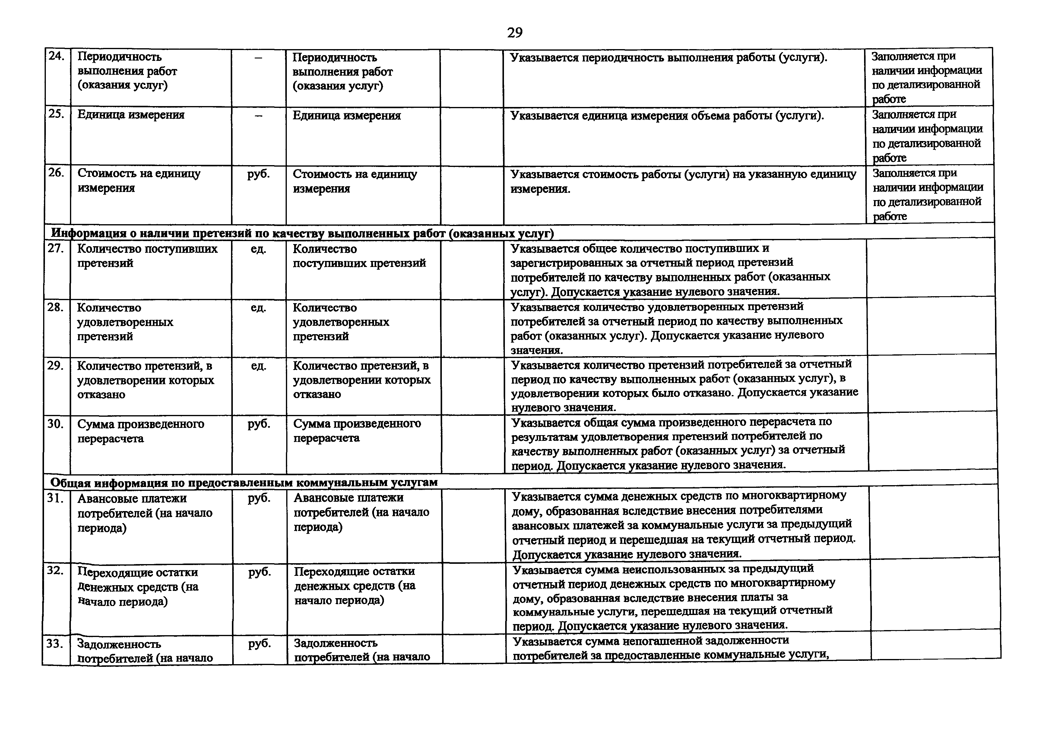 | Оглавление: | Форма 1. Информация об управляющей организации, товариществе, кооперативе Форма 1.1. Общая информация об управляющей организации, товариществе, кооперативе Форма 1.2. Сведения об основных показателях финансово-хозяйственной деятельности управляющей организации, товарищества, кооператива Форма 1.3. Информация о привлечении управляющей организации, товарищества, кооператива к административной ответственности за нарушения в сфере управления многоквартирными домами (заполняется по каждому факту привлечения) Форма 1.4. Перечень многоквартирных домов, управление которыми осуществляют управляющая организация, товарищество, кооператив Форма 1.5. Перечень многоквартирных домов, в отношении которых договоры управления с управляющей организацией были расторгнуты в предыдущем календарном году; перечень многоквартирных домов, собственники помещений в которых в предыдущем календарном году на общем собрании приняли решение о прекращении их объединения в товарищества для совместного управления общим имуществом в многоквартирных домах, а также перечень многоквартирных домов, в которых членами кооперативов в предыдущем календарном году на их общем собрании приняты решения о преобразовании кооперативов в товарищества Форма 2. Сведения о многоквартирном доме, управление которым осуществляет управляющая организация, товарищество, кооператив (заполняется по каждому многоквартирному дому) Форма 2.1. Общие сведения о многоквартирном доме Форма 2.2. Сведения об основных конструктивных элементах многоквартирного дома, оборудовании и системах инженерно-технического обеспечения, входящих в состав общего имущества в многоквартирном доме Форма 2.3. Сведения о выполняемых работах (оказываемых услугах) по содержанию и ремонту общего имущества в многоквартирном доме, иных услугах, связанных с достижением целей управления многоквартирным домом (заполняется по каждой выполняемой работе (оказываемой услуге) Форма 2.4. Сведения об оказываемых коммунальных услугах (заполняется по каждой коммунальной услуге) Форма 2.5. Сведения об использовании общего имущества в многоквартирном доме (заполняется по каждому используемому объекту общего имущества) Форма 2.6. Сведения о капитальном ремонте общего имущества в многоквартирном доме Форма 2.7. Сведения о проведенных общих собраниях собственников помещений в многоквартирном доме (заполняется по каждому собранию собственников помещений) Форма 2.8. Отчет об исполнении управляющей организацией договора управления, а также отчет о выполнении товариществом, кооперативом смет доходов и расходов за год Перечень используемых сокращений |