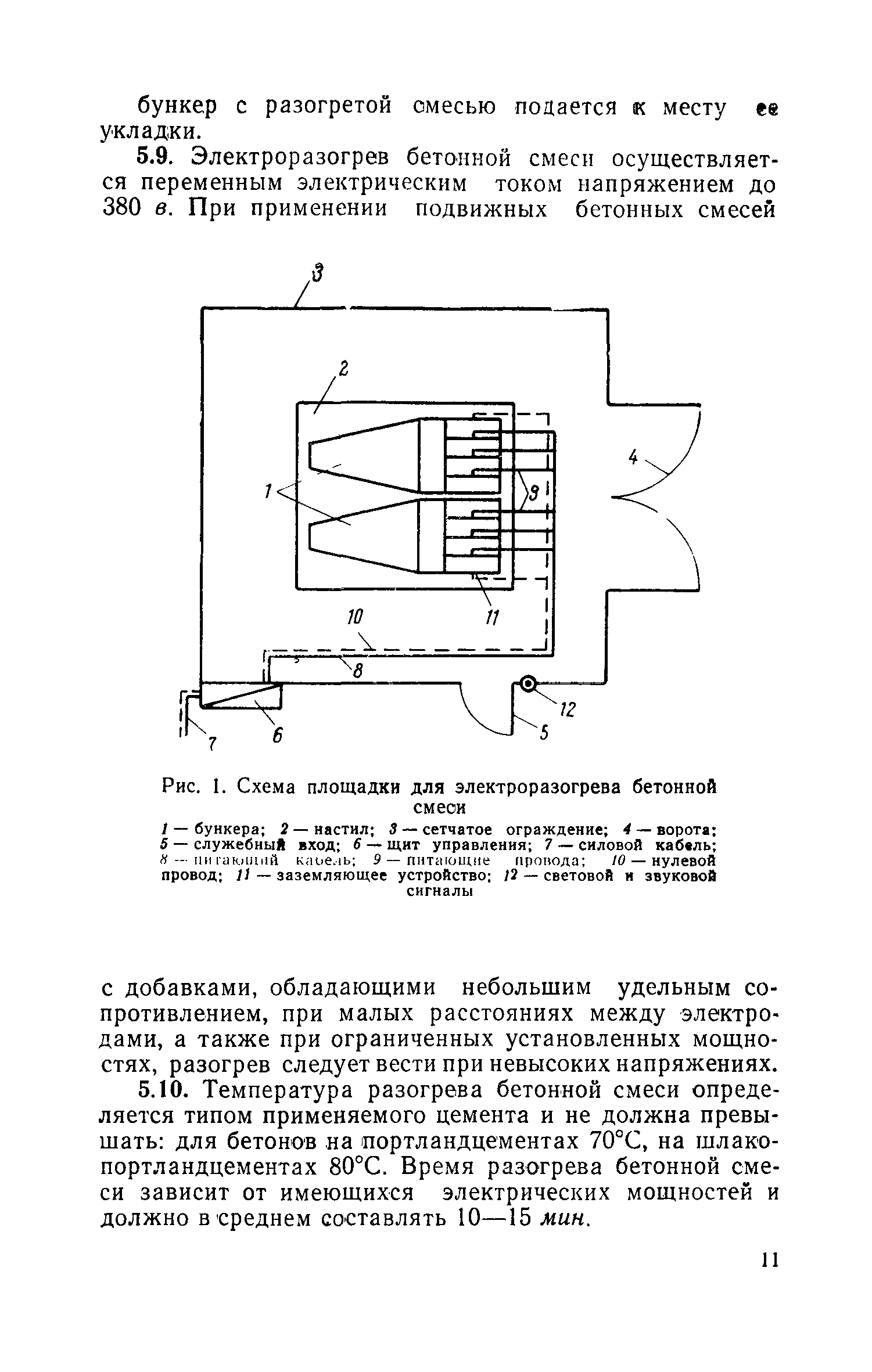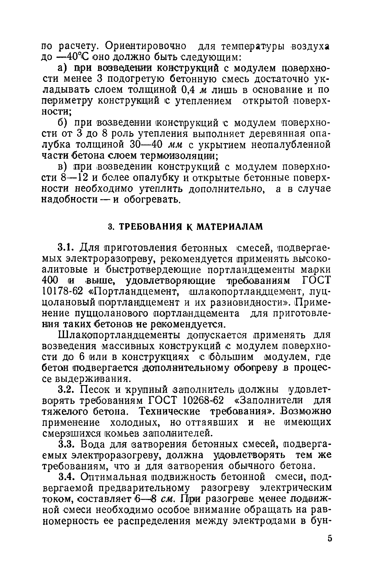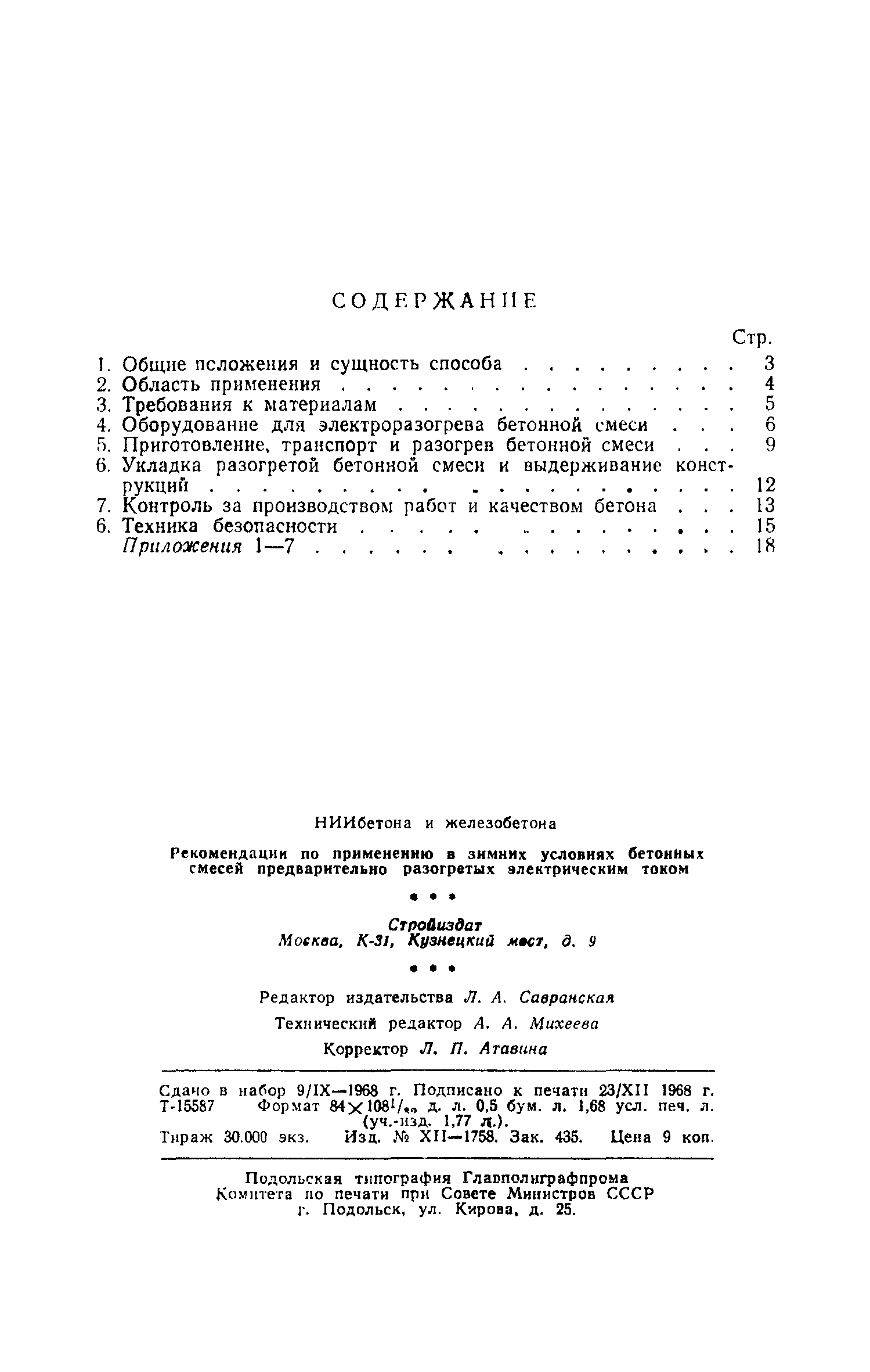 Рекомендации по применению в зимних условиях бетонных смесей, предварительно разогретых электрическим током| Статус: | справочные материалы, мп, тпр | | Название рус.: | Рекомендации по применению в зимних условиях бетонных смесей, предварительно разогретых электрическим током | | Дата добавления в базу: | 12.02.2016 | | Дата актуализации: | 01.01.2021 | | Область применения: | В Рекомендациях приведены данные по области применения предварительно разогретых смесей, требования к материалам, оборудованию для электроразогрева, приготовлению, транспорту, режимам электроразогрева и укладке бетонной смеси, а также по контролю качества и технике безопасности. | | Оглавление: | 1. Общие положения и сущность способа 2. Область применения 3. Требования к материалам 4. Оборудование для электроразогрева бетонной смеси 5. Приготовление, транспорт и разогрев бетонной смеси 6. Укладка разогретой бетонной смеси и выдерживание конструкций 7. Контроль за производством работ и качеством бетона . 8. Техника безопасности Приложение 1. Расчет оборудования Приложение 2. Основные технические данные трехфазных двухобмоточных силовых трансформаторов типа ТМ или ТС* Приложение 3. Методика определения удельного сопротивления бетона в строительной лаборатории Приложение 4. Расчет продолжительности остывания бетона в конструкции до 0 градусов Цельсия Приложение 6. Журнал контроля прочности бетона, укладываемого в разогретом состоянии Приложение 5. Журнал контроля температур бетона, укладываемого в разогретом состоянии Приложение 7. Расчет защитного заземления | | Разработан: | НИИЖБ Госстроя СССР