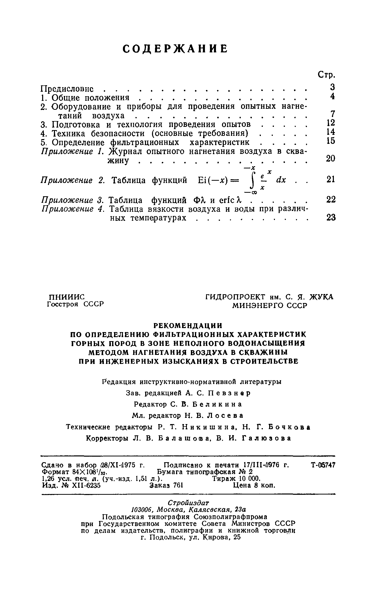 | Оглавление: | Предисловие 1. Общие положения 2. Оборудование и приборы для проведения опытных нагнетаний воздуха 3. Подготовка и технология проведения опытов 4. Техника безопасности (основные требования) 5. Определение фильтрационных характеристик Приложение 1. Журнал опытного нагнетания воздуха в скважину Приложение 2. Таблица функций Приложение 3. Таблица функций Приложение 4. Таблица вязкости воздуха и воды при различных температурах |