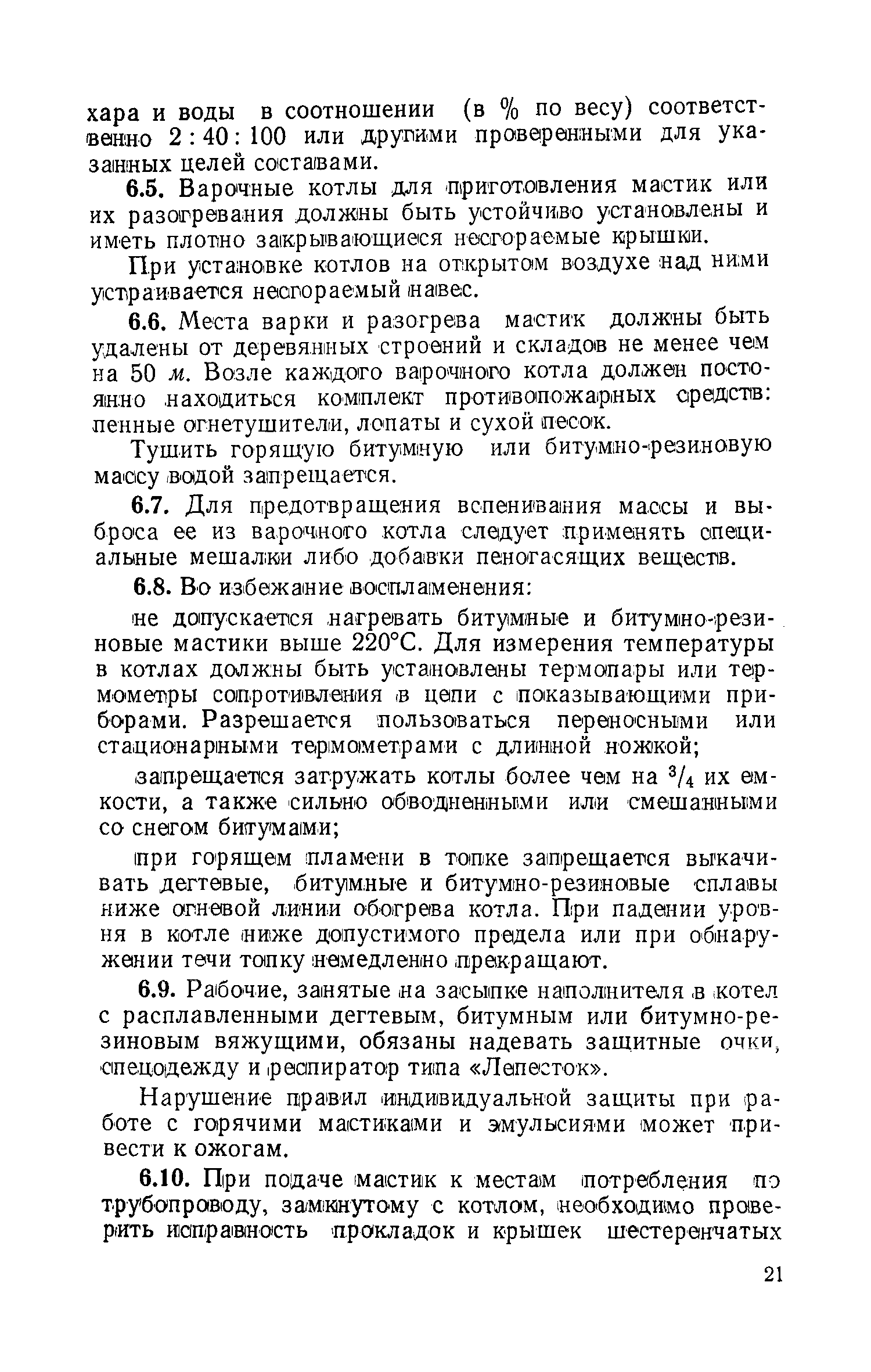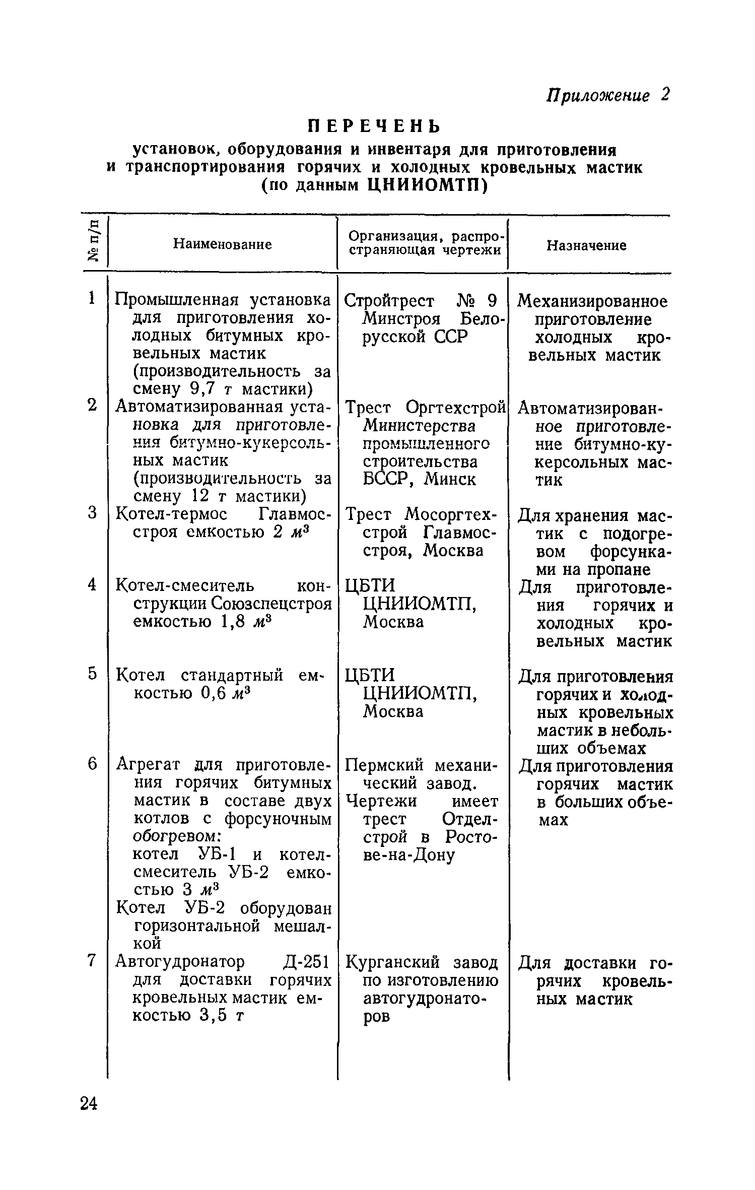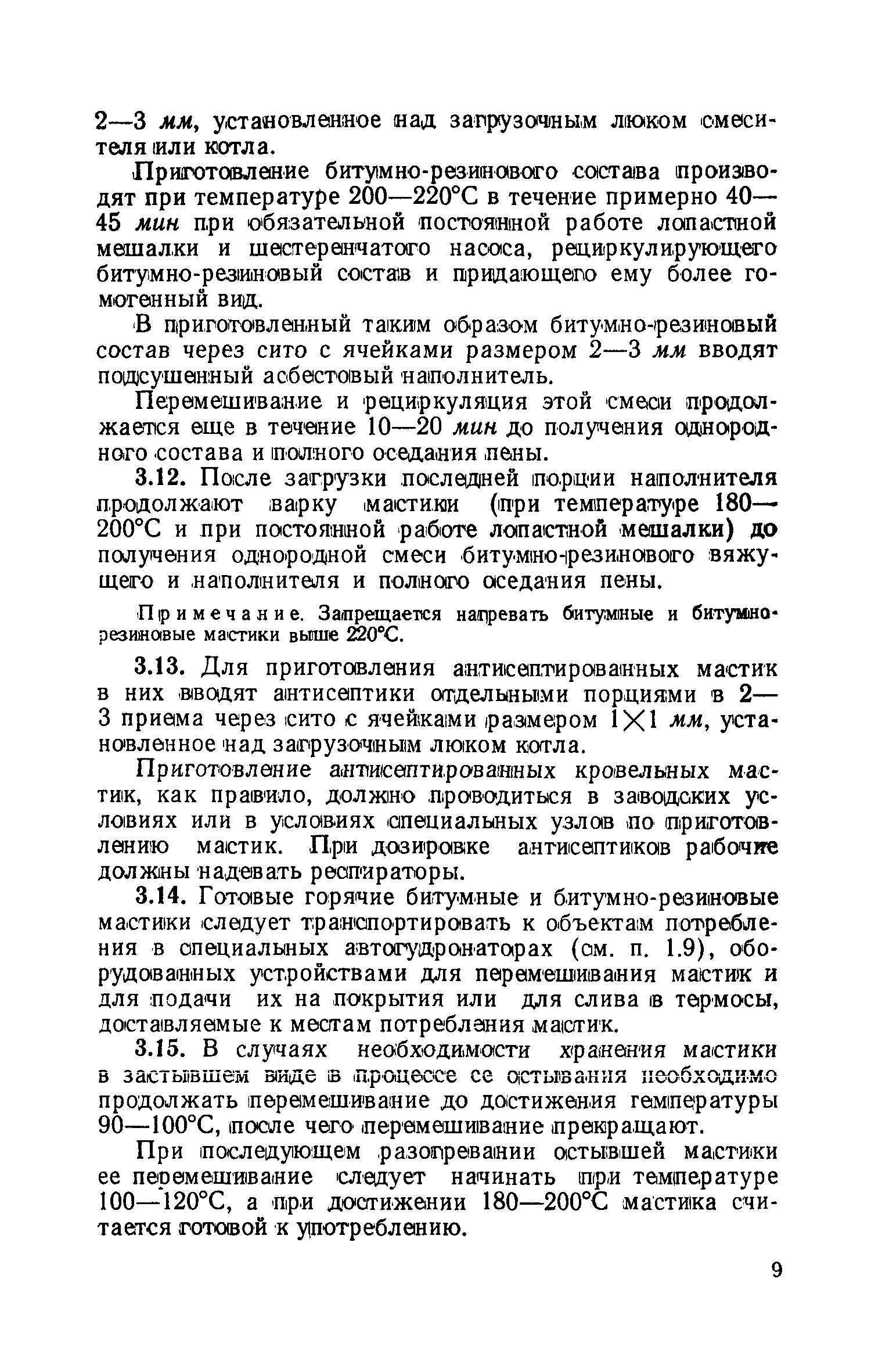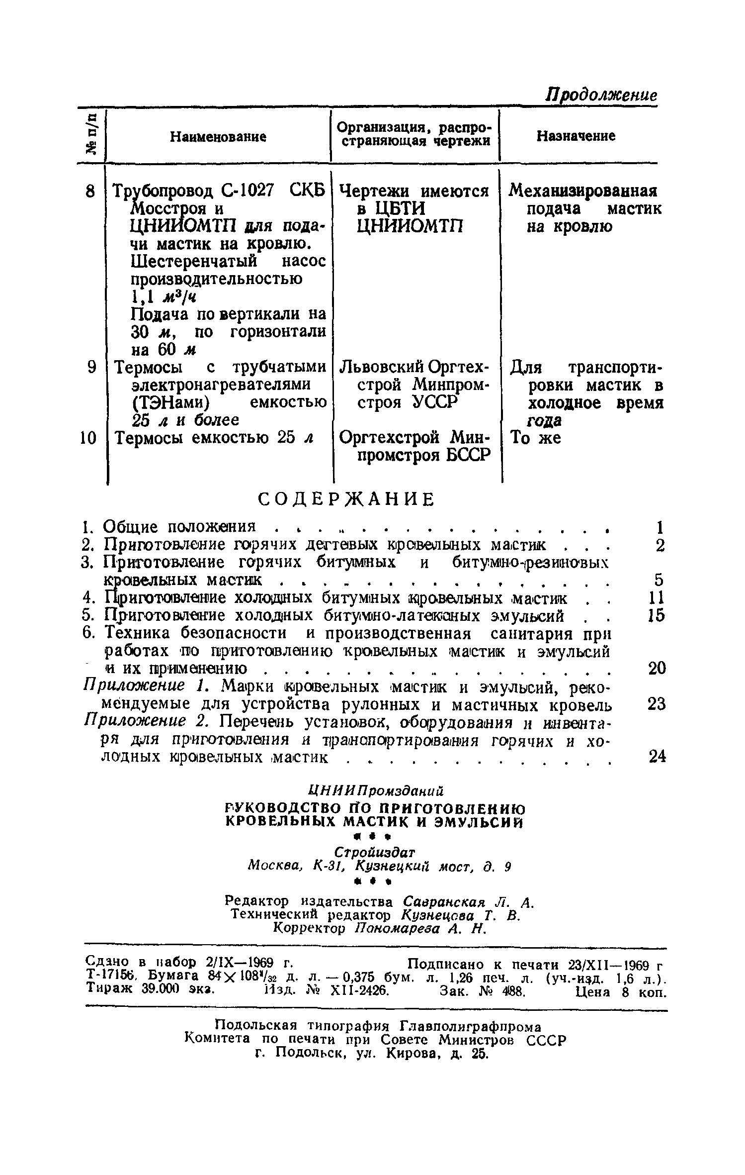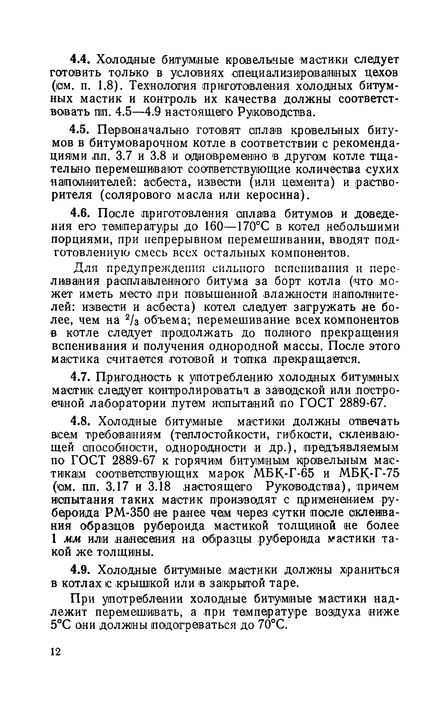| Оглавление: | 1 Общие положения 2 Приготовление горячих дегтевых кровельных мастик 3 Приготовление горячих битумных и битумно-резиновых кровельных мастик 4 Приготовление холодных битумных кровельных мастик 5 Приготовление холодных битумно-латексных эмульсий 6 Техника безопасности и производственная санитария при работах по приготовлению кровельных мастик и эмульсий и их применению Приложение 1. Марки кровельных мастик и эмульсий, рекомендуемые для устройства рулонных и мастичных кровель Приложение 2. Перечень установок, оборудования и инвентаря для приготовления и транспортирования горячих и холодных кровельных мастик |