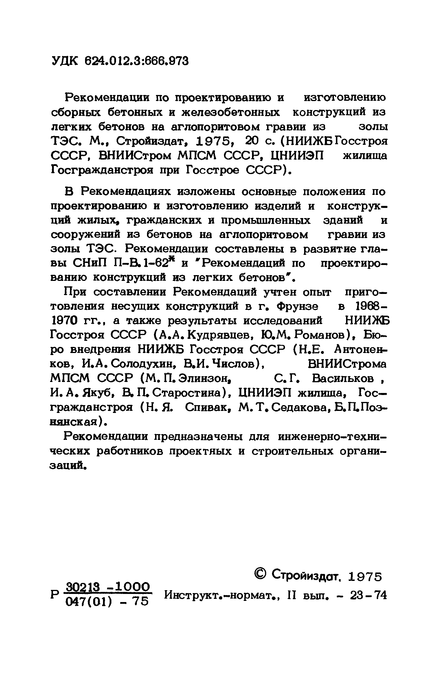 | Название рус.: | Рекомендации по проектированию и изготовлению сборных бетонных и железобетонных конструкций из легких бетонов на аглопоритовом гравии из золы ТЭС |