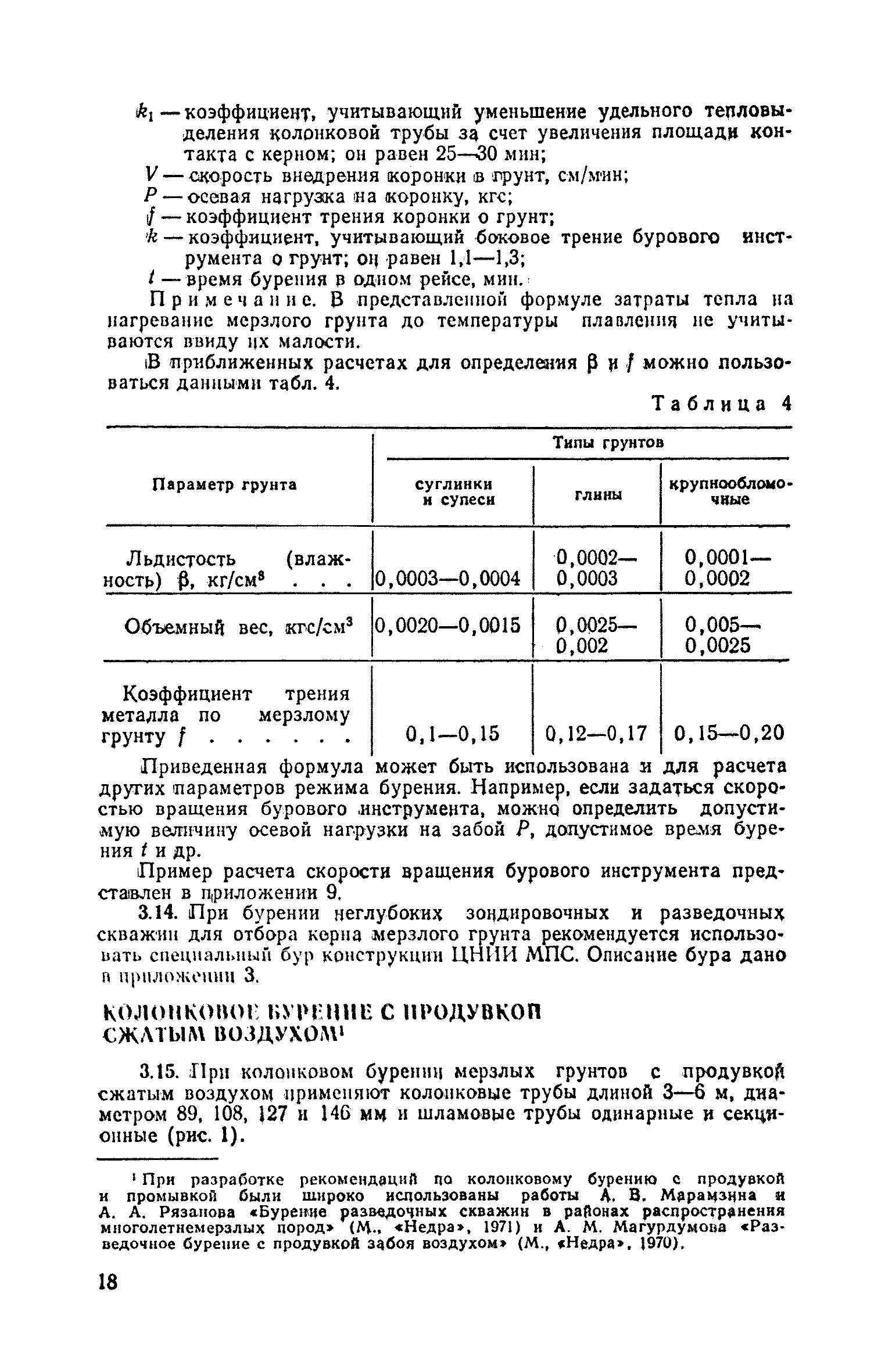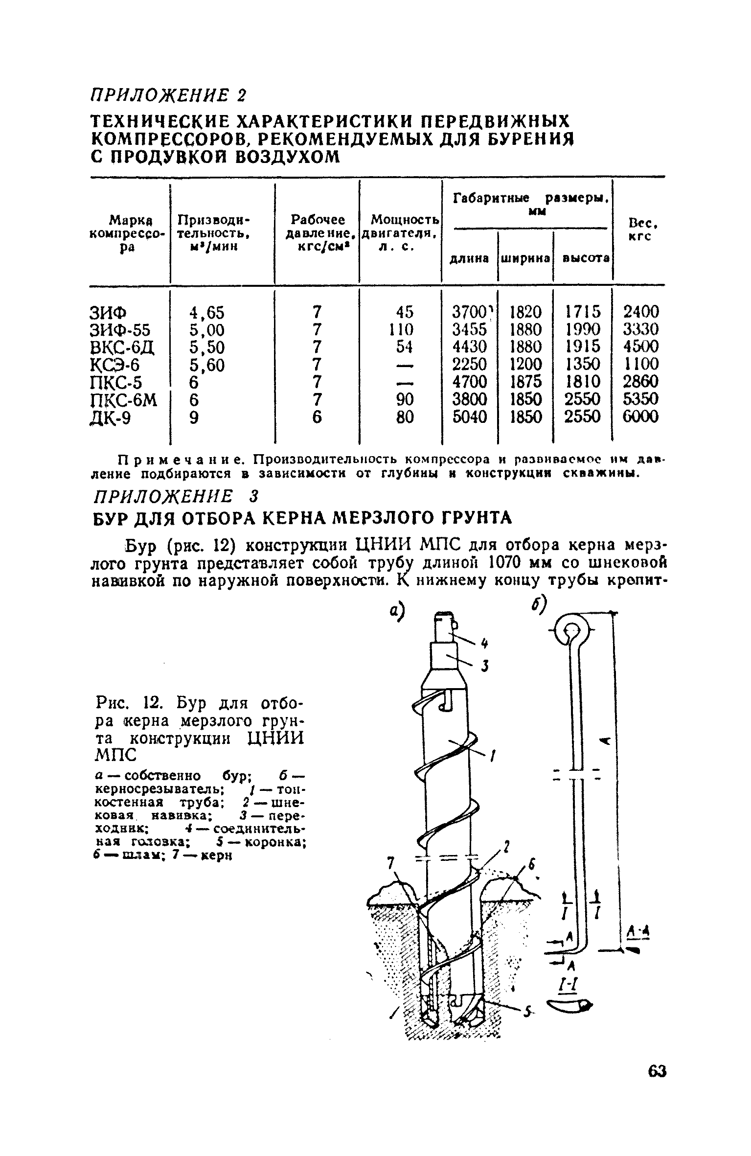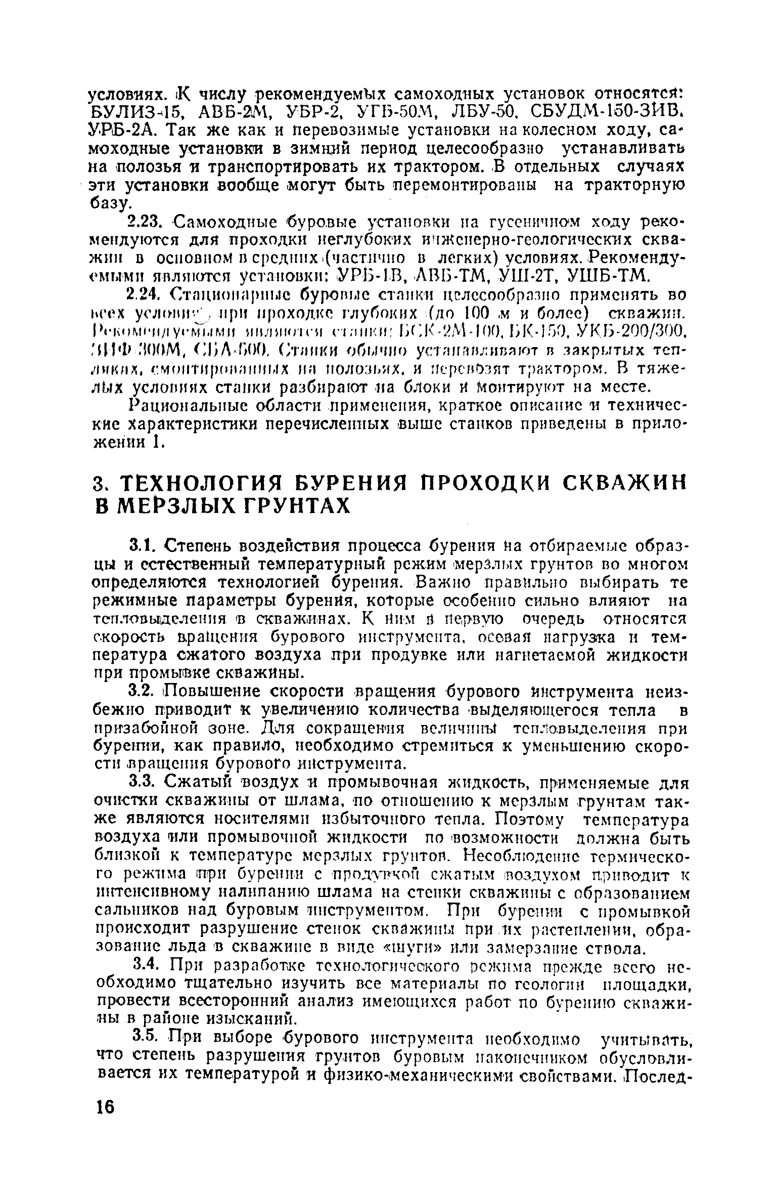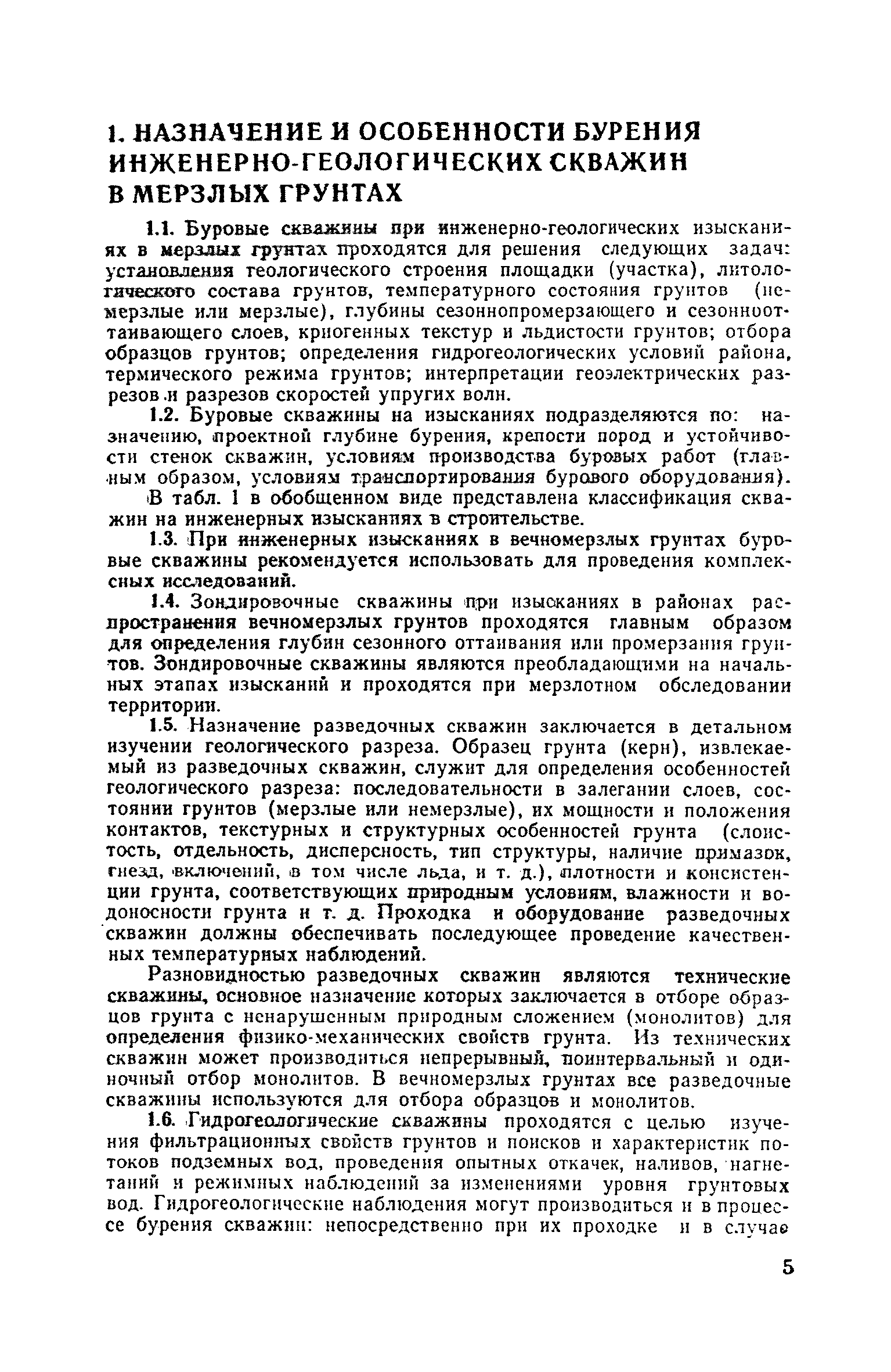 | Оглавление: | Введение 1. Назначение и особенности бурения инженерно-геологических скважин в мерзлых грунтах 2. Способы и технические средства бурения скважин Выбор способа бурения Выбор буровых установок 3. Технология бурения проходки скважин в мерзлых грунтах Колонковое бурение "всухую" Колонковое бурение с продувкой сжатым воздухом Колонковое бурение с промывкой охлажденными солевыми и глинистыми растворами Ударно-канатное бурение кольцевым забоем Вибрационное (виброударное) бурение Шнековое бурение Ручное ударно-вращательное бурение 4. Отбор и сохранение образцов мерзлого грунта 5. Обсадка трубами при бурения скважин в мерзлых грунтах 6. Организация буровых работ и оборудование рабочей площадки 7. Правила безопасного ведения буровых работ Приложение 1. Краткое описание и технические характеристики буровых станков и установок для проходки инженерно-геологических скважин в мерзлых грунтах Приложение 2. Технические характеристики передвижных компрессоров, рекомендуемых для бурения с продувкой воздухом Приложение 3. Бур для отбора керна мерзлого грунта Приложение 4. Кернобратель КП-1 конструкции А.М. Пчелинцева для отбора образцов мерзлого грунта и другие керноотборные устройства Приложение 5. Приспособления и устройства для осушения и охлаждения сжатого воздуха при бурении скважин в мерзлых грунтах Приложение 6. Герметизирующие устройства при бурении скважин с продувкой сжатым воздухом Приложение 7. Шламоуловители Приложение 8. Обвязка скважины и контрольно-измерительная аппаратура при бурении скважин с продувкой воздухом Приложение 9. Пример расчета допустимой скорости вращения бурового инструмента при отборе керна мерзлого грунта колонковым способом "всухую" |