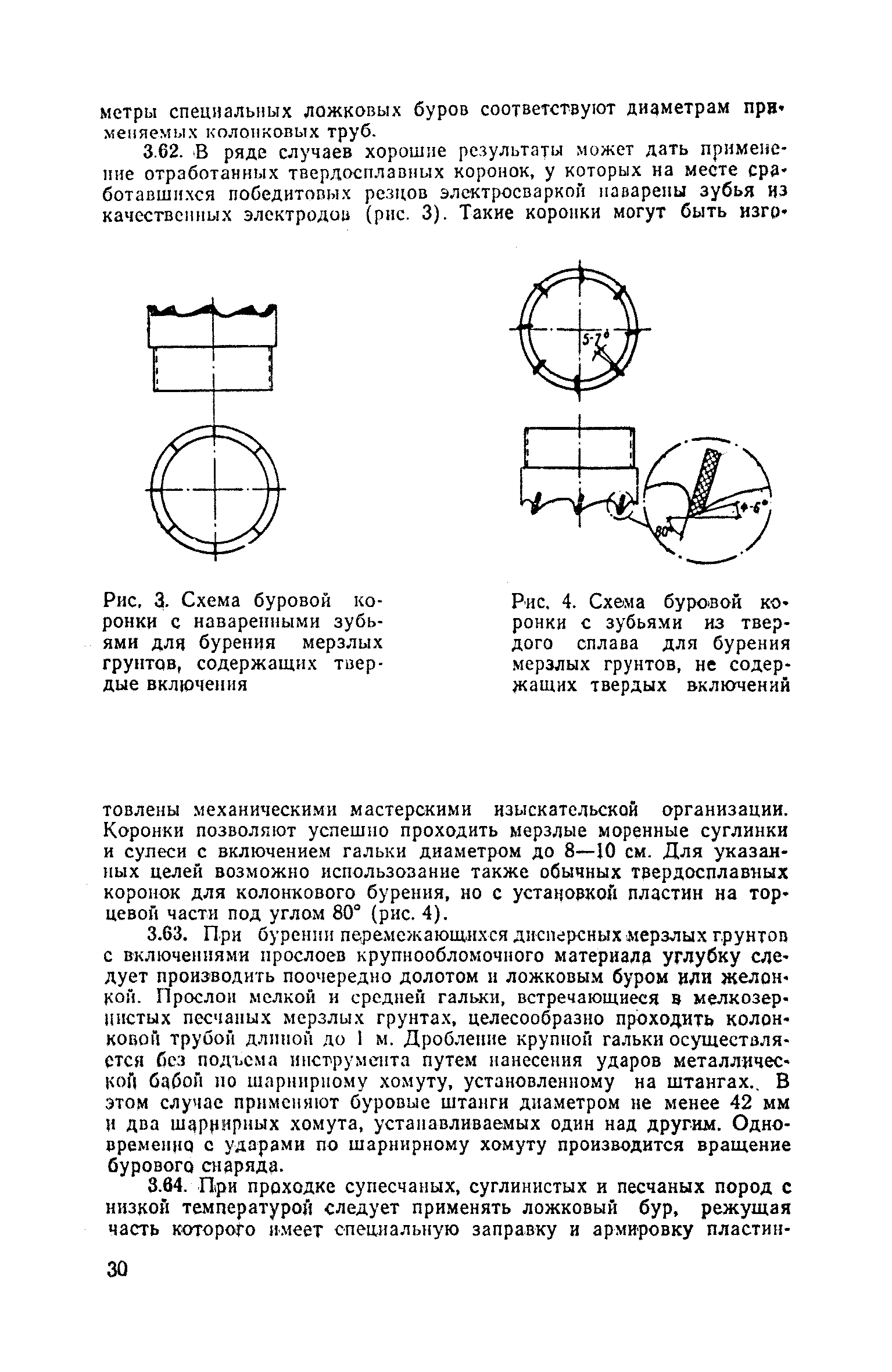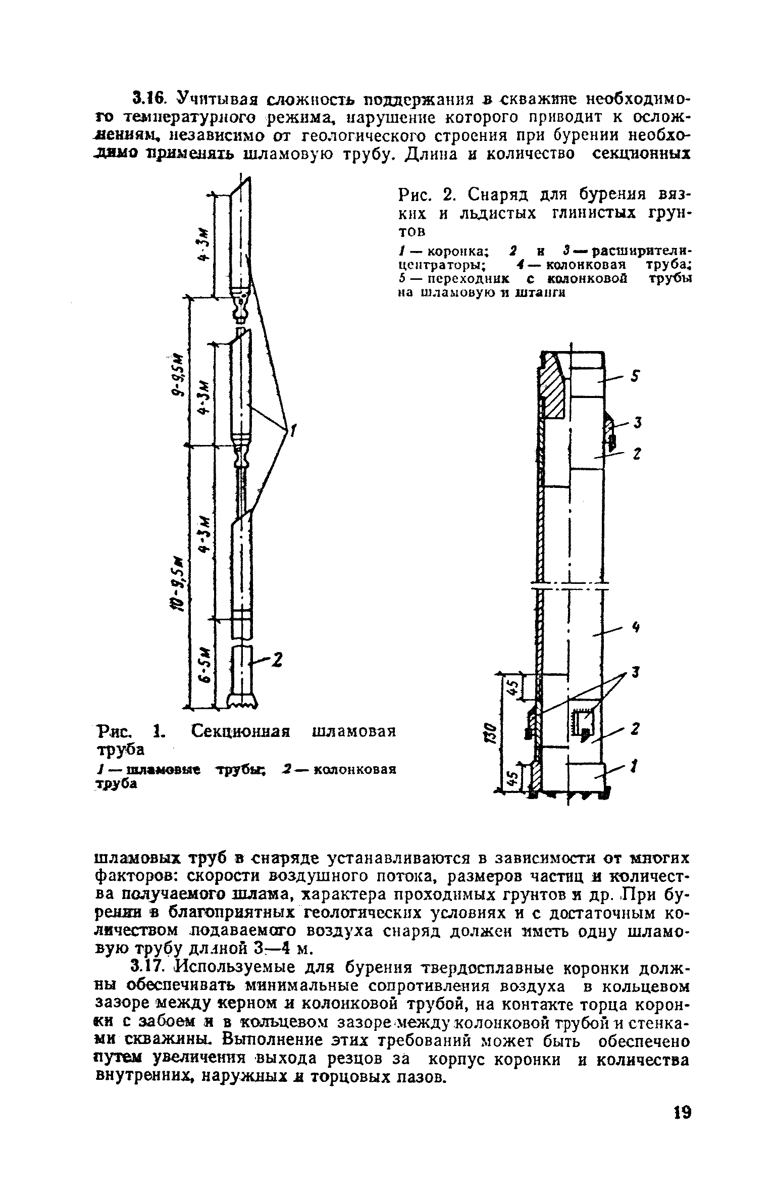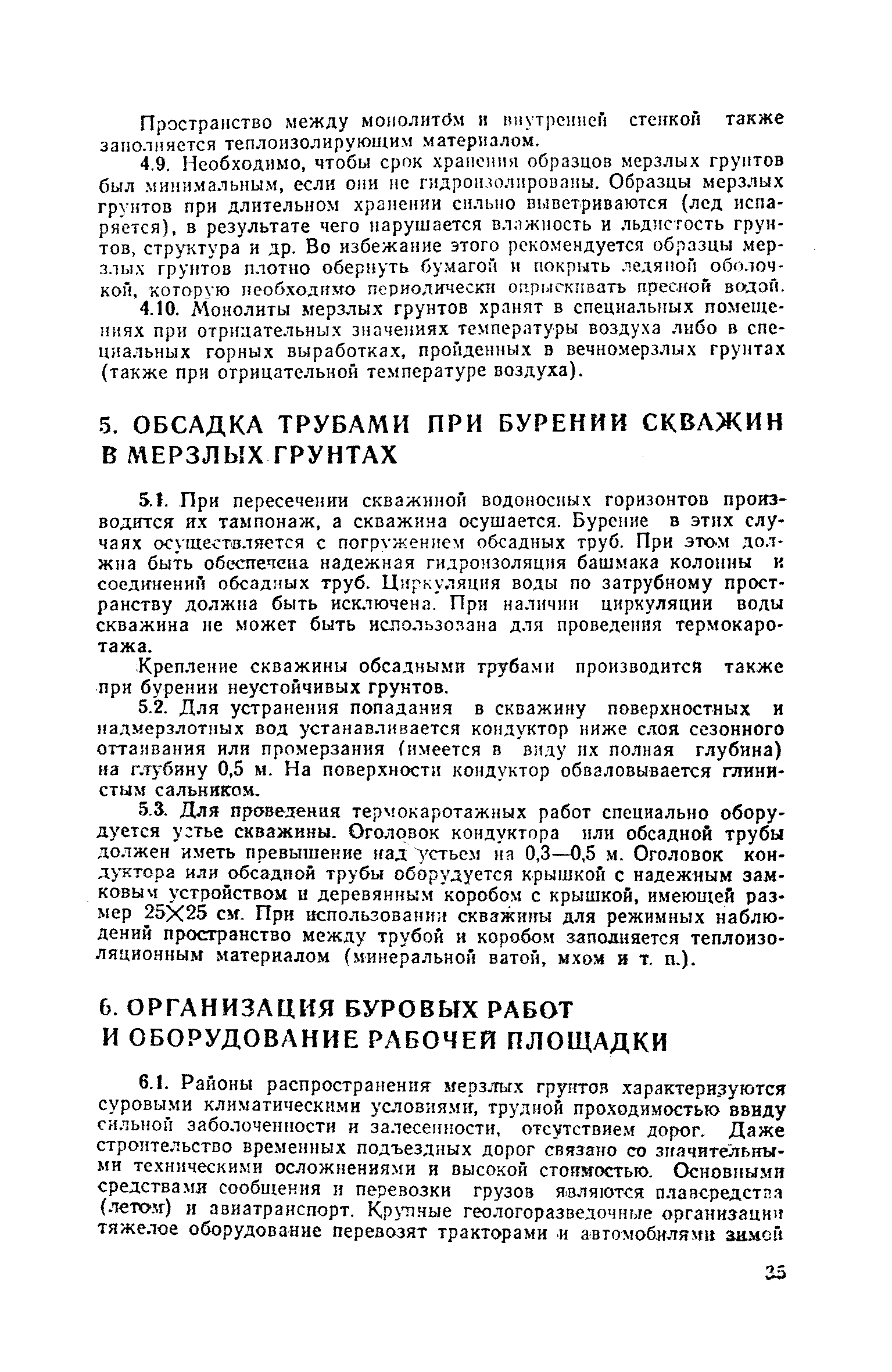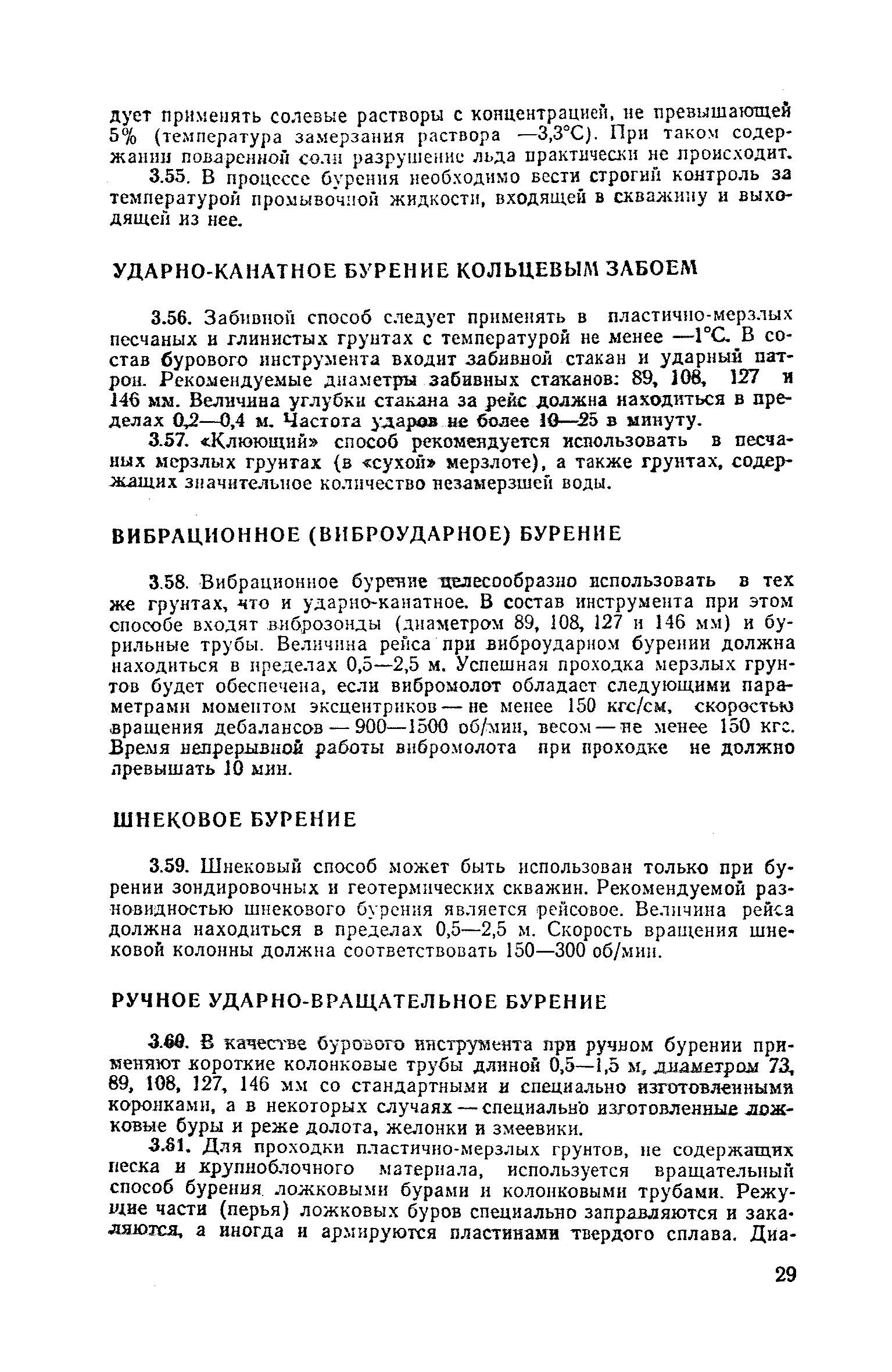 | Оглавление: | Введение 1. Назначение и особенности бурения инженерно-геологических скважин в мерзлых грунтах 2. Способы и технические средства бурения скважин Выбор способа бурения Выбор буровых установок 3. Технология бурения проходки скважин в мерзлых грунтах Колонковое бурение "всухую" Колонковое бурение с продувкой сжатым воздухом Колонковое бурение с промывкой охлажденными солевыми и глинистыми растворами Ударно-канатное бурение кольцевым забоем Вибрационное (виброударное) бурение Шнековое бурение Ручное ударно-вращательное бурение 4. Отбор и сохранение образцов мерзлого грунта 5. Обсадка трубами при бурения скважин в мерзлых грунтах 6. Организация буровых работ и оборудование рабочей площадки 7. Правила безопасного ведения буровых работ Приложение 1. Краткое описание и технические характеристики буровых станков и установок для проходки инженерно-геологических скважин в мерзлых грунтах Приложение 2. Технические характеристики передвижных компрессоров, рекомендуемых для бурения с продувкой воздухом Приложение 3. Бур для отбора керна мерзлого грунта Приложение 4. Кернобратель КП-1 конструкции А.М. Пчелинцева для отбора образцов мерзлого грунта и другие керноотборные устройства Приложение 5. Приспособления и устройства для осушения и охлаждения сжатого воздуха при бурении скважин в мерзлых грунтах Приложение 6. Герметизирующие устройства при бурении скважин с продувкой сжатым воздухом Приложение 7. Шламоуловители Приложение 8. Обвязка скважины и контрольно-измерительная аппаратура при бурении скважин с продувкой воздухом Приложение 9. Пример расчета допустимой скорости вращения бурового инструмента при отборе керна мерзлого грунта колонковым способом "всухую" |