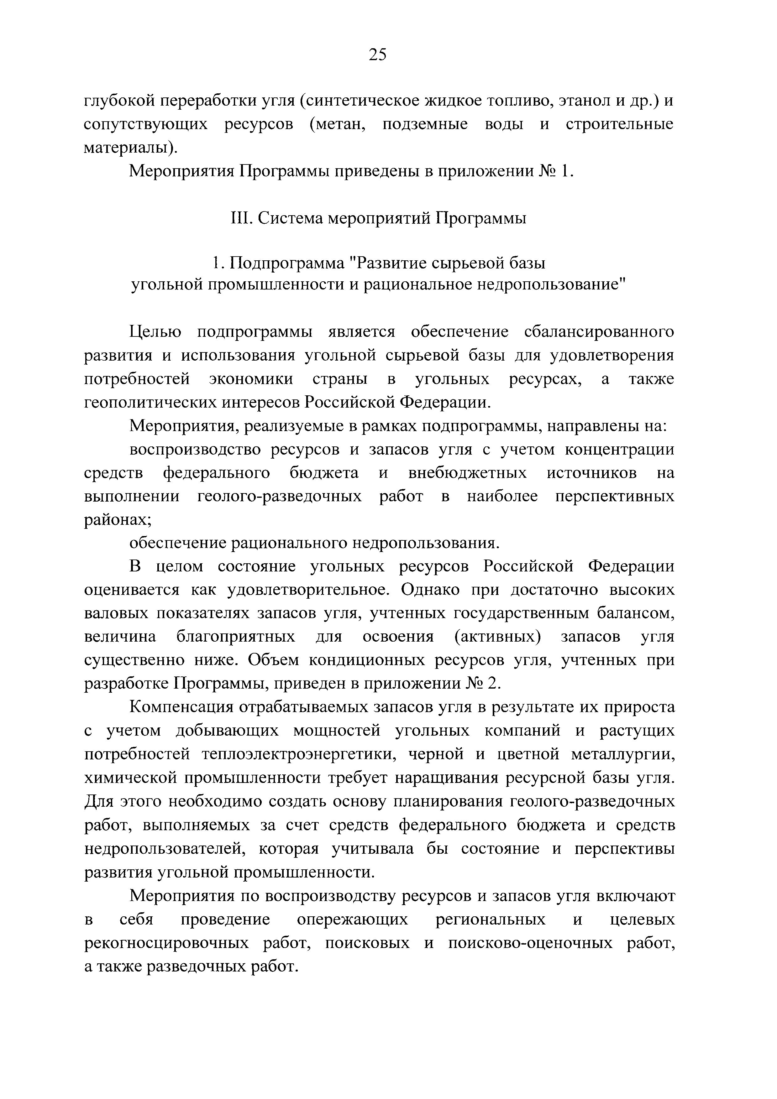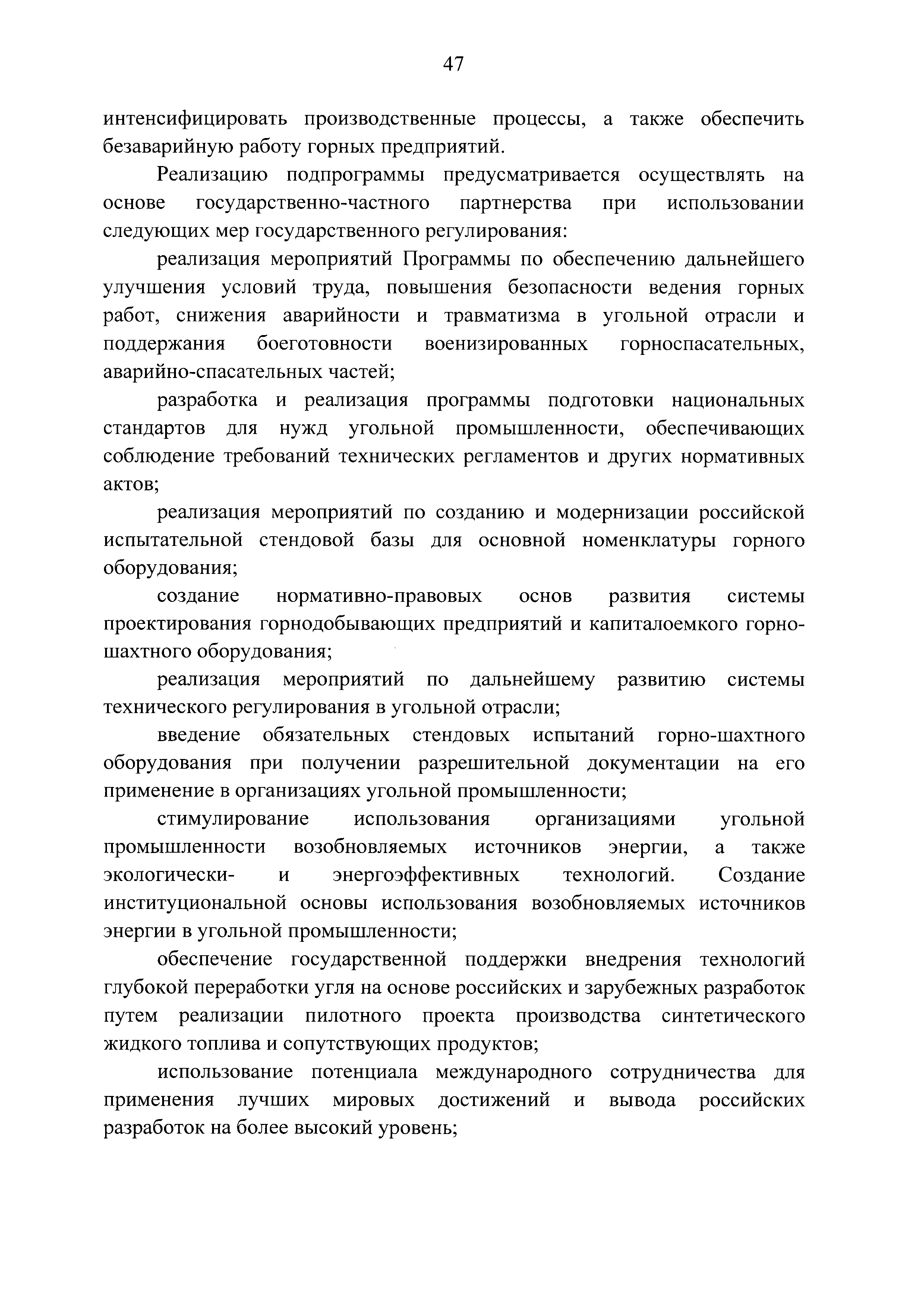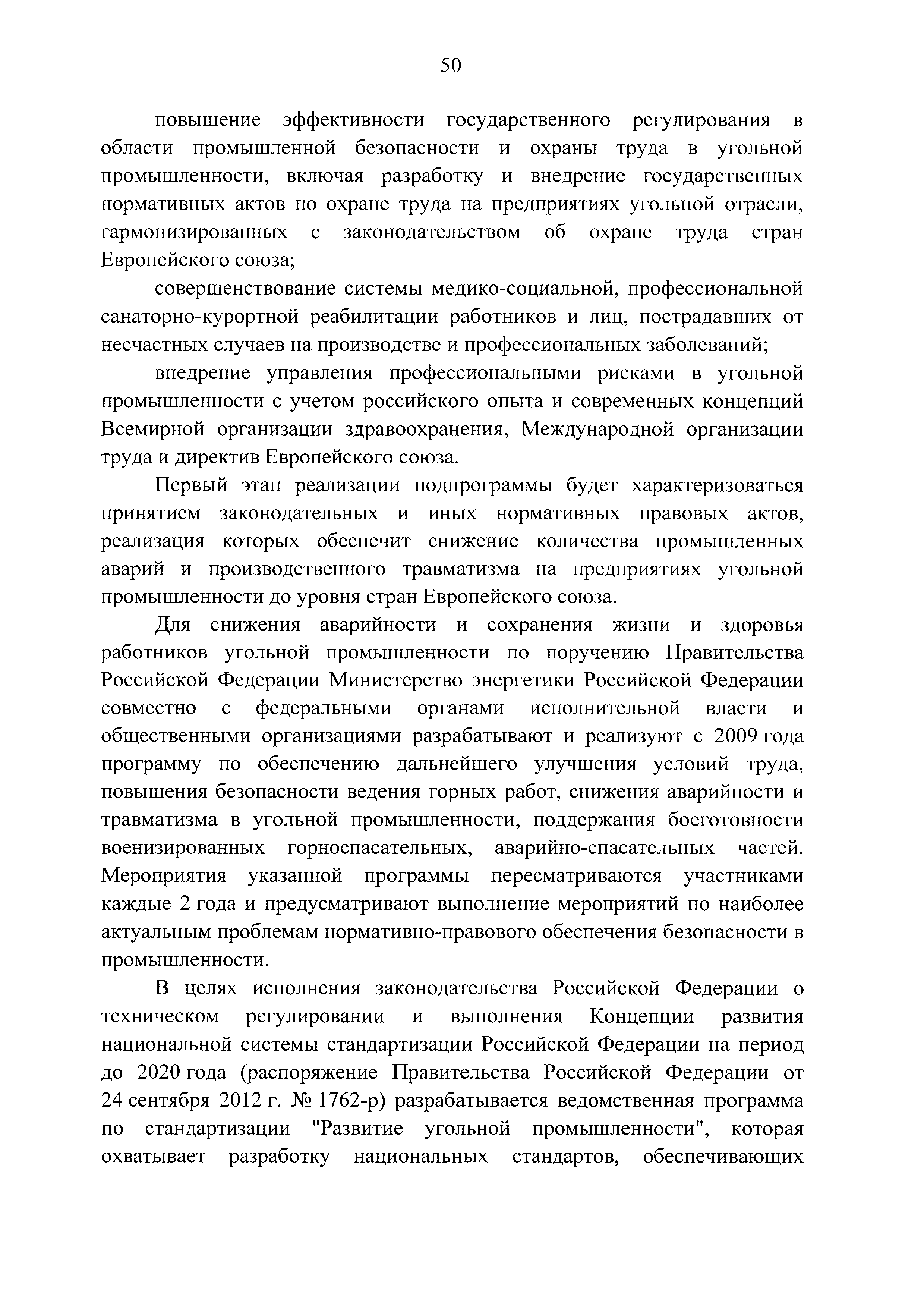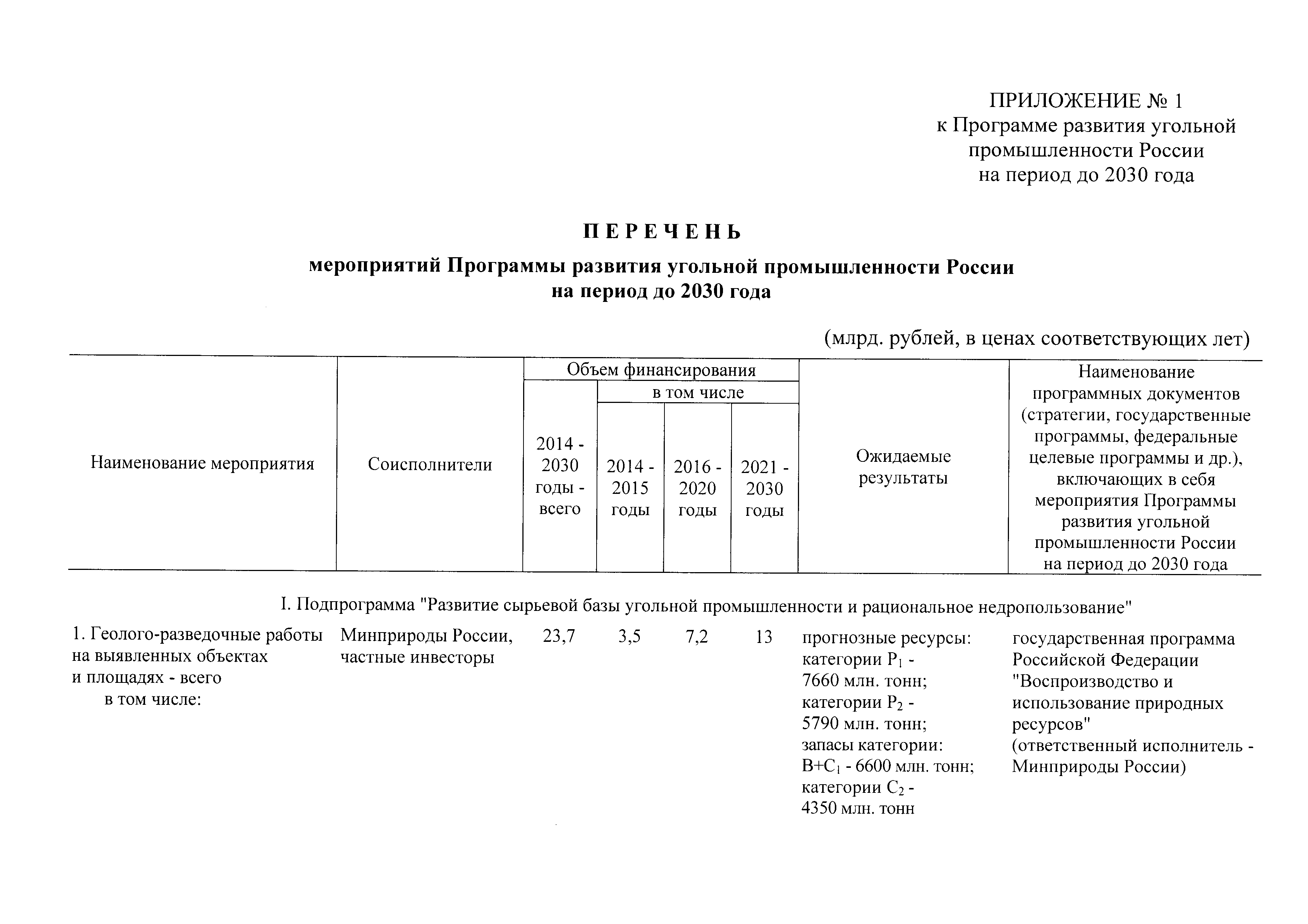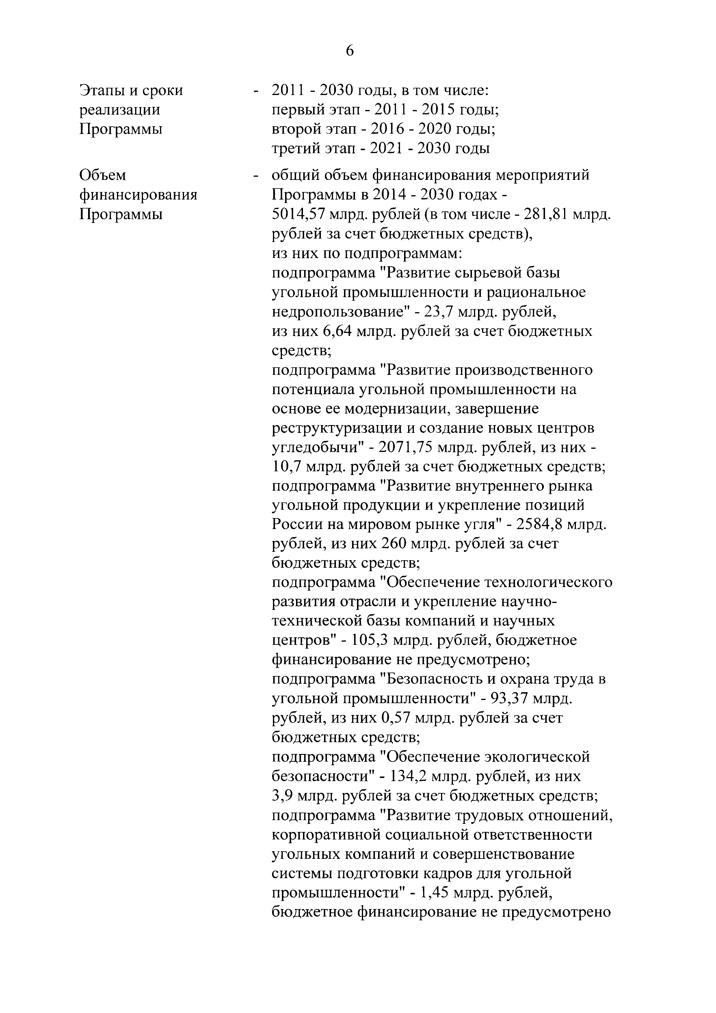 | Оглавление: | Паспорт Программы развития угольной промышленности России на период до 2030 года I. Развитие угольной промышленности России 1. Современное состояние российской угольной промышленности 2. Основные системные проблемы развития угольной промышленности России 3. Современные вызовы развитию угольной промышленности 4. Целевое видение развития угольной промышленности России II. Цель и задачи, структура и этапы реализации Программы 1. Цель и задачи Программы 2. Структура и этапы реализации Программы III. Система мероприятий Программы 1. Подпрограмма "Развитие сырьевой базы угольной промышленности и рациональное недропользование" 2. Подпрограмма "Развитие производственного потенциала угольной промышленности на основе ее модернизации, завершение реструктуризации и создание новых центров угледобычи" 3. Подпрограмма "Развитие внутреннего рынка угольной продукции и укрепление позиций России на мировом рынке угля" 4. Подпрограмма "Обеспечение технологического развития отрасли и укрепление научно-технической базы компаний и научных центров" 5. Подпрограмма "Безопасность и охрана труда в угольной промышленности" 6. Подпрограмма "Обеспечение экологической безопасности" 7. Подпрограмма "Развитие трудовых отношений, корпоративной социальной ответственности угольных компаний и совершенствование системы подготовки кадров для угольной промышленности" IV. Механизмы реализации Программы 1. Совершенствование методов государственного регулирования развития угольной промышленности и законодательной и нормативной базы, обеспечивающих достижение целей и целевых индикаторов развития угольной промышленности 2. Состав и структура государственных программ Российской Федерации, обеспечивающих реализацию мероприятий Программы V. Создание эффективной системы управления и реализации Программы VI. Возможные риски и ожидаемые результаты реализации Программы 1. Риски реализации Программы 2. Ожидаемые результаты реализации Программы Приложение № 1. Перечень мероприятий Программы развития угольной промышленности России на период до 2030 года Приложение № 2. Объем кондиционных ресурсов угля, учтенных при разработке Программы развития угольной промышленности России на период до 2030 года Приложение № 3. Оценка спроса на российский уголь Приложение № 4. Оценка баланса производства и потребления коксующихся углей Приложение № 5. Объем финансирования мероприятий Программы развития угольной промышленности России на период до 2030 года по подпрограммам Приложение № 6. Перечень показателей эффективности реализации Программы развития угольной промышленности России на период до 2030 года Приложение № 7. Показатели развития добычи угля по регионам Приложение № 8. Перечень инвестиционных проектов, направленных на реализацию Программы развития угольной промышленности России на период до 2030 года Приложение № 9. Целевые индикаторы Программы развития угольной промышленности России на период до 2030 года |
