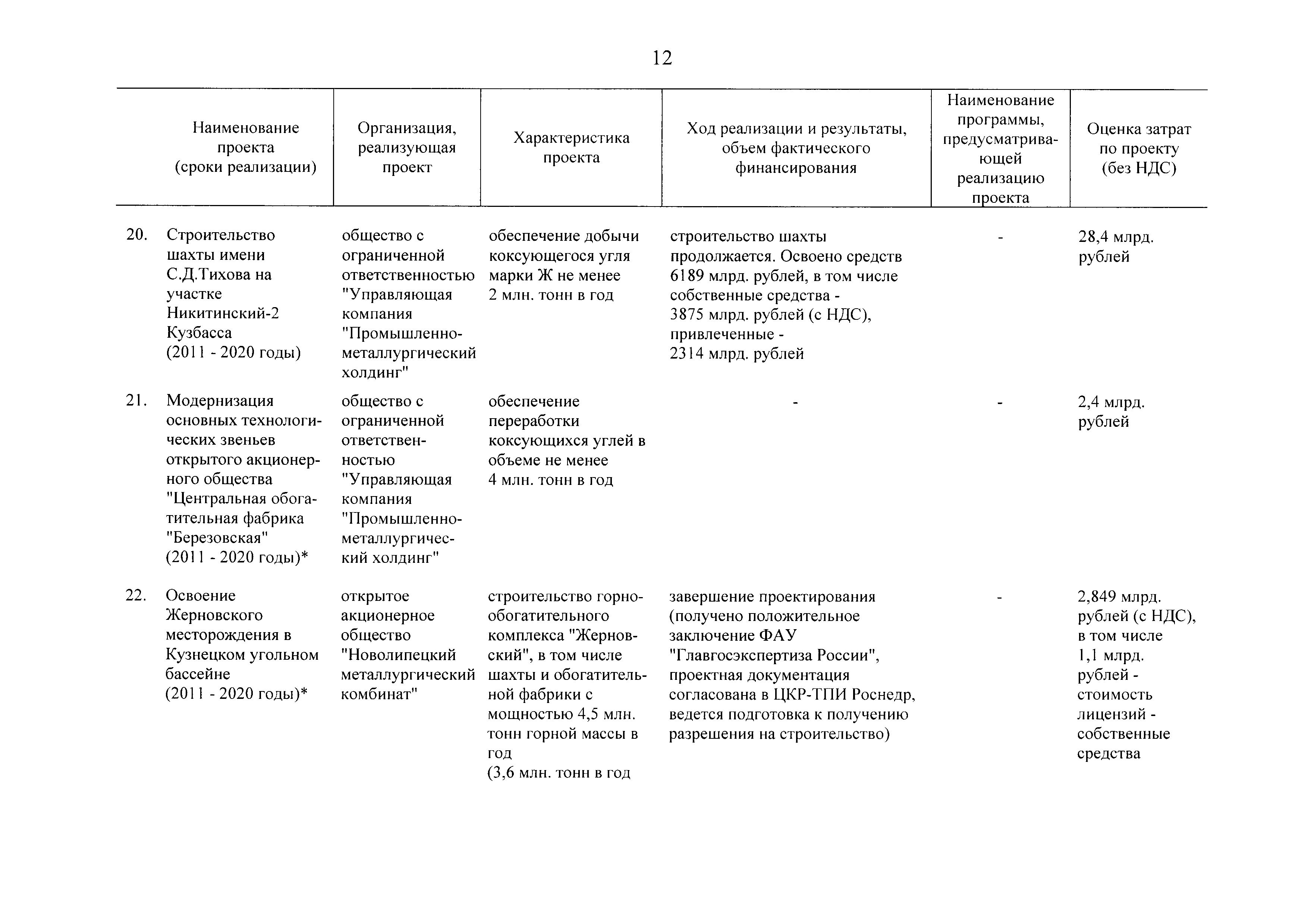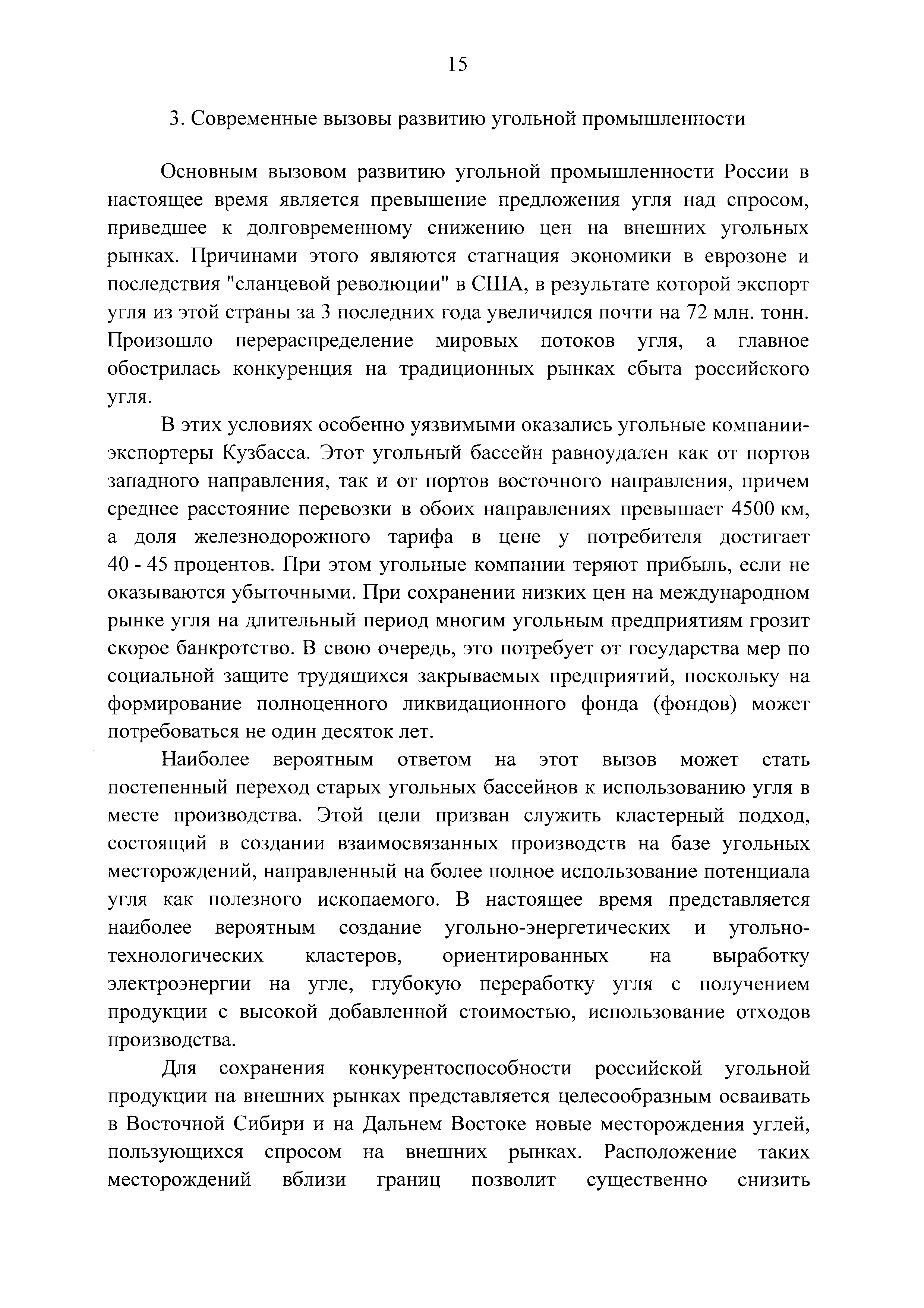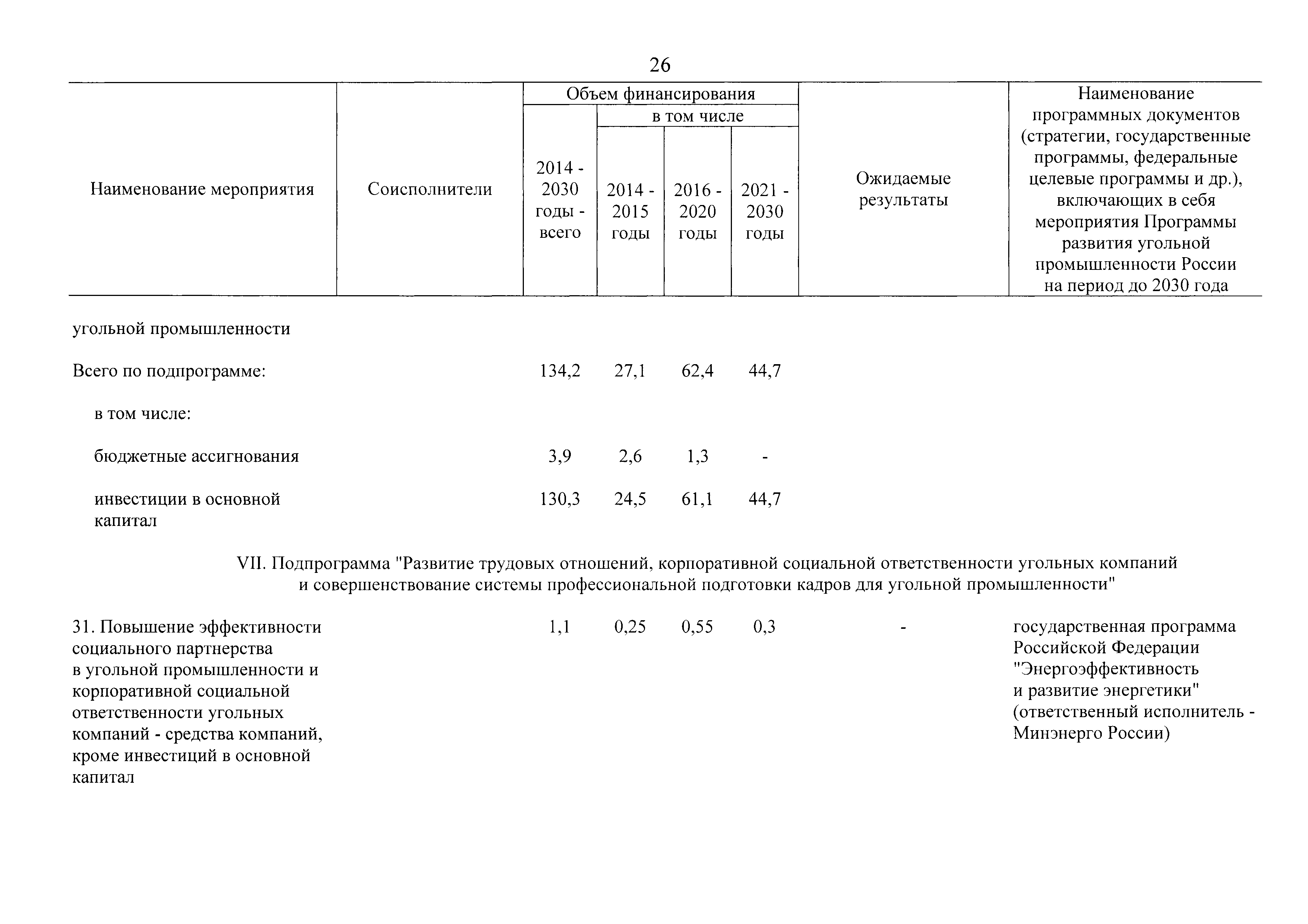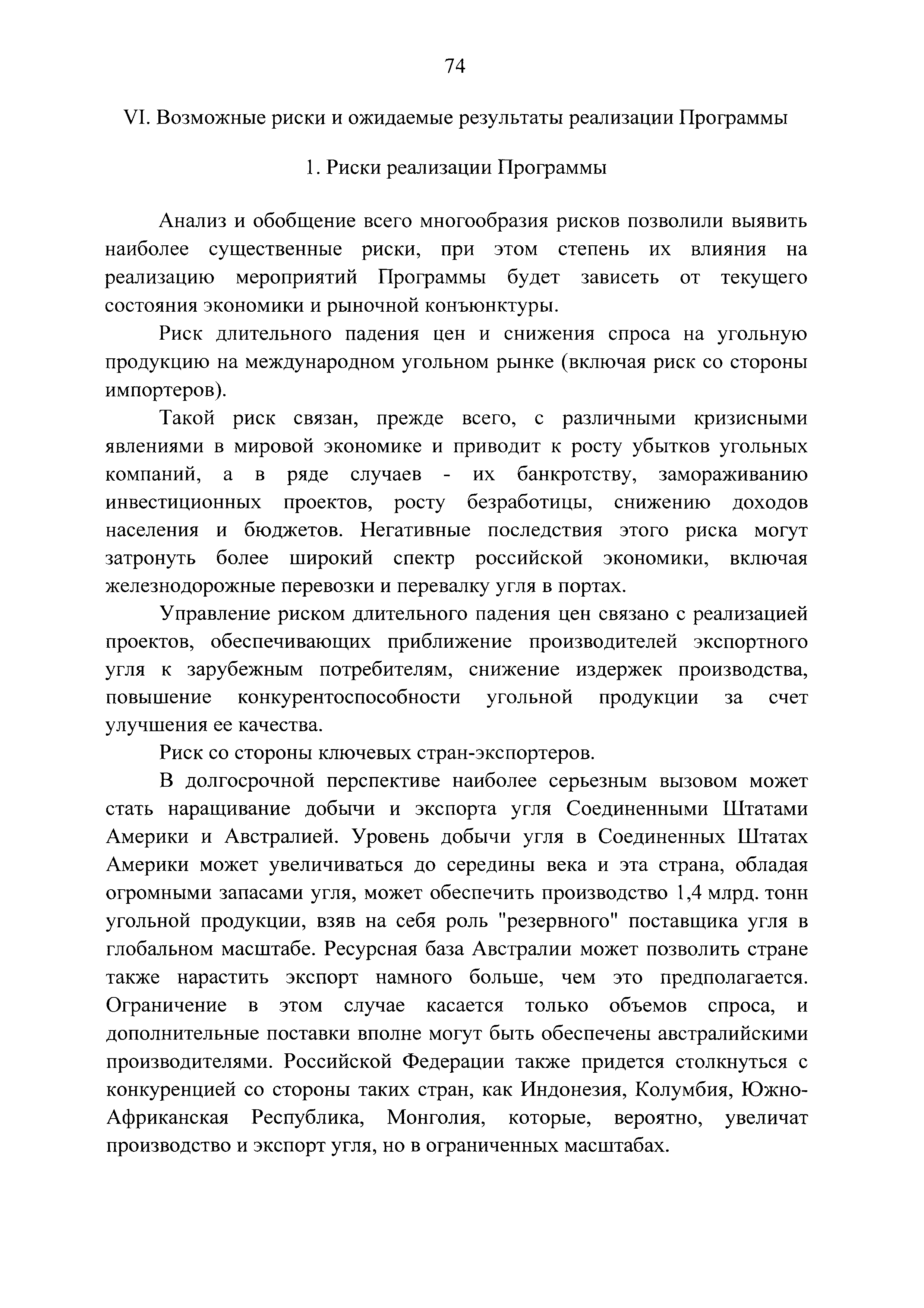 | Оглавление: | Паспорт Программы развития угольной промышленности России на период до 2030 года I. Развитие угольной промышленности России 1. Современное состояние российской угольной промышленности 2. Основные системные проблемы развития угольной промышленности России 3. Современные вызовы развитию угольной промышленности 4. Целевое видение развития угольной промышленности России II. Цель и задачи, структура и этапы реализации Программы 1. Цель и задачи Программы 2. Структура и этапы реализации Программы III. Система мероприятий Программы 1. Подпрограмма "Развитие сырьевой базы угольной промышленности и рациональное недропользование" 2. Подпрограмма "Развитие производственного потенциала угольной промышленности на основе ее модернизации, завершение реструктуризации и создание новых центров угледобычи" 3. Подпрограмма "Развитие внутреннего рынка угольной продукции и укрепление позиций России на мировом рынке угля" 4. Подпрограмма "Обеспечение технологического развития отрасли и укрепление научно-технической базы компаний и научных центров" 5. Подпрограмма "Безопасность и охрана труда в угольной промышленности" 6. Подпрограмма "Обеспечение экологической безопасности" 7. Подпрограмма "Развитие трудовых отношений, корпоративной социальной ответственности угольных компаний и совершенствование системы подготовки кадров для угольной промышленности" IV. Механизмы реализации Программы 1. Совершенствование методов государственного регулирования развития угольной промышленности и законодательной и нормативной базы, обеспечивающих достижение целей и целевых индикаторов развития угольной промышленности 2. Состав и структура государственных программ Российской Федерации, обеспечивающих реализацию мероприятий Программы V. Создание эффективной системы управления и реализации Программы VI. Возможные риски и ожидаемые результаты реализации Программы 1. Риски реализации Программы 2. Ожидаемые результаты реализации Программы Приложение № 1. Перечень мероприятий Программы развития угольной промышленности России на период до 2030 года Приложение № 2. Объем кондиционных ресурсов угля, учтенных при разработке Программы развития угольной промышленности России на период до 2030 года Приложение № 3. Оценка спроса на российский уголь Приложение № 4. Оценка баланса производства и потребления коксующихся углей Приложение № 5. Объем финансирования мероприятий Программы развития угольной промышленности России на период до 2030 года по подпрограммам Приложение № 6. Перечень показателей эффективности реализации Программы развития угольной промышленности России на период до 2030 года Приложение № 7. Показатели развития добычи угля по регионам Приложение № 8. Перечень инвестиционных проектов, направленных на реализацию Программы развития угольной промышленности России на период до 2030 года Приложение № 9. Целевые индикаторы Программы развития угольной промышленности России на период до 2030 года |
