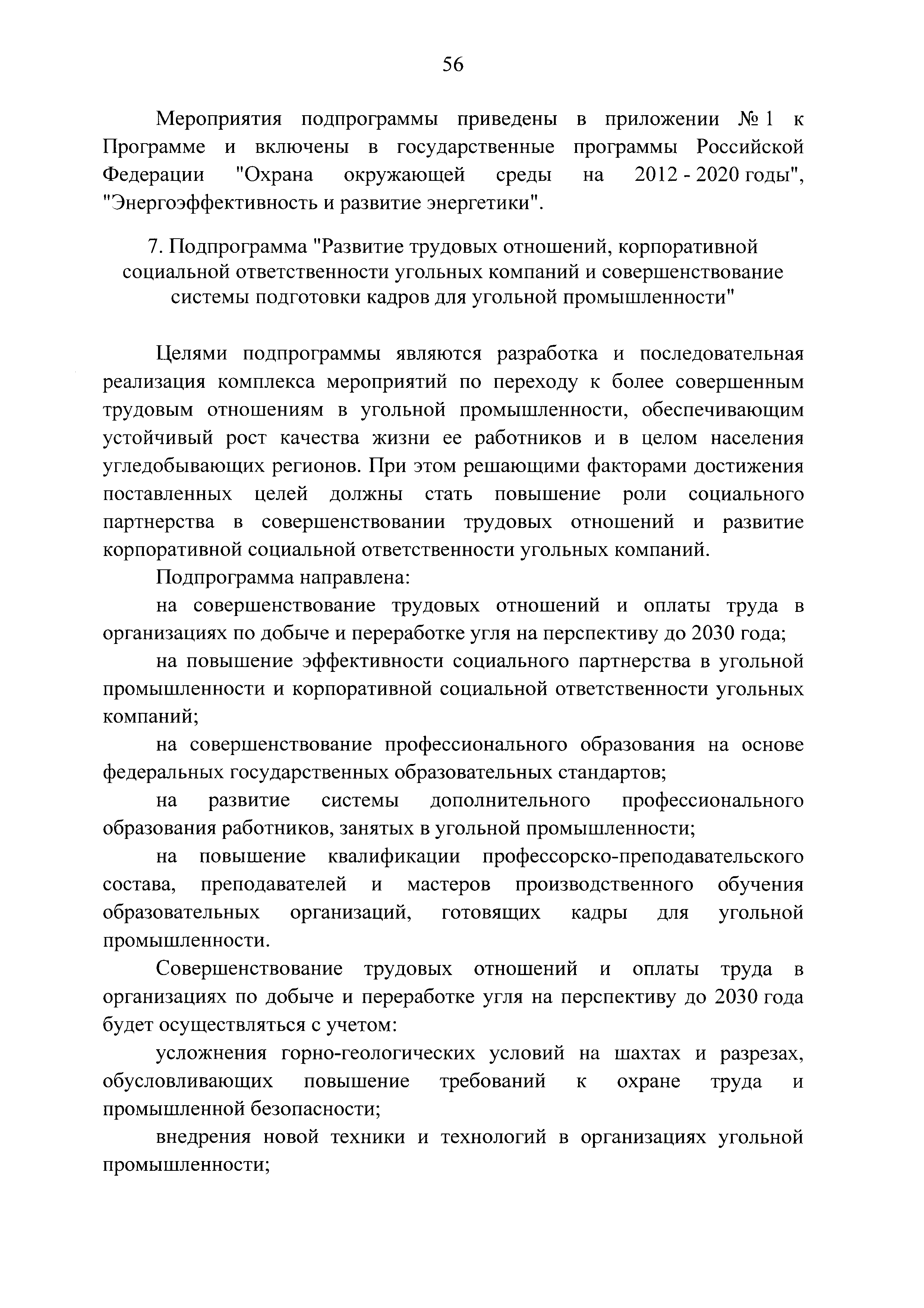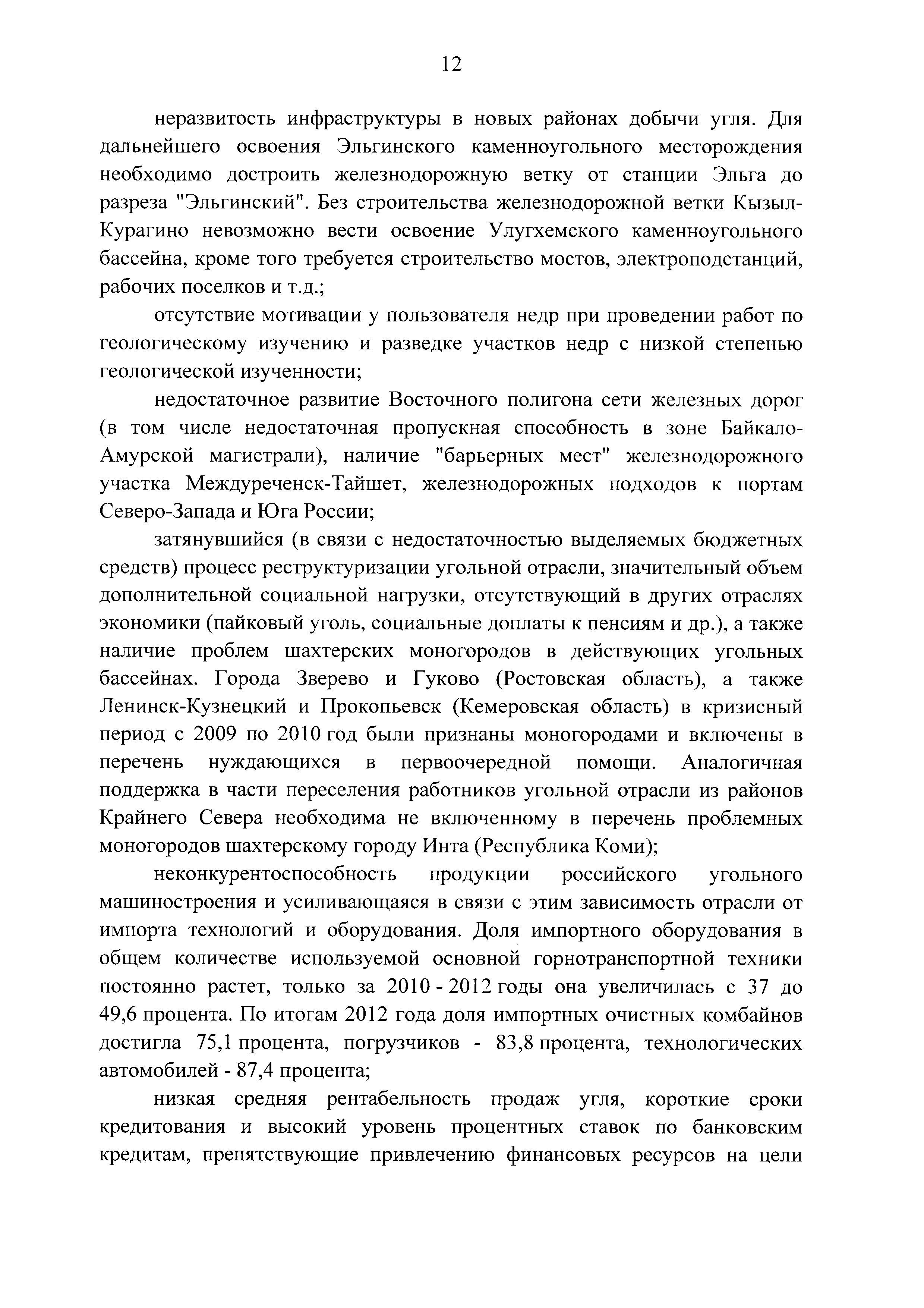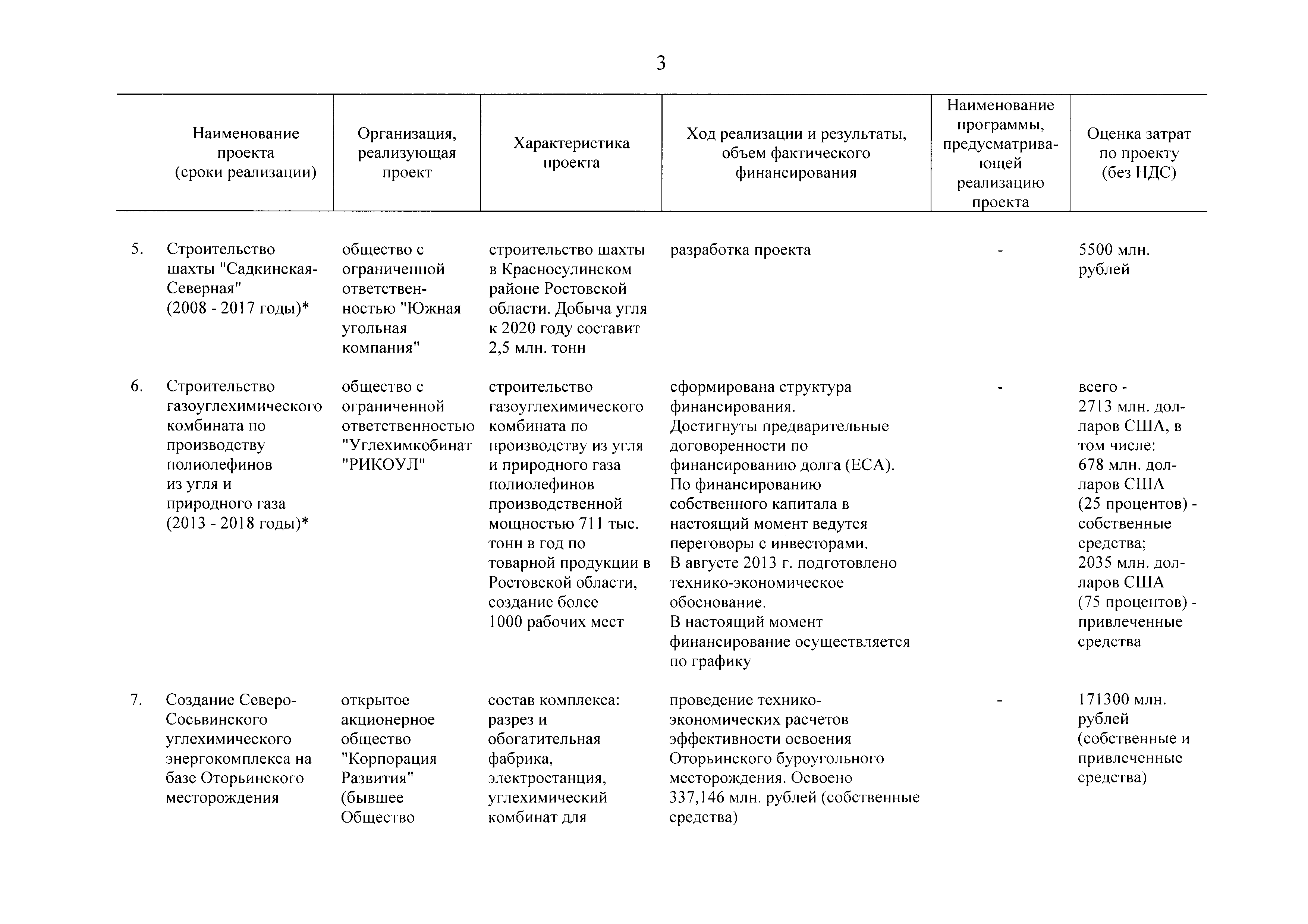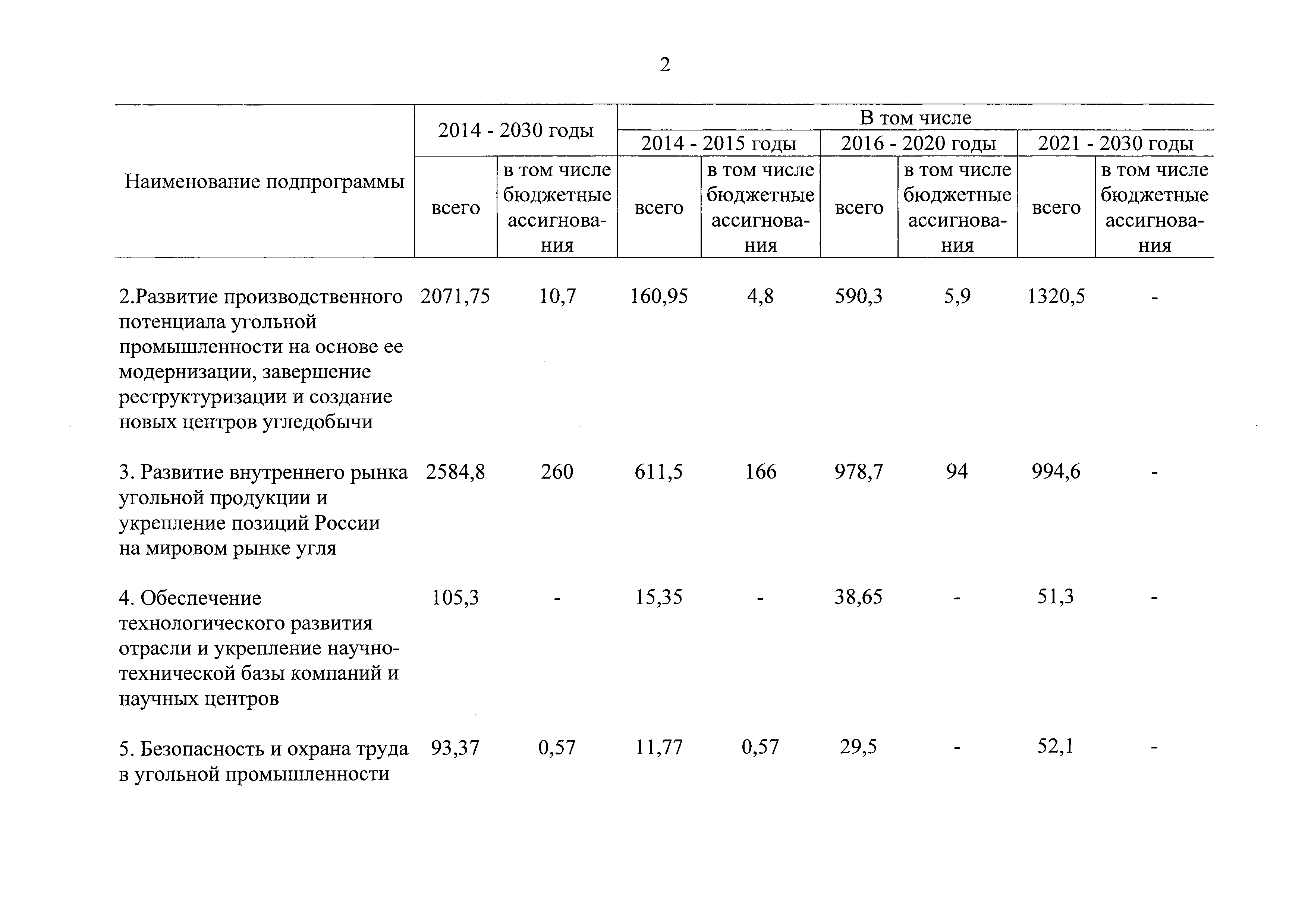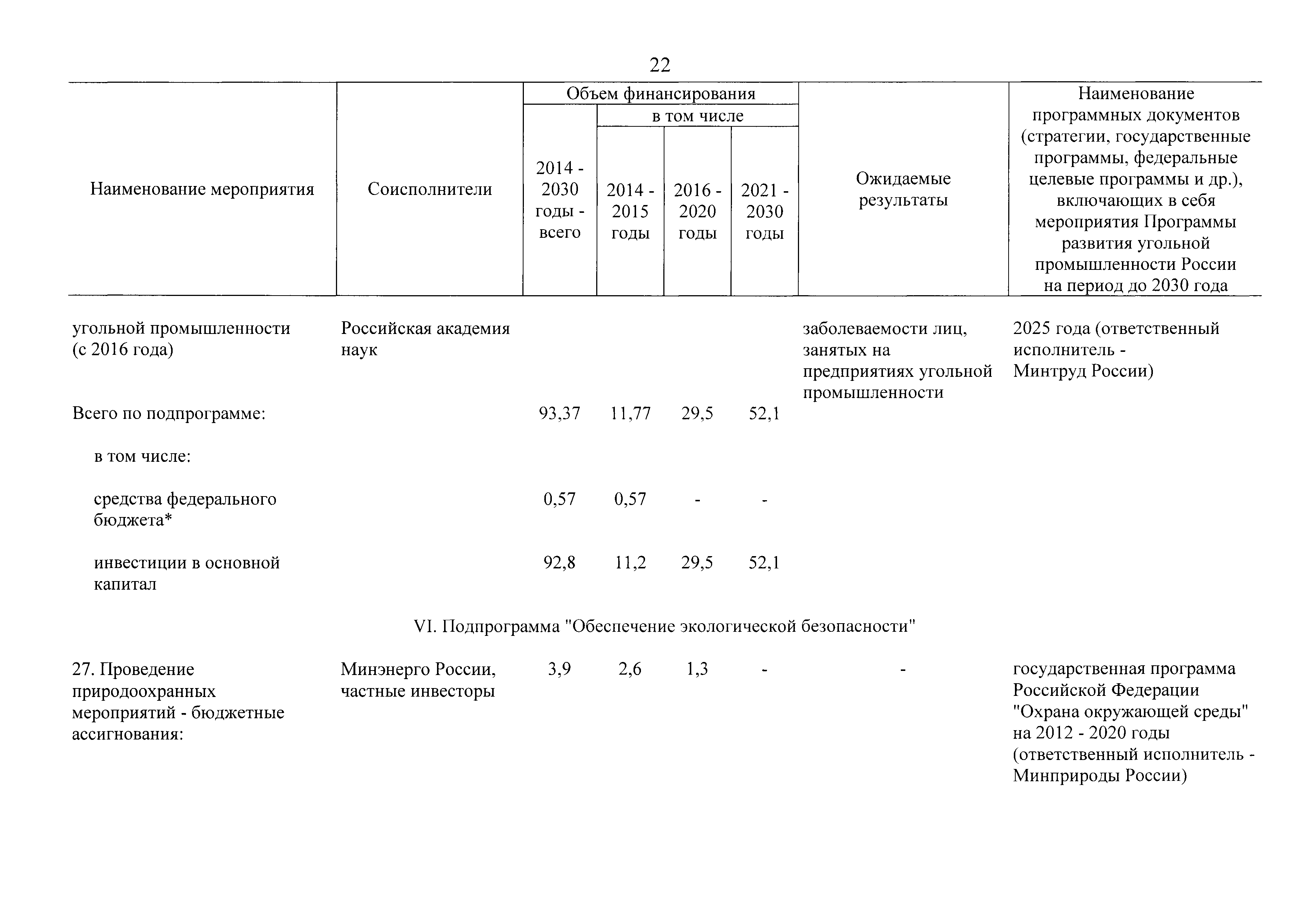 | Оглавление: | Паспорт Программы развития угольной промышленности России на период до 2030 года I. Развитие угольной промышленности России 1. Современное состояние российской угольной промышленности 2. Основные системные проблемы развития угольной промышленности России 3. Современные вызовы развитию угольной промышленности 4. Целевое видение развития угольной промышленности России II. Цель и задачи, структура и этапы реализации Программы 1. Цель и задачи Программы 2. Структура и этапы реализации Программы III. Система мероприятий Программы 1. Подпрограмма "Развитие сырьевой базы угольной промышленности и рациональное недропользование" 2. Подпрограмма "Развитие производственного потенциала угольной промышленности на основе ее модернизации, завершение реструктуризации и создание новых центров угледобычи" 3. Подпрограмма "Развитие внутреннего рынка угольной продукции и укрепление позиций России на мировом рынке угля" 4. Подпрограмма "Обеспечение технологического развития отрасли и укрепление научно-технической базы компаний и научных центров" 5. Подпрограмма "Безопасность и охрана труда в угольной промышленности" 6. Подпрограмма "Обеспечение экологической безопасности" 7. Подпрограмма "Развитие трудовых отношений, корпоративной социальной ответственности угольных компаний и совершенствование системы подготовки кадров для угольной промышленности" IV. Механизмы реализации Программы 1. Совершенствование методов государственного регулирования развития угольной промышленности и законодательной и нормативной базы, обеспечивающих достижение целей и целевых индикаторов развития угольной промышленности 2. Состав и структура государственных программ Российской Федерации, обеспечивающих реализацию мероприятий Программы V. Создание эффективной системы управления и реализации Программы VI. Возможные риски и ожидаемые результаты реализации Программы 1. Риски реализации Программы 2. Ожидаемые результаты реализации Программы Приложение № 1. Перечень мероприятий Программы развития угольной промышленности России на период до 2030 года Приложение № 2. Объем кондиционных ресурсов угля, учтенных при разработке Программы развития угольной промышленности России на период до 2030 года Приложение № 3. Оценка спроса на российский уголь Приложение № 4. Оценка баланса производства и потребления коксующихся углей Приложение № 5. Объем финансирования мероприятий Программы развития угольной промышленности России на период до 2030 года по подпрограммам Приложение № 6. Перечень показателей эффективности реализации Программы развития угольной промышленности России на период до 2030 года Приложение № 7. Показатели развития добычи угля по регионам Приложение № 8. Перечень инвестиционных проектов, направленных на реализацию Программы развития угольной промышленности России на период до 2030 года Приложение № 9. Целевые индикаторы Программы развития угольной промышленности России на период до 2030 года |