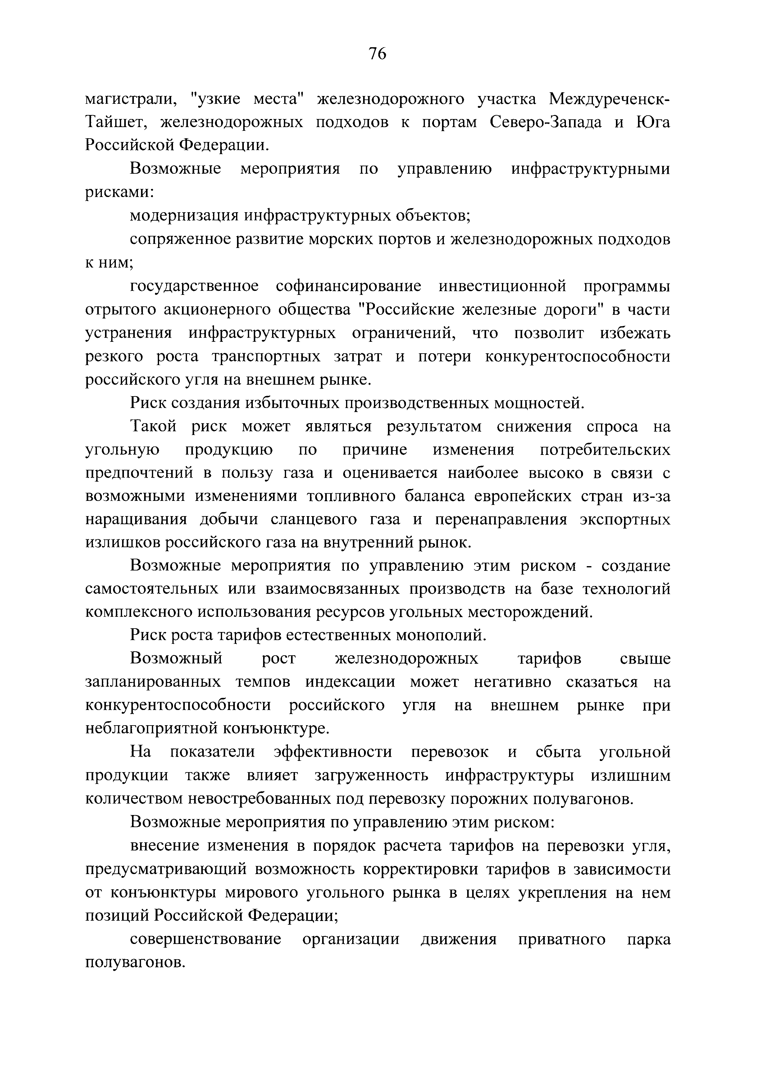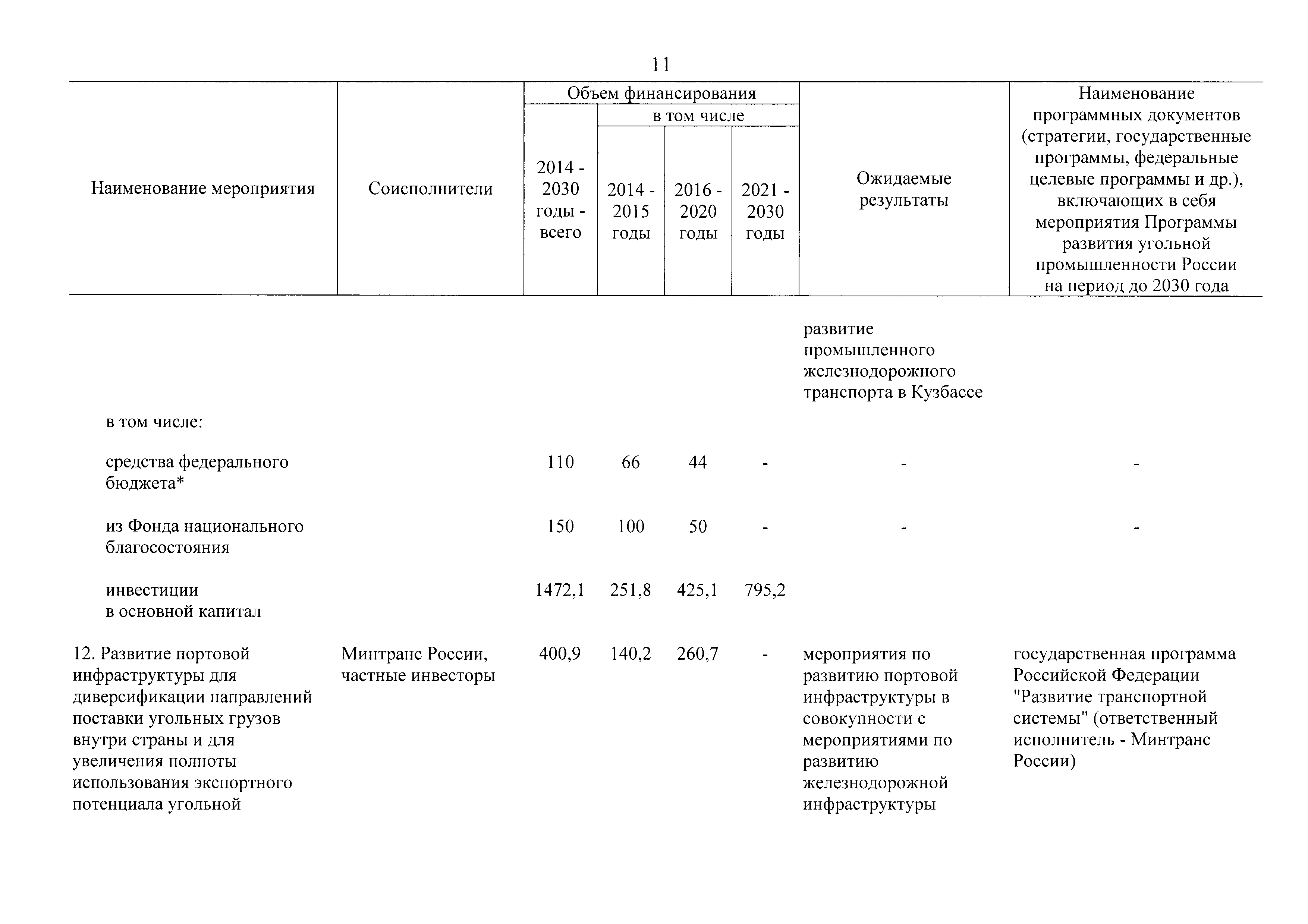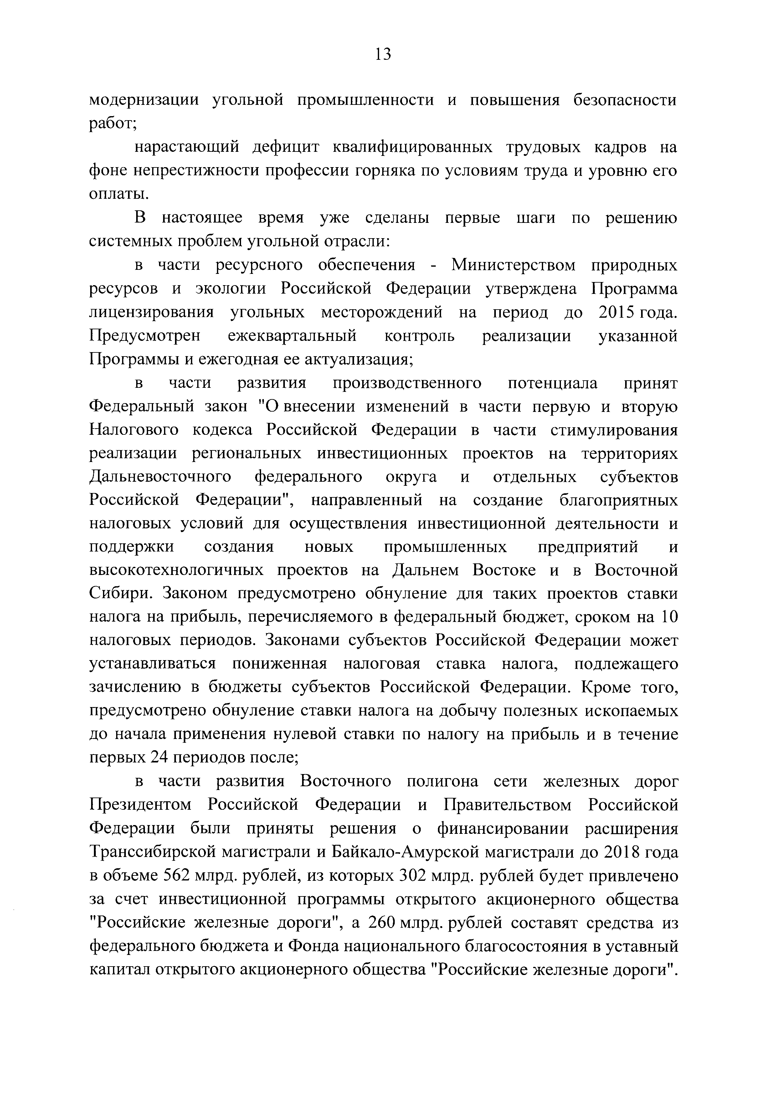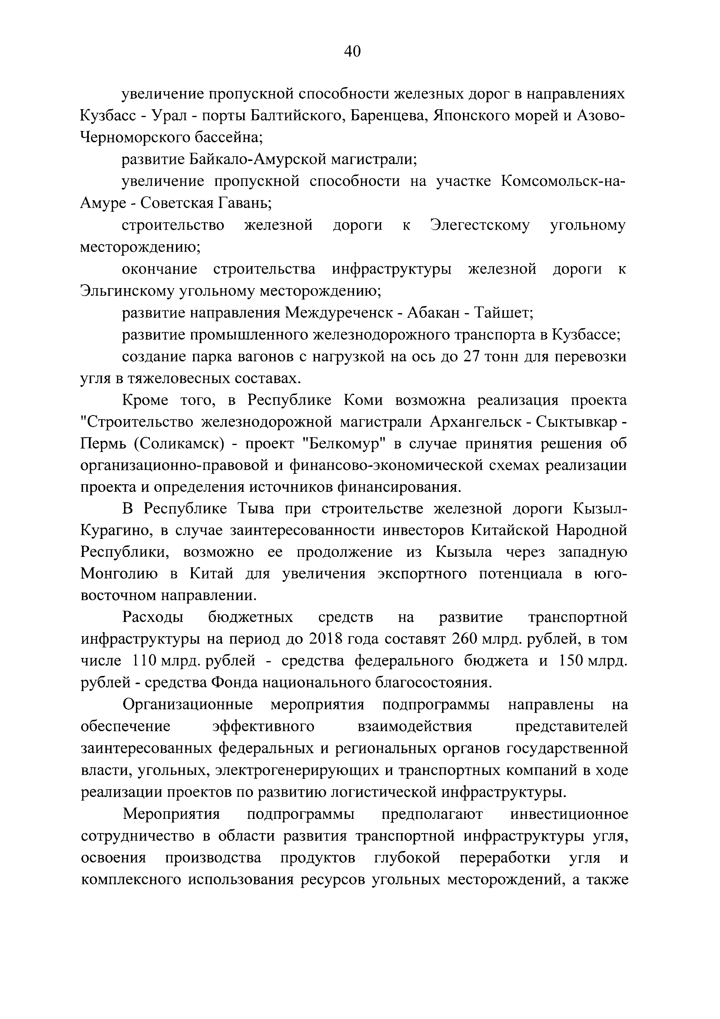 | Оглавление: | Паспорт Программы развития угольной промышленности России на период до 2030 года I. Развитие угольной промышленности России 1. Современное состояние российской угольной промышленности 2. Основные системные проблемы развития угольной промышленности России 3. Современные вызовы развитию угольной промышленности 4. Целевое видение развития угольной промышленности России II. Цель и задачи, структура и этапы реализации Программы 1. Цель и задачи Программы 2. Структура и этапы реализации Программы III. Система мероприятий Программы 1. Подпрограмма "Развитие сырьевой базы угольной промышленности и рациональное недропользование" 2. Подпрограмма "Развитие производственного потенциала угольной промышленности на основе ее модернизации, завершение реструктуризации и создание новых центров угледобычи" 3. Подпрограмма "Развитие внутреннего рынка угольной продукции и укрепление позиций России на мировом рынке угля" 4. Подпрограмма "Обеспечение технологического развития отрасли и укрепление научно-технической базы компаний и научных центров" 5. Подпрограмма "Безопасность и охрана труда в угольной промышленности" 6. Подпрограмма "Обеспечение экологической безопасности" 7. Подпрограмма "Развитие трудовых отношений, корпоративной социальной ответственности угольных компаний и совершенствование системы подготовки кадров для угольной промышленности" IV. Механизмы реализации Программы 1. Совершенствование методов государственного регулирования развития угольной промышленности и законодательной и нормативной базы, обеспечивающих достижение целей и целевых индикаторов развития угольной промышленности 2. Состав и структура государственных программ Российской Федерации, обеспечивающих реализацию мероприятий Программы V. Создание эффективной системы управления и реализации Программы VI. Возможные риски и ожидаемые результаты реализации Программы 1. Риски реализации Программы 2. Ожидаемые результаты реализации Программы Приложение № 1. Перечень мероприятий Программы развития угольной промышленности России на период до 2030 года Приложение № 2. Объем кондиционных ресурсов угля, учтенных при разработке Программы развития угольной промышленности России на период до 2030 года Приложение № 3. Оценка спроса на российский уголь Приложение № 4. Оценка баланса производства и потребления коксующихся углей Приложение № 5. Объем финансирования мероприятий Программы развития угольной промышленности России на период до 2030 года по подпрограммам Приложение № 6. Перечень показателей эффективности реализации Программы развития угольной промышленности России на период до 2030 года Приложение № 7. Показатели развития добычи угля по регионам Приложение № 8. Перечень инвестиционных проектов, направленных на реализацию Программы развития угольной промышленности России на период до 2030 года Приложение № 9. Целевые индикаторы Программы развития угольной промышленности России на период до 2030 года |