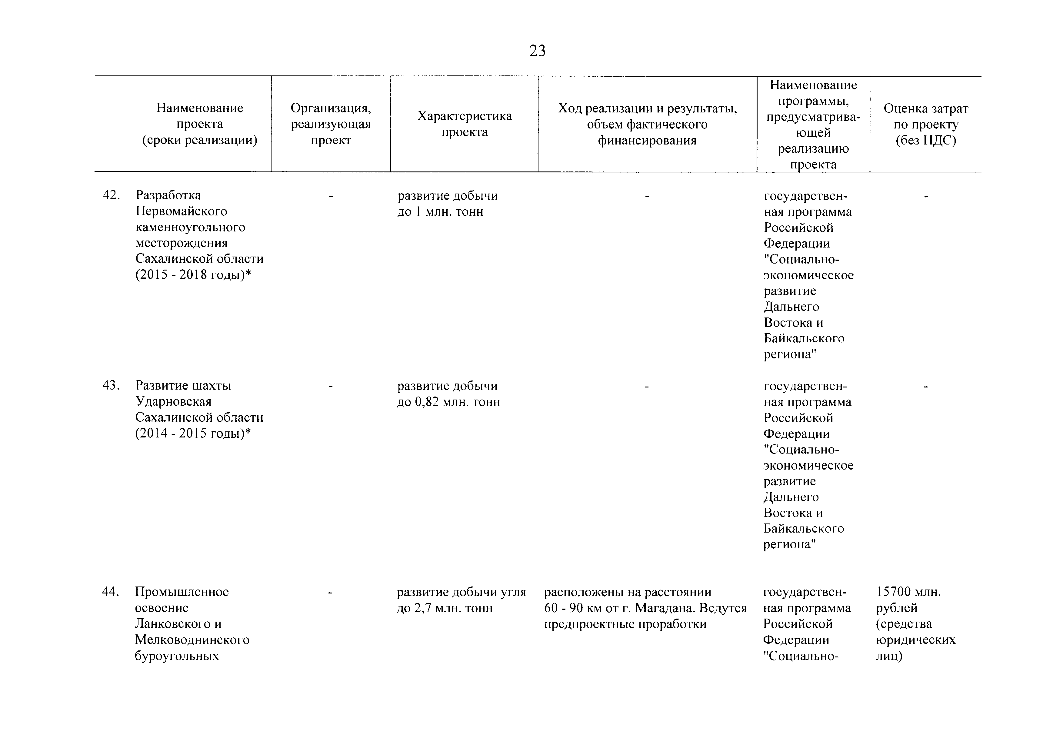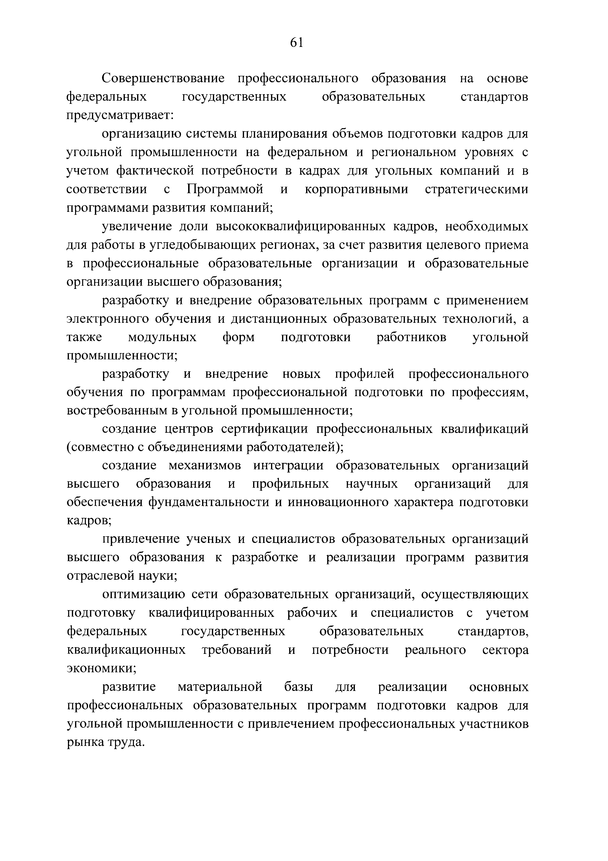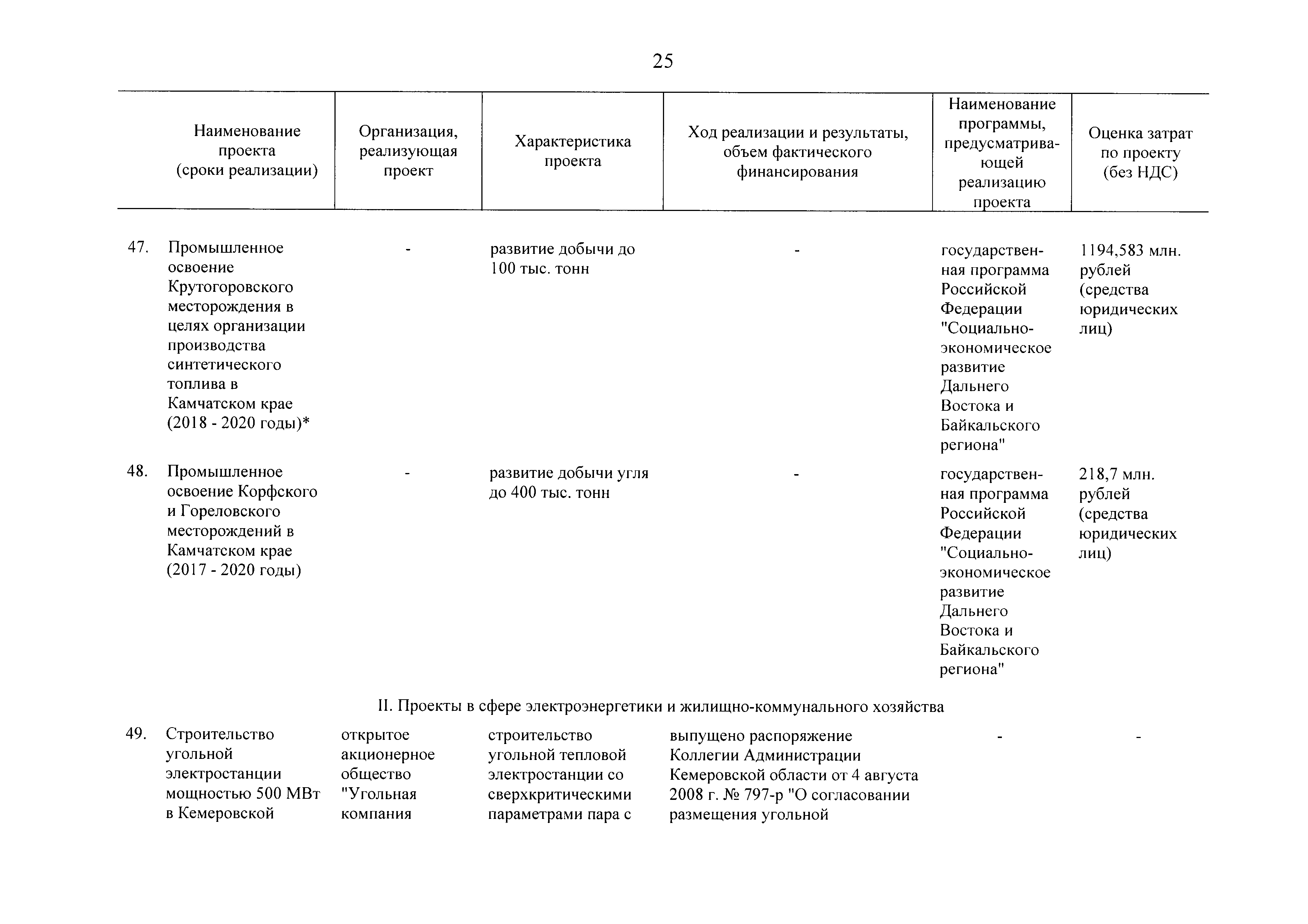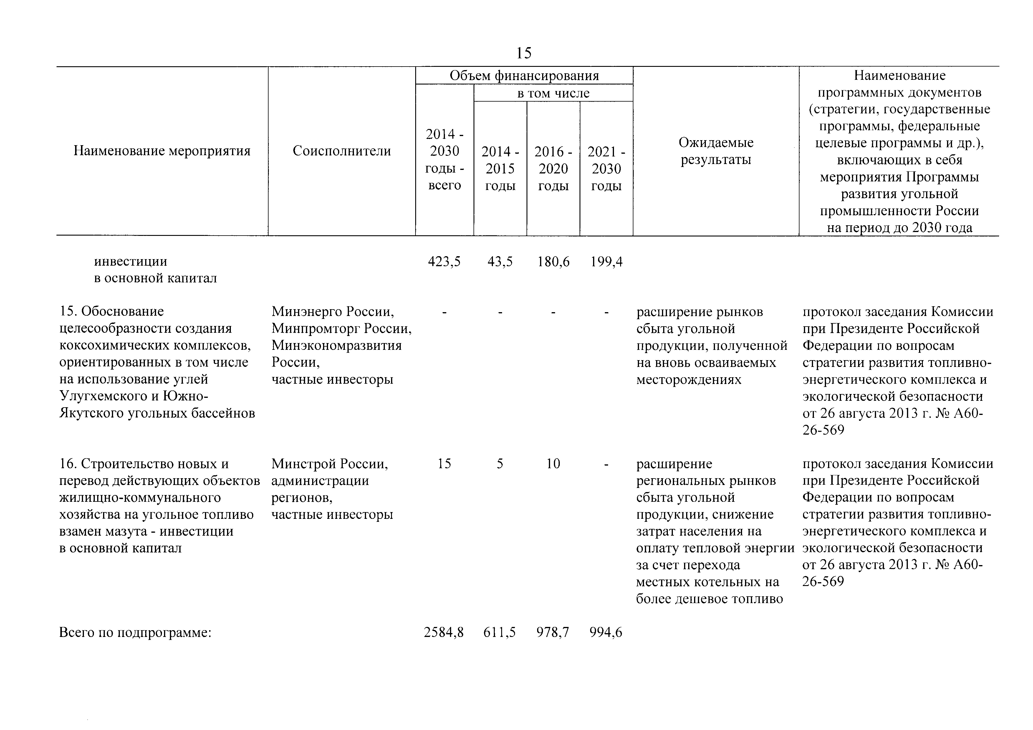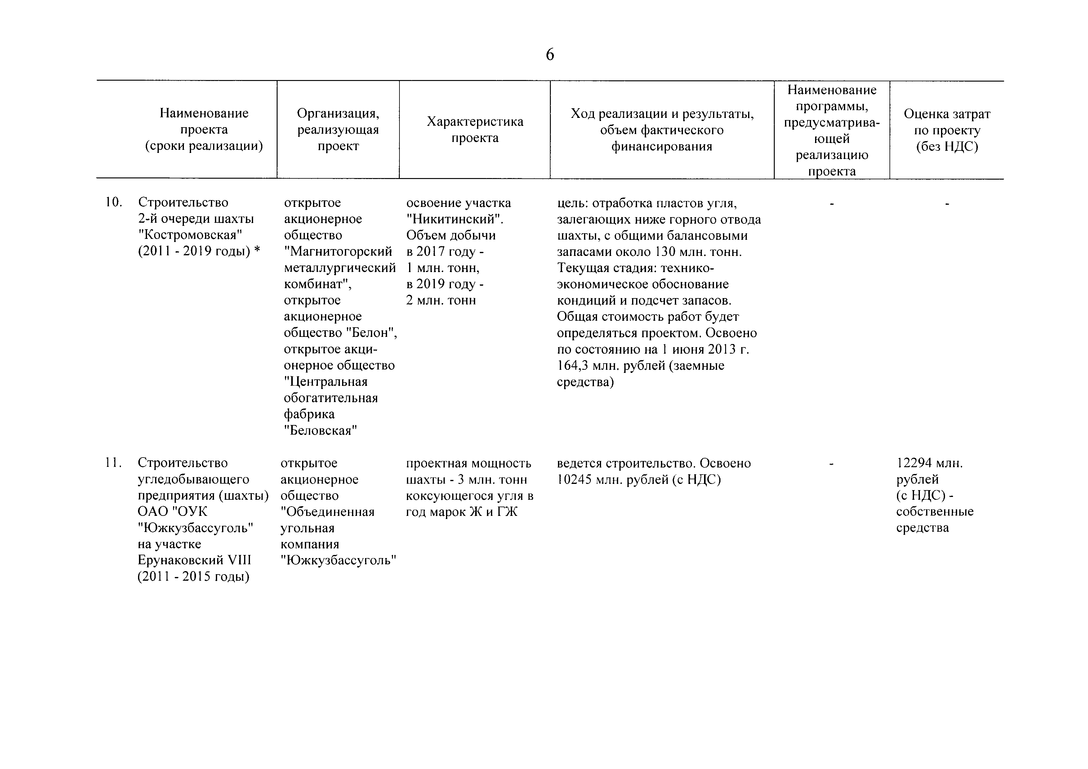 | Оглавление: | Паспорт Программы развития угольной промышленности России на период до 2030 года I. Развитие угольной промышленности России 1. Современное состояние российской угольной промышленности 2. Основные системные проблемы развития угольной промышленности России 3. Современные вызовы развитию угольной промышленности 4. Целевое видение развития угольной промышленности России II. Цель и задачи, структура и этапы реализации Программы 1. Цель и задачи Программы 2. Структура и этапы реализации Программы III. Система мероприятий Программы 1. Подпрограмма "Развитие сырьевой базы угольной промышленности и рациональное недропользование" 2. Подпрограмма "Развитие производственного потенциала угольной промышленности на основе ее модернизации, завершение реструктуризации и создание новых центров угледобычи" 3. Подпрограмма "Развитие внутреннего рынка угольной продукции и укрепление позиций России на мировом рынке угля" 4. Подпрограмма "Обеспечение технологического развития отрасли и укрепление научно-технической базы компаний и научных центров" 5. Подпрограмма "Безопасность и охрана труда в угольной промышленности" 6. Подпрограмма "Обеспечение экологической безопасности" 7. Подпрограмма "Развитие трудовых отношений, корпоративной социальной ответственности угольных компаний и совершенствование системы подготовки кадров для угольной промышленности" IV. Механизмы реализации Программы 1. Совершенствование методов государственного регулирования развития угольной промышленности и законодательной и нормативной базы, обеспечивающих достижение целей и целевых индикаторов развития угольной промышленности 2. Состав и структура государственных программ Российской Федерации, обеспечивающих реализацию мероприятий Программы V. Создание эффективной системы управления и реализации Программы VI. Возможные риски и ожидаемые результаты реализации Программы 1. Риски реализации Программы 2. Ожидаемые результаты реализации Программы Приложение № 1. Перечень мероприятий Программы развития угольной промышленности России на период до 2030 года Приложение № 2. Объем кондиционных ресурсов угля, учтенных при разработке Программы развития угольной промышленности России на период до 2030 года Приложение № 3. Оценка спроса на российский уголь Приложение № 4. Оценка баланса производства и потребления коксующихся углей Приложение № 5. Объем финансирования мероприятий Программы развития угольной промышленности России на период до 2030 года по подпрограммам Приложение № 6. Перечень показателей эффективности реализации Программы развития угольной промышленности России на период до 2030 года Приложение № 7. Показатели развития добычи угля по регионам Приложение № 8. Перечень инвестиционных проектов, направленных на реализацию Программы развития угольной промышленности России на период до 2030 года Приложение № 9. Целевые индикаторы Программы развития угольной промышленности России на период до 2030 года |