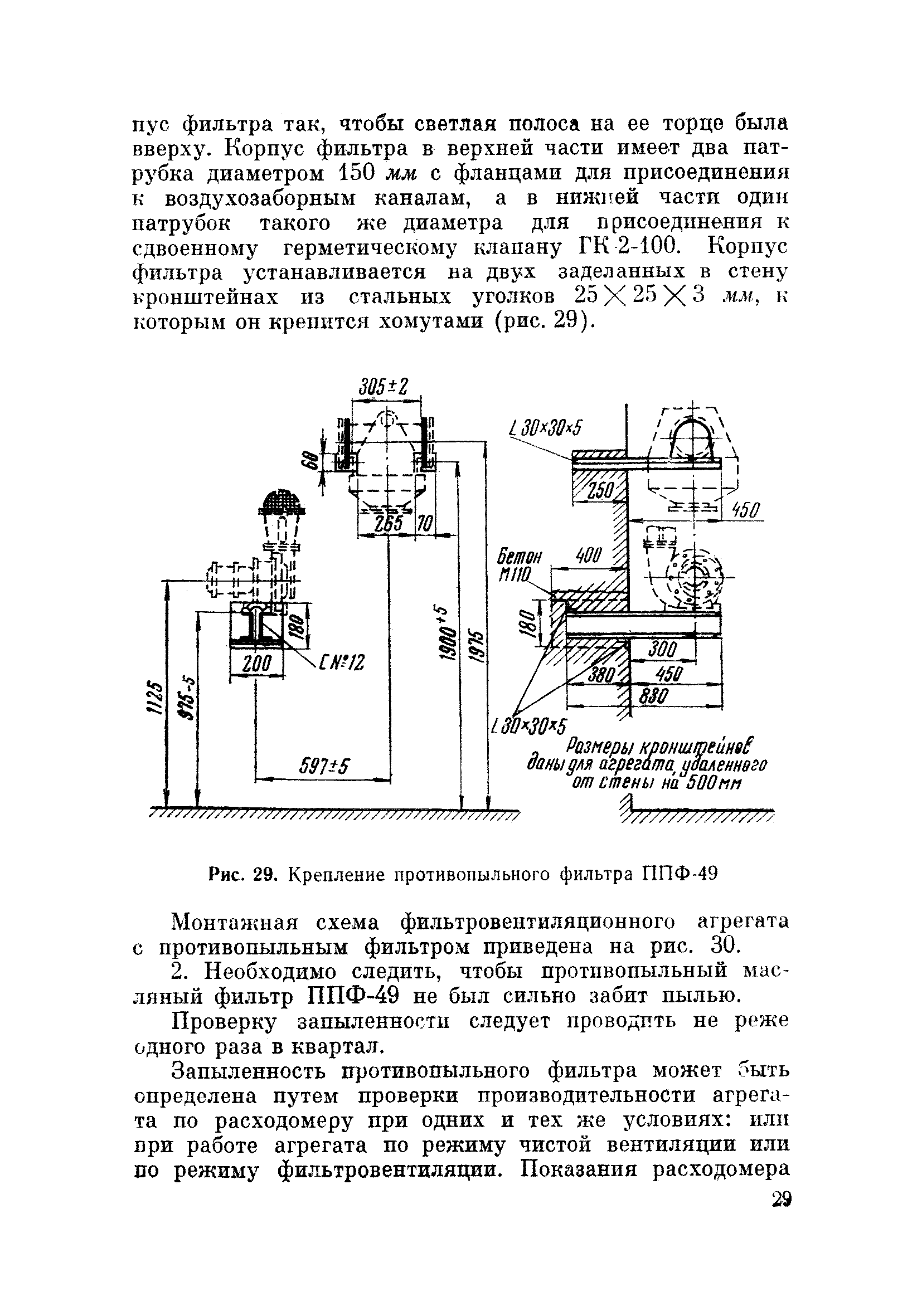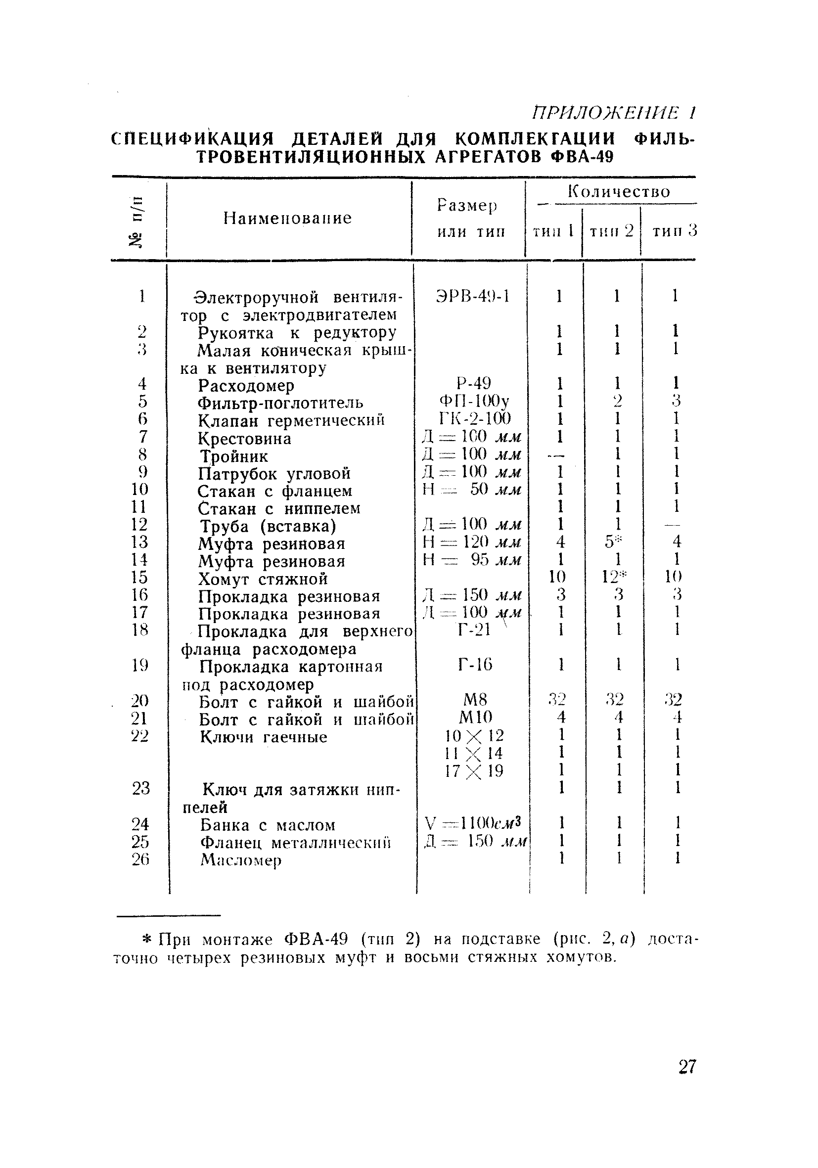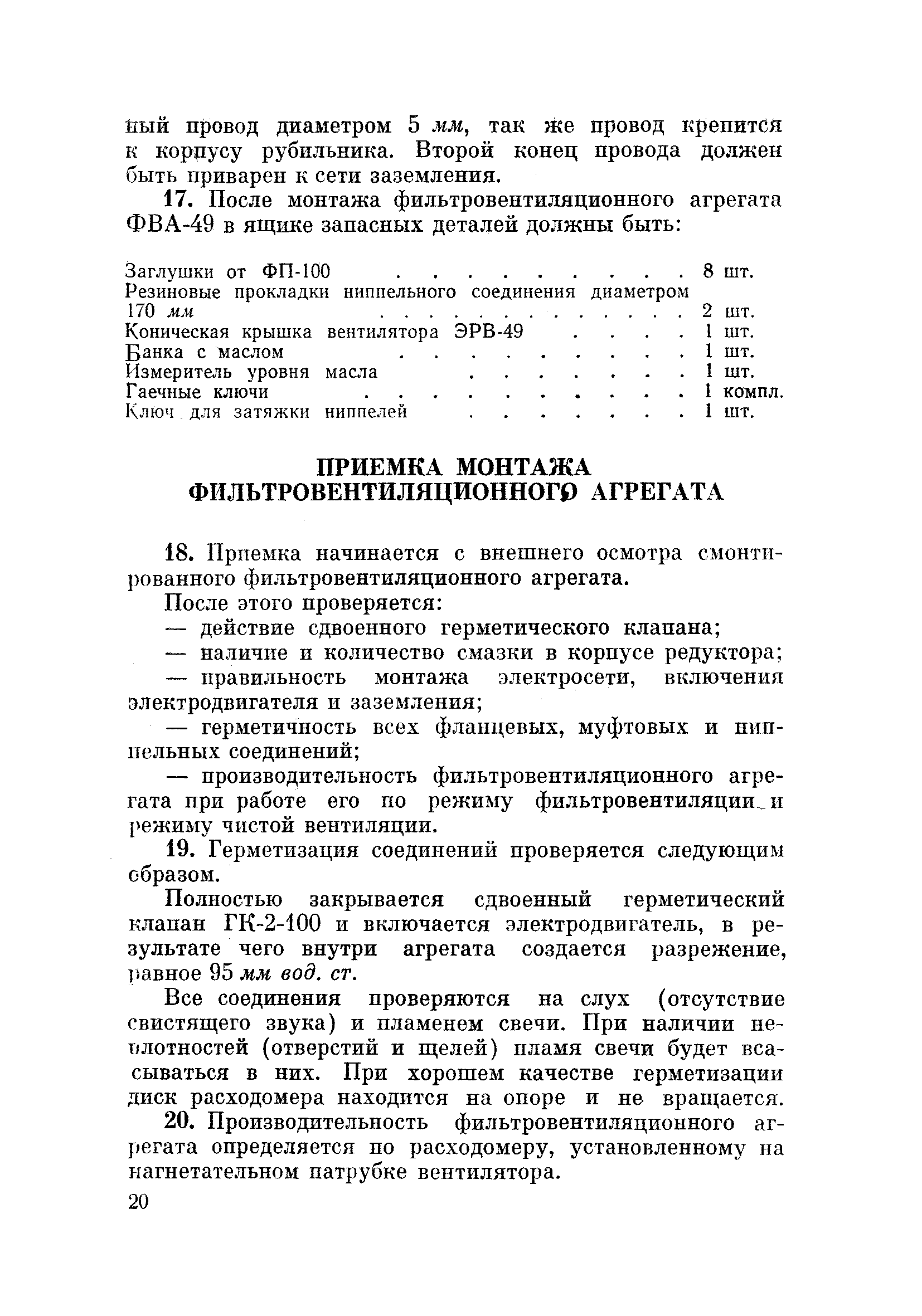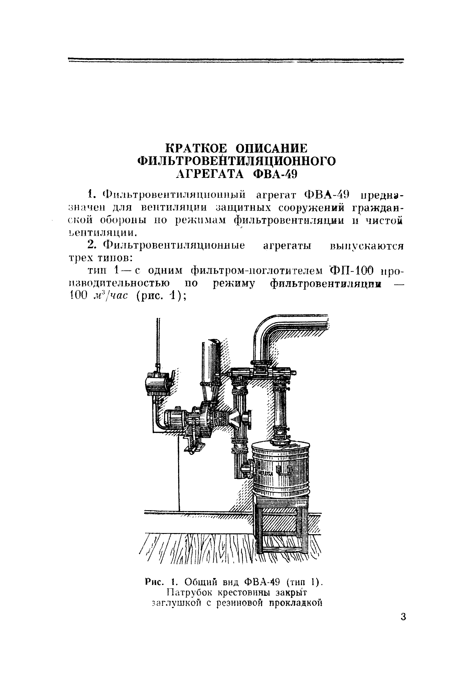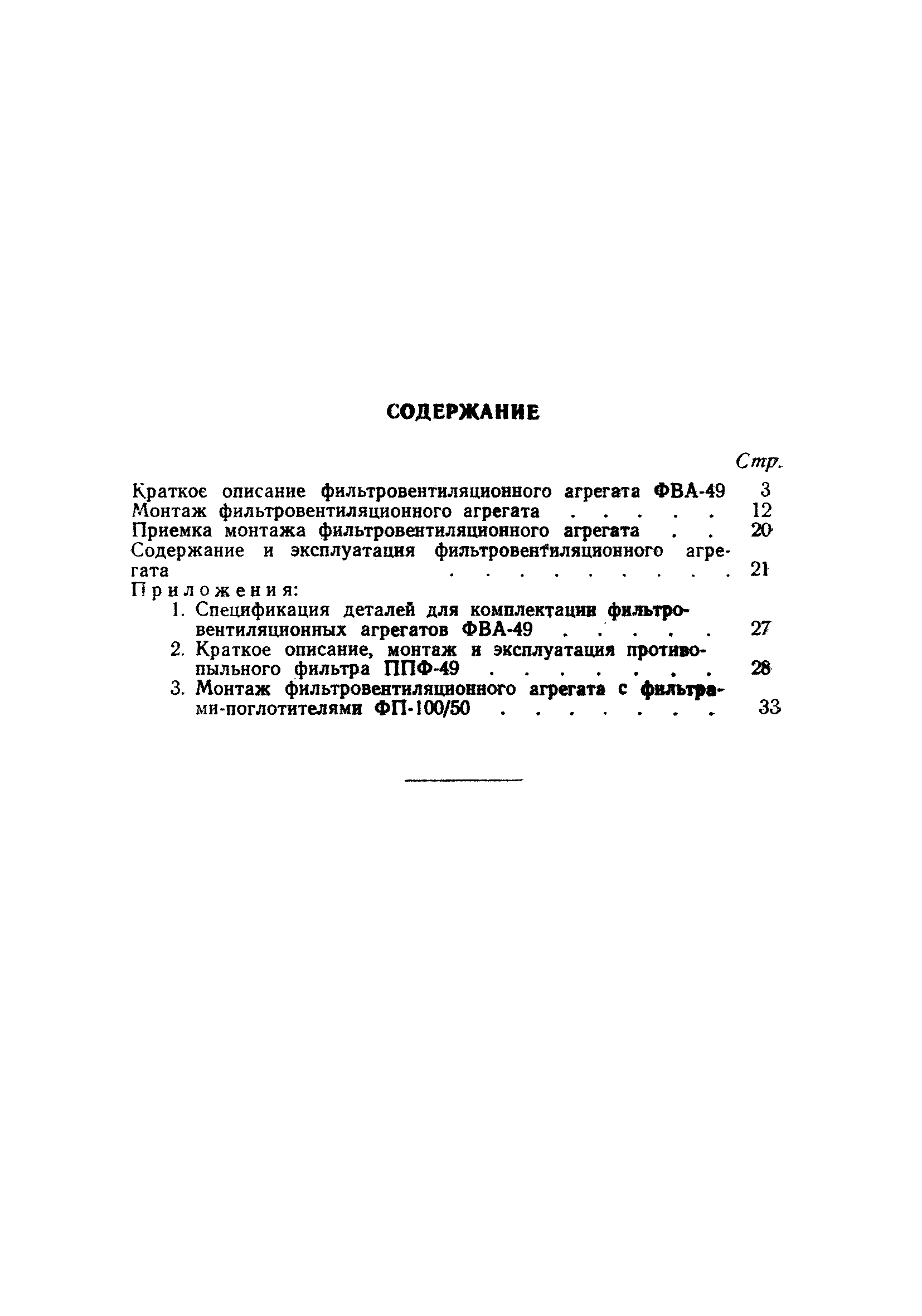 | Оглавление: | Краткое описание фильтровентиляционного агрегата ФВА-49 Монтаж фильтровентиляционного агрегата Приемка монтажа фильтровентиляционного агрегата Содержание и эксплуатация фильтровентиляционного агрегата Приложение 1. Спецификация деталей для комплектации фильтровентиляционных агрегатов ФВА-49 Приложение 2. Краткое описание, монтаж и эксплуатация противопыльного фильтра ППФ-49 Приложение 3. Монтаж фильтровентиляционного агрегата с фильтрами-поглотителями ФП-100/50 |