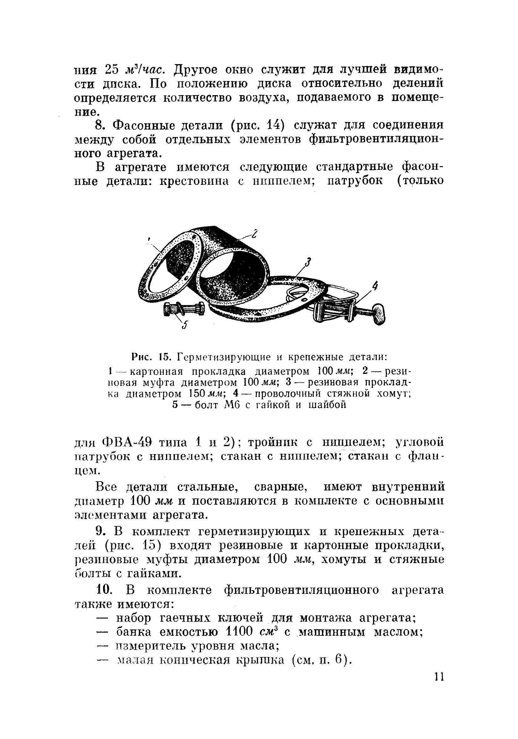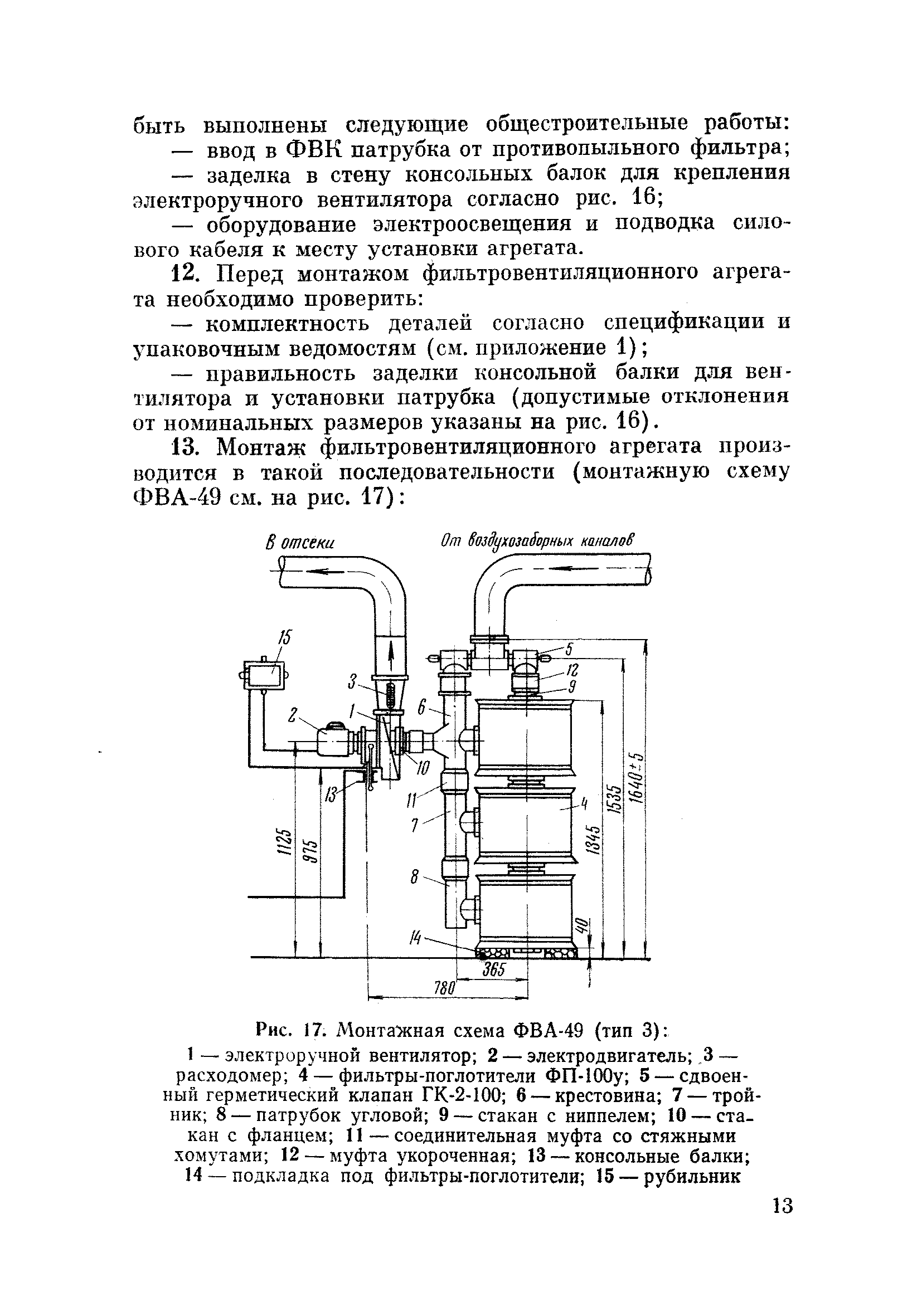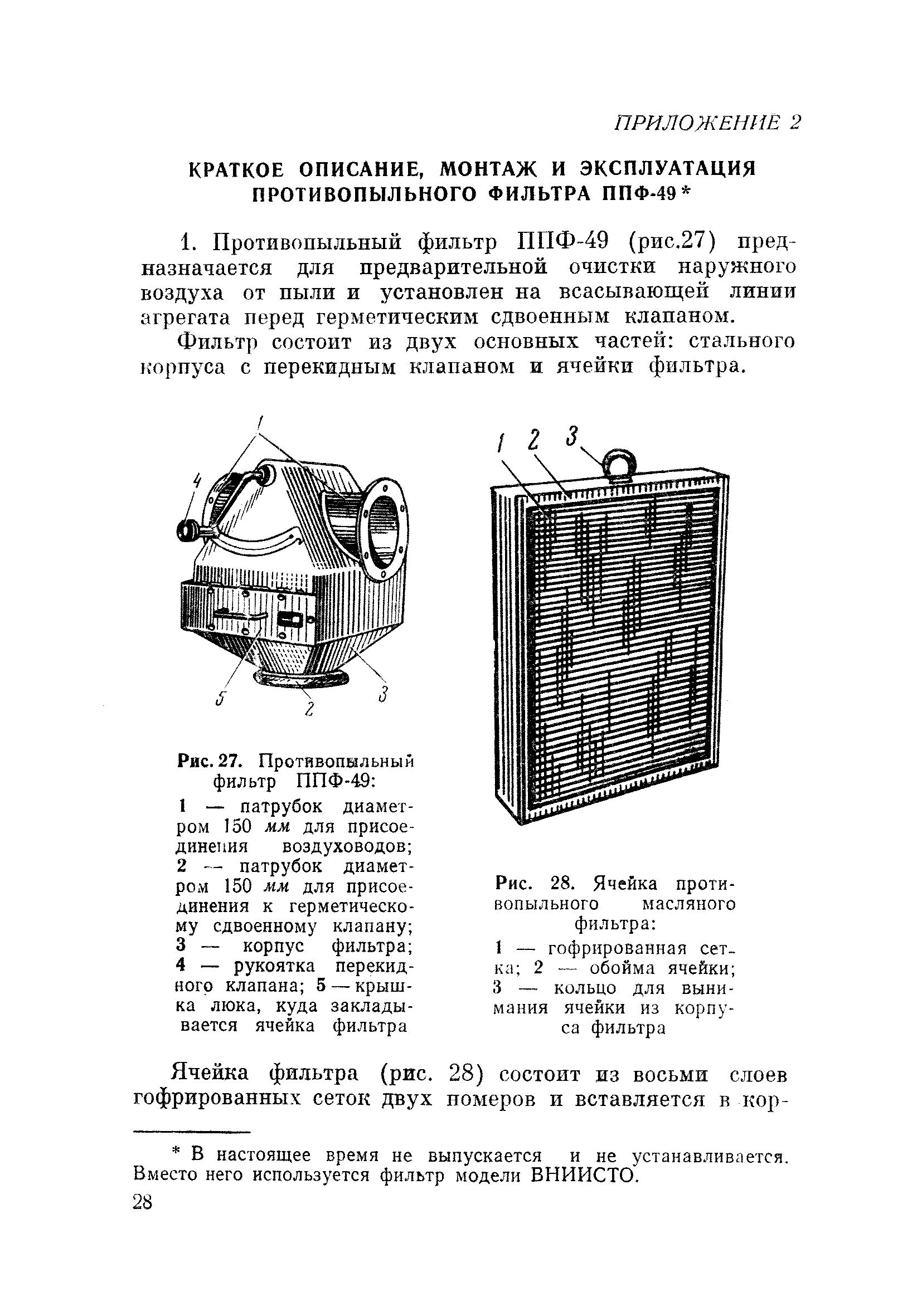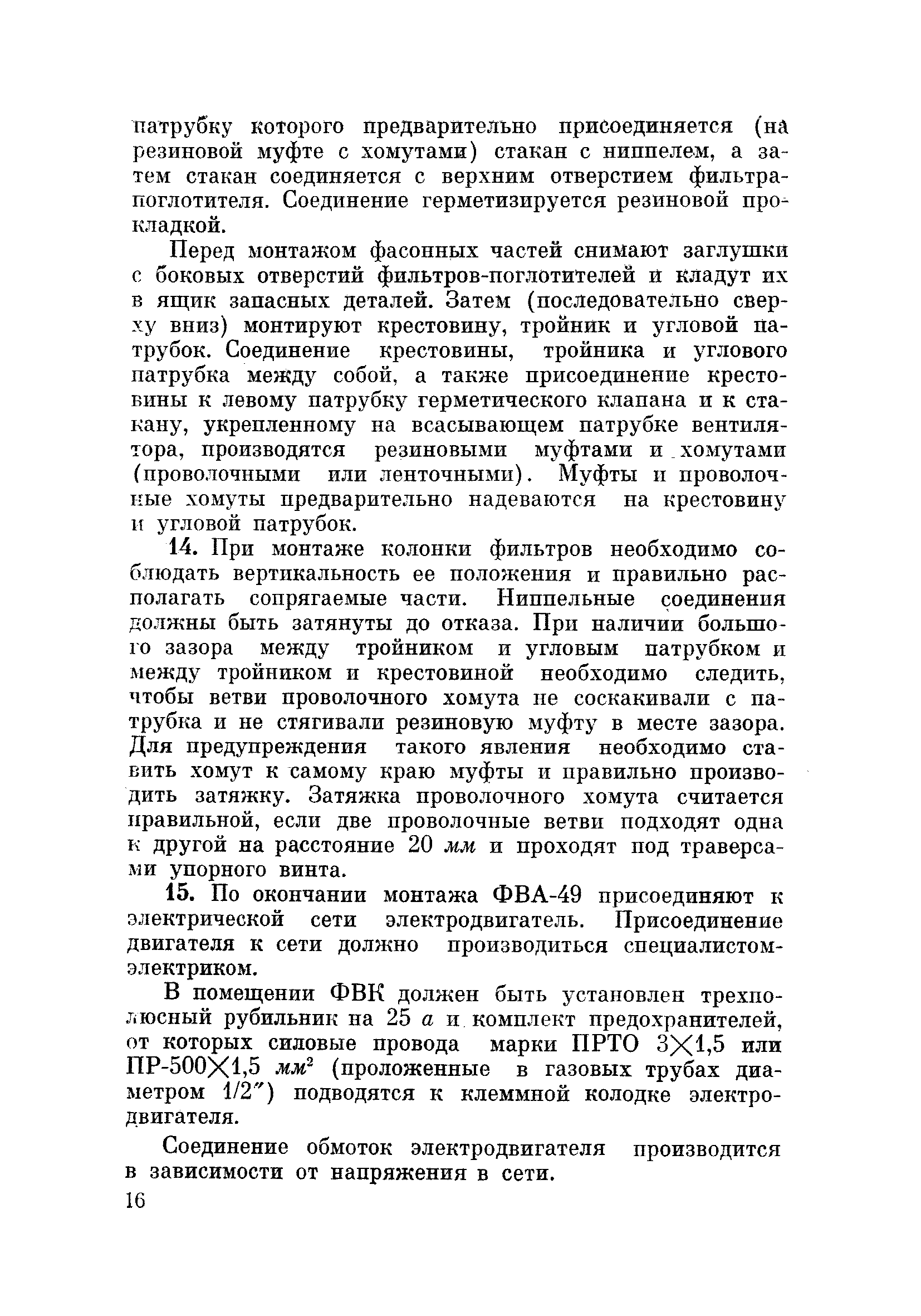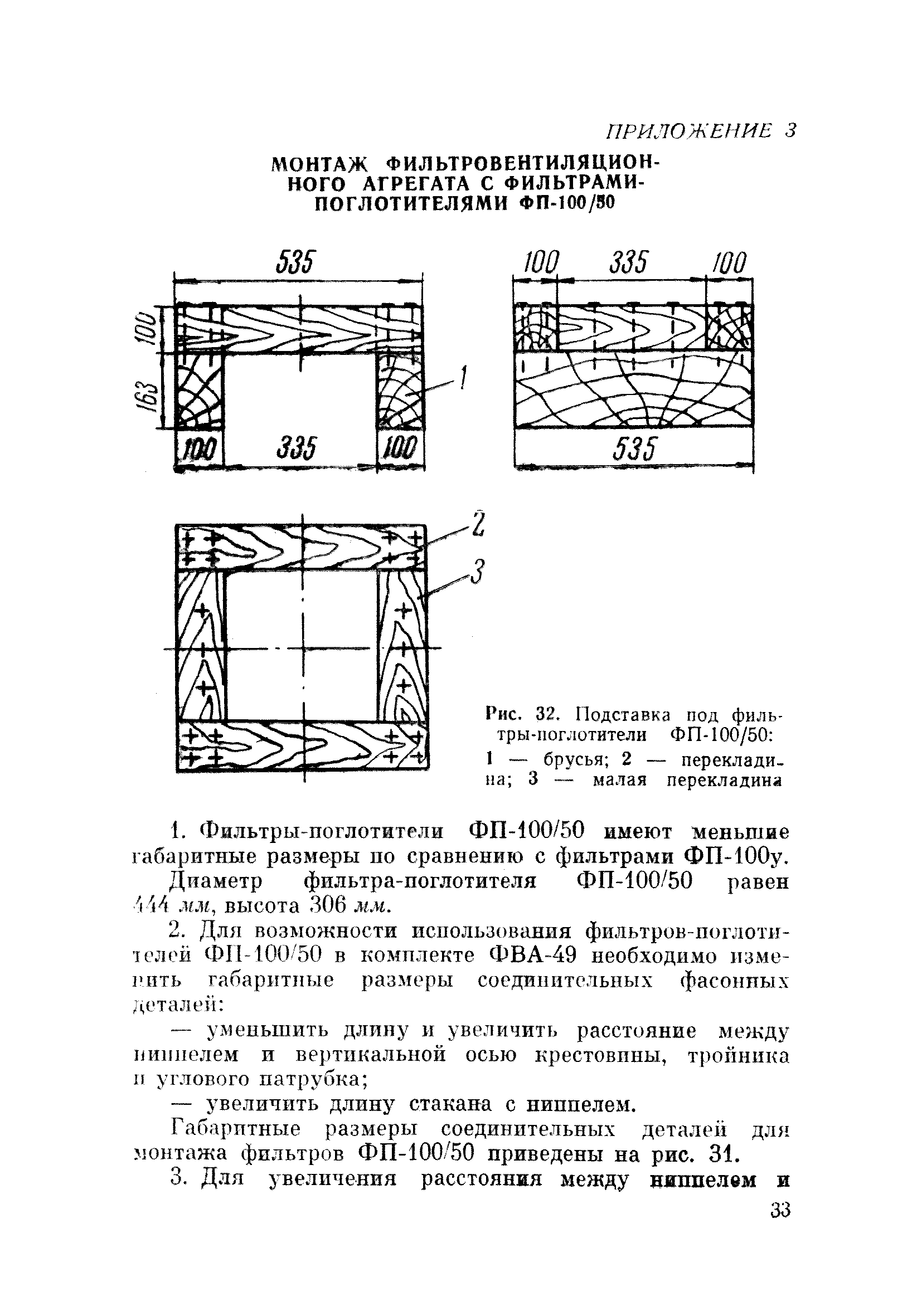 | Оглавление: | Краткое описание фильтровентиляционного агрегата ФВА-49 Монтаж фильтровентиляционного агрегата Приемка монтажа фильтровентиляционного агрегата Содержание и эксплуатация фильтровентиляционного агрегата Приложение 1. Спецификация деталей для комплектации фильтровентиляционных агрегатов ФВА-49 Приложение 2. Краткое описание, монтаж и эксплуатация противопыльного фильтра ППФ-49 Приложение 3. Монтаж фильтровентиляционного агрегата с фильтрами-поглотителями ФП-100/50 |