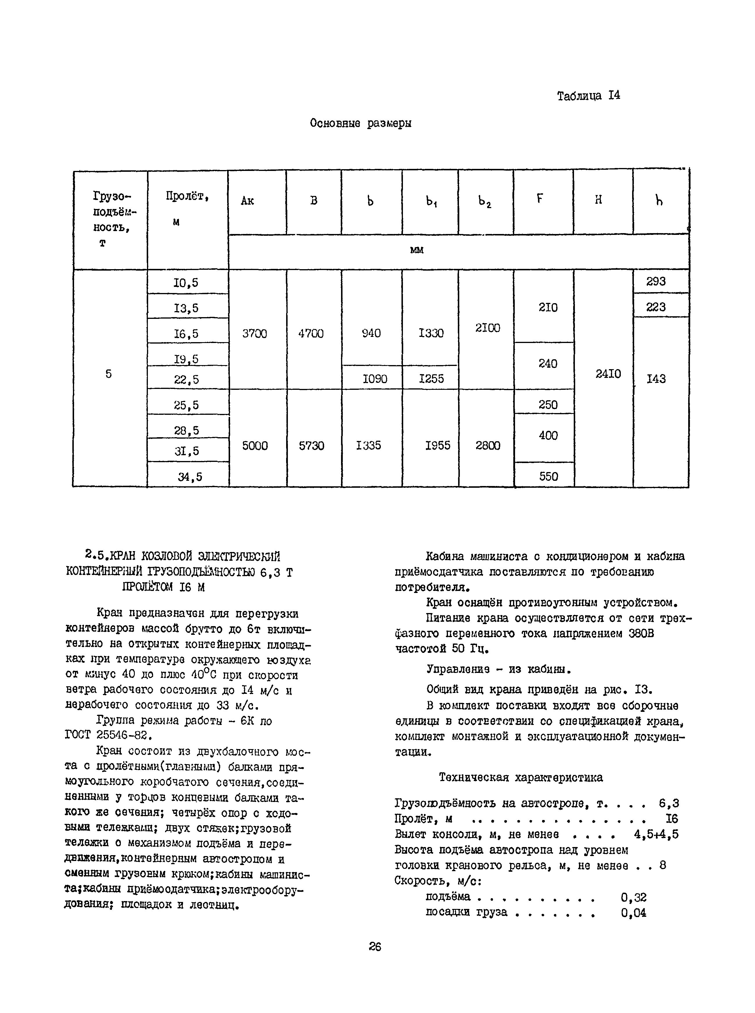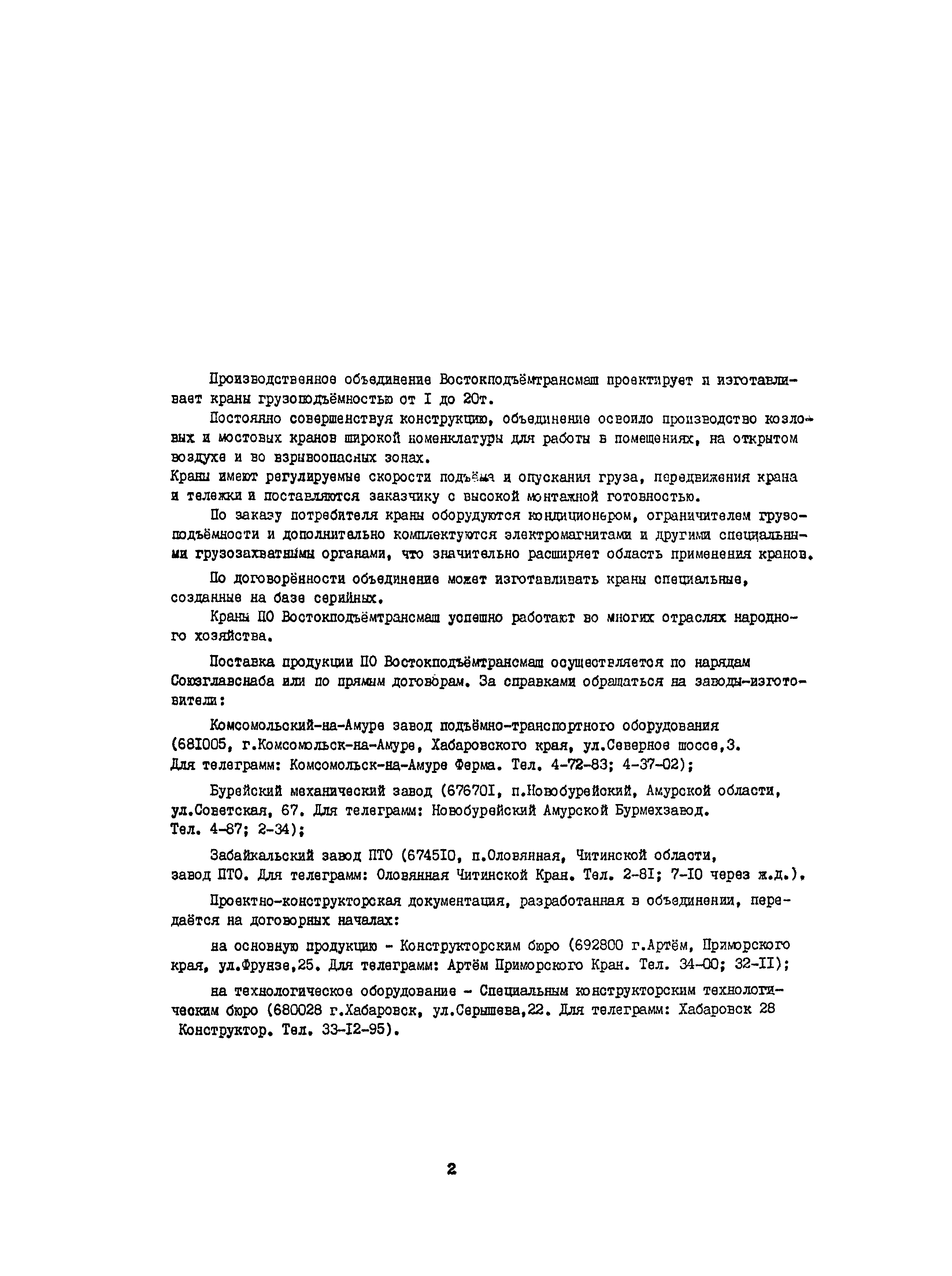 Краны грузоподъемные. Каталог| Статус: | справочные материалы, мп, тпр | | Название рус.: | Краны грузоподъемные. Каталог | | Название англ.: | Procedural Guidelines for Determining Building Material Cost in the Russian Federation | | Дата добавления в базу: | 21.05.2015 | | Дата актуализации: | 01.01.2021 | | Оглавление: | 1. Комсомольский-на-Амуре завод ПТО 1.1 Кран мостовой электрический общего назначения грузоподъемностью 10 т 1.2. Кран мостовой электрический общего назначения грузоподъемностью 12,5 т, управляемый с пола, модернизированный 1.3. Кран мостовой электрический общего назначения грузоподъемностью 12,5 т, управляемый из кабины, модернизированный 1.4. Кран мостовой электрический общего назначения грузоподъёмностью 12,5 т во взрывобезопасном исполнении ПВТ4, управляемый с пола 1.5. Кран мостовой электрический общего назначения грузоподъёмностью 12,5 т во взрывобезопасном исполнении ПВТ4, управляемый из кабины 1.6. Кран козловой грузоподъёмностью 12,5 т 1.7. Кран для путевых баз КПБ - 12,5 т 1.8. Кран козловой электрический универсальный типа КК—20А грузоподъёмностью 20 т на захвате 2. Бурейский механический завод 2.1. Кран мостовой электрический общего назначения однобалочный с консольной тележкой и электрической талью грузоподъемностью 5 т, управляемый с пола 2.2. Кран мостовой электрический общего назначения однобалочный с консольной грузовой тележкой грузоподъёмностью 5 т, управляемый с пола 2.3. Кран мостовой электрический общего назначения грузоподъёмностью 5 т во взрывобезопасном исполнении ПВТ4 2.4. Кран мостовой электрический общего назначения однобалочный с консольной грузовой тележкой грузоподъёмностью 5 т, управляемый из кабины 2.5. Кран козловой электрический контейнерный грузоподъёмностью 6,3 т, пролётом 6 м 2.6. Кран козловой электрический контейнерный грузоподъёмностью 6,3 т пролётом 25 м 3. Забайкальский завод ПТО 3.1 Краны мостовые электрические однобалочные подвесные однопролётные грузоподъёмностью 1; 2; 3,2 т 3.2. Кран мостовой электрический однобалочный подвесной однопролётный грузоподъёмностью 5 т 3.3. Кран мостовой электрический однобалочный подвесной грузоподъёмностью 2 т взрывобезопасного исполнения 3.4. Кран мостовой электрический однобалочный подвесной грузоподъёмностью 5т взрывобезопасного исполнения 3.5. Краны мостовые электрические однобалочные подвесные двухпролётные грузоподъемностью 1; 2; 3,2; 5 т | | Разработан: | ПО Востокподъемтрансмаш
