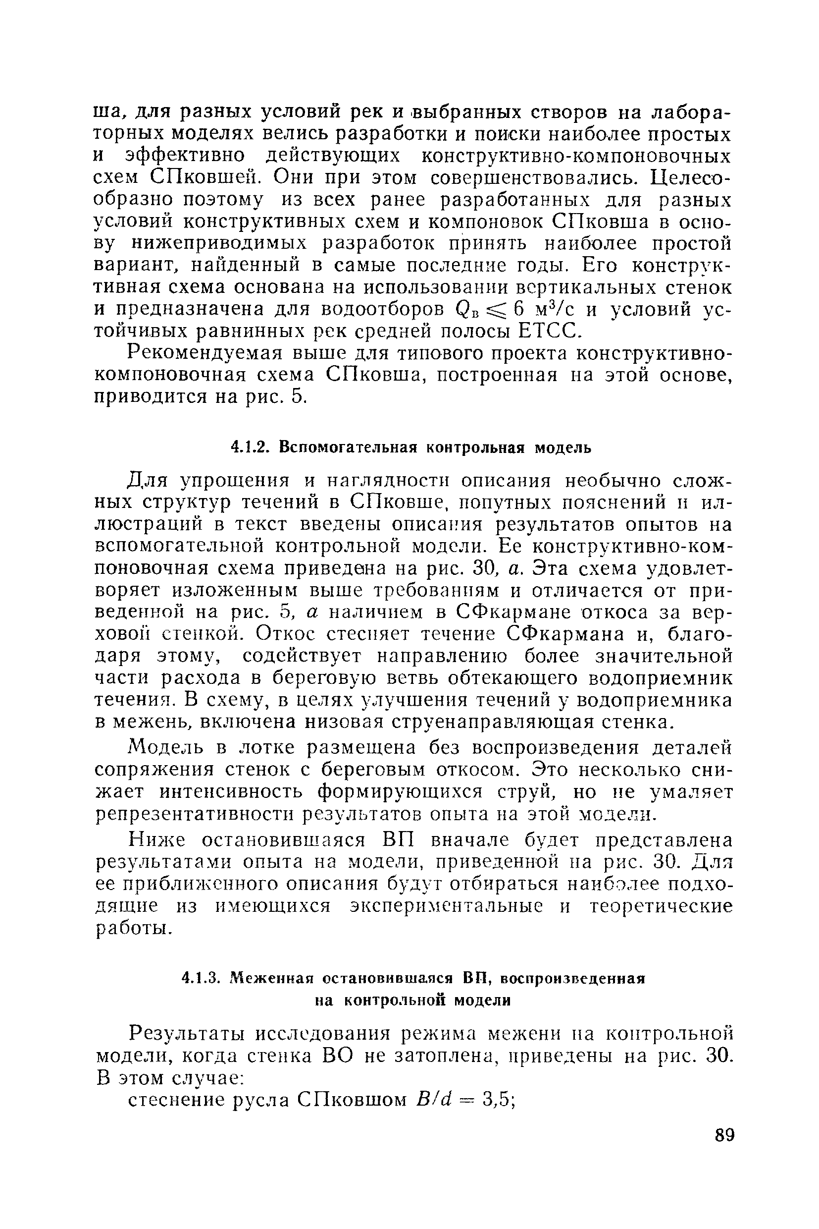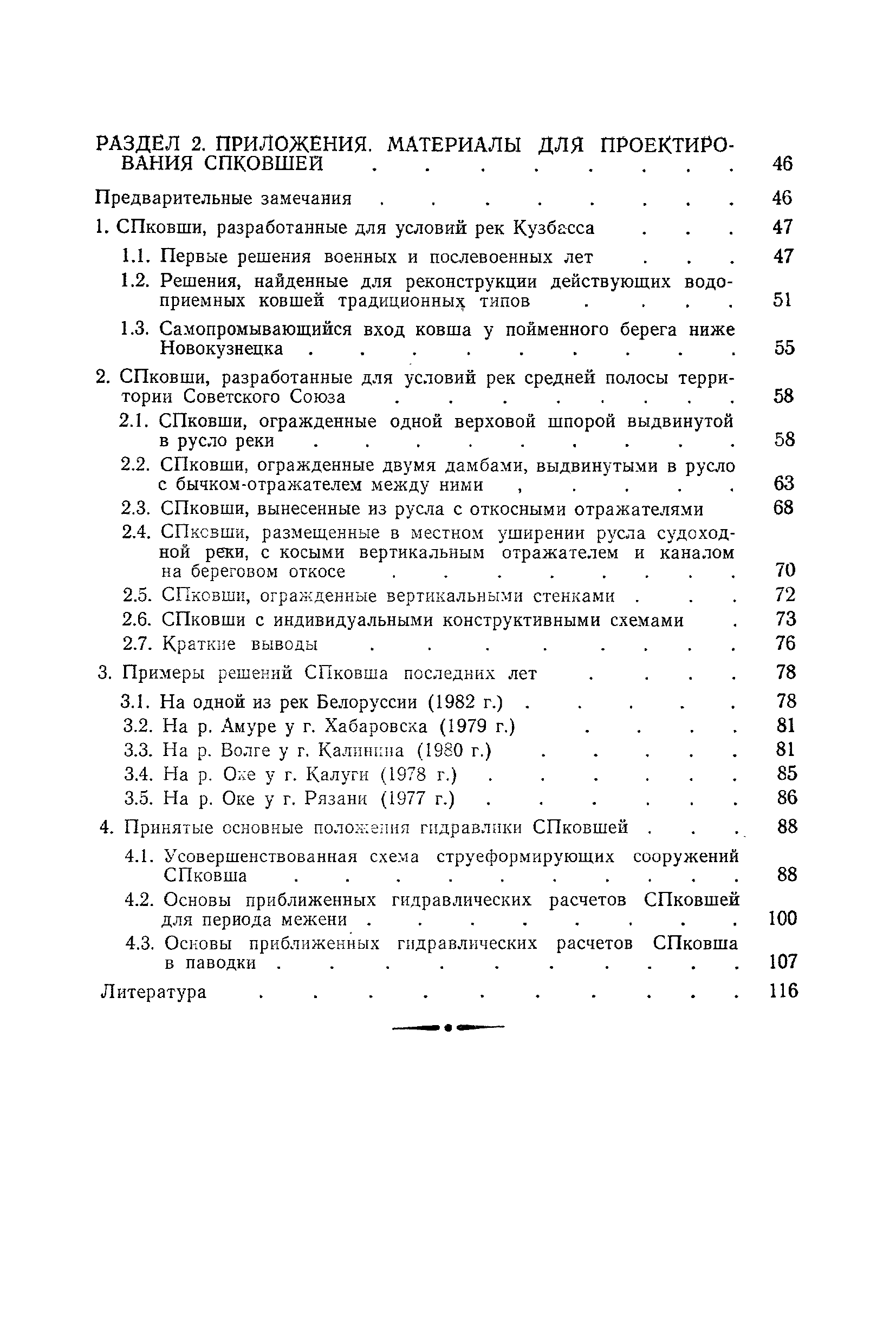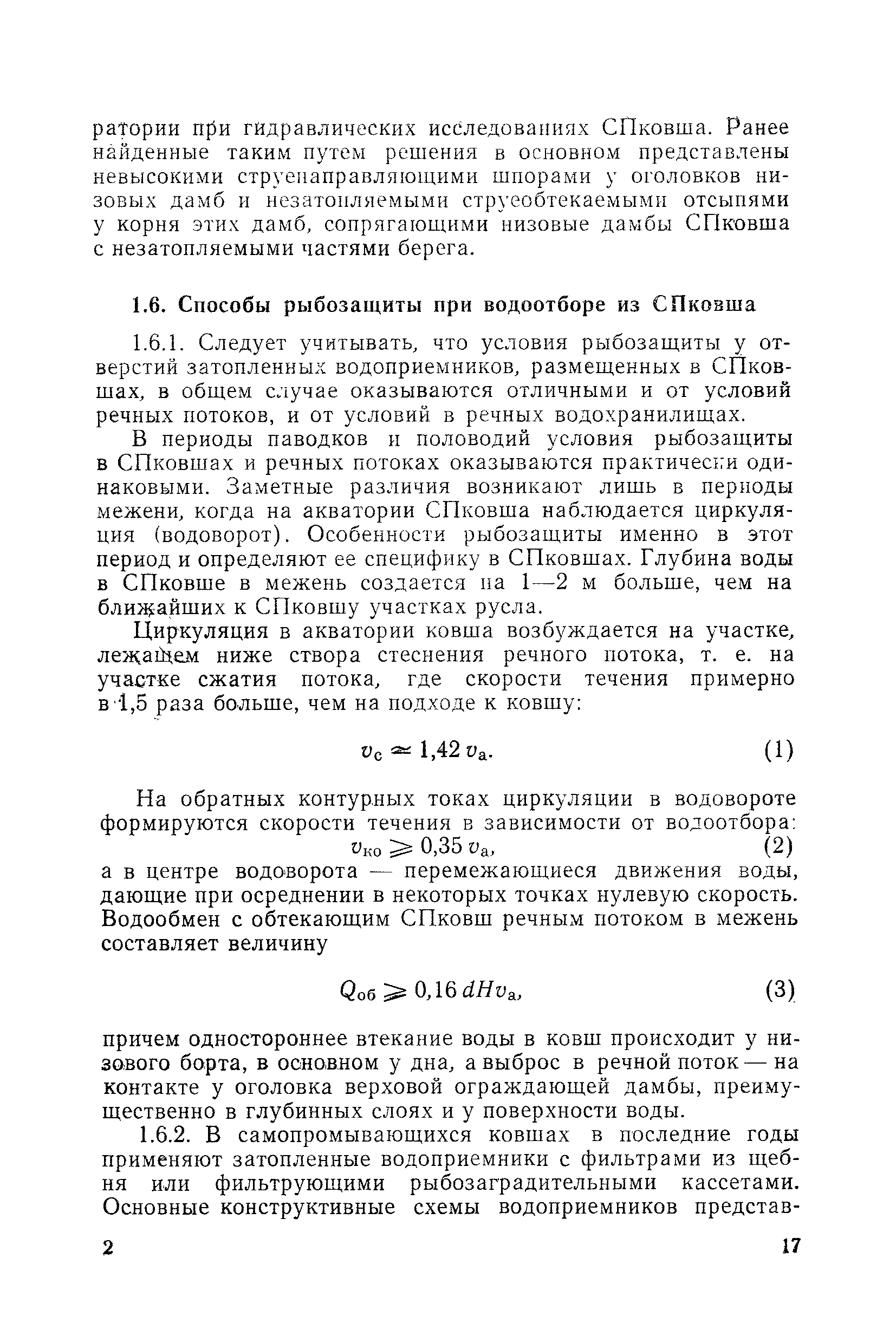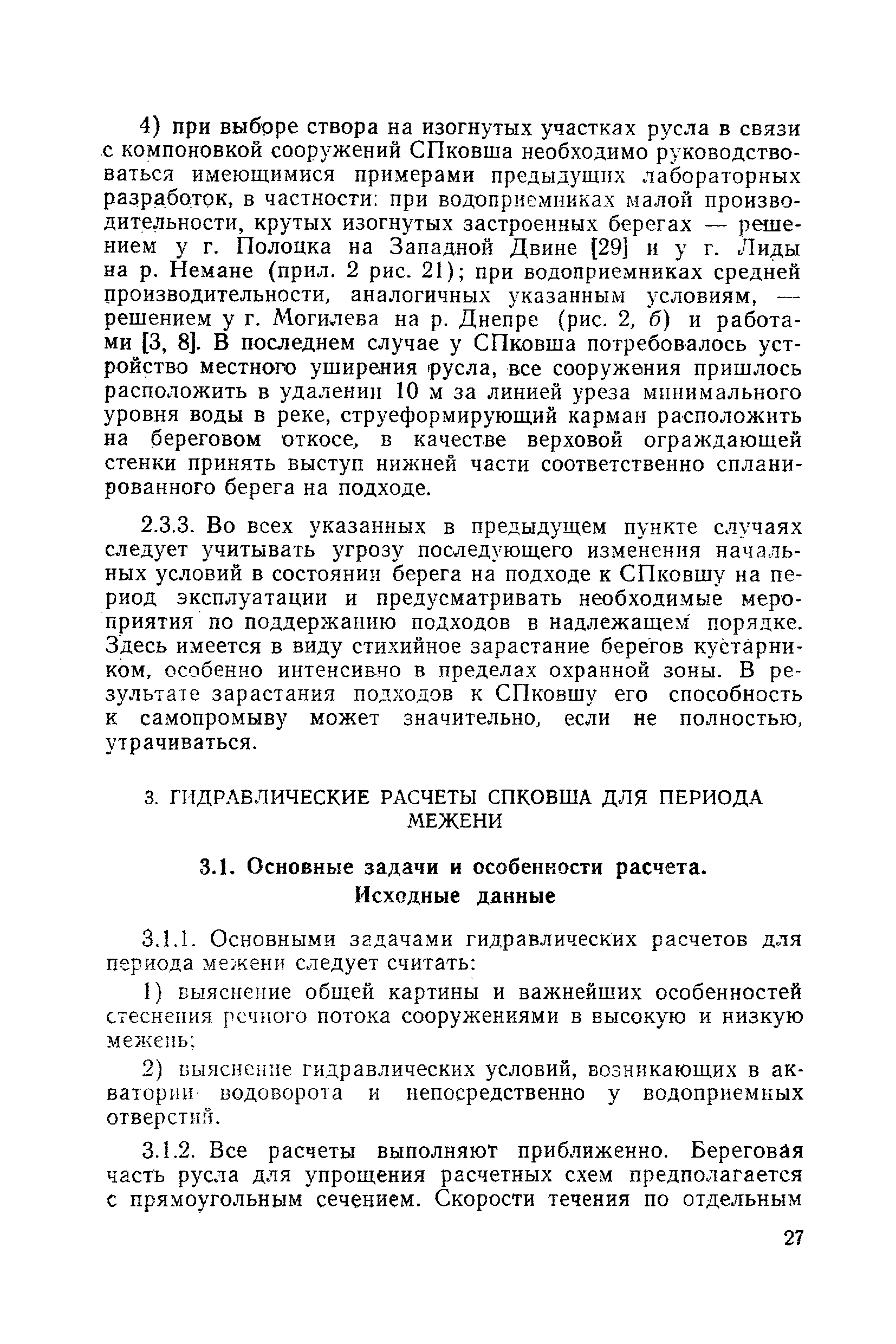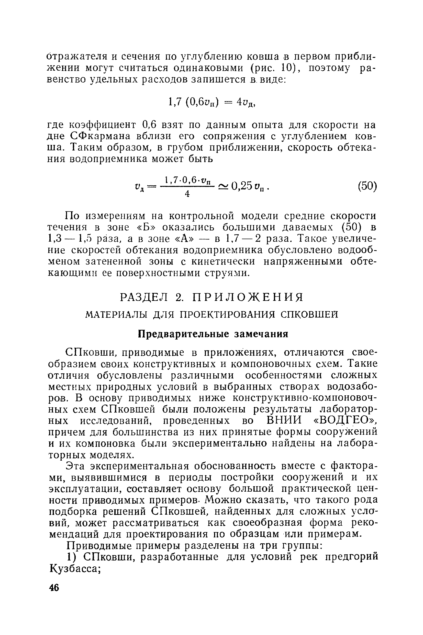 Рекомендации по проектированию самопромывающихся ковшей у затопленных водоприемников| Статус: | справочные материалы, мп, тпр | | Название рус.: | Рекомендации по проектированию самопромывающихся ковшей у затопленных водоприемников | | Дата добавления в базу: | 21.05.2015 | | Дата актуализации: | 01.01.2021 | | Область применения: | Рекомендации составлены на основе обобщения результатов исследований, выполненных во ВНИИ ВОДГЕО с 1944 года в связи с проектированием и постройкой водозаборов для водоснабжения промышленных предприятий. Методика гидравлического расчета Спковшей разработана для более усовершенствованной схемы Спковша с вертикальными стенками, предлагаемой для предстоящего составления типового проекта. Все результаты разработок прежних лет, которые не потеряли практического интереса и могут использоваться как примеры для проектирования, а также результаты исследований последних лет приведены в приложениях | | Оглавление: | Введение Основные сокращения и обозначения Раздел 1. Рекомендации по устройству СПковшей 1. Общие технические условия на устройство СПковшей 1.1. Основные положения 1.2. Особенности работ, возникающие при включении в состав водозабора СПковша 1.3. Классификация конструктивно-компоновочных схем СПковшей 1.4. Характерные гидравлические режимы работы СПковшей 1.5. Особенности защиты водоприемников, размещенных в СПковшах, от наносов, шугольда и сора 1.6. Способы рыбозащиты при водоотборе из СПковша 2. Рекомендации по проектированию СПковшей с вертикальными стенками 2.1. Выбор конструктивной и компоновочной схем СПковша 2.2. Выбор варианта компоновки сооружений в плане 2.3. Особенности конструктивных форм и компоновки СПковша 3. Гидравлические расчеты СПковша для периода межени 3.1. Основные задачи и особенности расчета. Исходные данные 3.2. Расчет обтекающего СПковша потока 3.3. Расчет контура обхода СПковша донными износами 3.4. Расчеты области водоворота при малых водоотборах из его акватории 3.5. Особые формы структуры течений водоворота 4. Гидравлические расчеты СПковша для периода паводков 4.1. Расчет обтекания СПковша в паводок 4.2. Расчет перетекания в СФкарман через стенку верхового ограждения и течений в нем 4.3. Расчеты скоростей течения в СФкармане и в ковше углубления вдоль водоприемника Раздел 2. Приложения. Материалы для проектирования СПковшей Предварительные замечания 1. СПковши, разработанные для условий рек Кузбасса 1.1. Первые решения военных и послевоенных лет 1.2. Решения, найденные для реконструкции действующих водоприемных ковшей традиционных типов 1.3. Самопромывающийся вход ковша у пойменного берега ниже Новокузнецка 2. СПковши, разработанные для условий рек средней полосы территории Советского Союза 2.1. СПковши, огражденные одной верховой шпорой выдвинутой в русло реки 2.2. СПковши, огражденные двумя дамбами, выдвинутыми в русло с бычком-отражателем между ними 2.3. СПковши, вынесенные из русла с откосными отражателями 2.4. СПковши, размещенные в местном уширении русла судоходной реки, с косыми вертикальным отражателем и каналом на береговом откосе 2.5. СПковши, огражденные вертикальными стенками 2.6. СПковши с индивидуальными конструктивными схемами 2.7. Краткие выводы 3. Примеры решений СПковша последних лет 3.1. На одной из рек Белоруссии (1982 год) 3.2. На р. Амуре у г. Хабаровска (1979 год) 3.3. На реке Волге у г